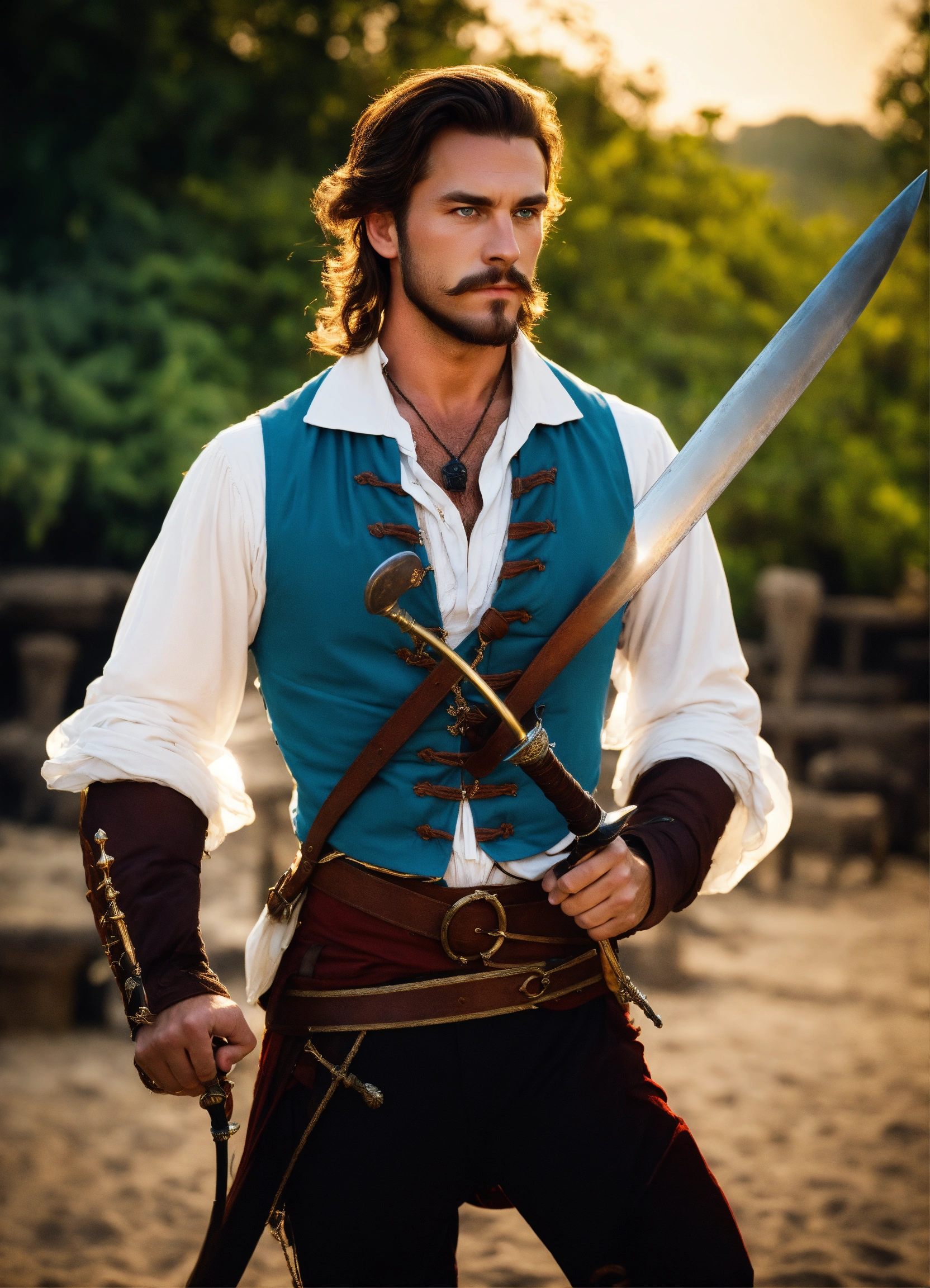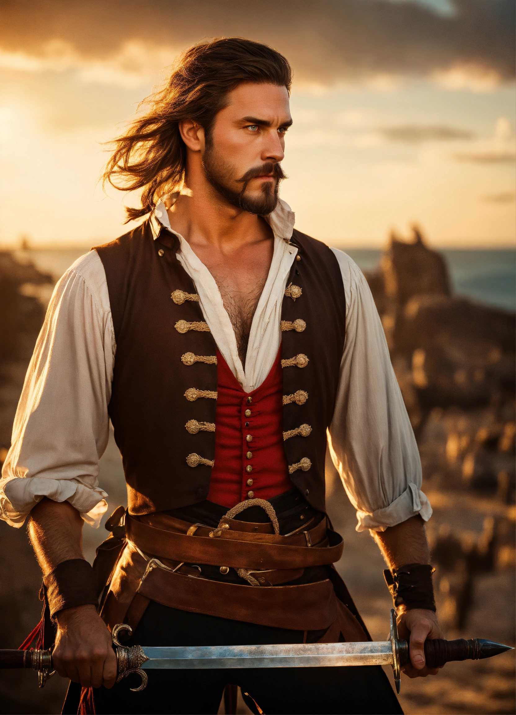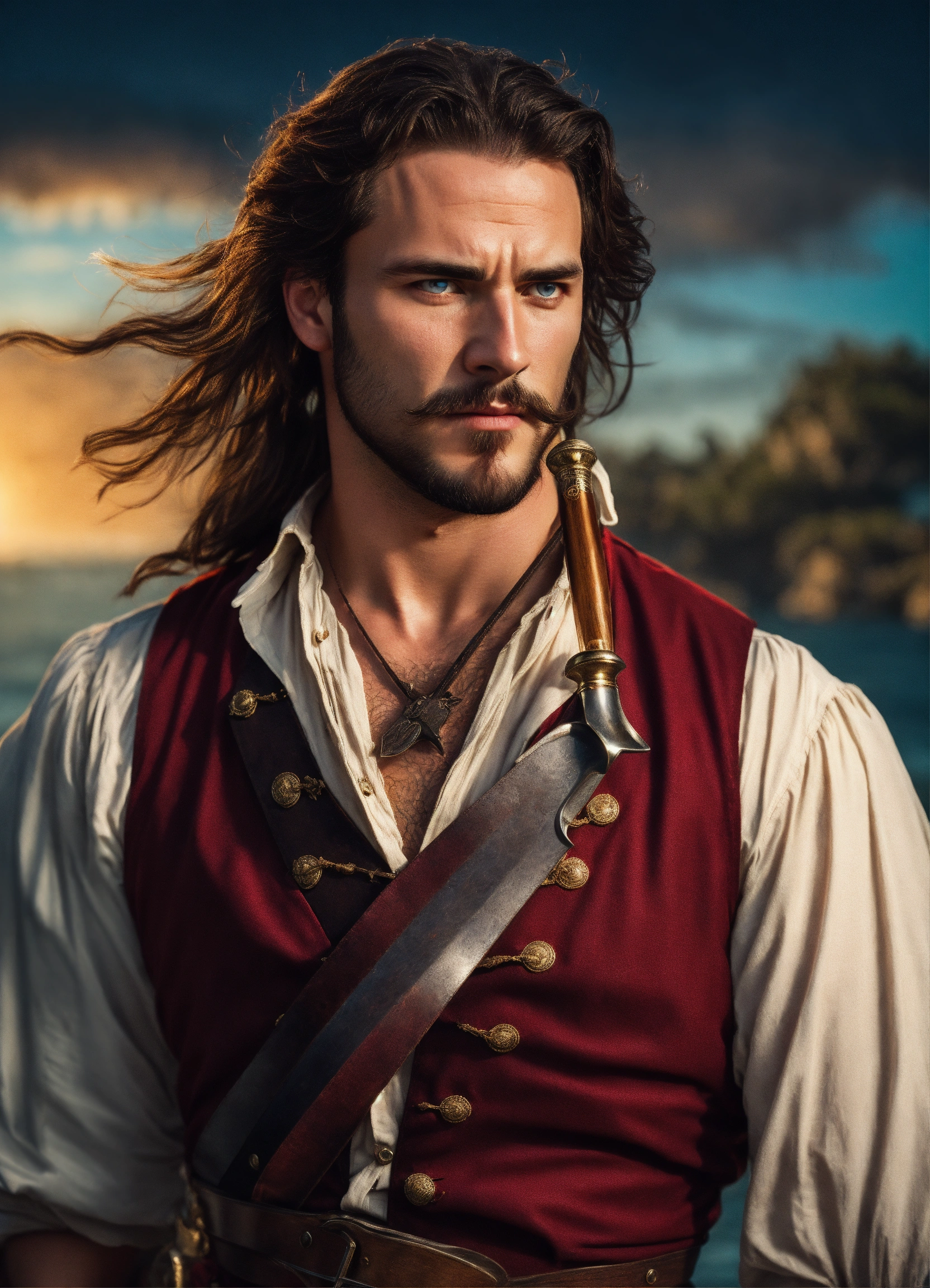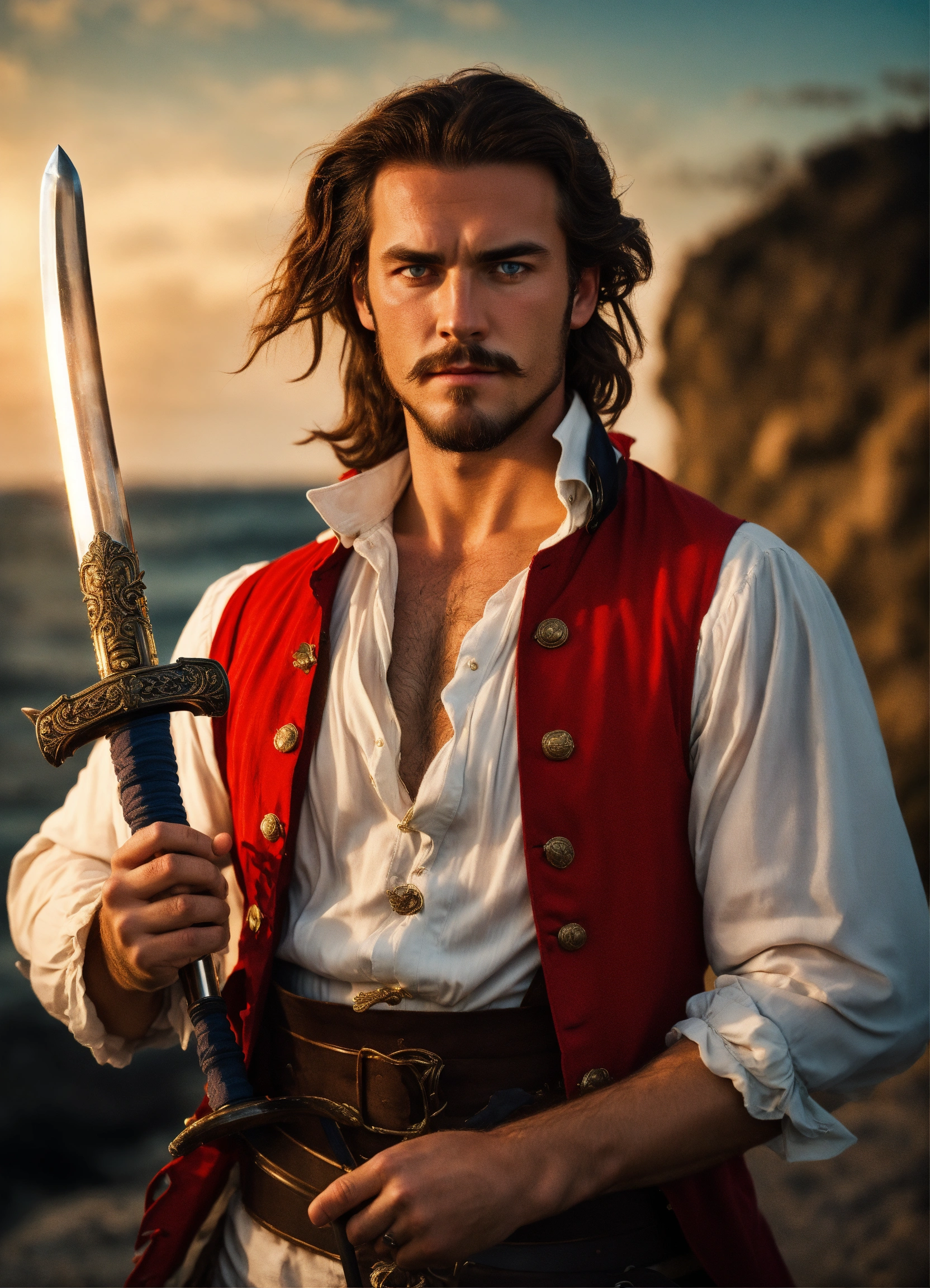 Holding a rapier an adult male pirate with long swept back brown hair, light blue eyes, stumbled facial hair, 1820s era white shirt and red vest, chest hair, holding a rapier, chest hair, 8k, cinematic lighting, island background
