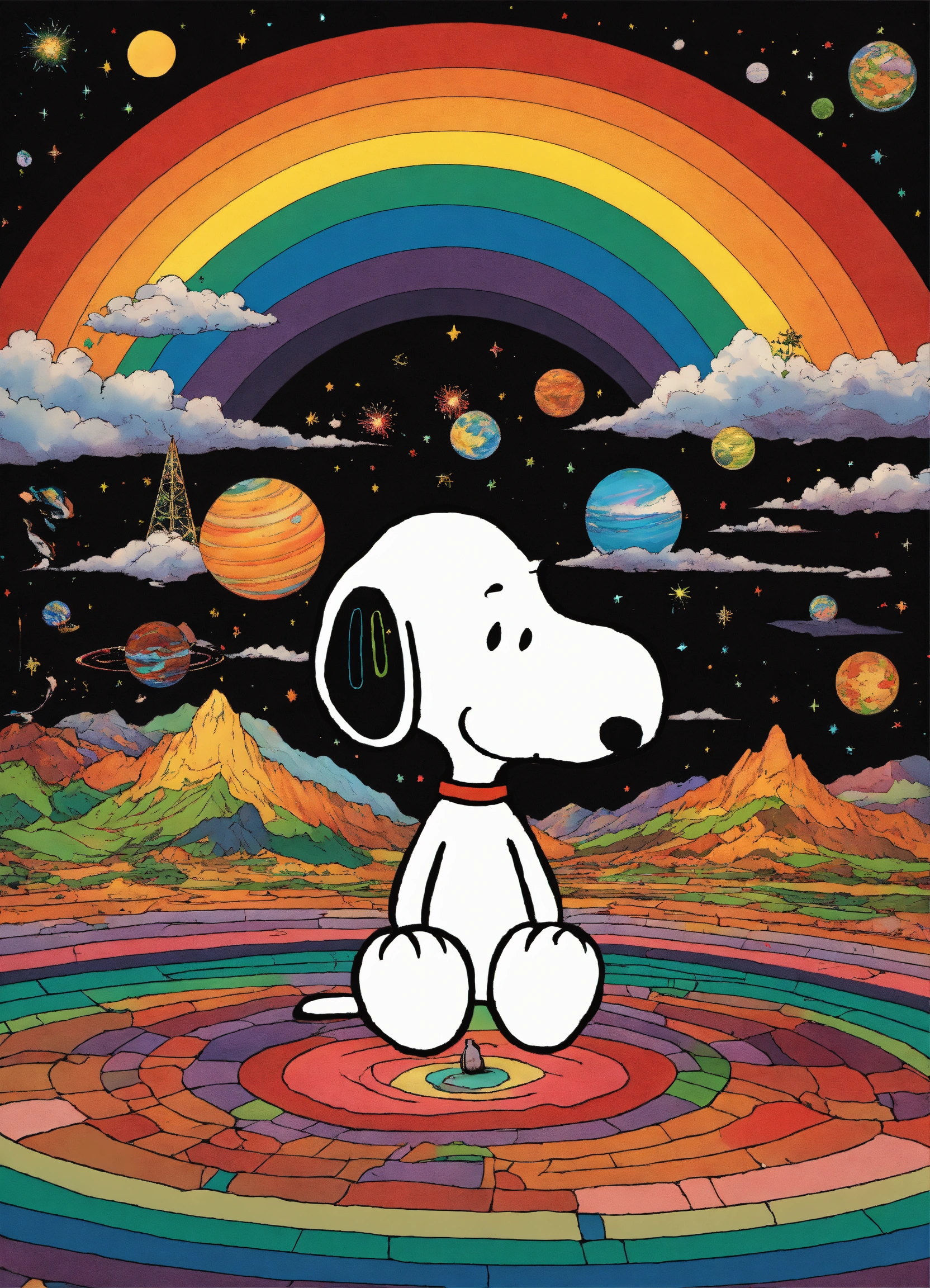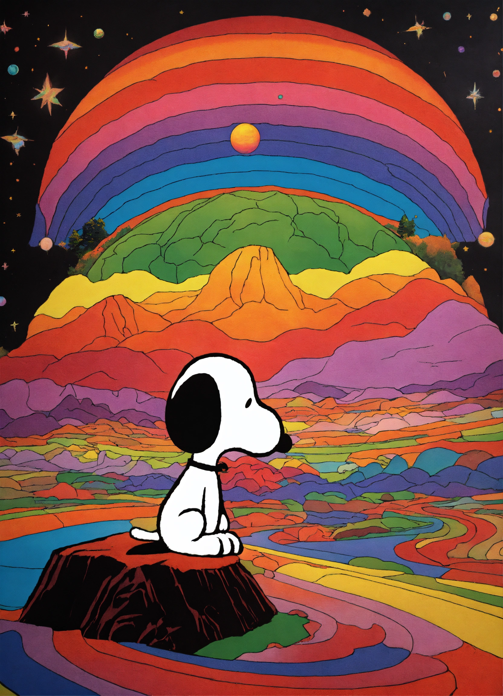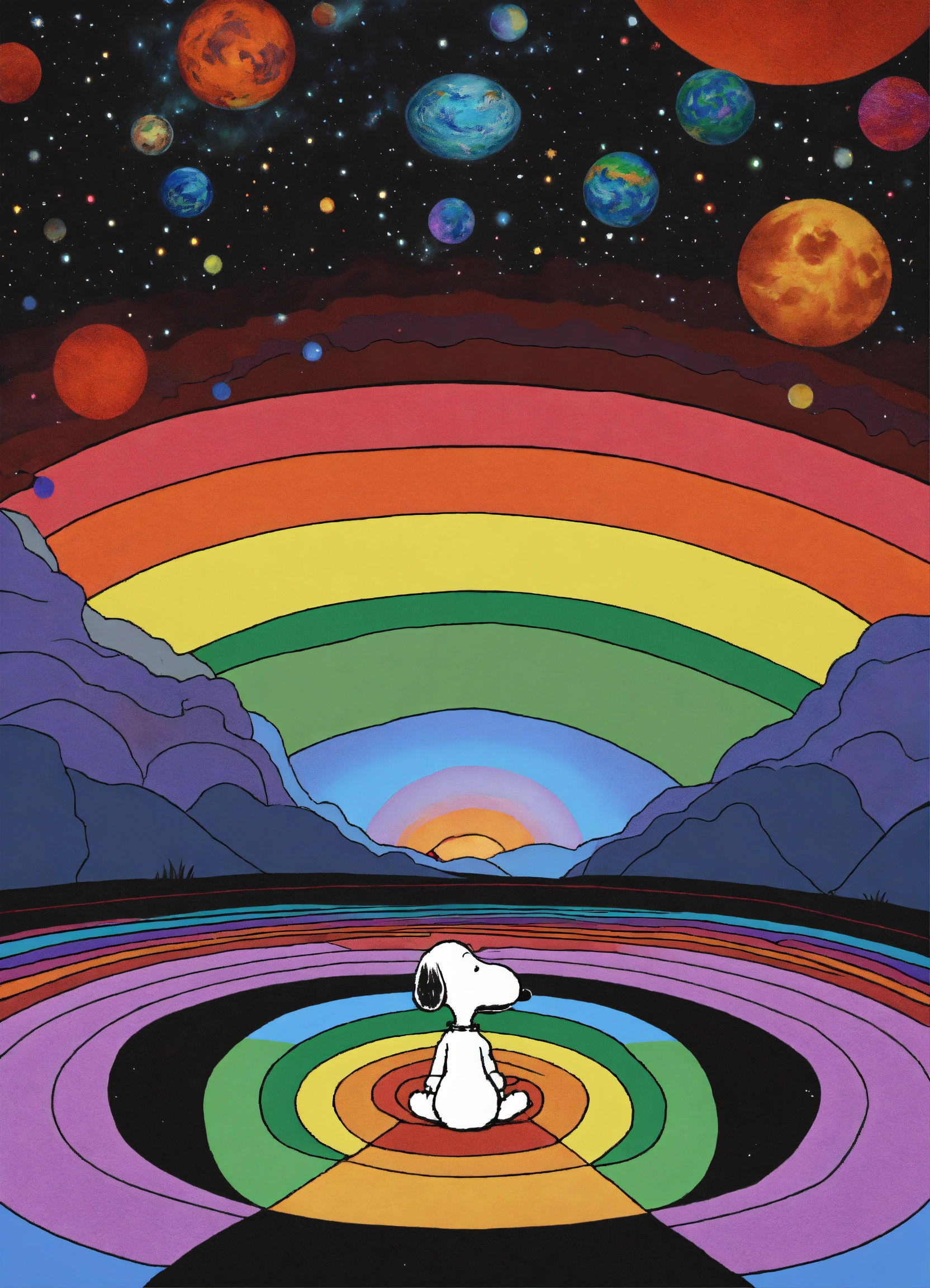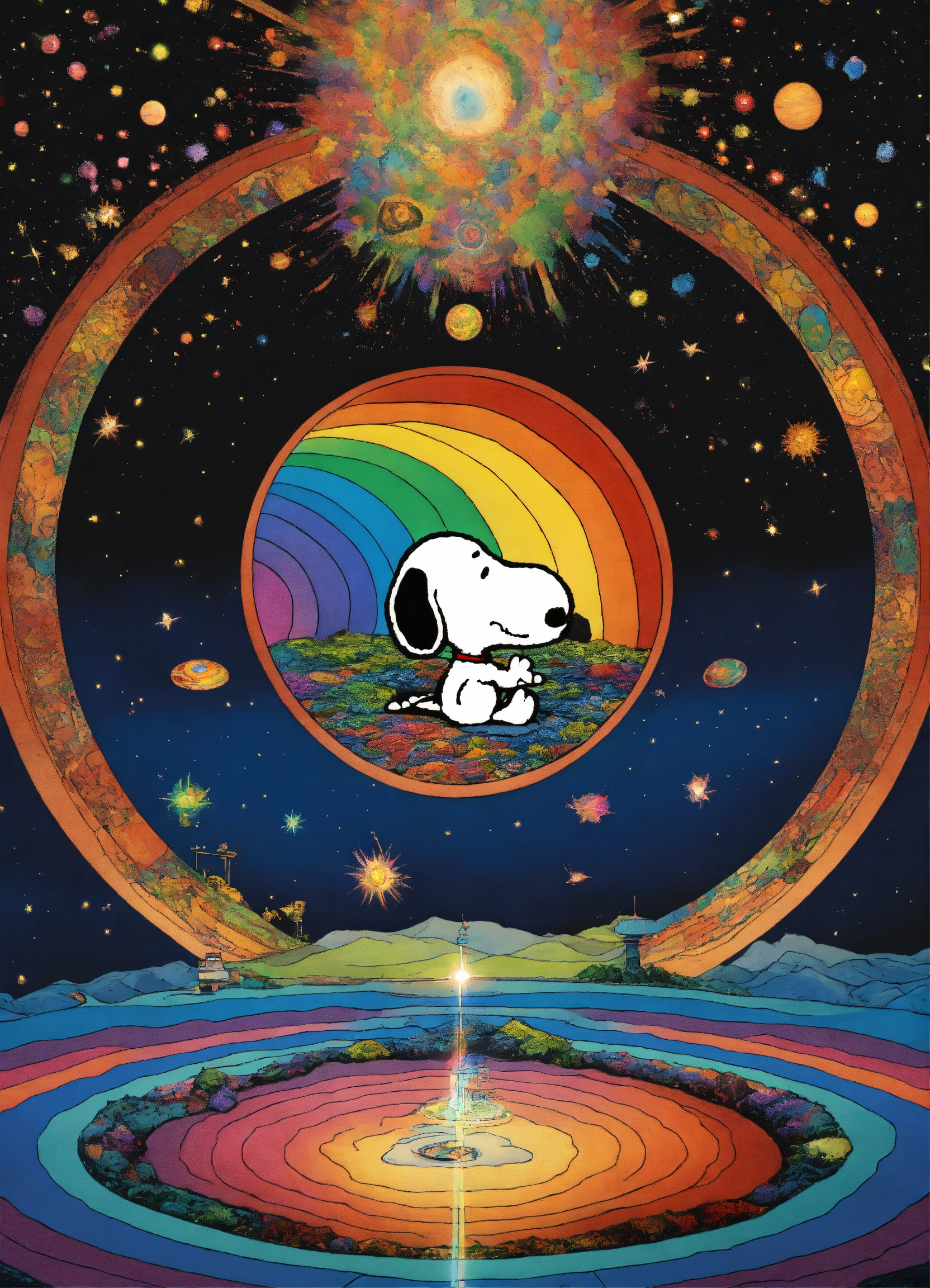 Snoopy meditating, earth merging into cosmos, rainbow psychedelic, the four corners of the world, black and. flooring by mc kurt schwitter