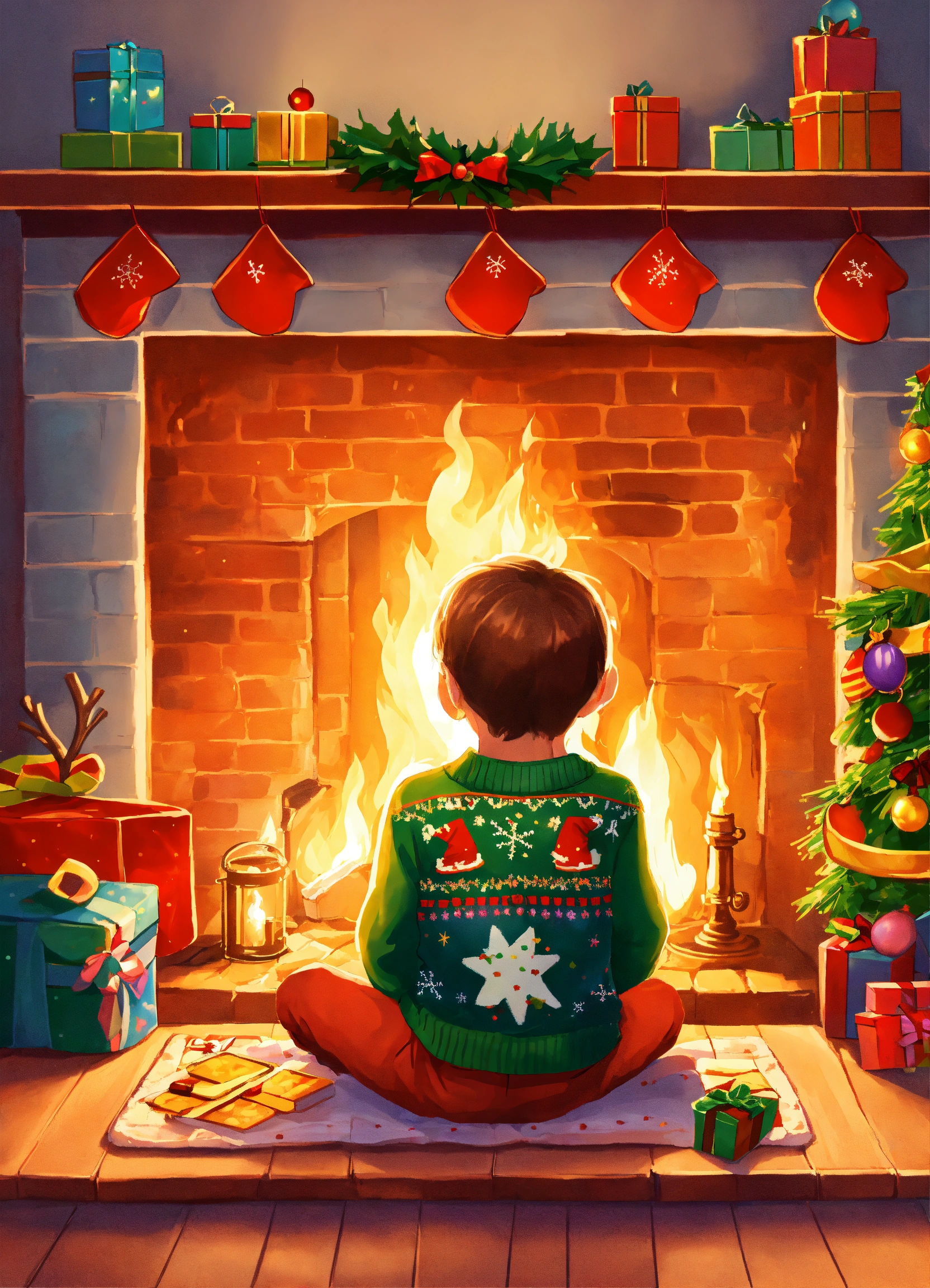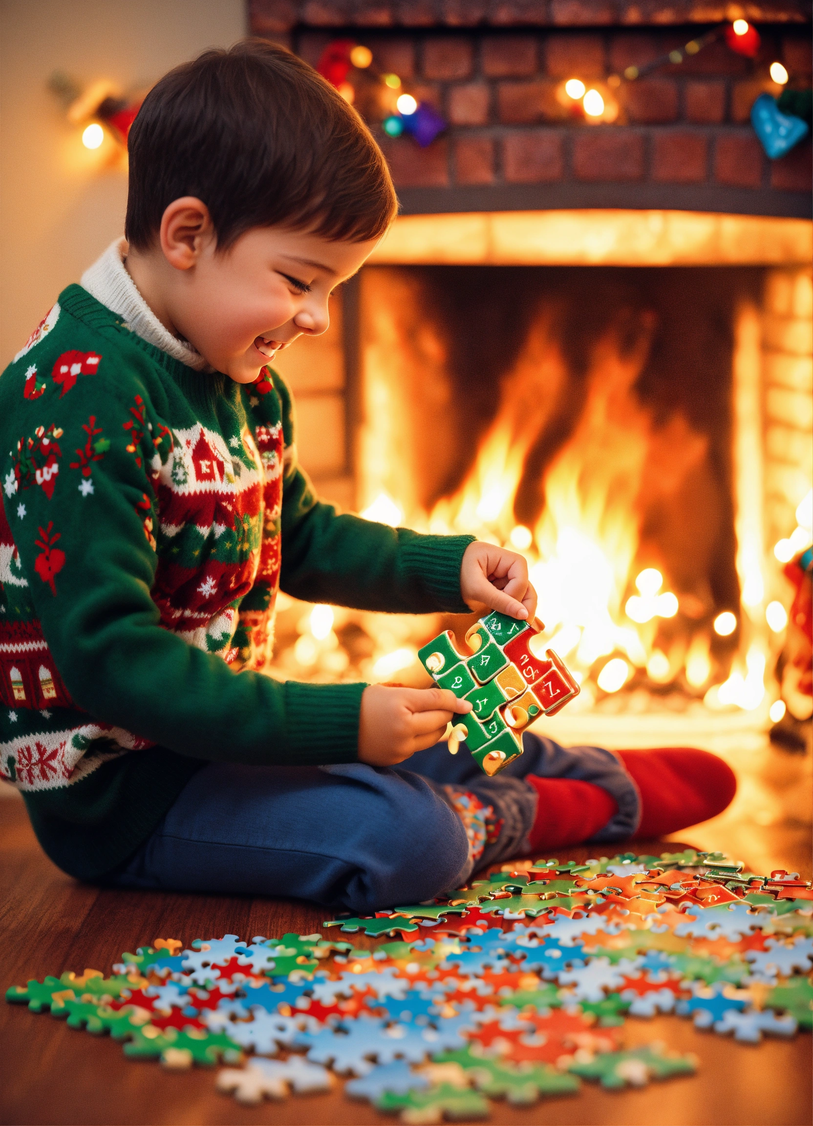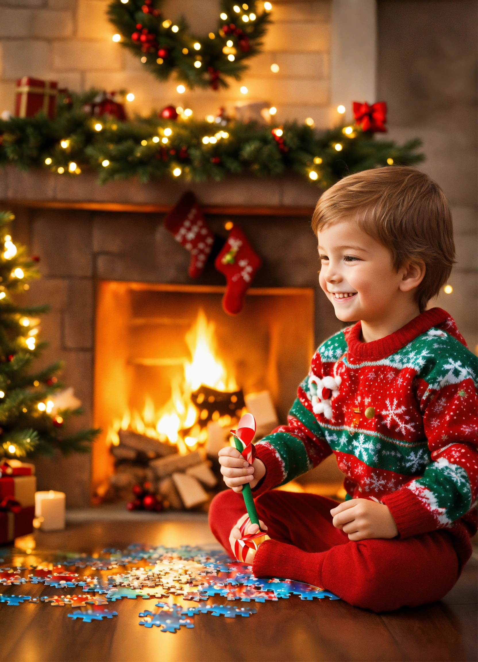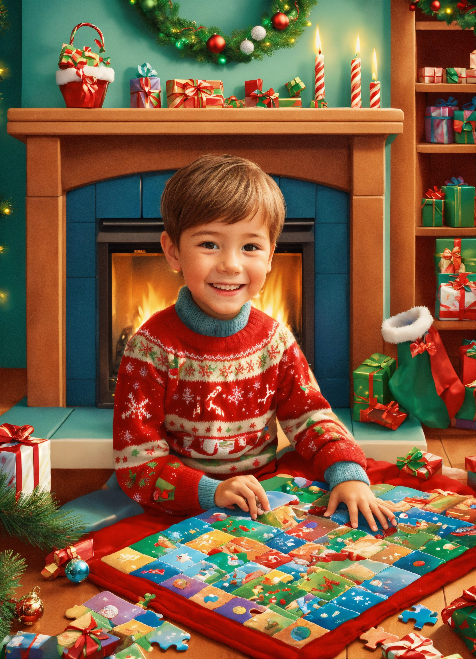 Create a warm, cozy image of a happy child in a festive sweater showing a completed puzzle from the advent calendar book. the setting should include a fireplace with stockings hung, conveying a homey christmas atmosphere.