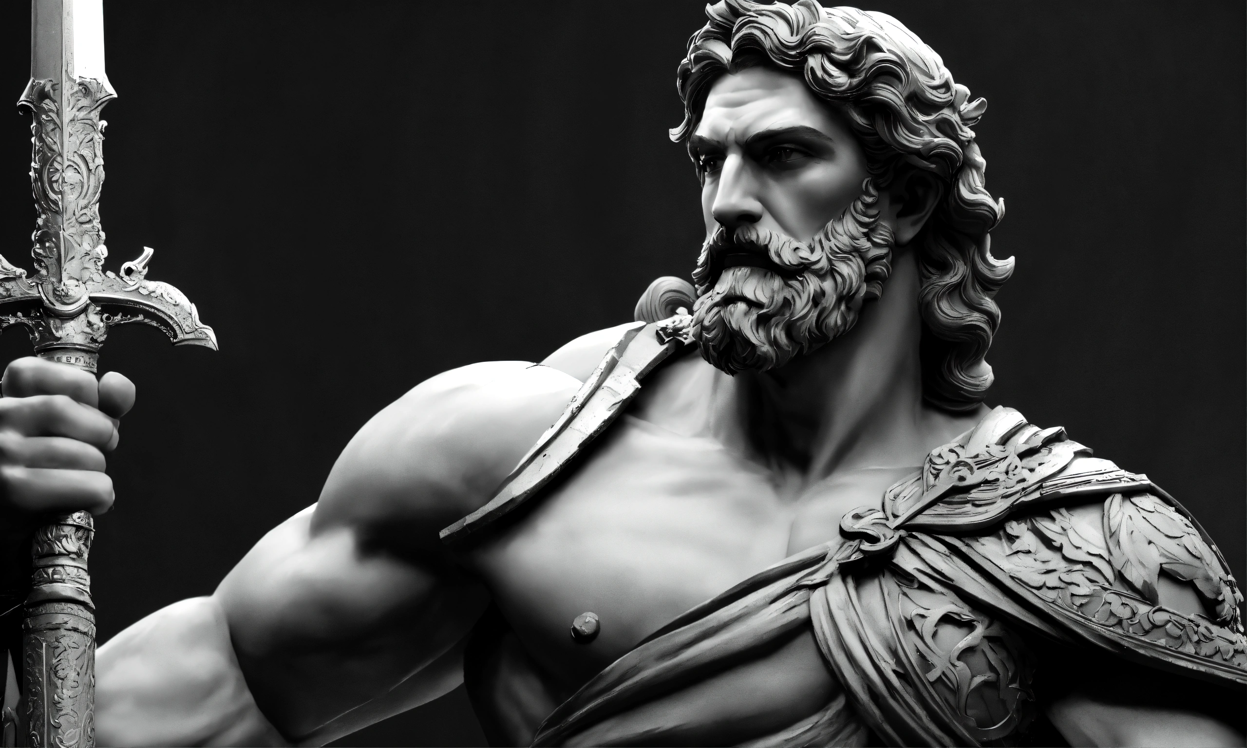 Greek statue strong man standing with sinister smile sideways with sword, black and white still, digital art, perfect composition, beautiful detailed intricate insanely detailed octane render trending on artstation, 8 k artistic