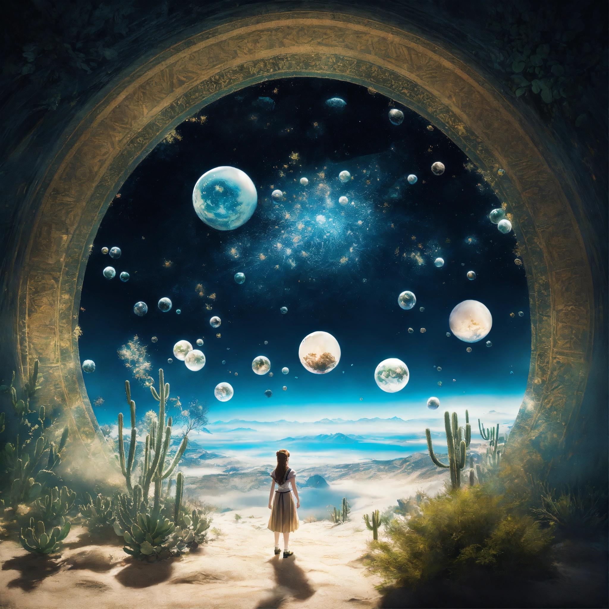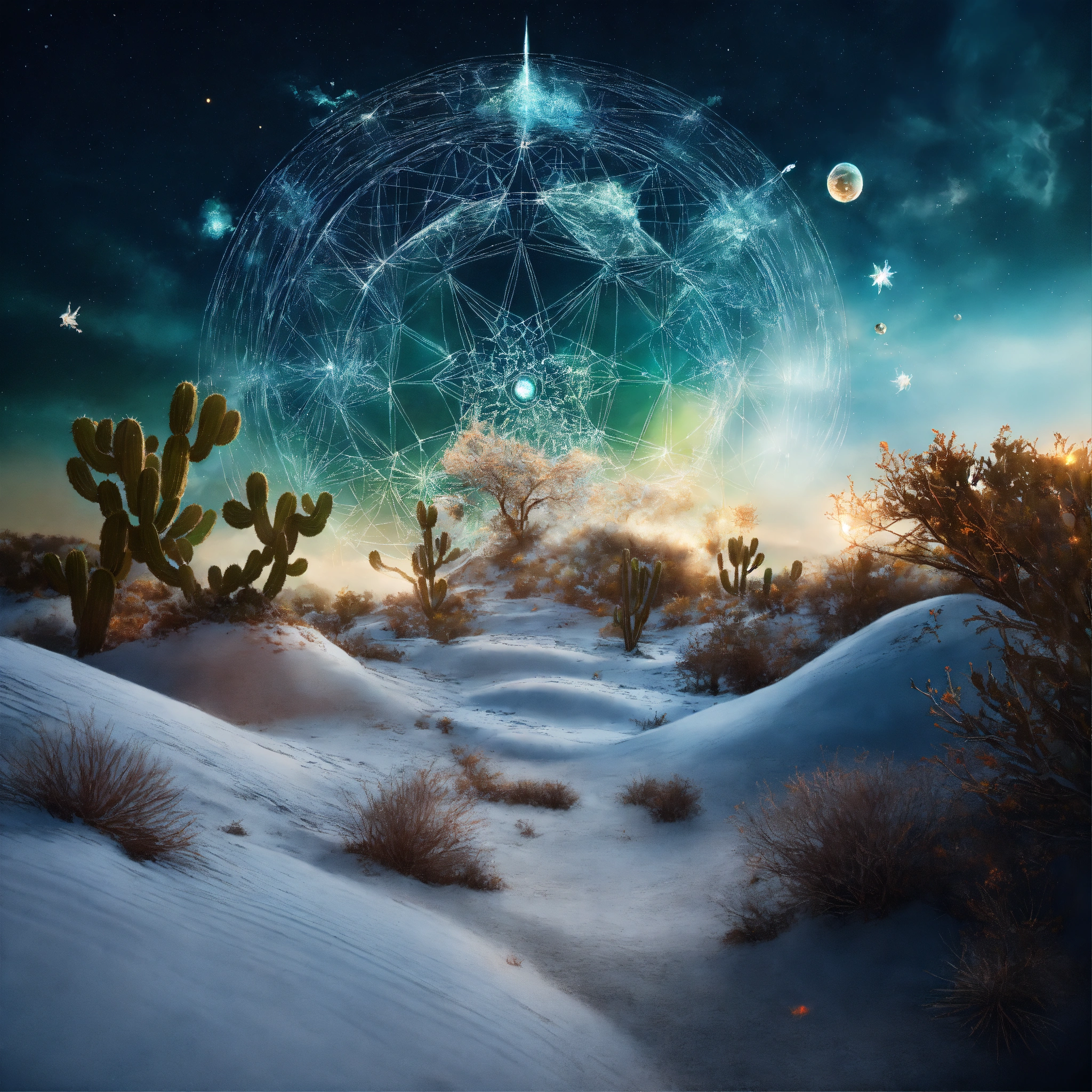 Underwater long exposure photography, a giant white desert flying in the cosmos with orbs and cactus and portals, x-ray style, in the style of tim burton, lion king, the chronicles of narnia, beauty and the beast, and peter pan. with sacred geometric patterns on the body. enchanting aura. the chronicles of narnia, wizard of oz, and alice in wonderland background with snow mountains, and trees with white leaves.