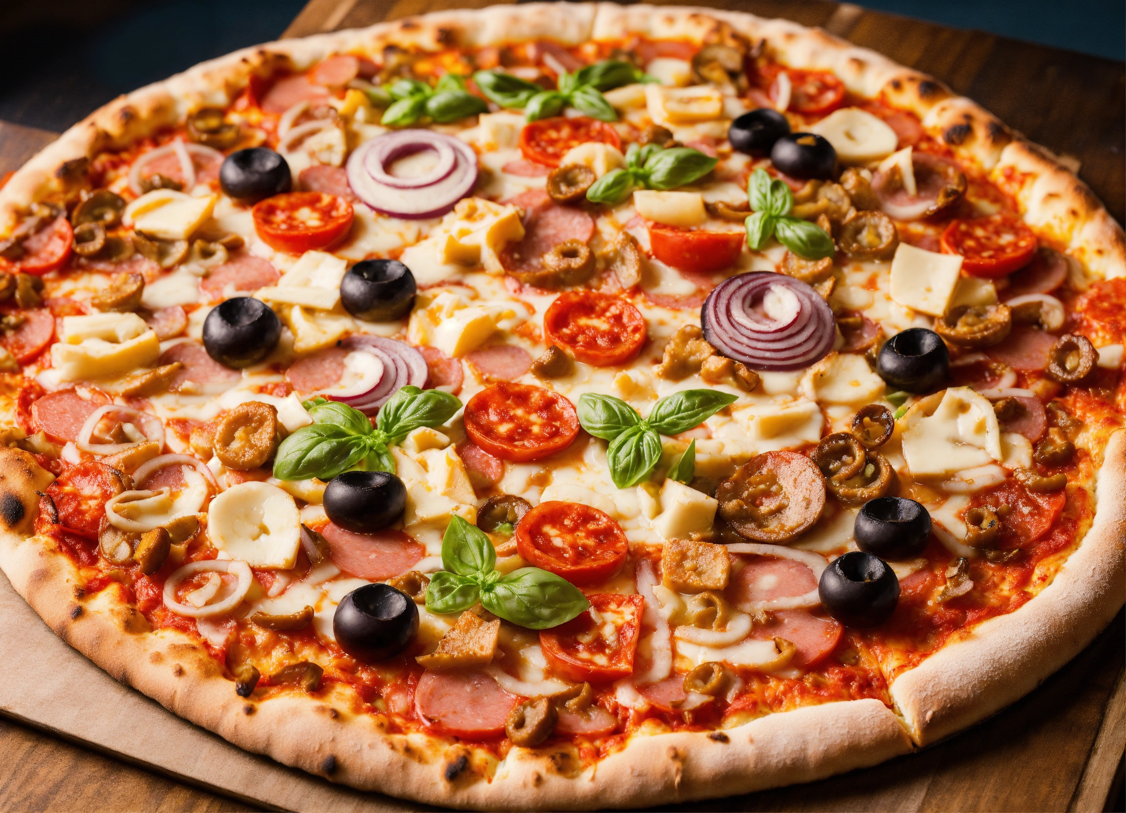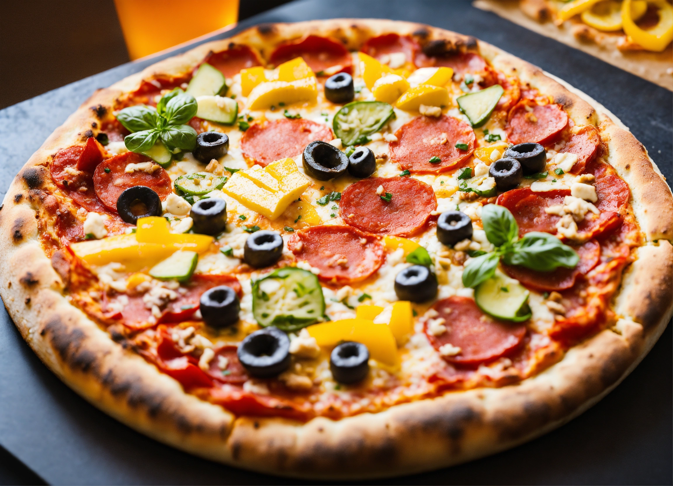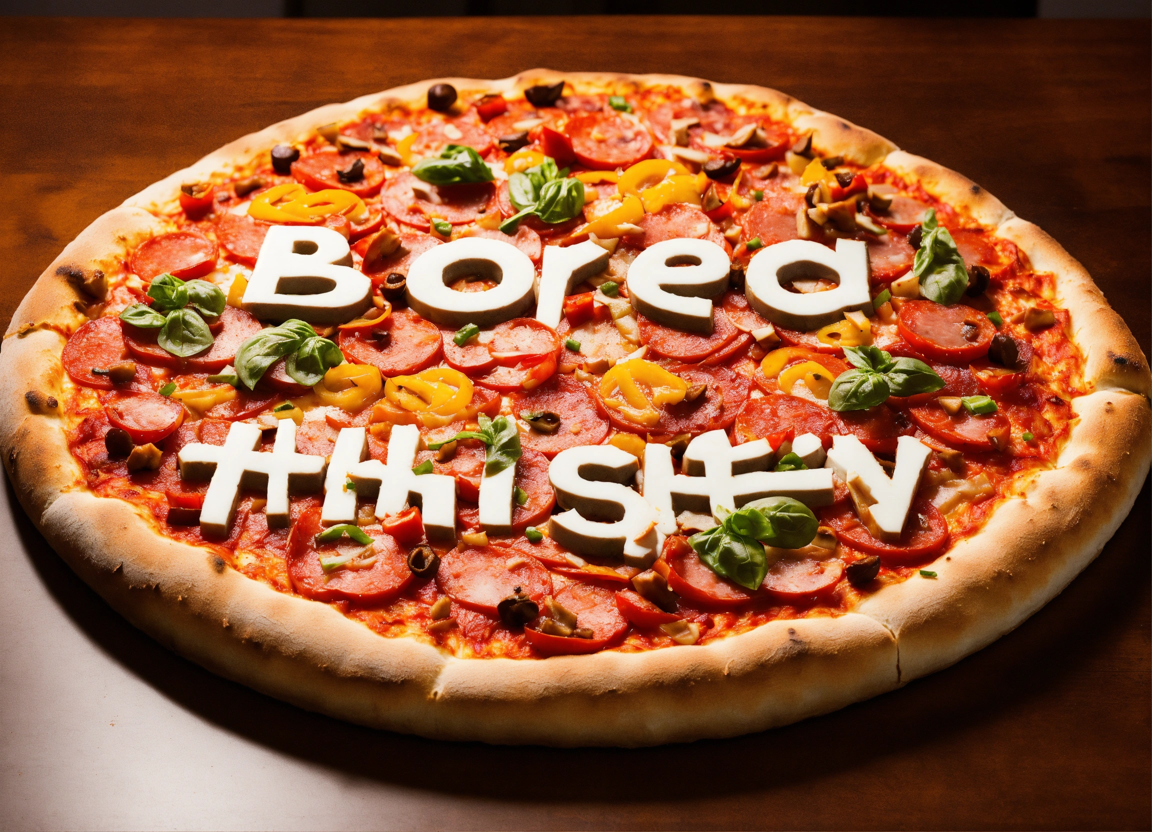 A photo of a pizza where the toppings are arranged to spell the specific words "bored & thirsty"