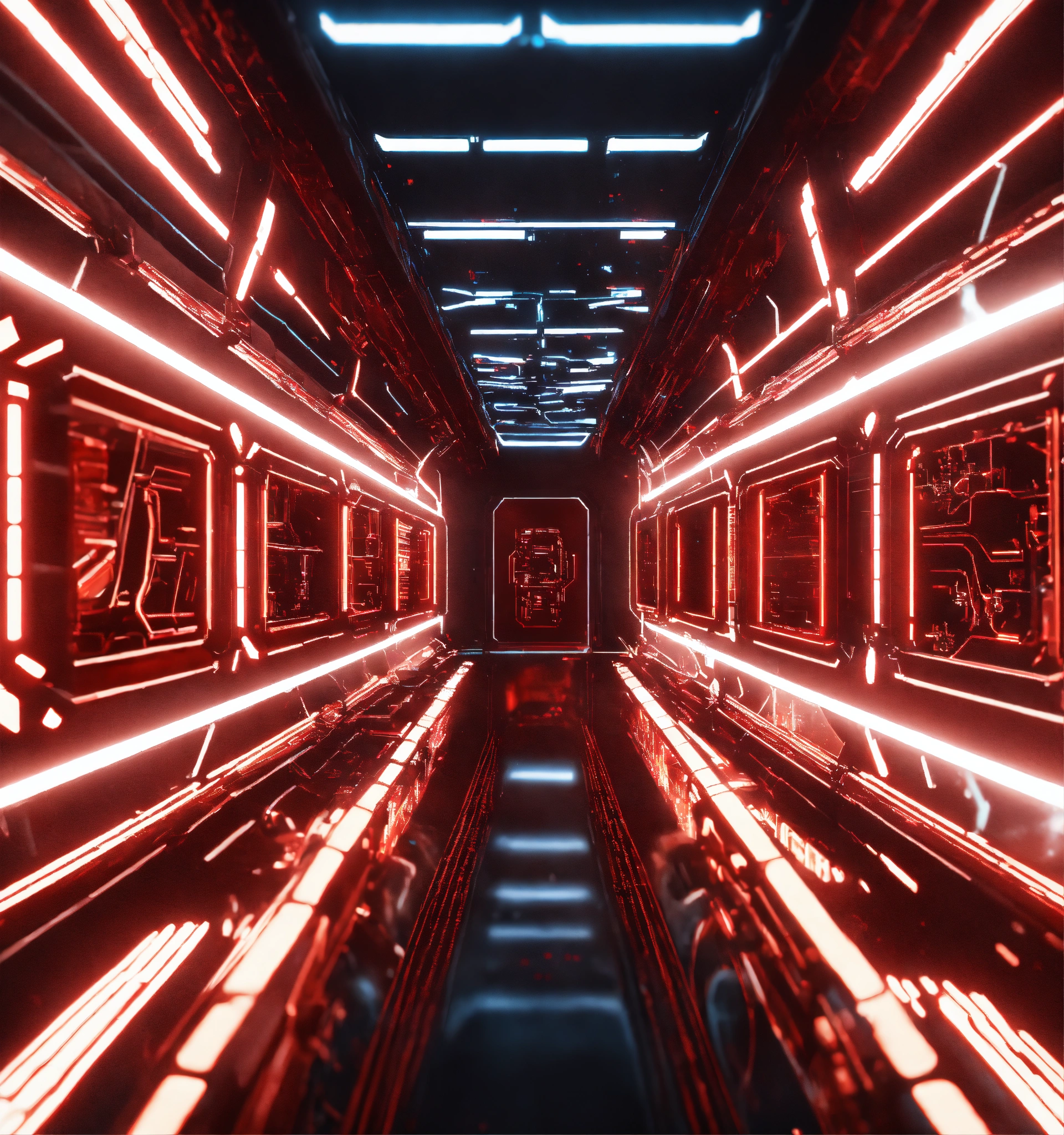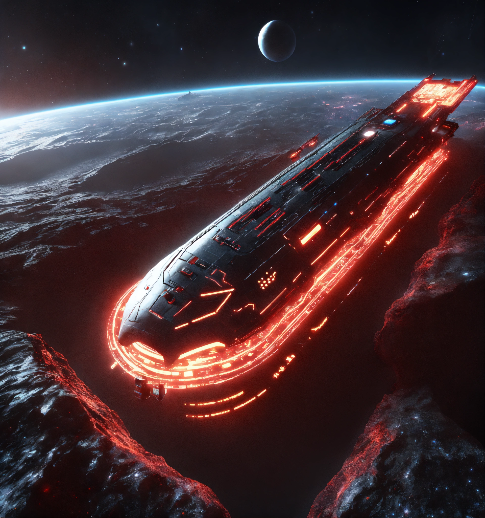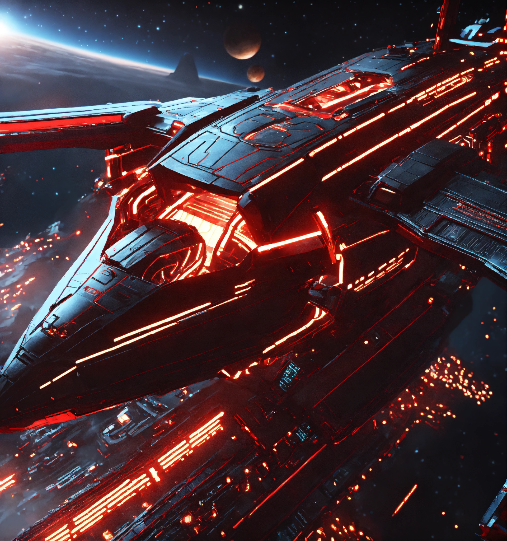 Zoom out on a long black organic worm like space ships with glowing red circuitry and markings, appear in deep space, realistic, 8k, tron, unreal engine