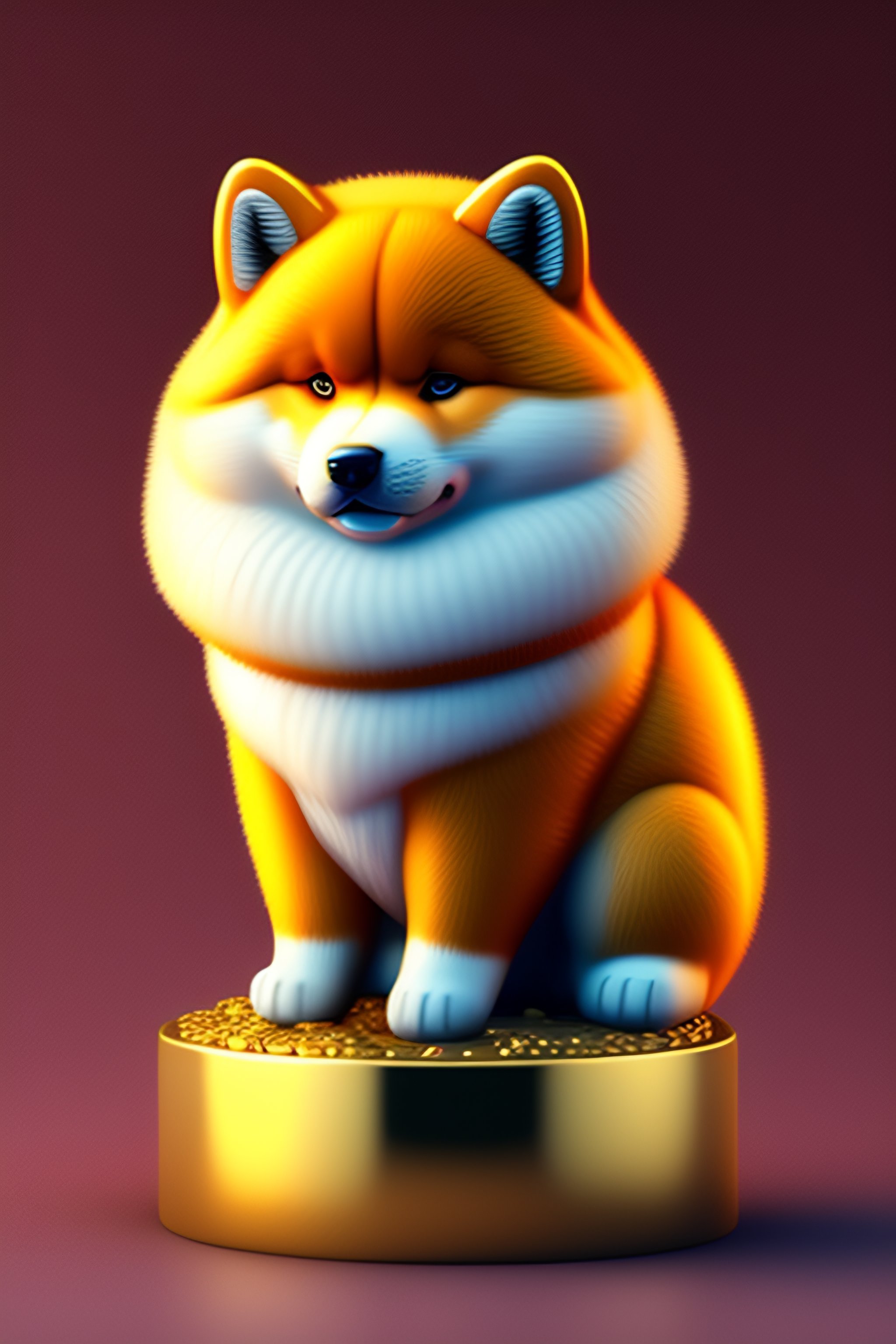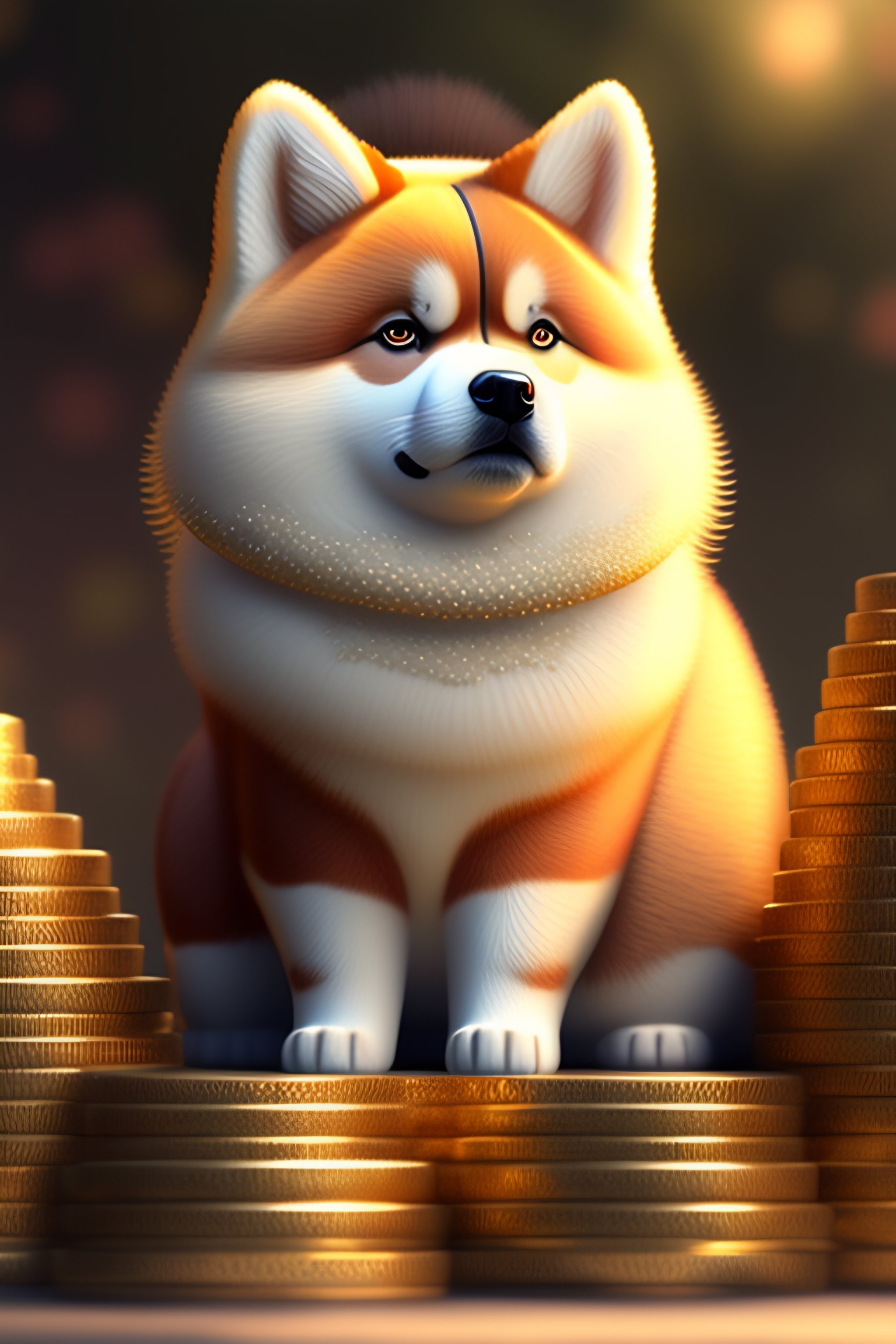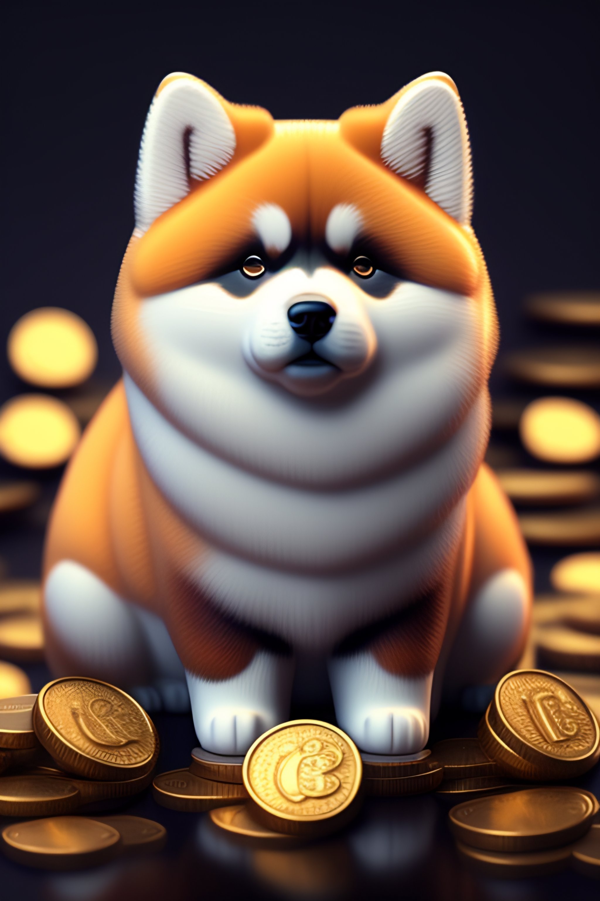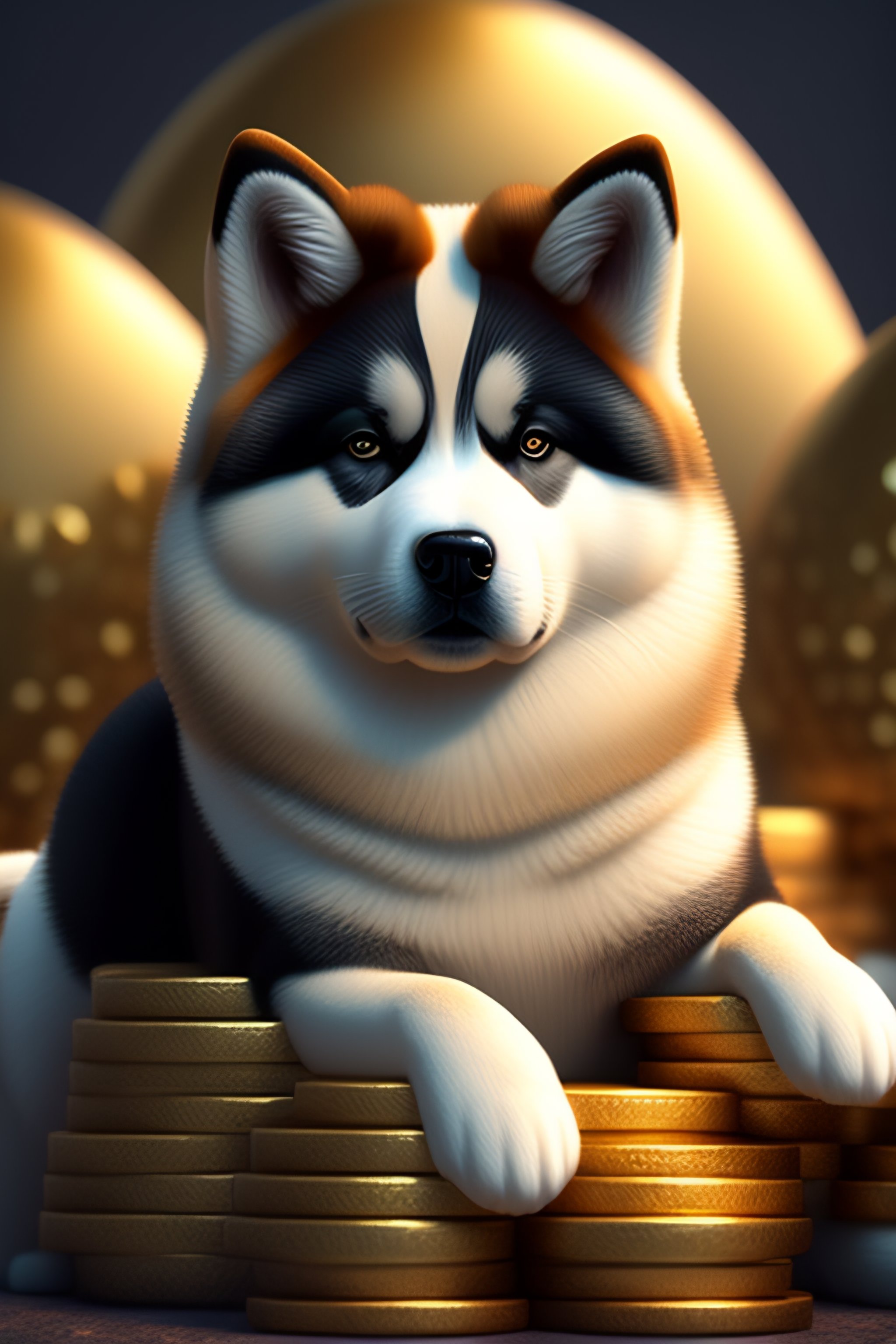 Cute and adorable cartoon fluffy akita inu sitting on a pile auf gold coins, fantasy, dreamlike, surrealism, supercute, trending on artstation