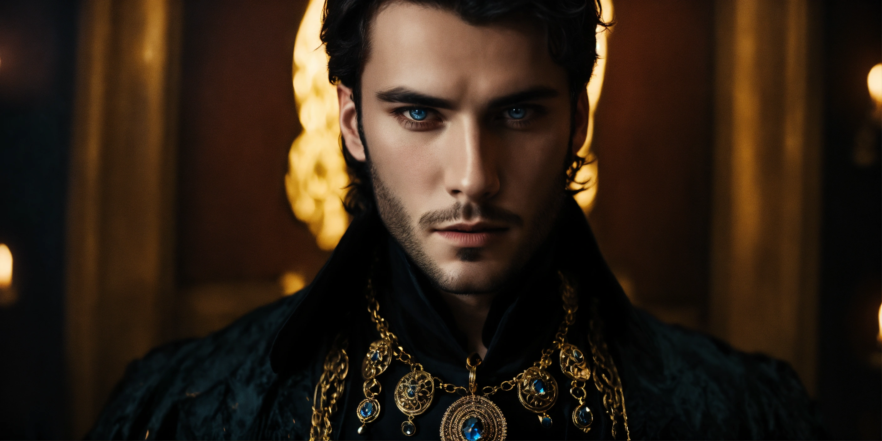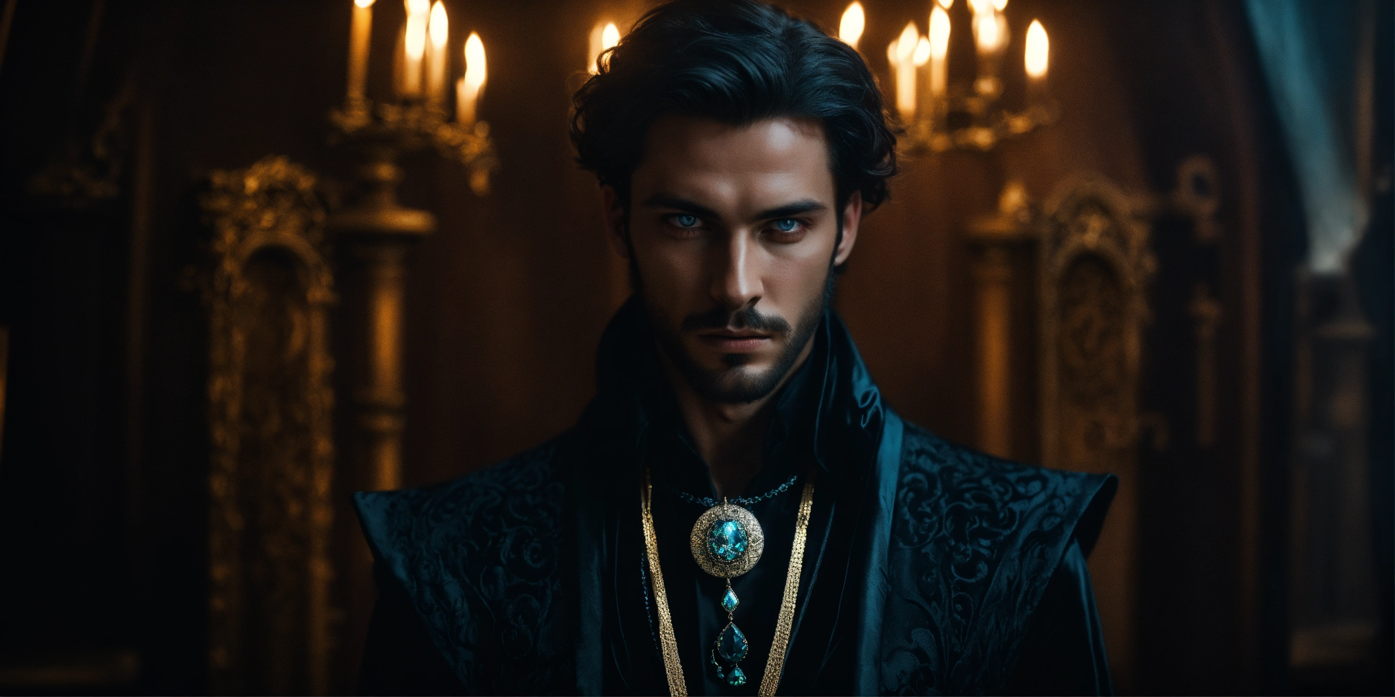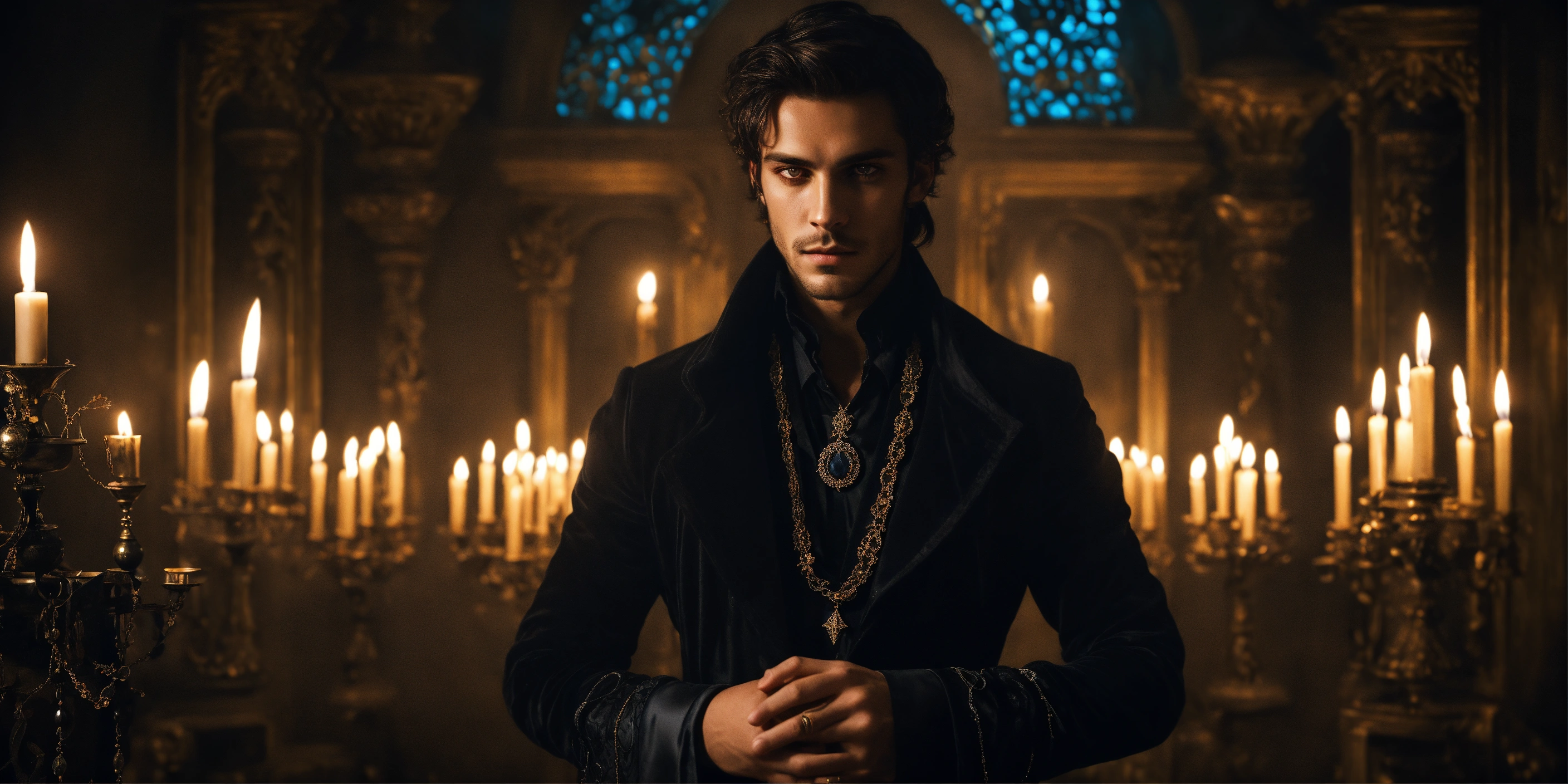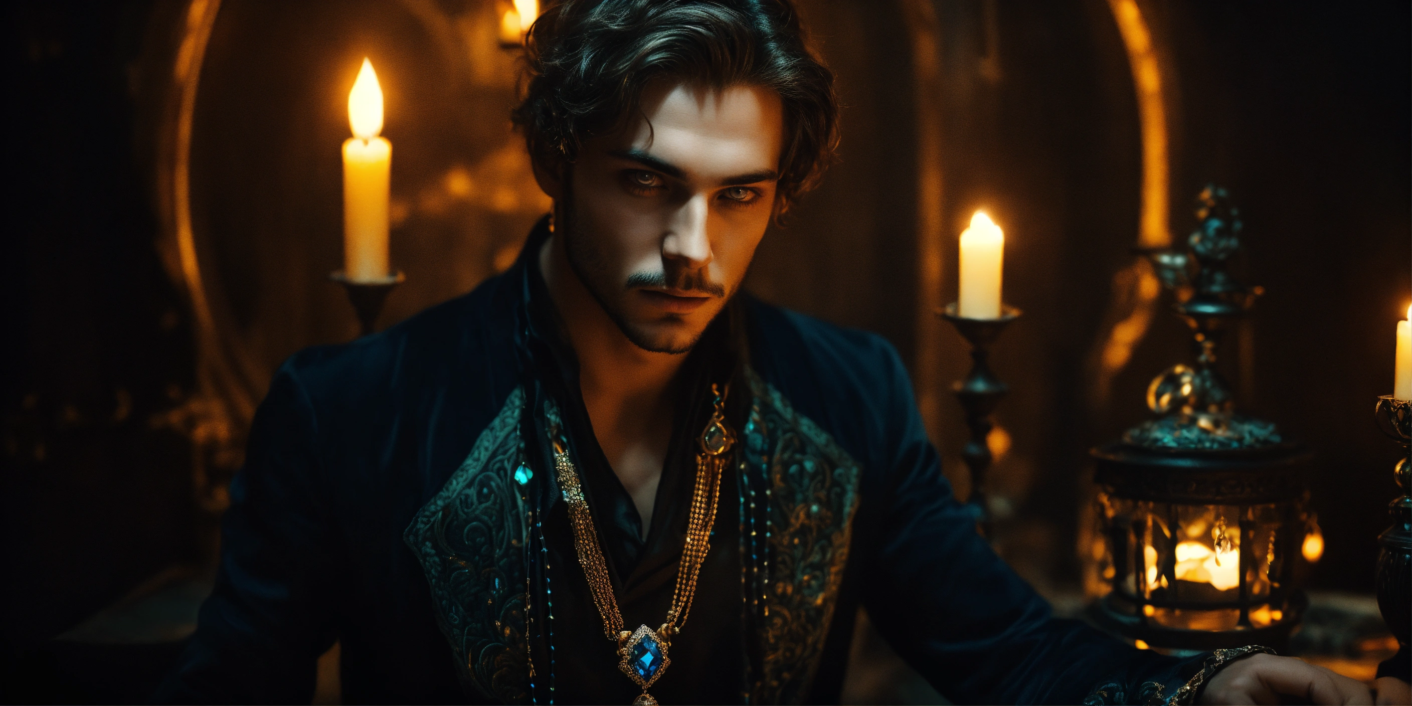 Dark and cinematic fantasy portrait of a young and handsome french sinister sorcerer with gleaming hypnotic eyes hypnotising the viewer, dressed in dark mysterious clothes and wearing enchanted jewellery in a secret occult chamber.