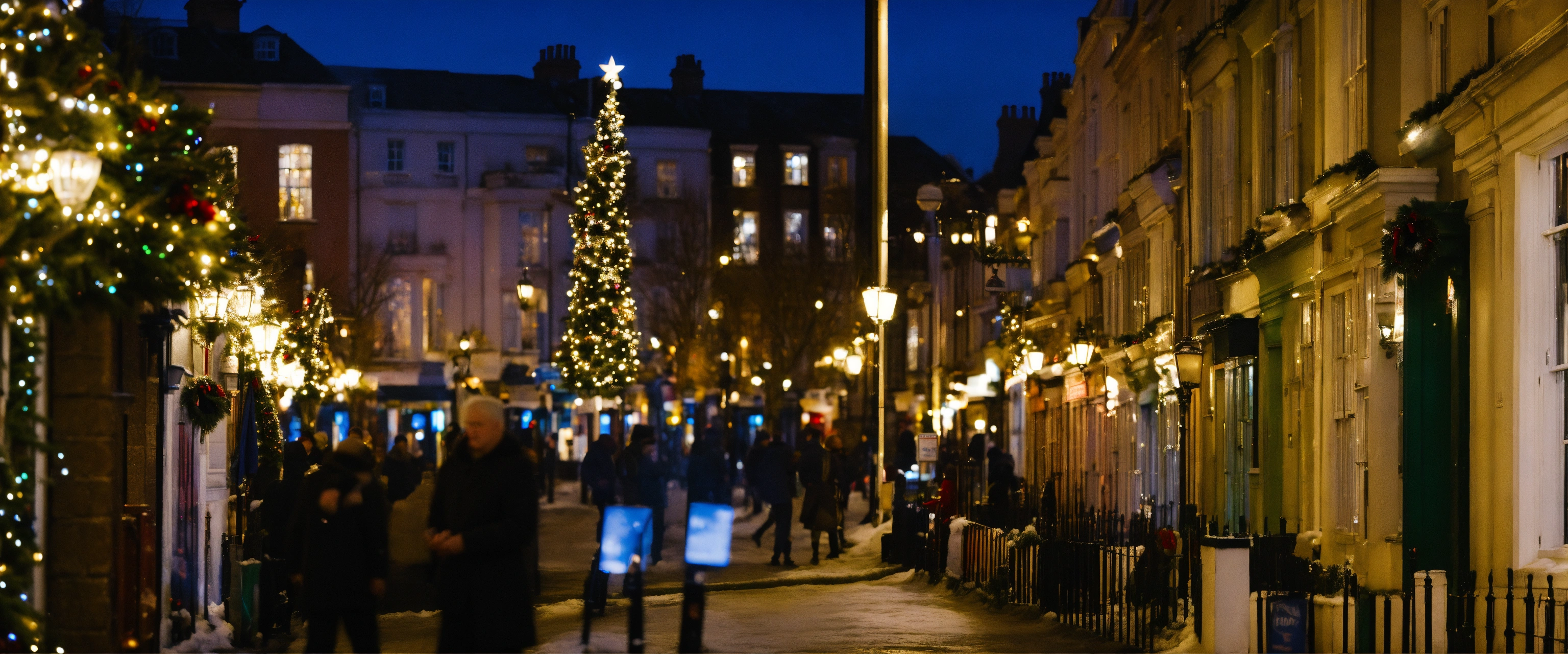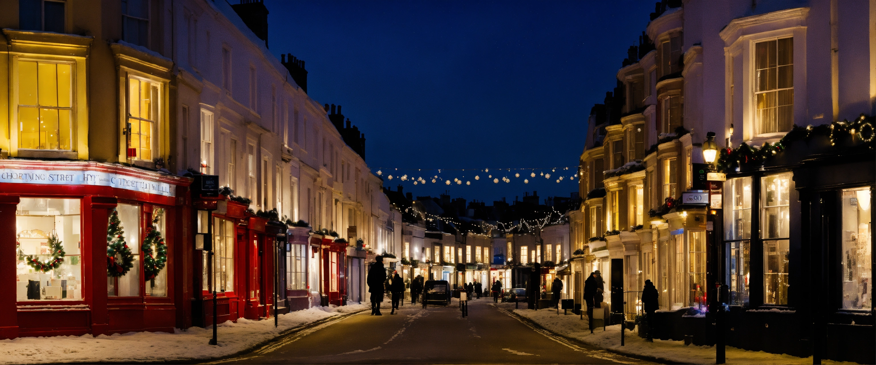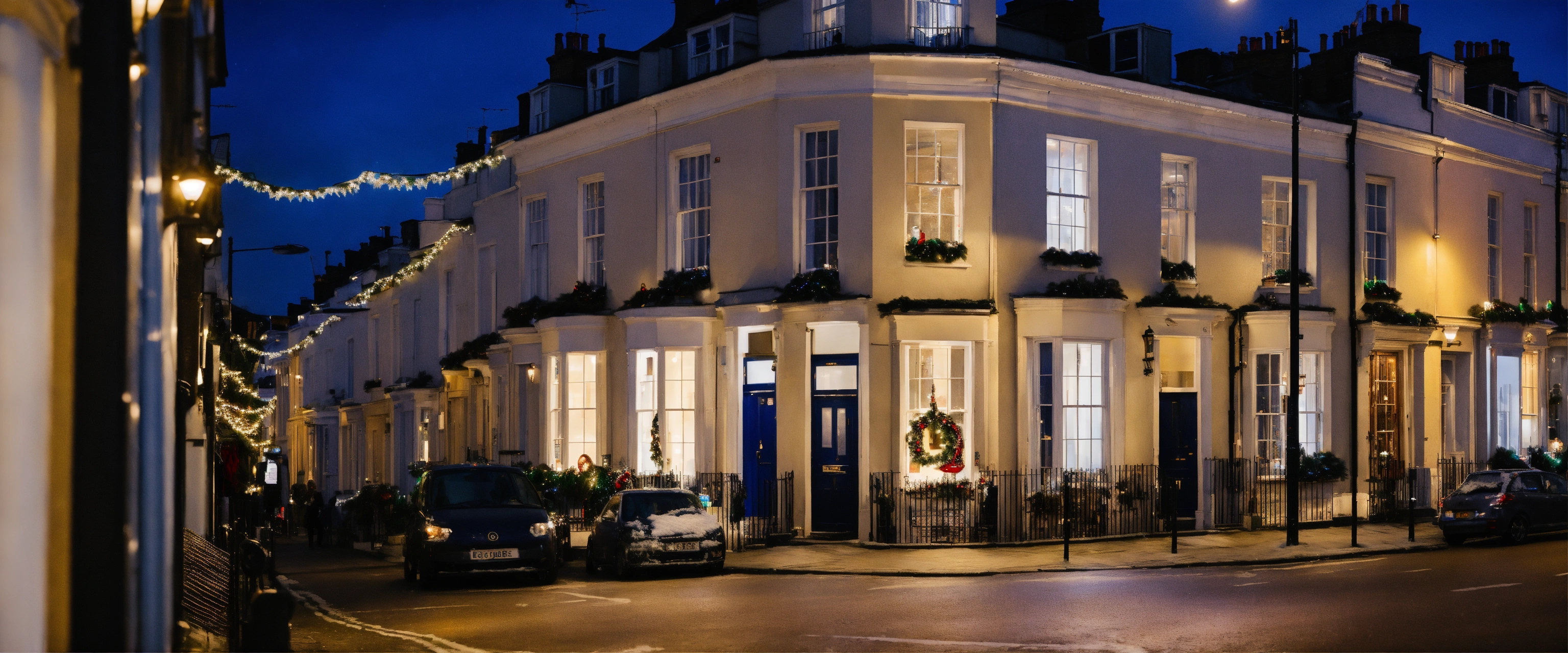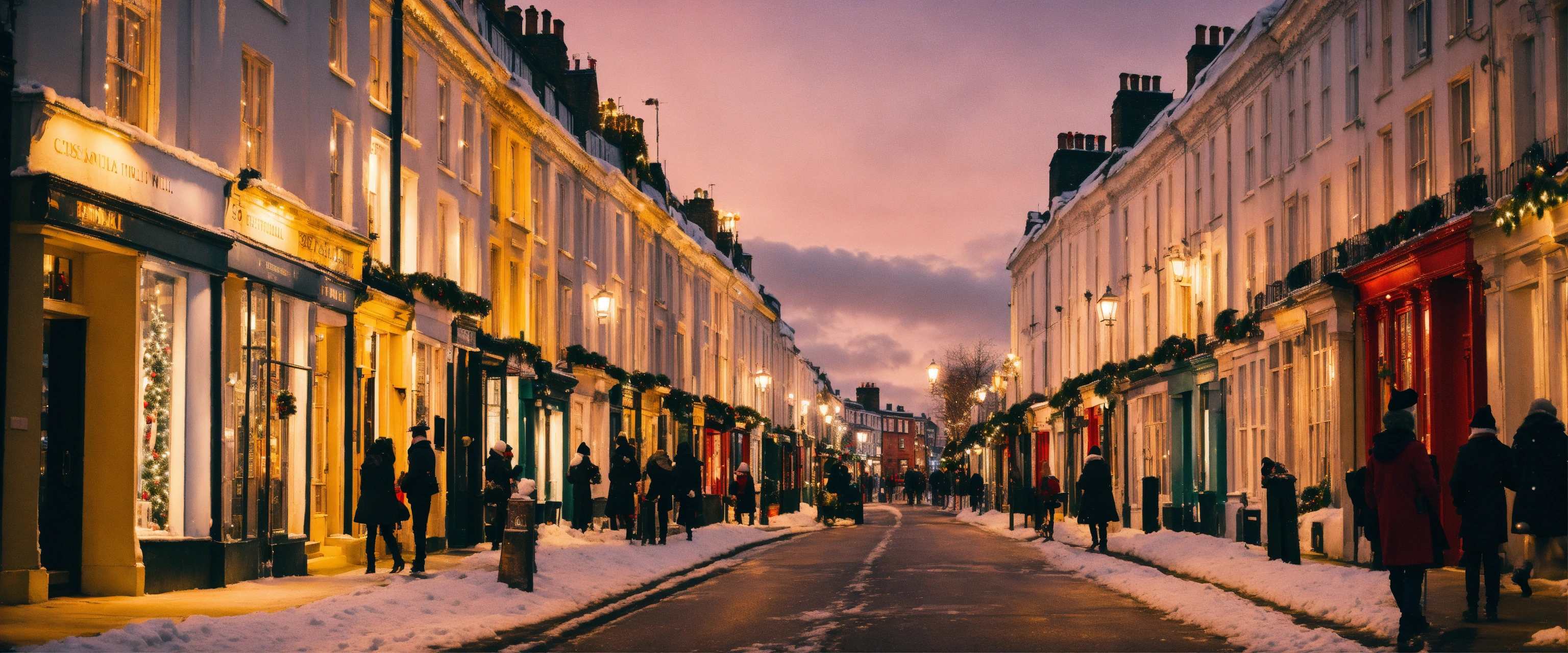 Notting hill street type at christmas with a slightly snowy, 50mm lens, dreamy, without people, street view from front, bokeh, light colors.