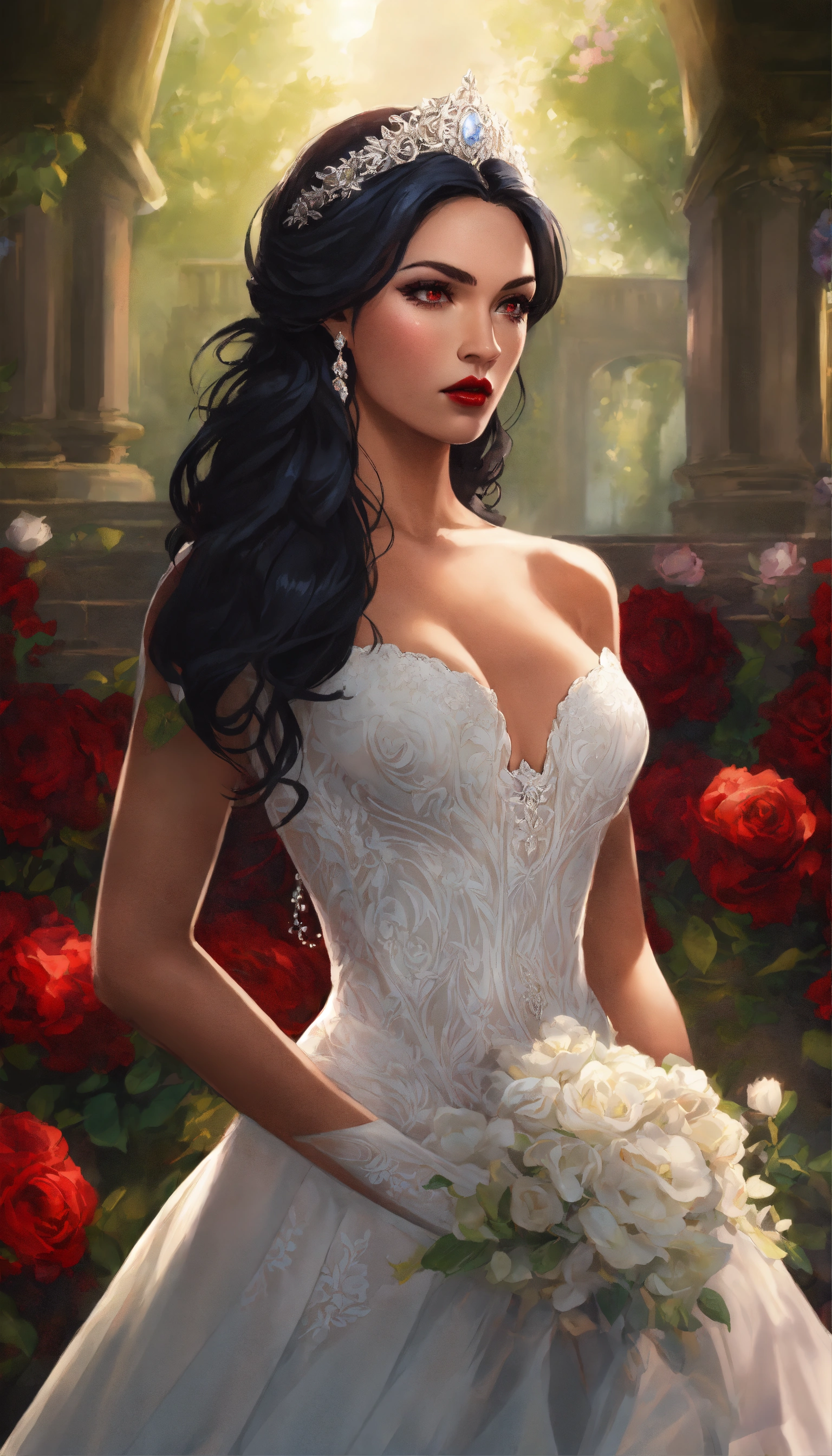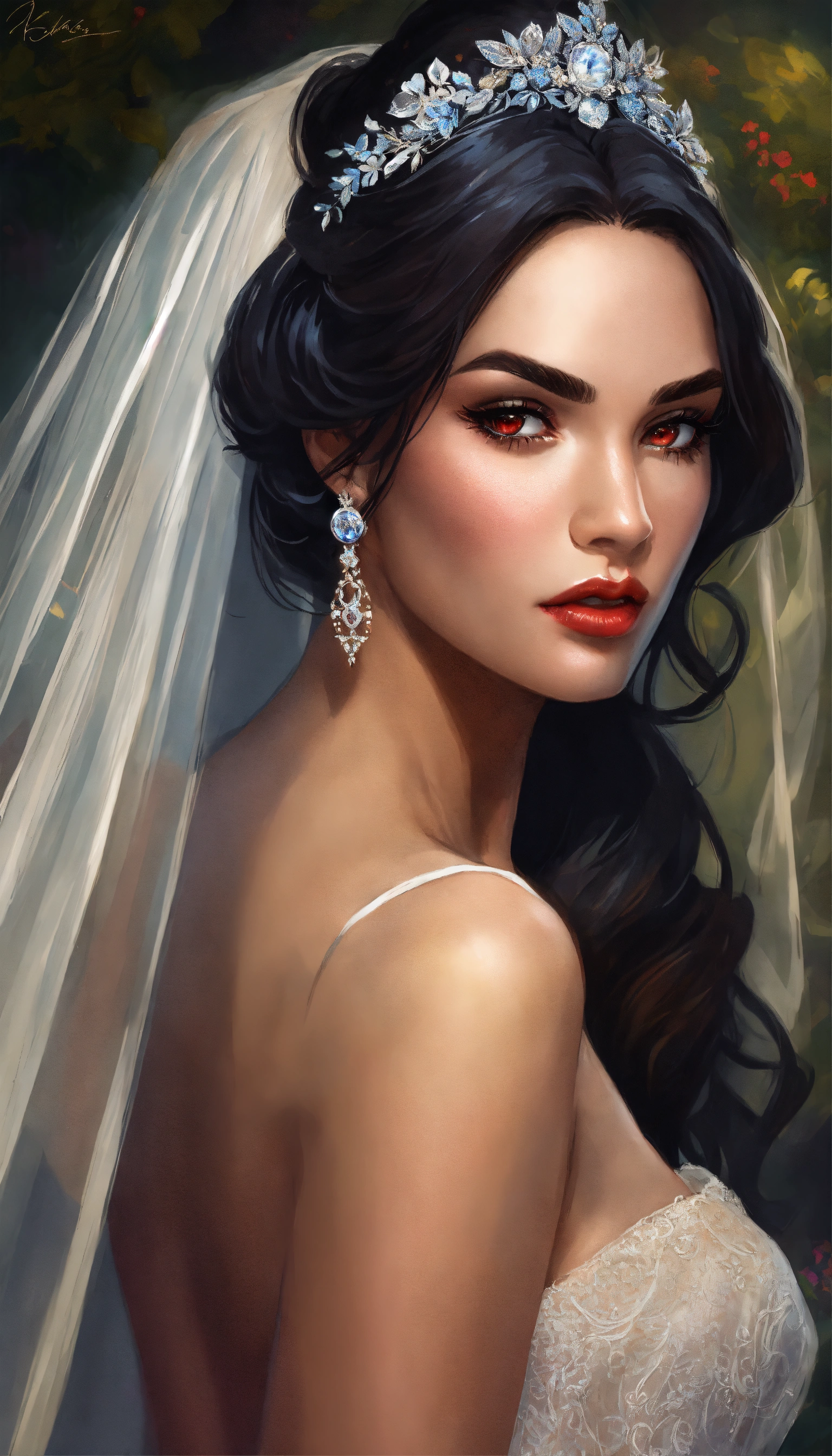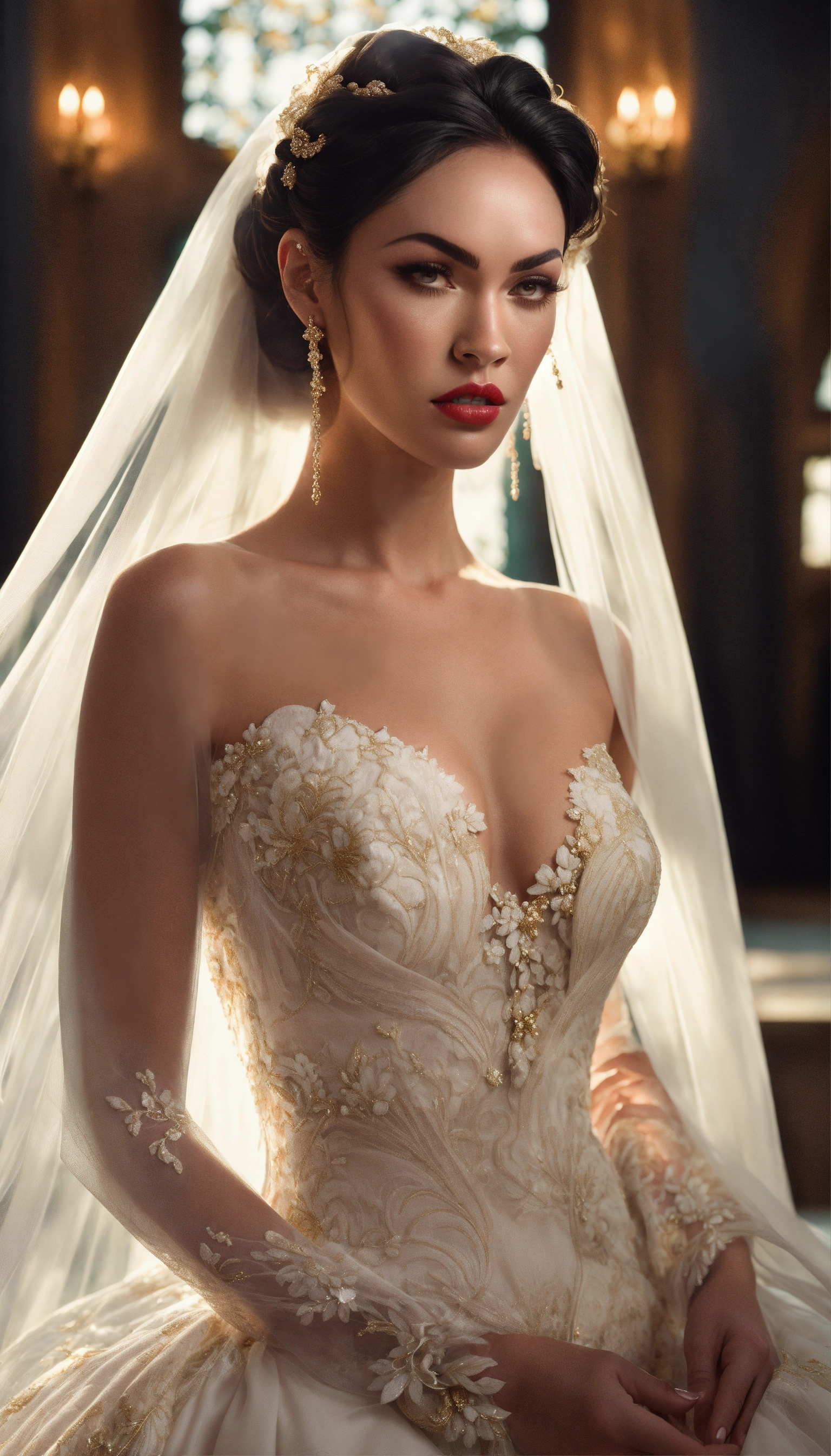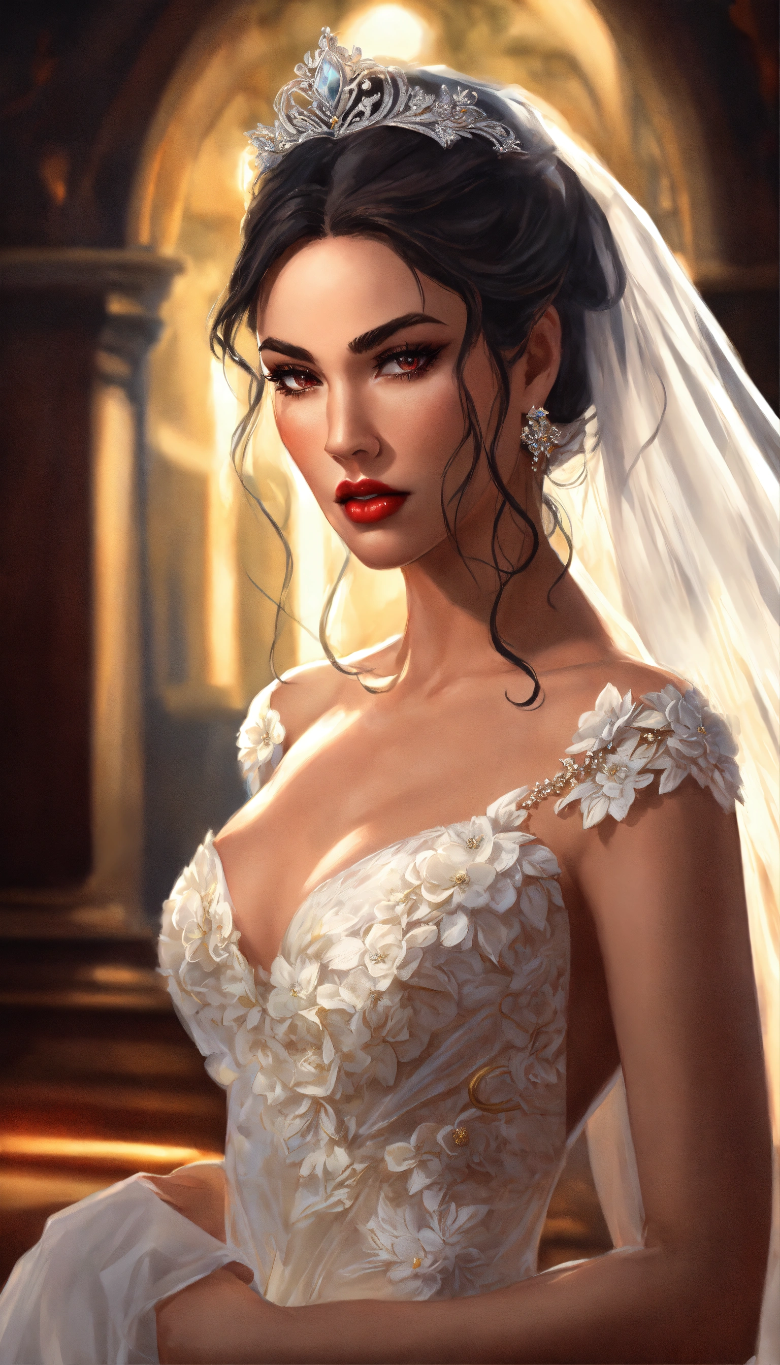 Concept art of ravenna, megan fox, glowing red eyes, curled voluminous flowing black hair in a formal wedding updo, hair in a bun, updo, bun, curled black hair tied up in a wedding bun, beautiful, tan skin, realistic, sabine rich, artgerm, j scott campbell, artgerm, perfect body, detailed, intricate, round face, slim nose, long black eyelashes, red lips, sharp jawline, perfect detailed face, realistic, floor length white veil, full body view, evil dark sorceress, gloomy grey castle background, gloomy dark flowers forest castle, white floor length fitted full skirts a-line bridal gown, low cut neckline, gold high heels, voluminous curled long hair, white train veil, white a-line bridal gown, very long ivory long veil and hair tied up, ivory fitted bridal gown, big voluminous long train full skirt gown, forest, yennefer, zuhair murad bridal, zuhair murad bridal a-line gown, ivory patterned textured silk shimmer fabric embroidered dress, train wedding dress, walking down aisle, sleeves