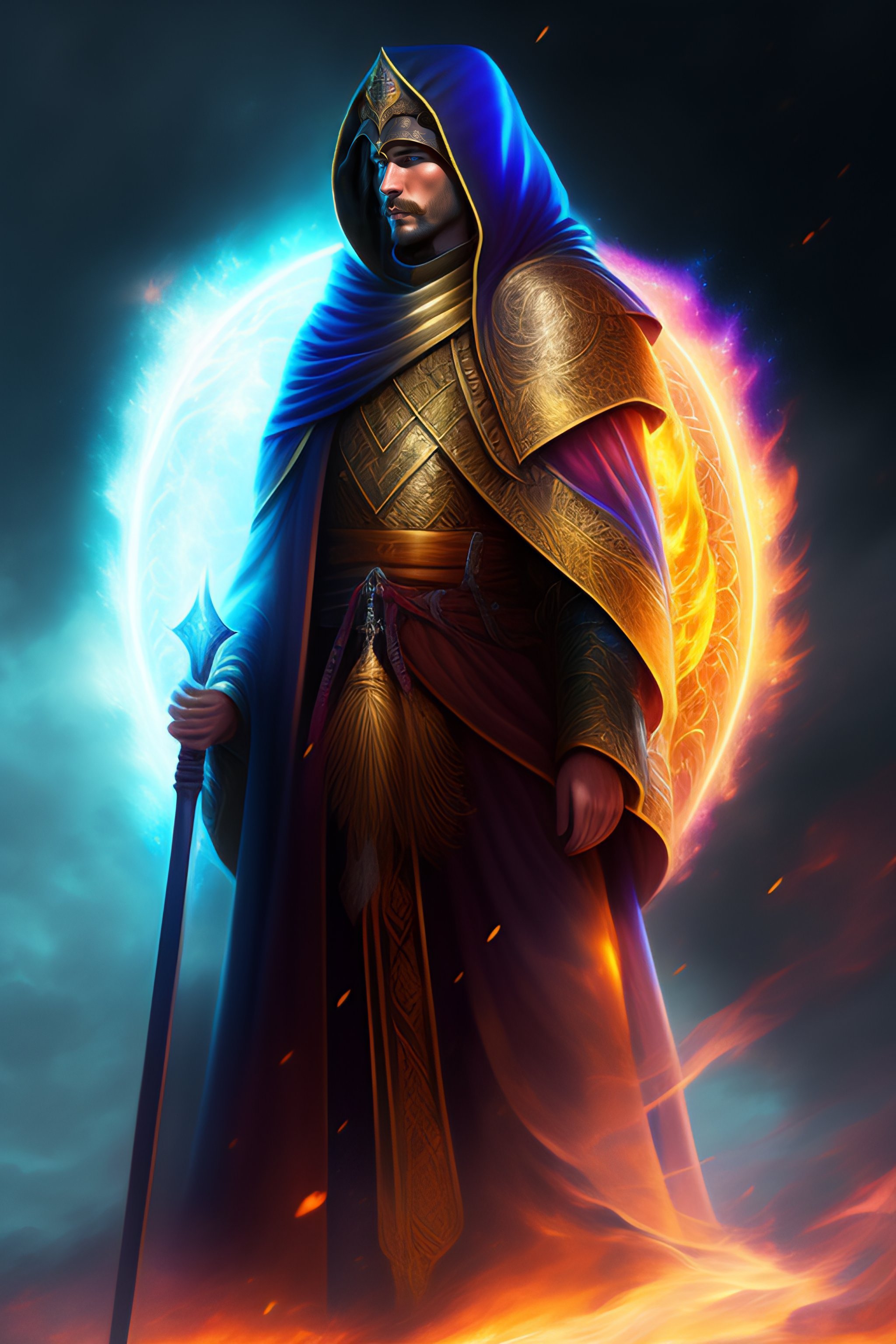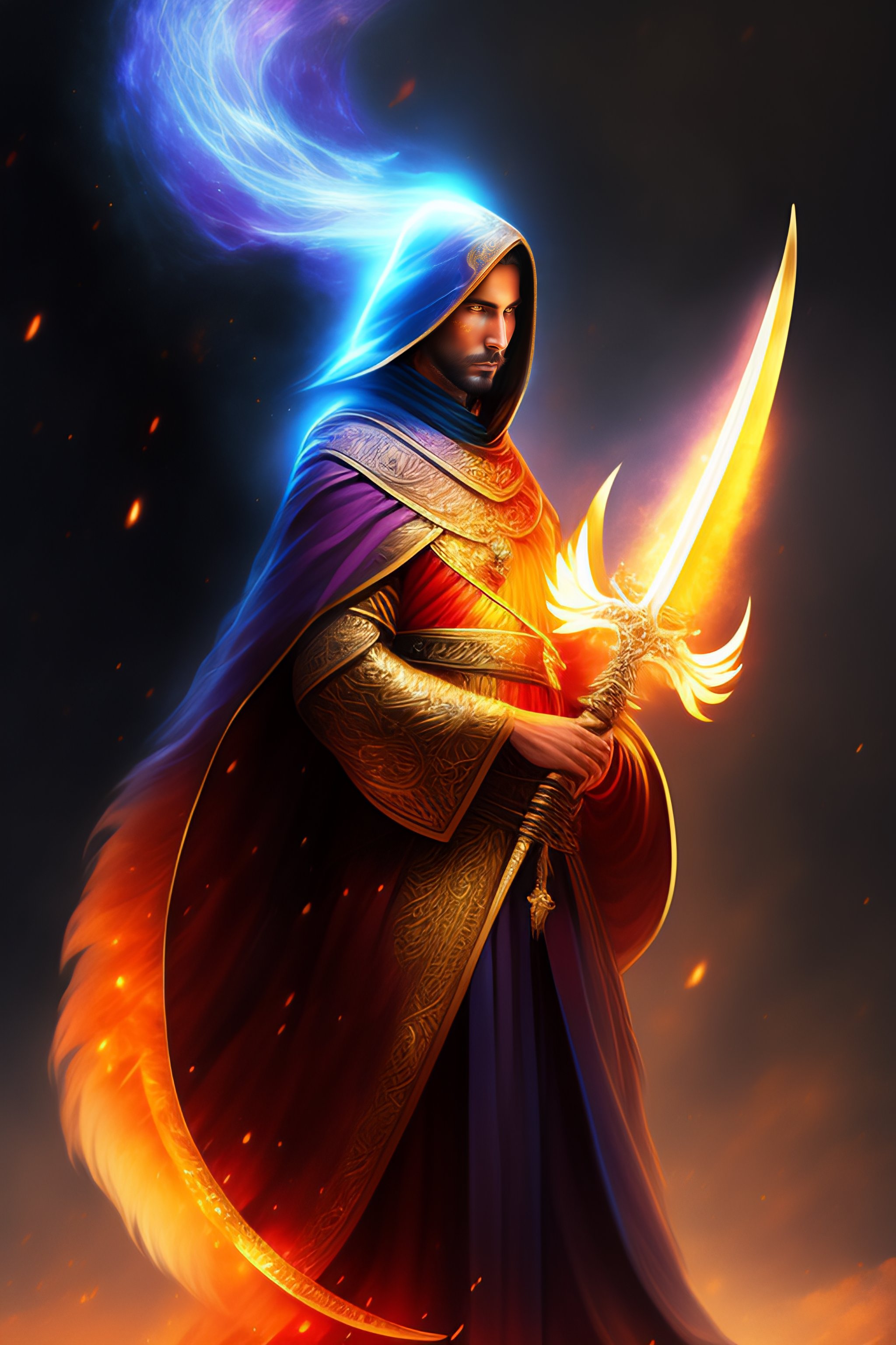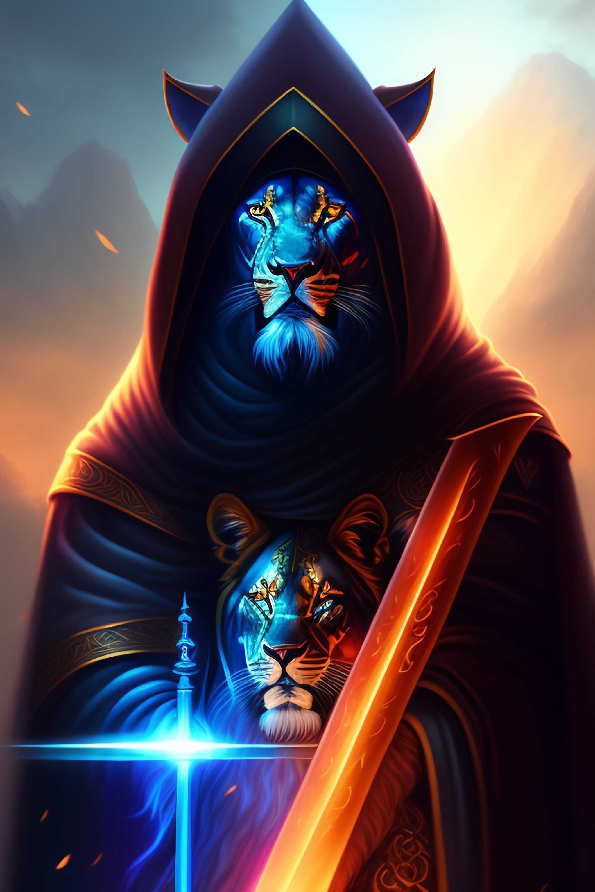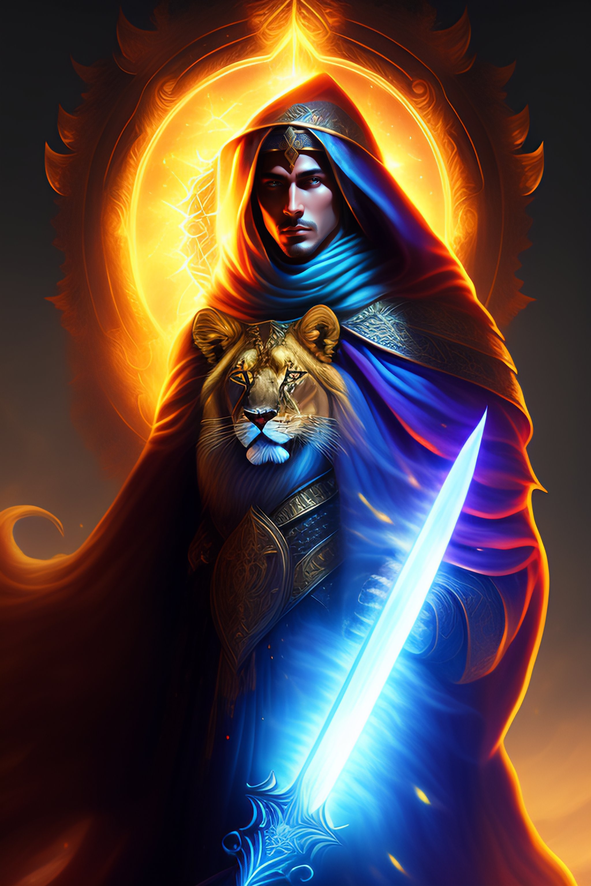Cloaked mage with a sword and a giant glowing divine lion beside him