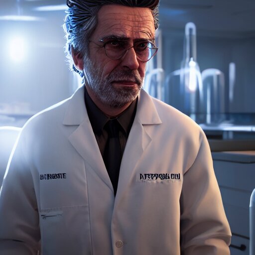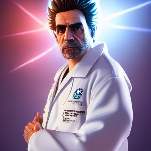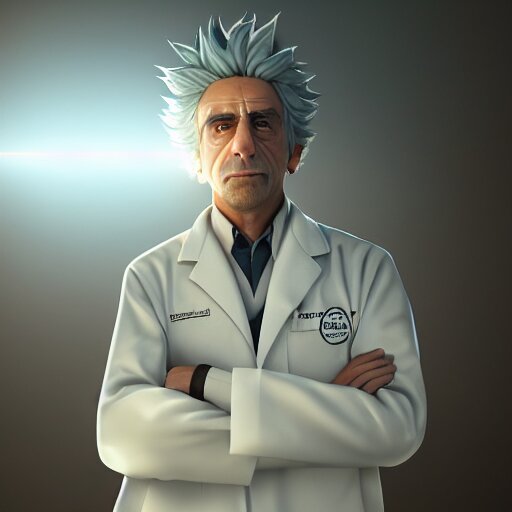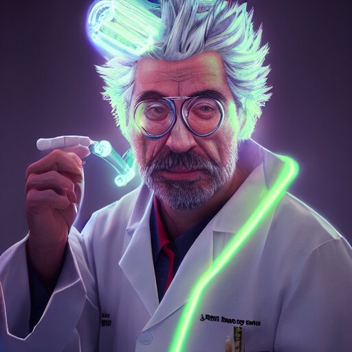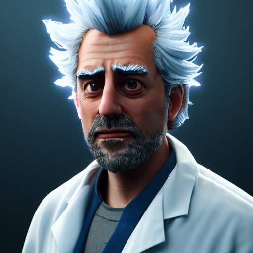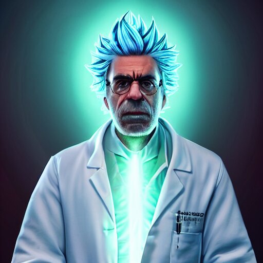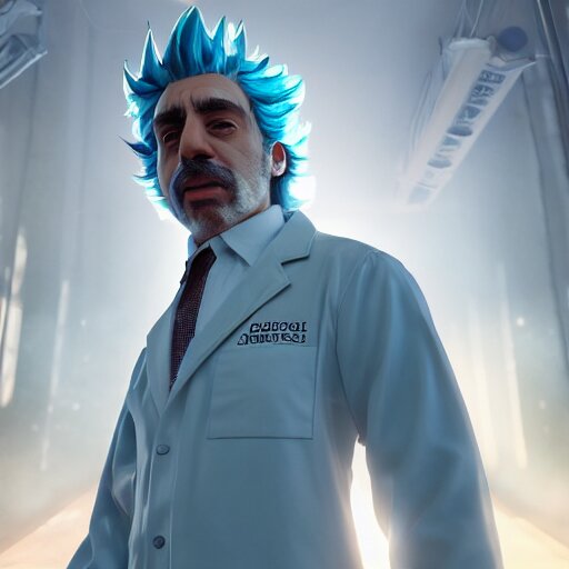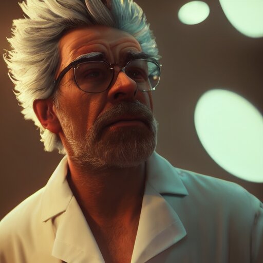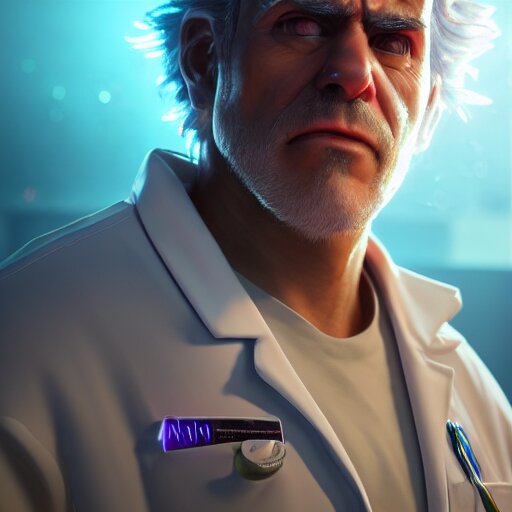 Portrait art of rick sanchez, lab coat, 8 k ultra realistic, lens flare, atmosphere, glow, detailed, intricate, full of colour, cinematic lighting, trending on artstation, 4 k, hyperrealistic, focused, extreme details, unreal engine 5, cinematic, masterpiece