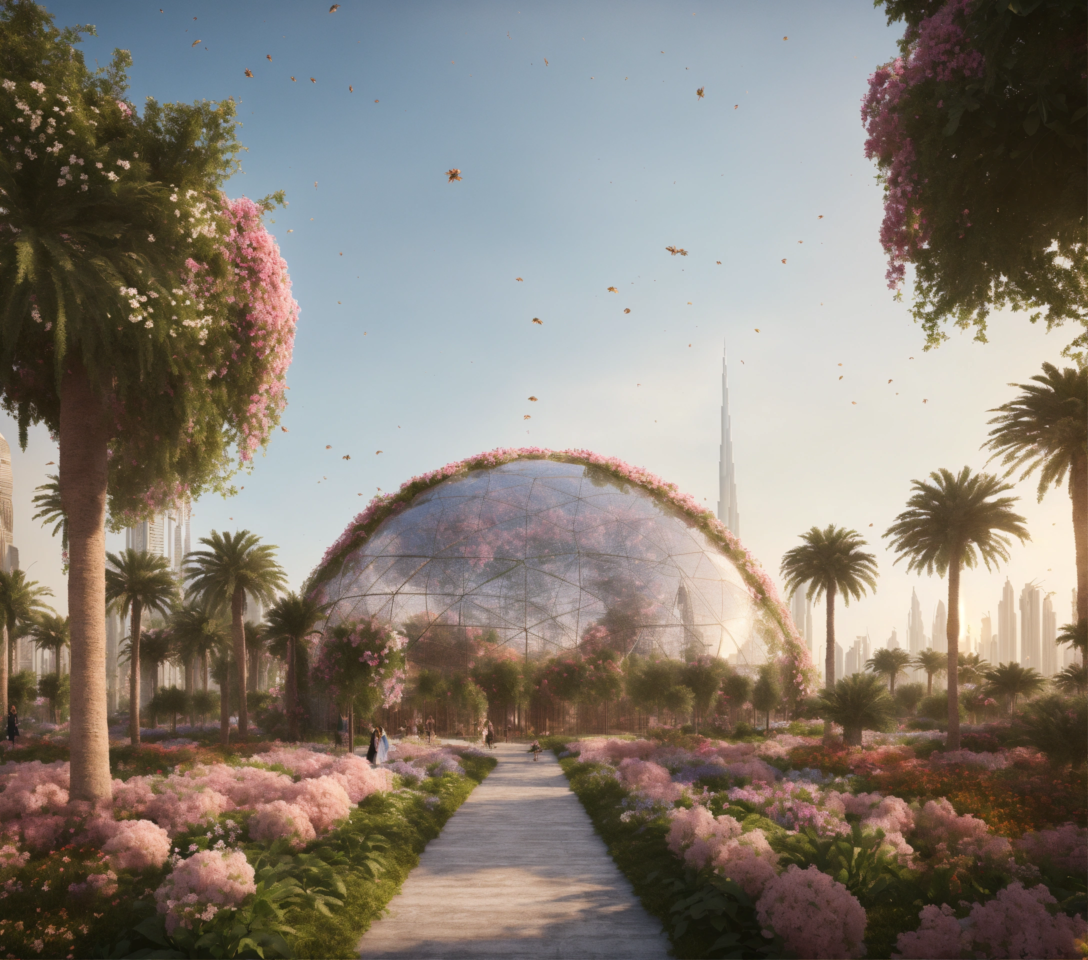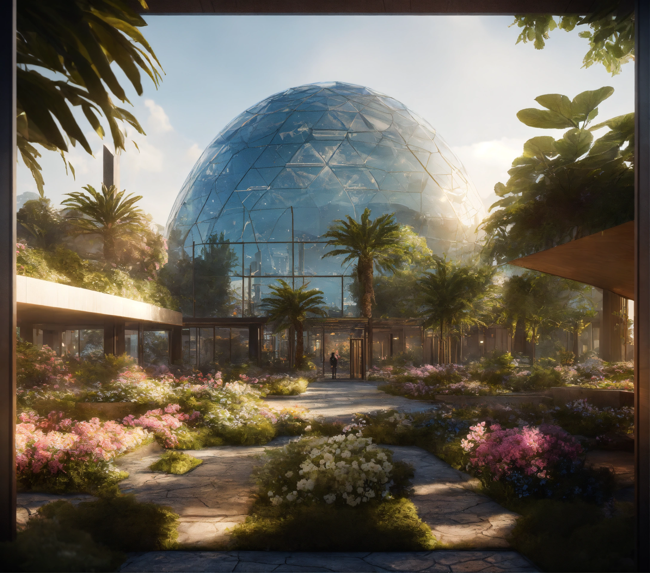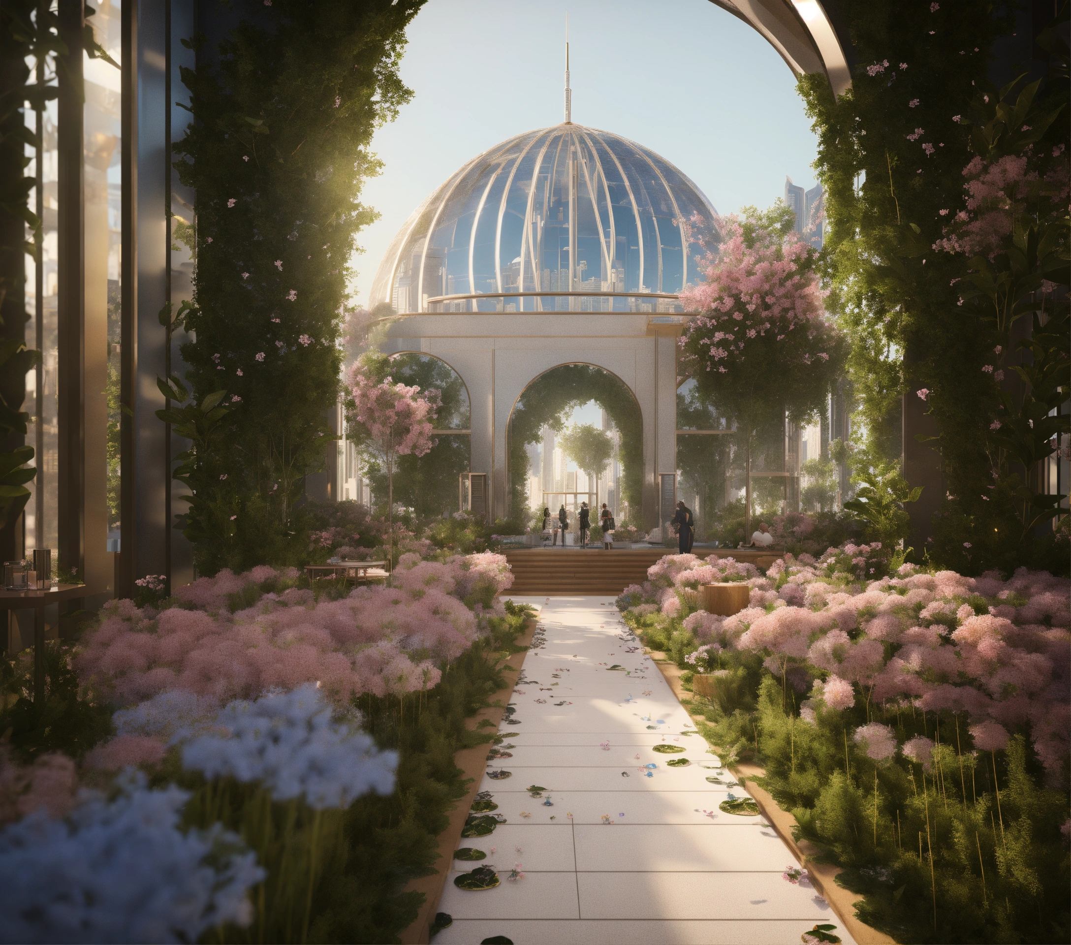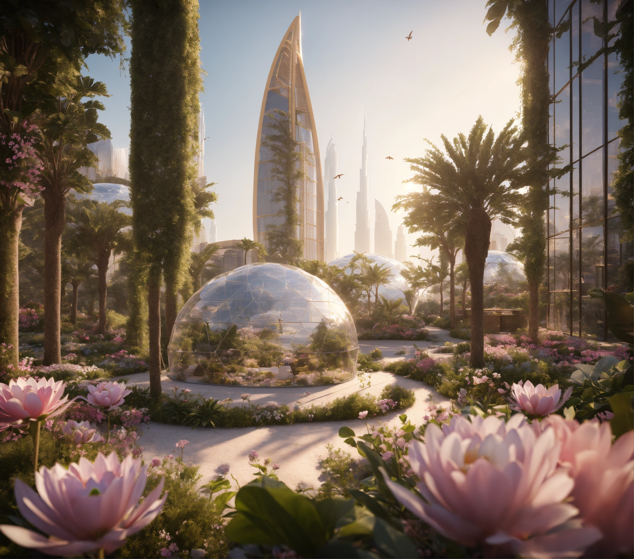 Futuristic city, ludic space, nature, dome conference, transparente, leaf, flowers, esg, dubai, tech, octane render, ultra-realistic, detail, 4k