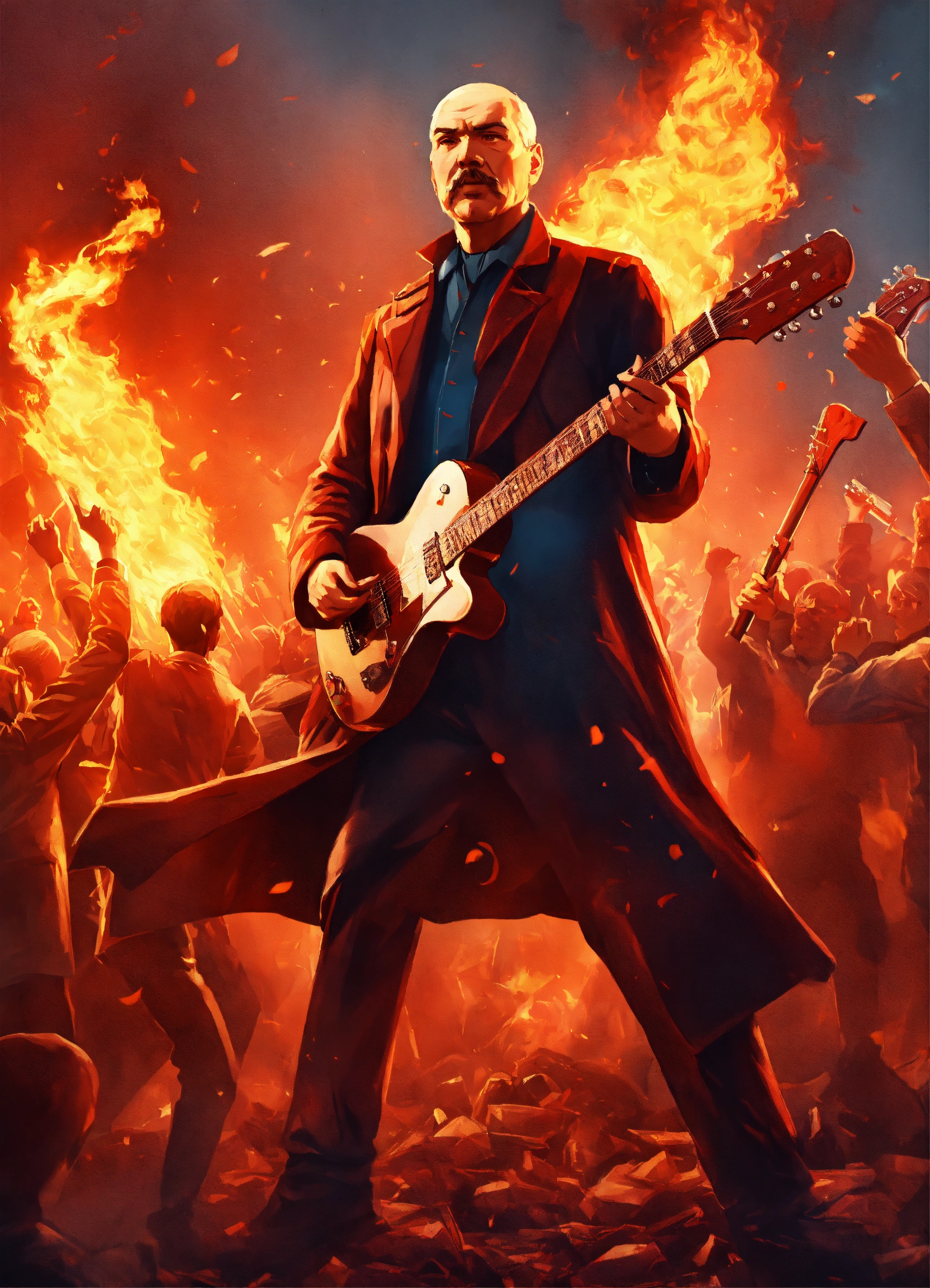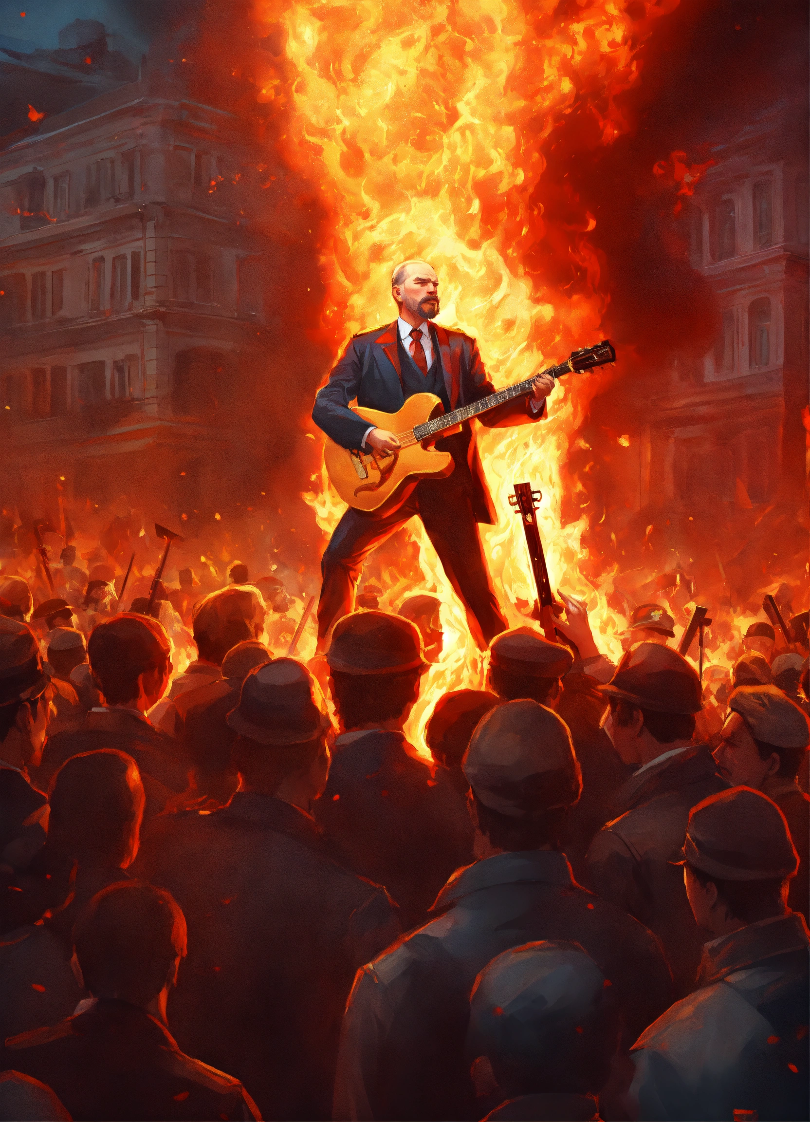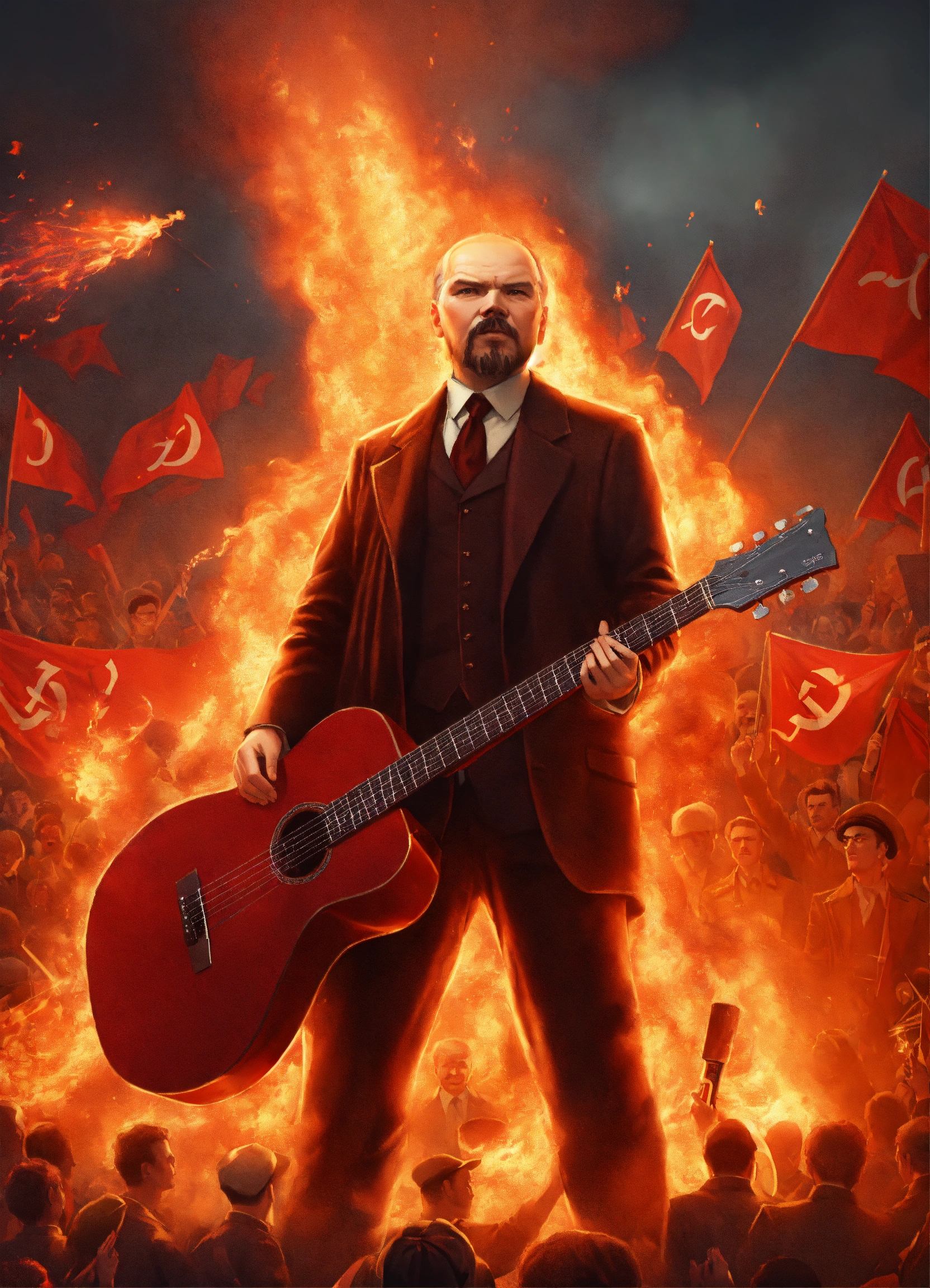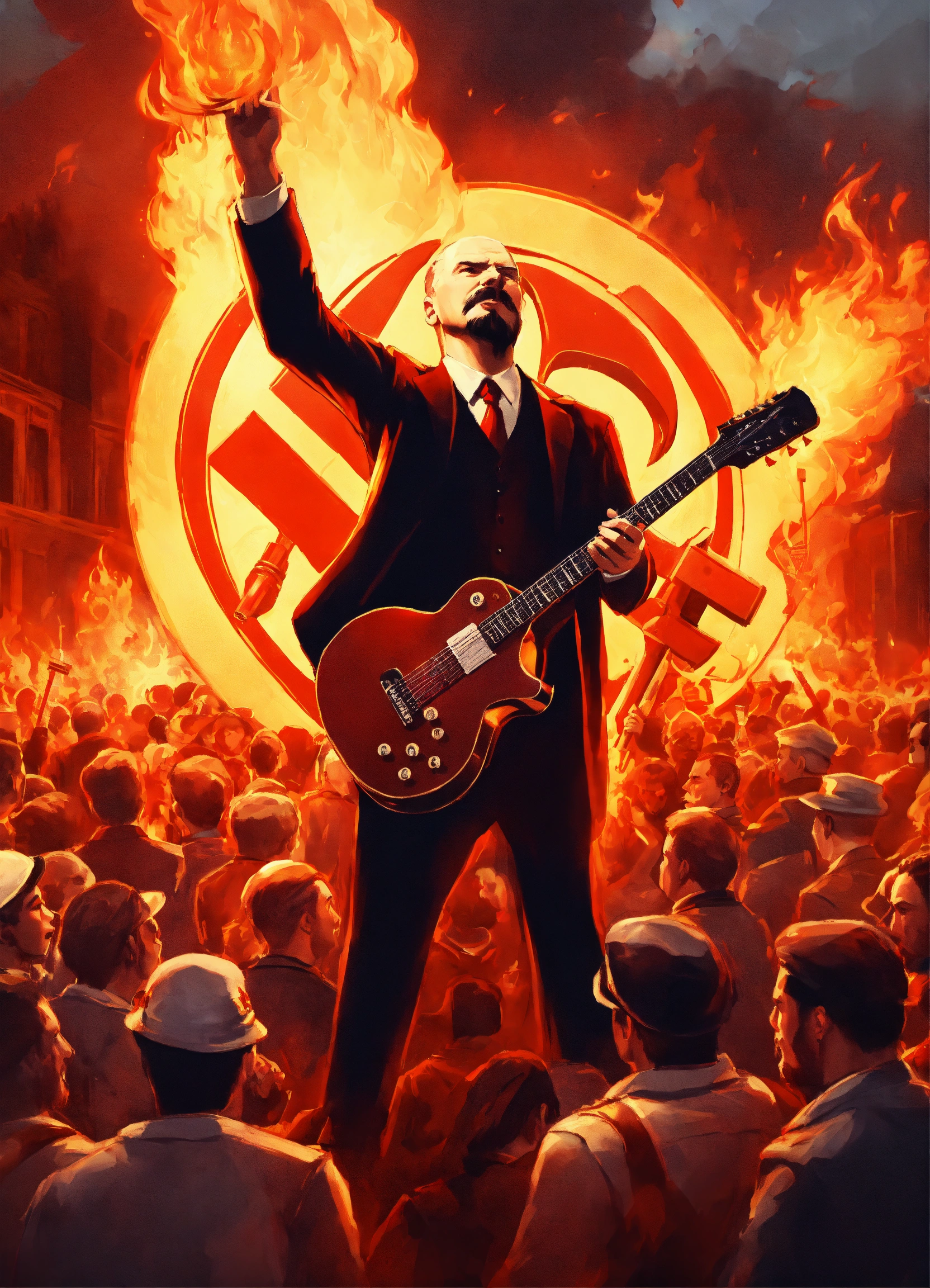 Illustration a lenin-esque figure, surrounded by a fervent crowd, strumming a flaming eletric guitar that carries the distinct hammer and sickle. the atmosphere is charged with revolutionary spirit and fiery passion. super realistic 8k image