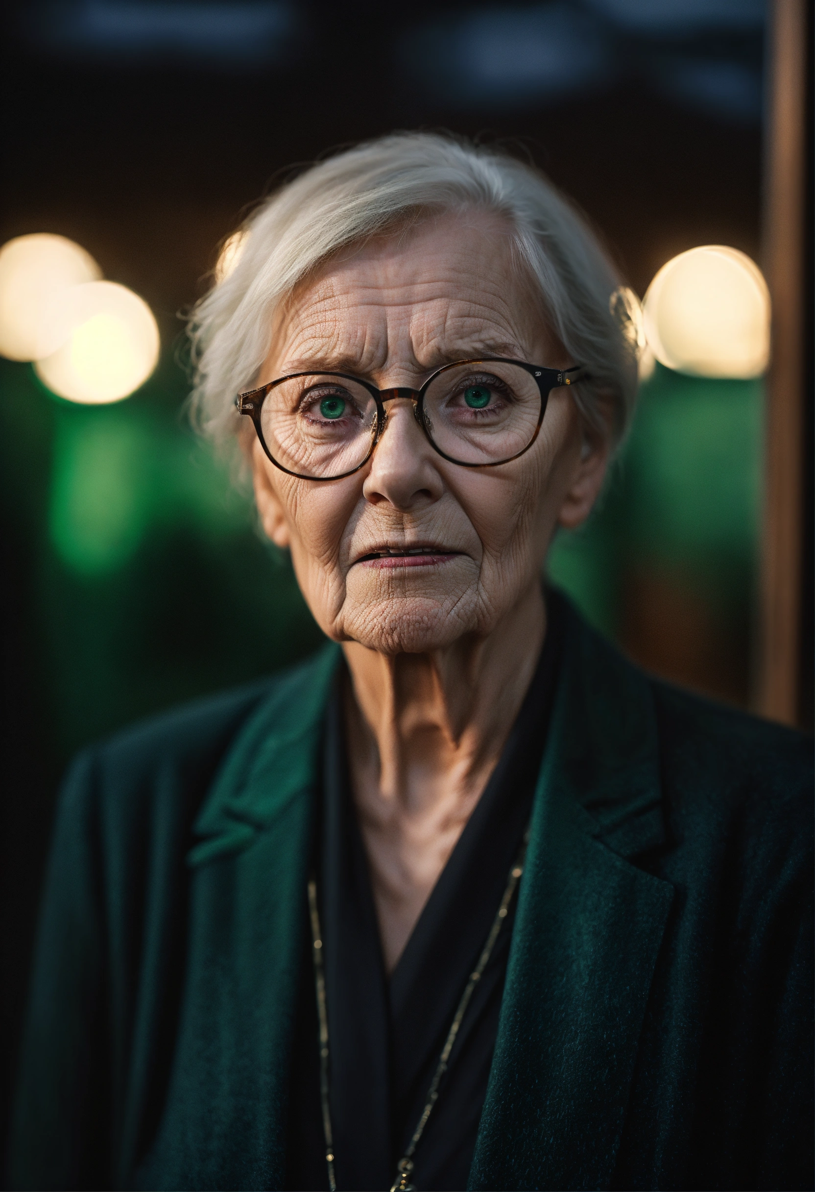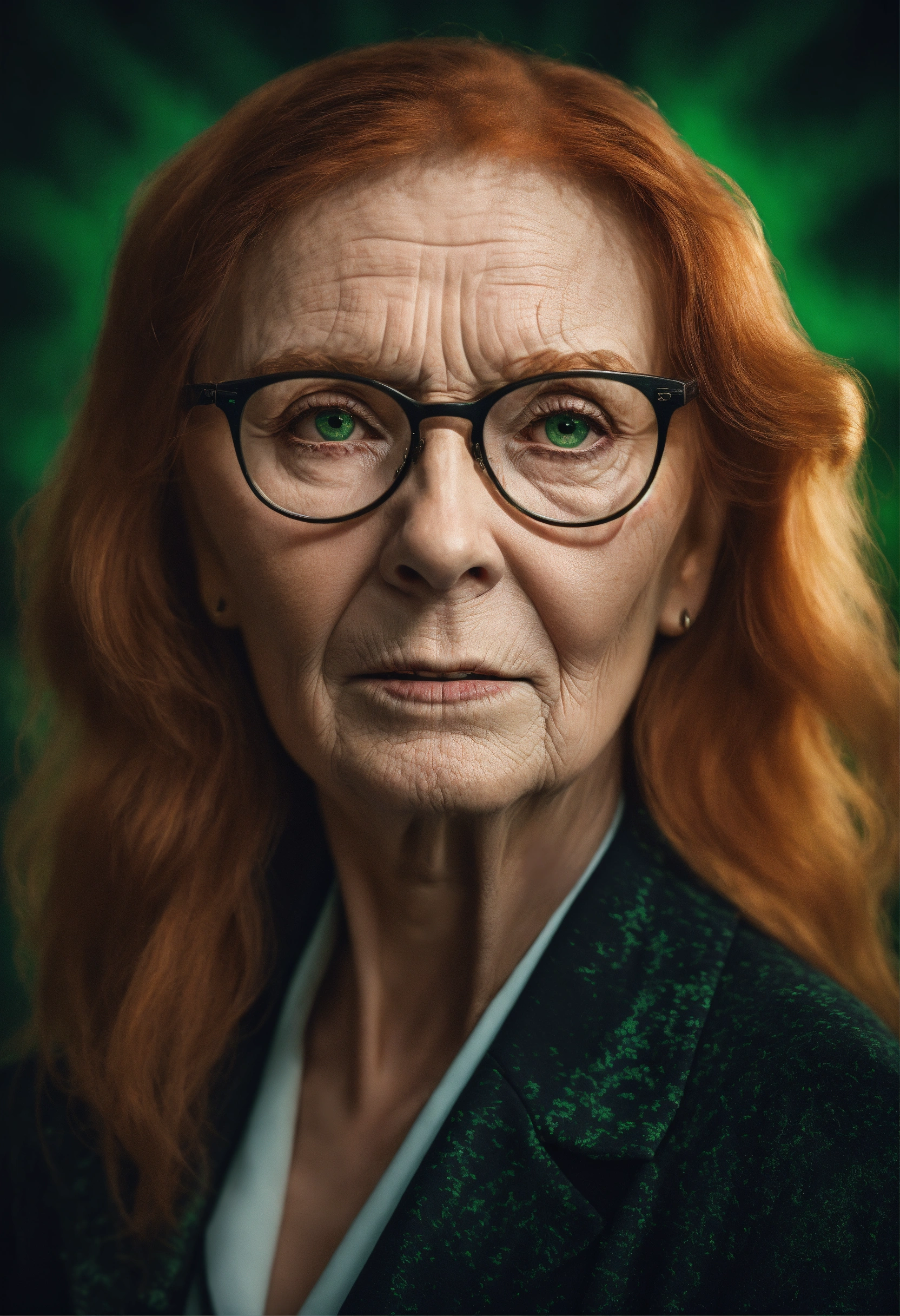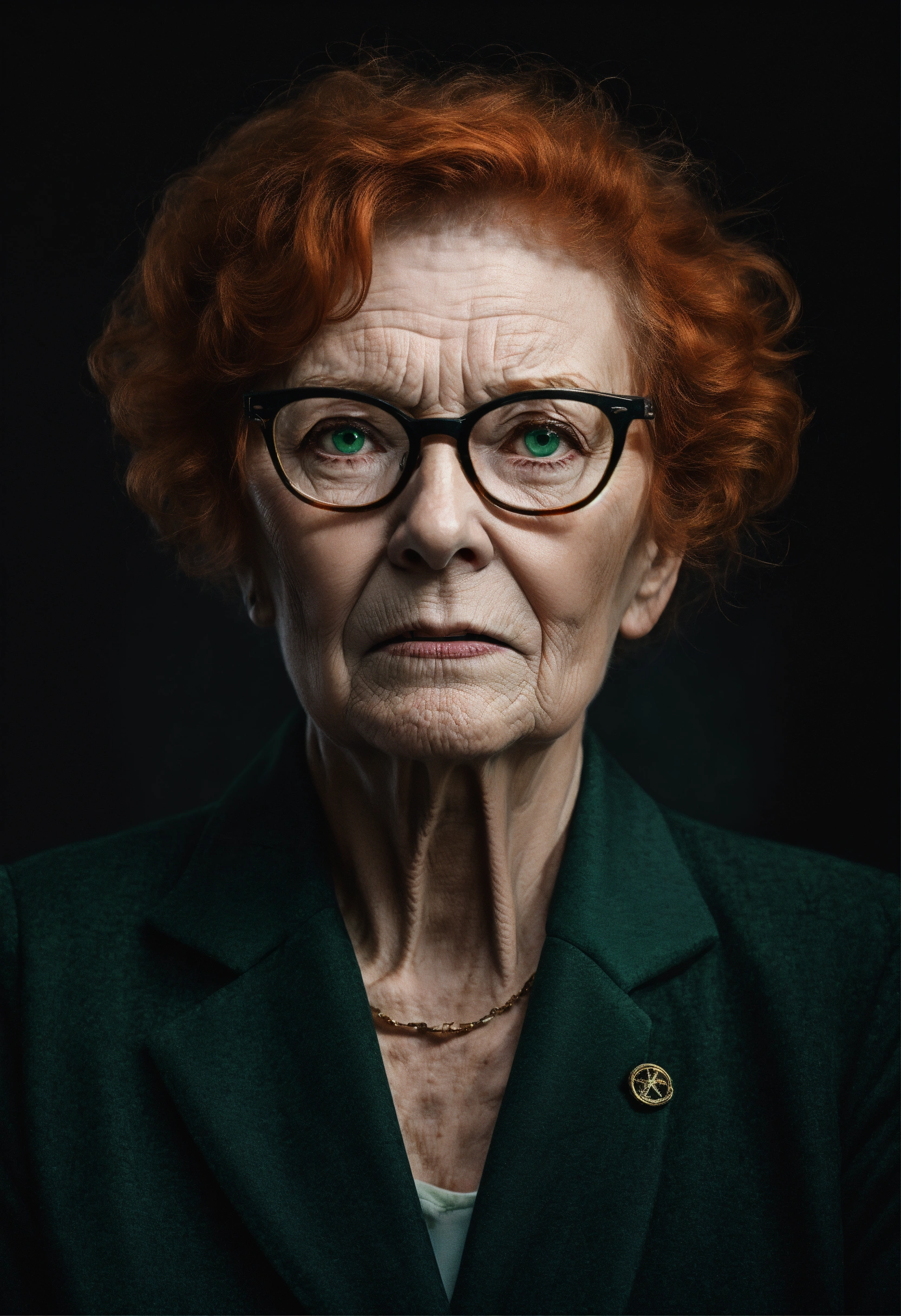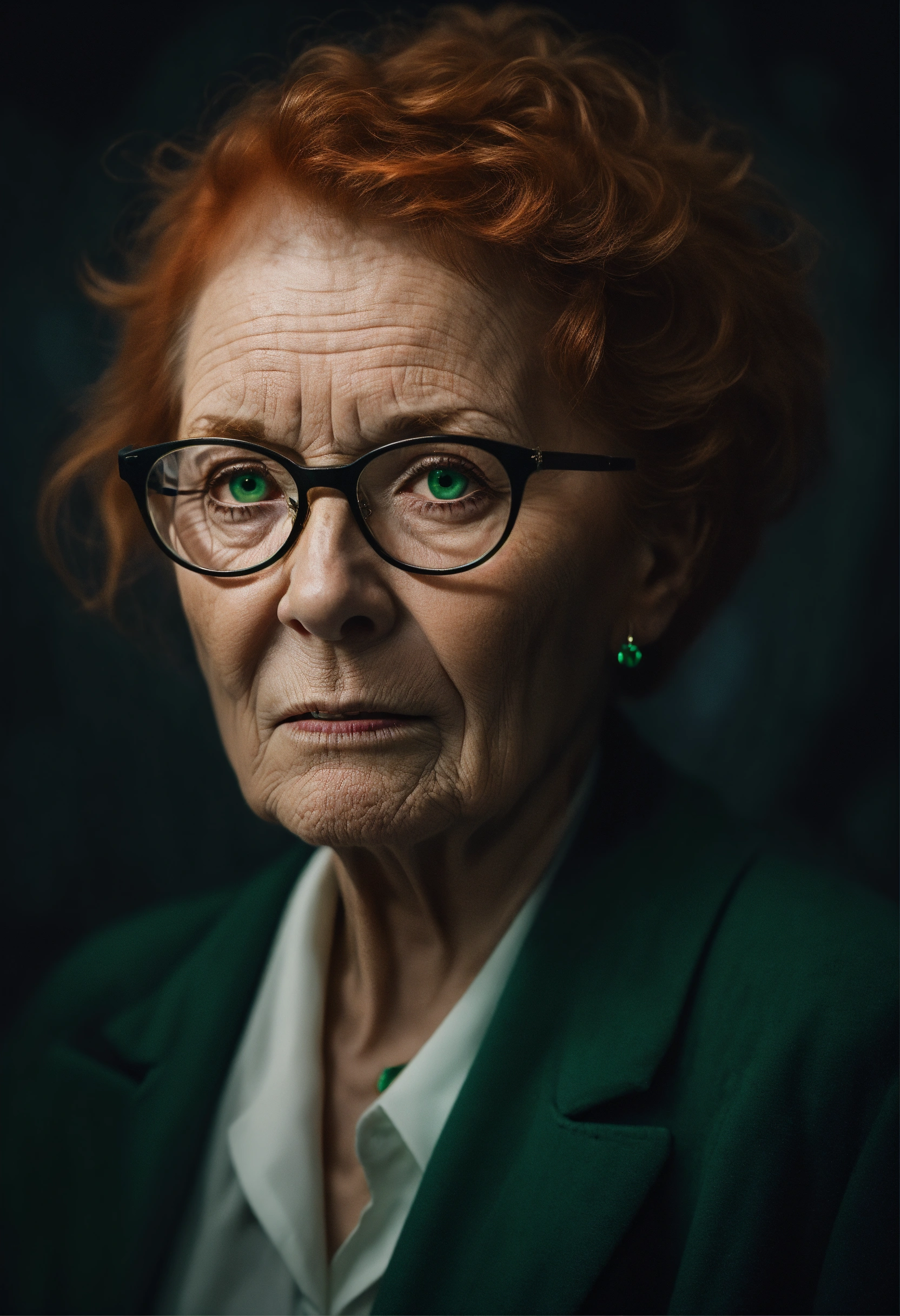 A realistic photograph of a scary white 70-year-old woman, with an intimidating expression, dark green eyes, scary face, with ginger hair, deep eyes, with glasses, wearing a black blazer, dramatic illumination, hyperdetailed, hyperrealistic, 8 k