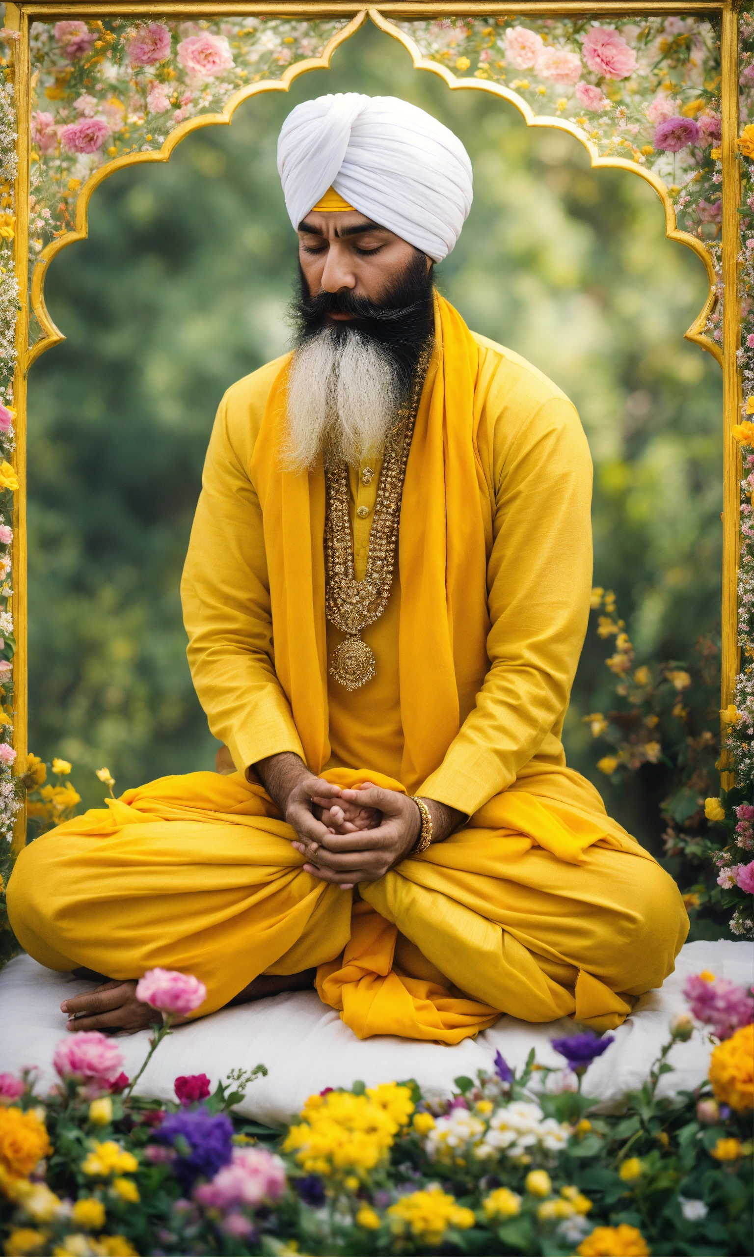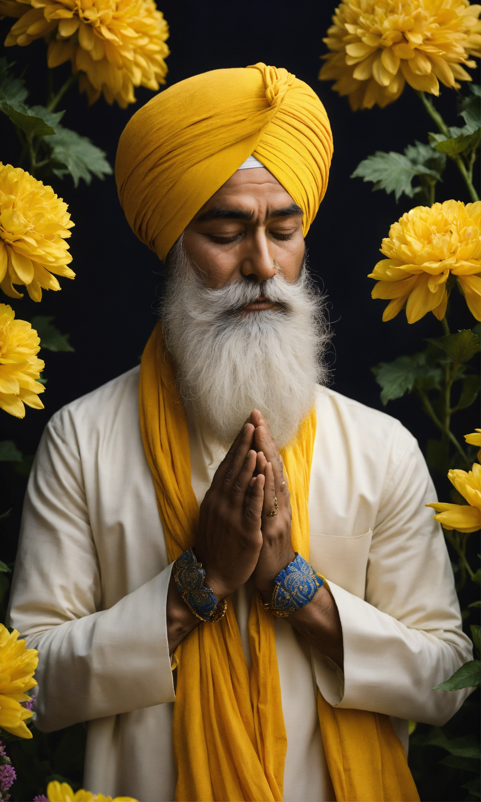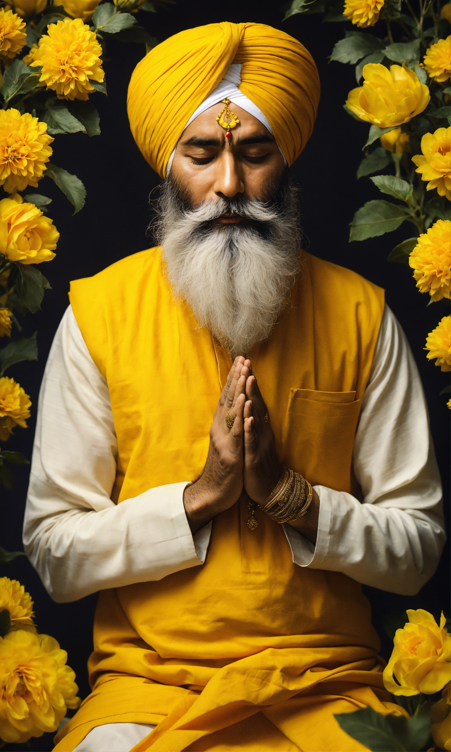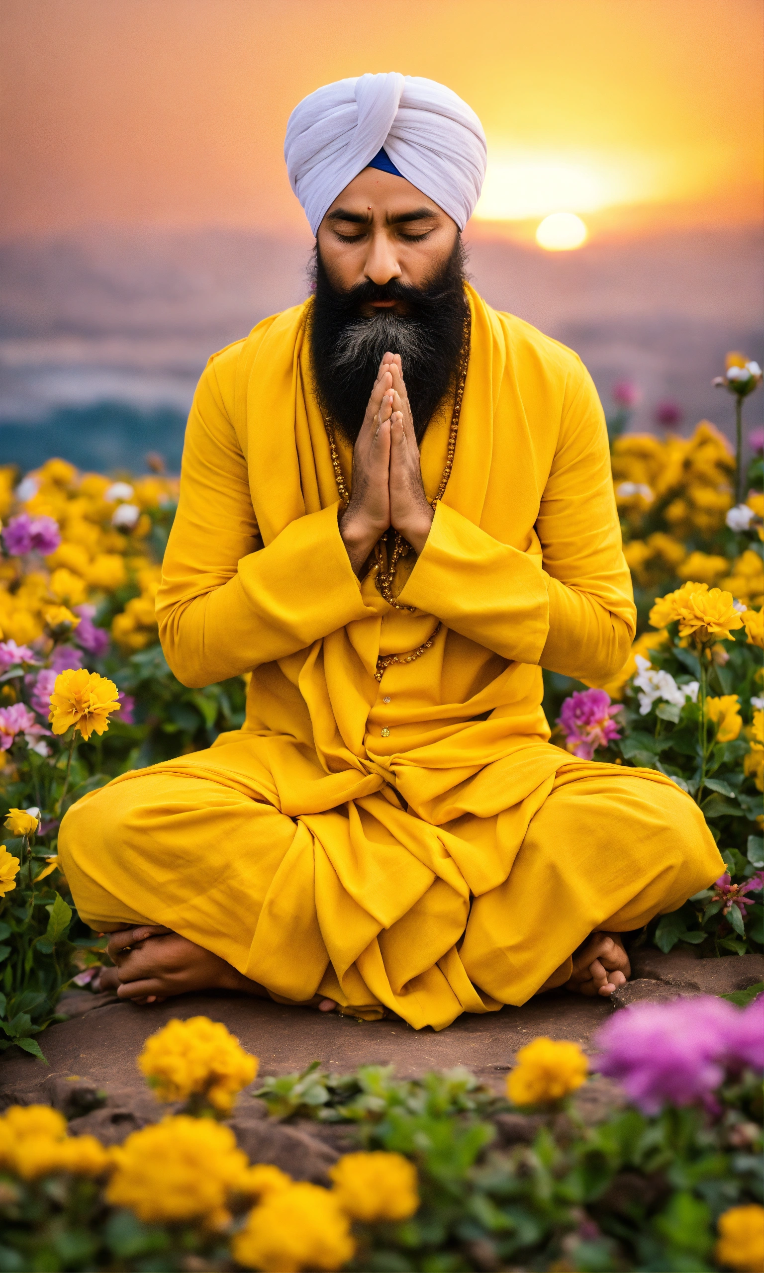 Sikh khalsa praying, folded hands, closed eye, in the flowers, white turban, yellow sikh kurta, no spot ornament on forehead