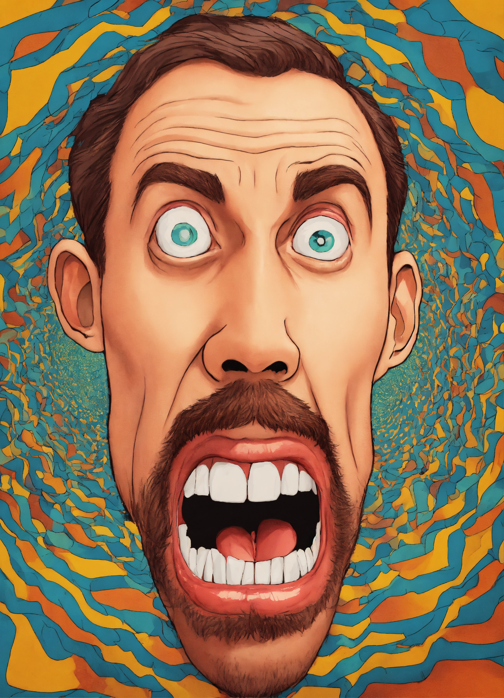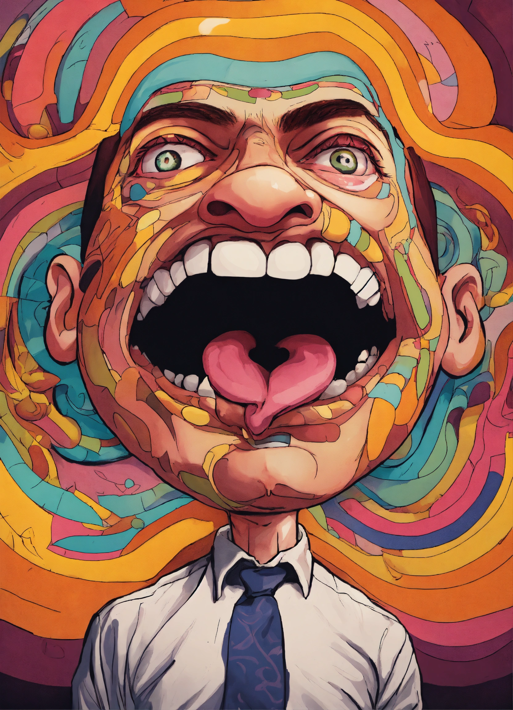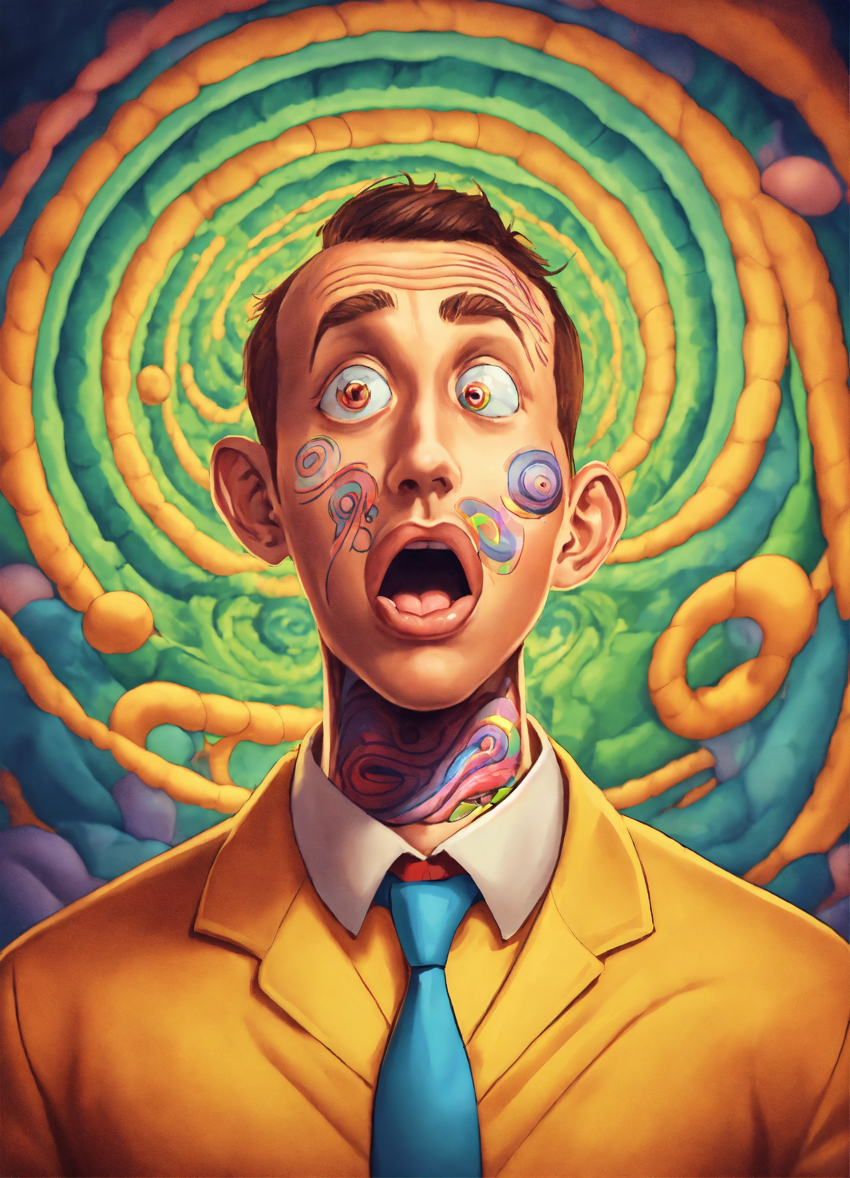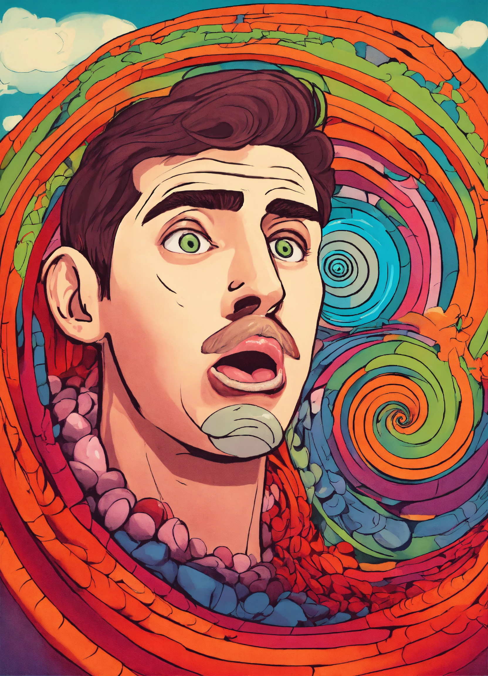 Hypnotized man starring, brainwashed, mind controlled, with a large cartoon spiral optical illusion inside eyes, tongue sticking from his mouth salivating, photo from the neck up, cartoon-styled