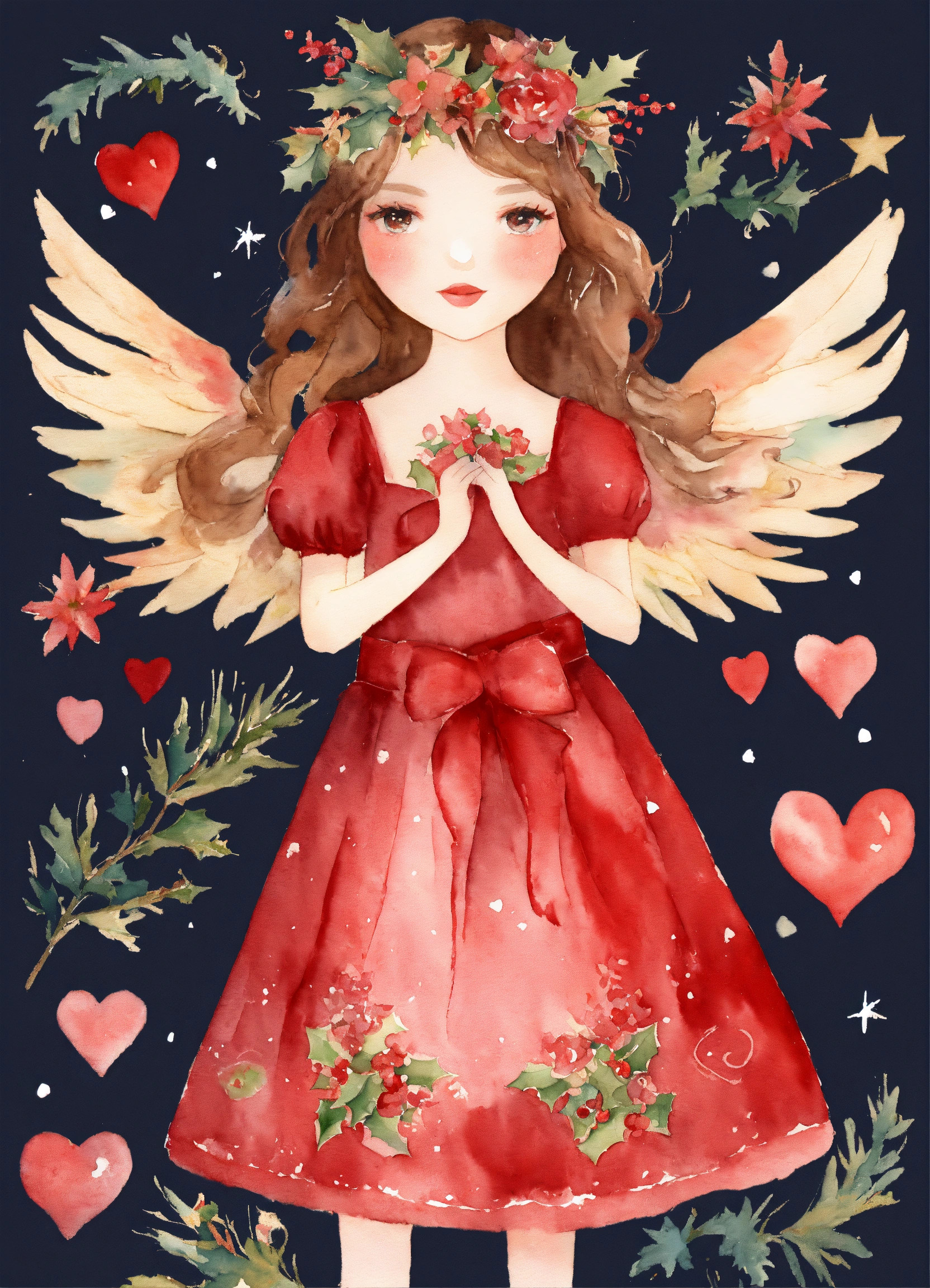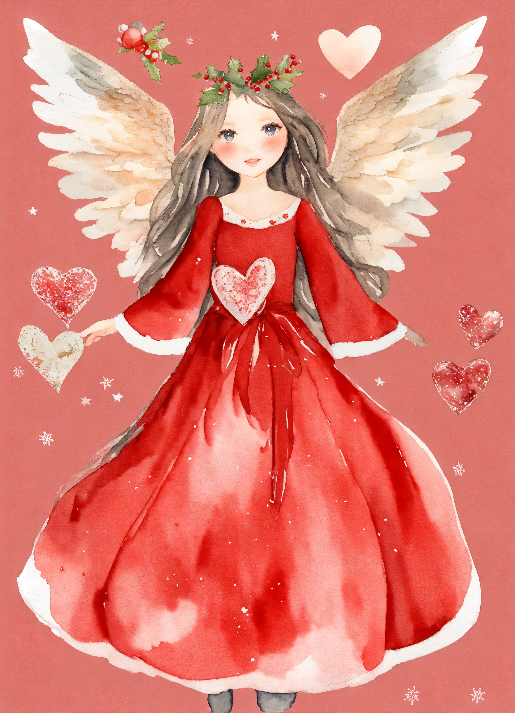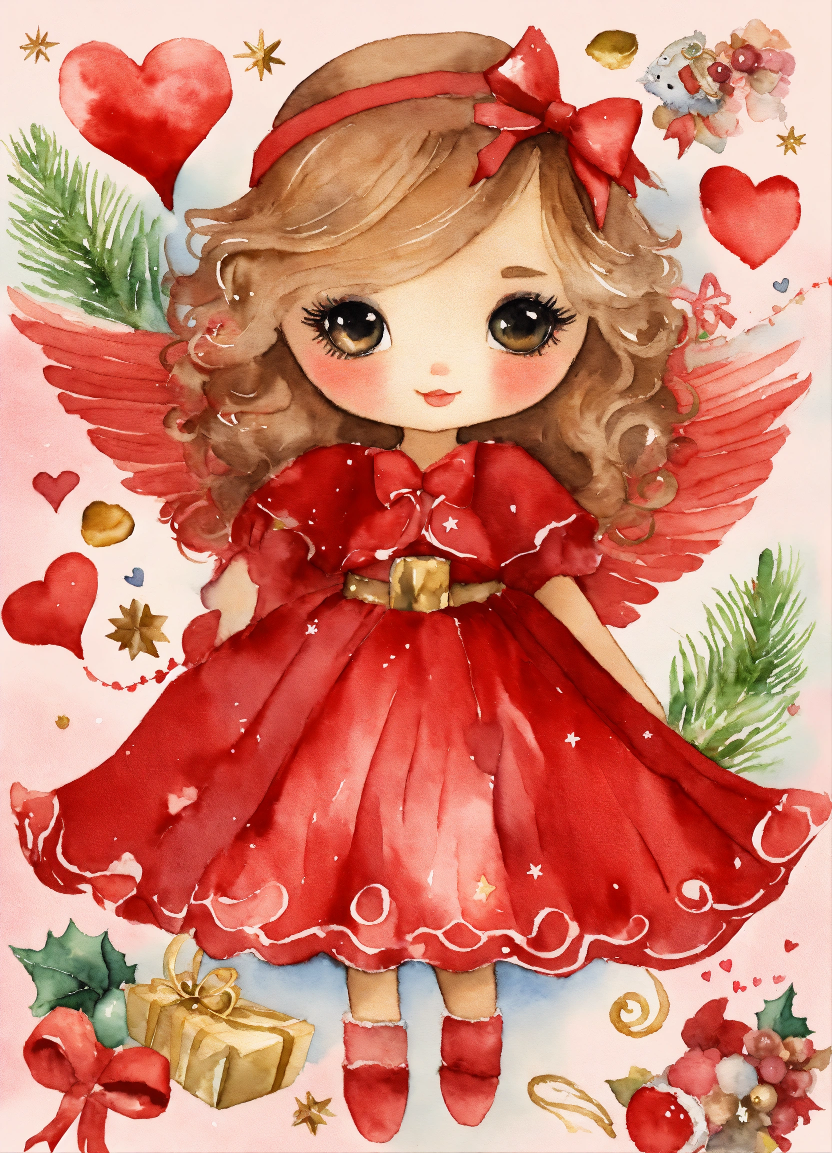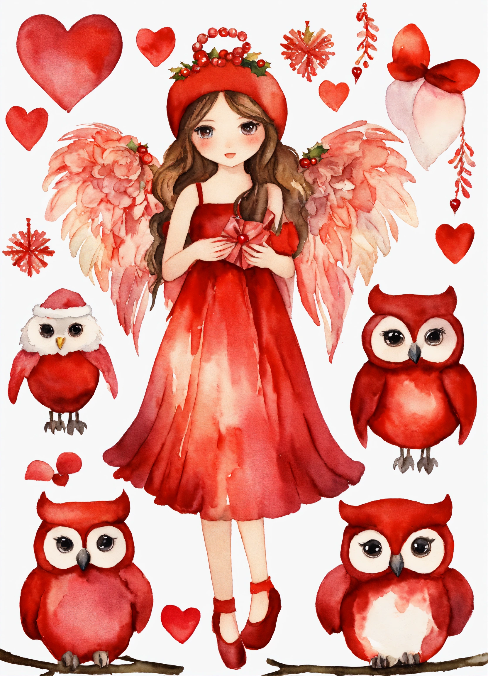 Whimsical christmas red angel girl, watercolor clipart, fairytale clipart png, fantasy owls and hearts, fantasy art clipart, paper craft - junk journal, scrapbooking