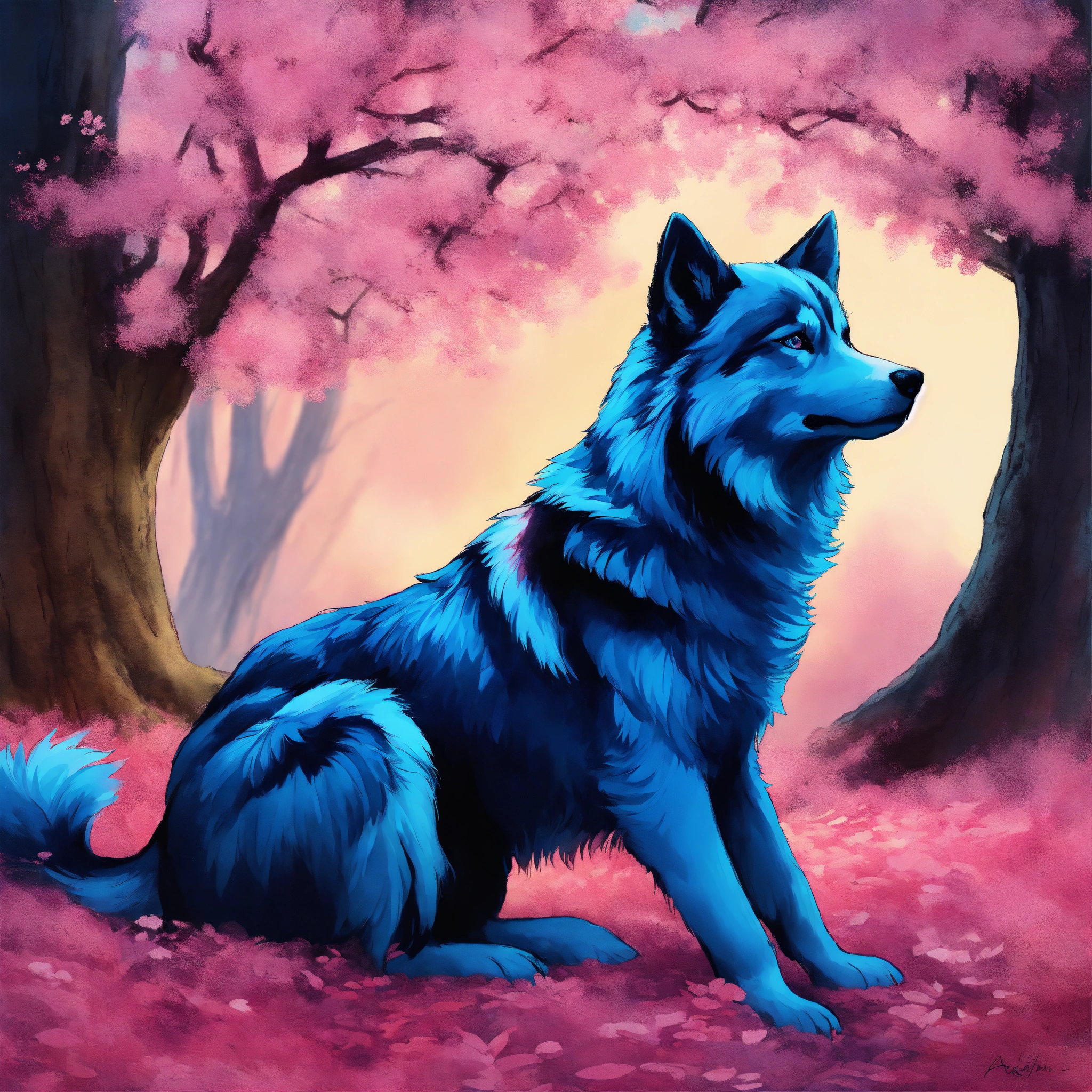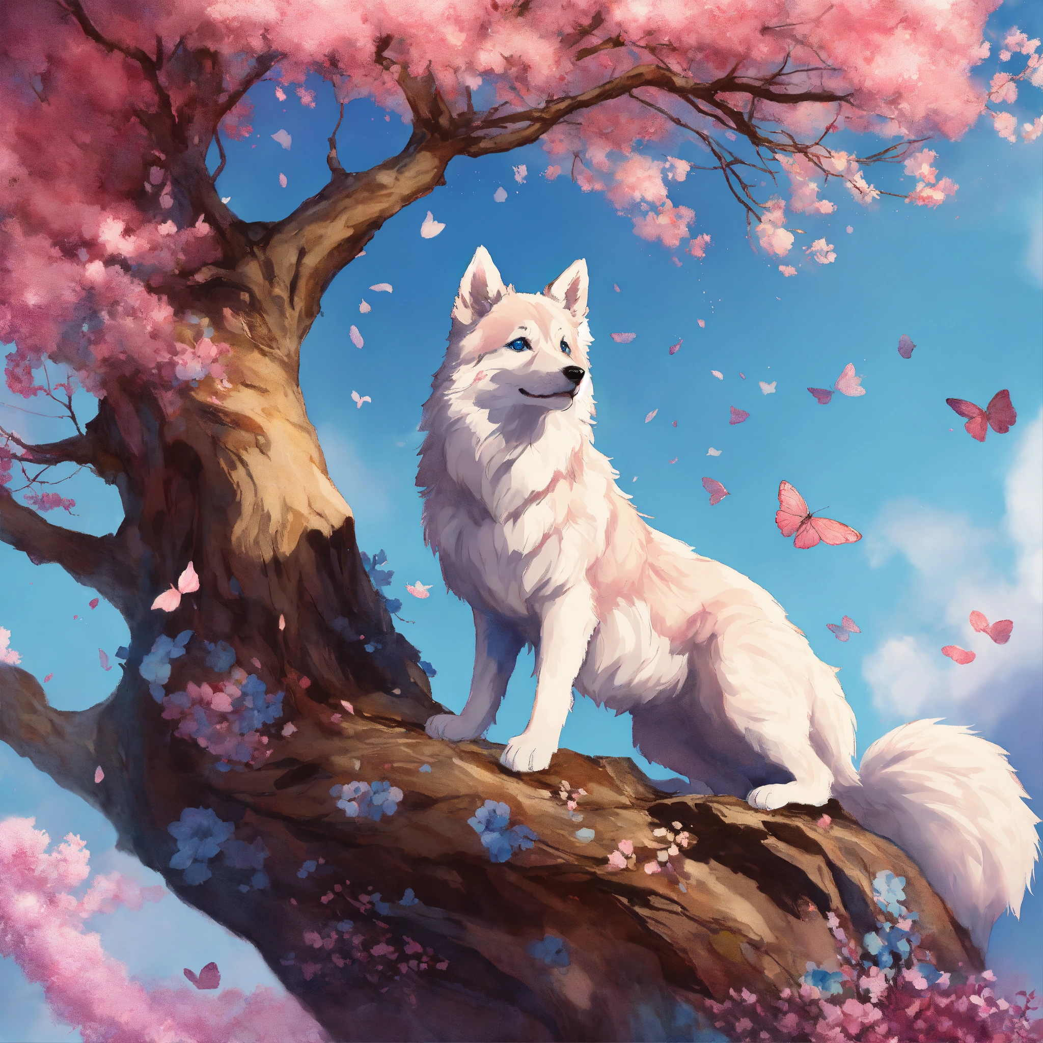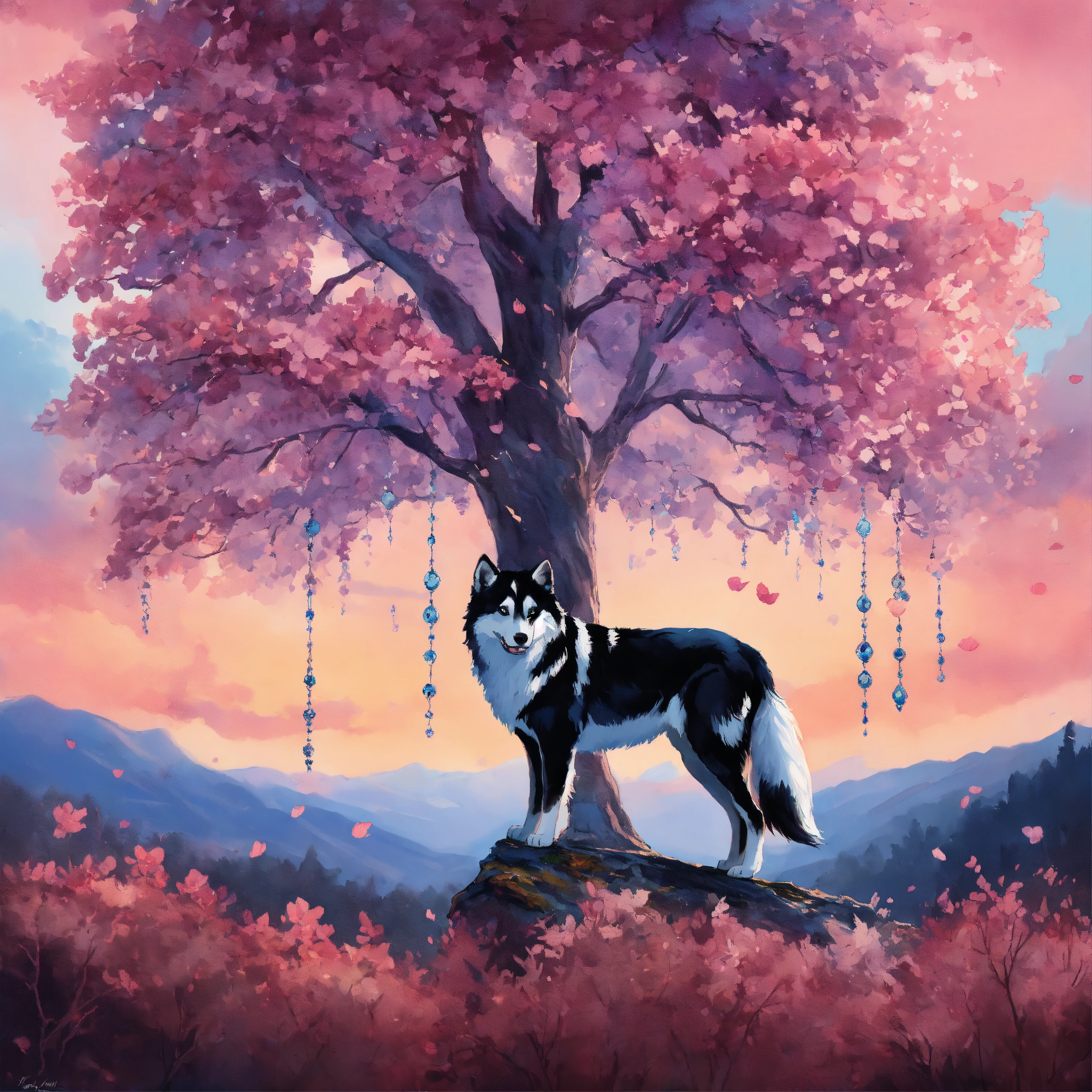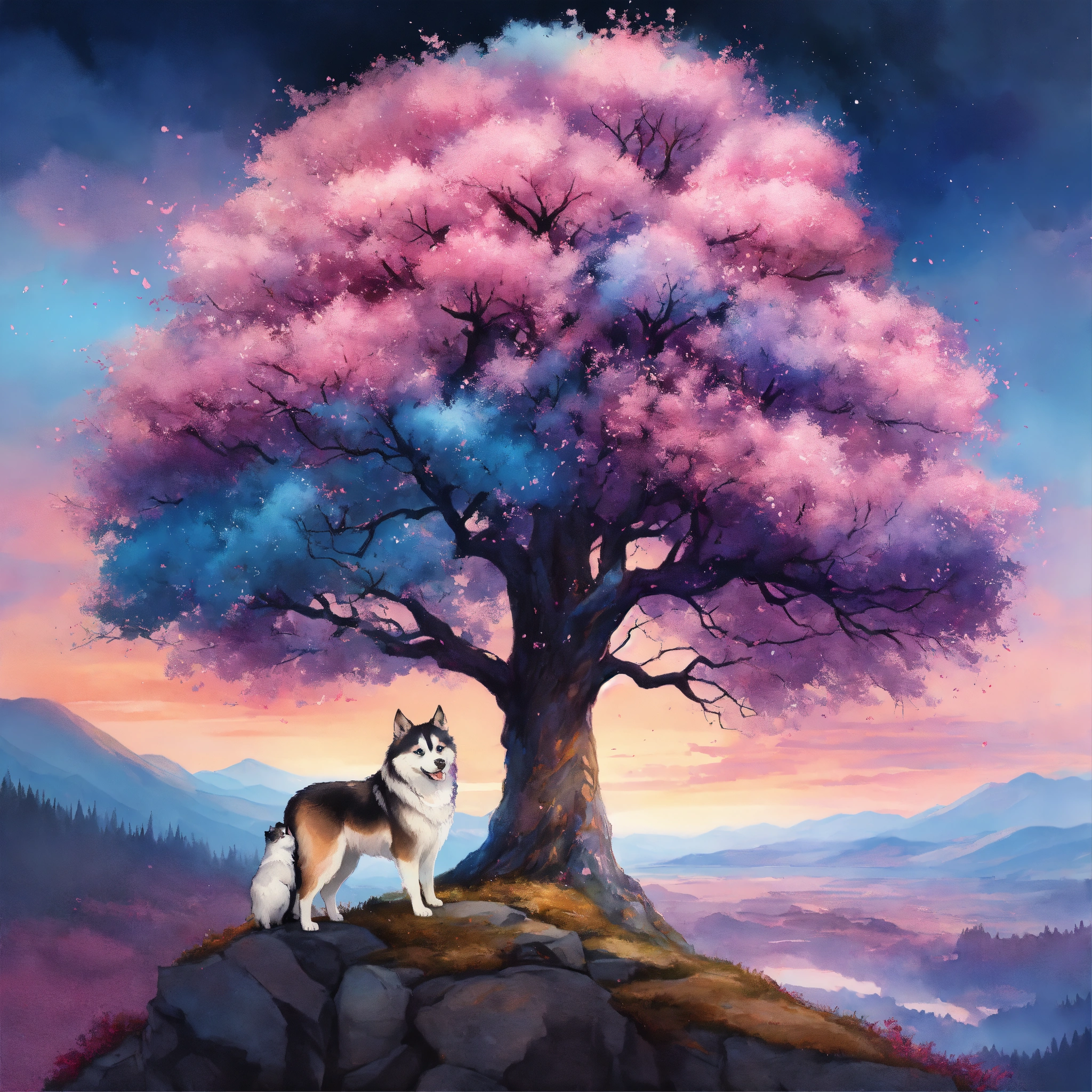 A digital illustration unfolds, featuring two pomskies black and white with opulent, cascading fur and captivating blue eyes, gracefully positioned on either side of the base of a resplendent ancient tree. the tree, resplendent in hues of rose, blue, stands prominently at the center of the artwork, its branches reaching toward the heavens. the pomskies, meticulously detailed, exude a sense of freedom and depth of soul. this digital masterpiece embodies perfection, showcasing remarkable attention to detail. created in a watercolor style, the illustration radiates vibrancy and artistic brilliance. with a sharp and smooth focus, the artwork boasts a rich and diverse color palette, accentuated by the soft interplay of pink, blue hues. the composition allows for the complete view of the majestic tree, adding to the overall sense of awe and wonder. this artwork harmoniously blends the natural world with creative expression, making it a captivating choice for art enthusiasts.