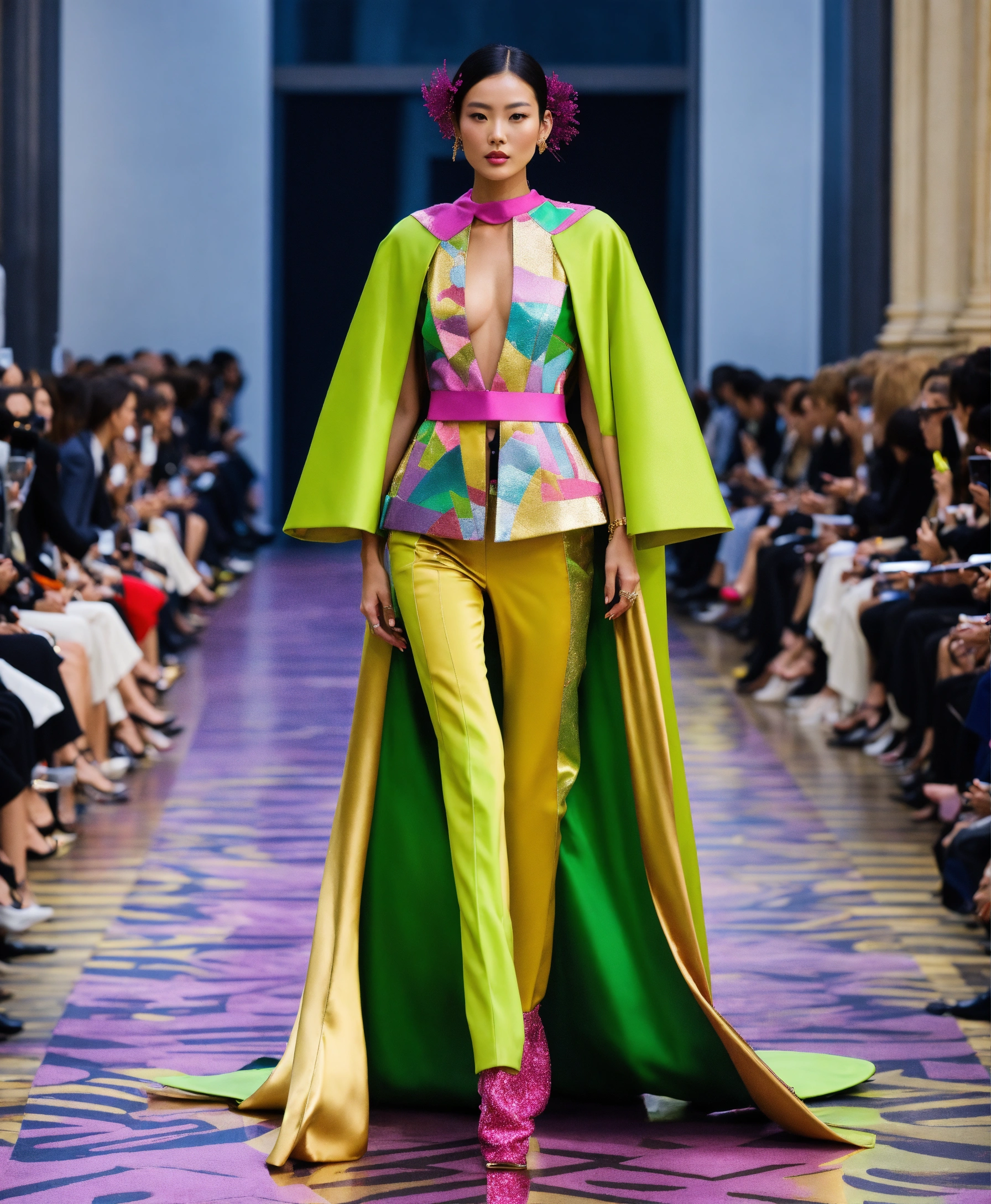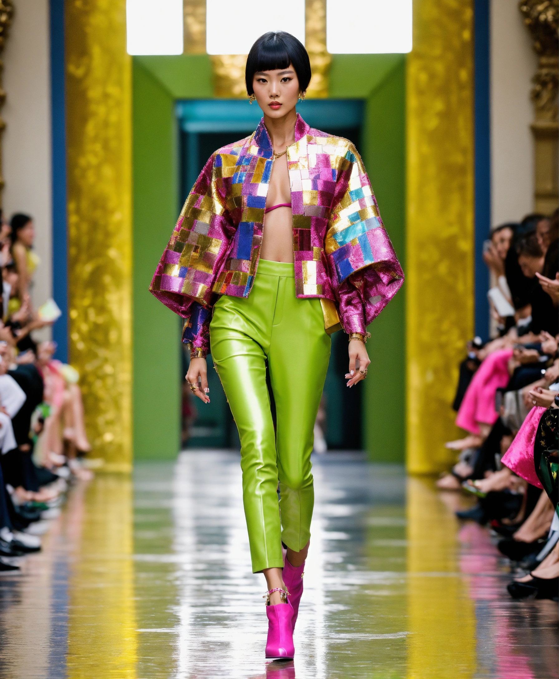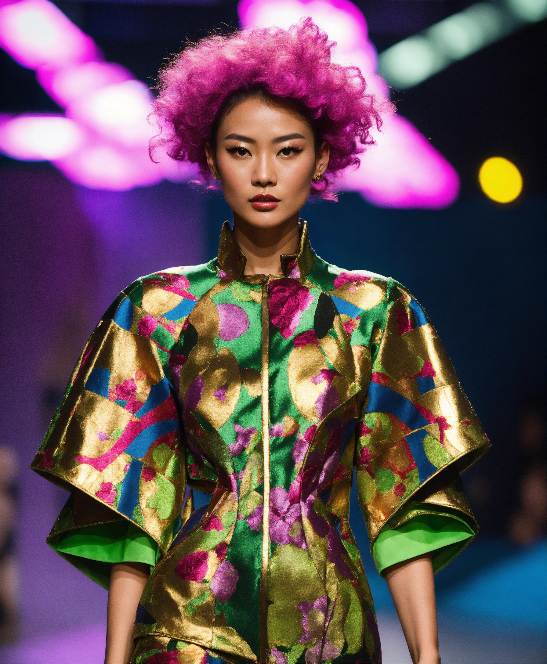 Ultra realistic full body photo of a stylish japanese model walking the runway modeling summer designer novelty interesting complex unusual street sporty classy modern dolman sleeve outfit brave, paris versailles details cutouts and and gold geometric pattern floral structured tailored jacket pink gold green lilac peridot silver magenta lime fuchsia yellow blue black gray copper mauve bronze sheen metallic edgy avant garde haute couture ultimate elegance beautiful luxurious awesome wealthy resplendent magnificent sublime 12k