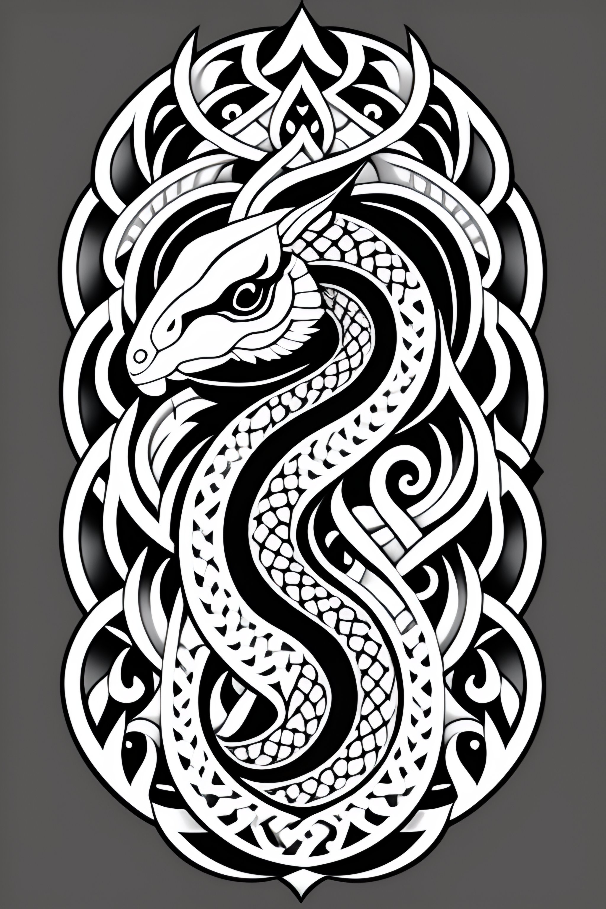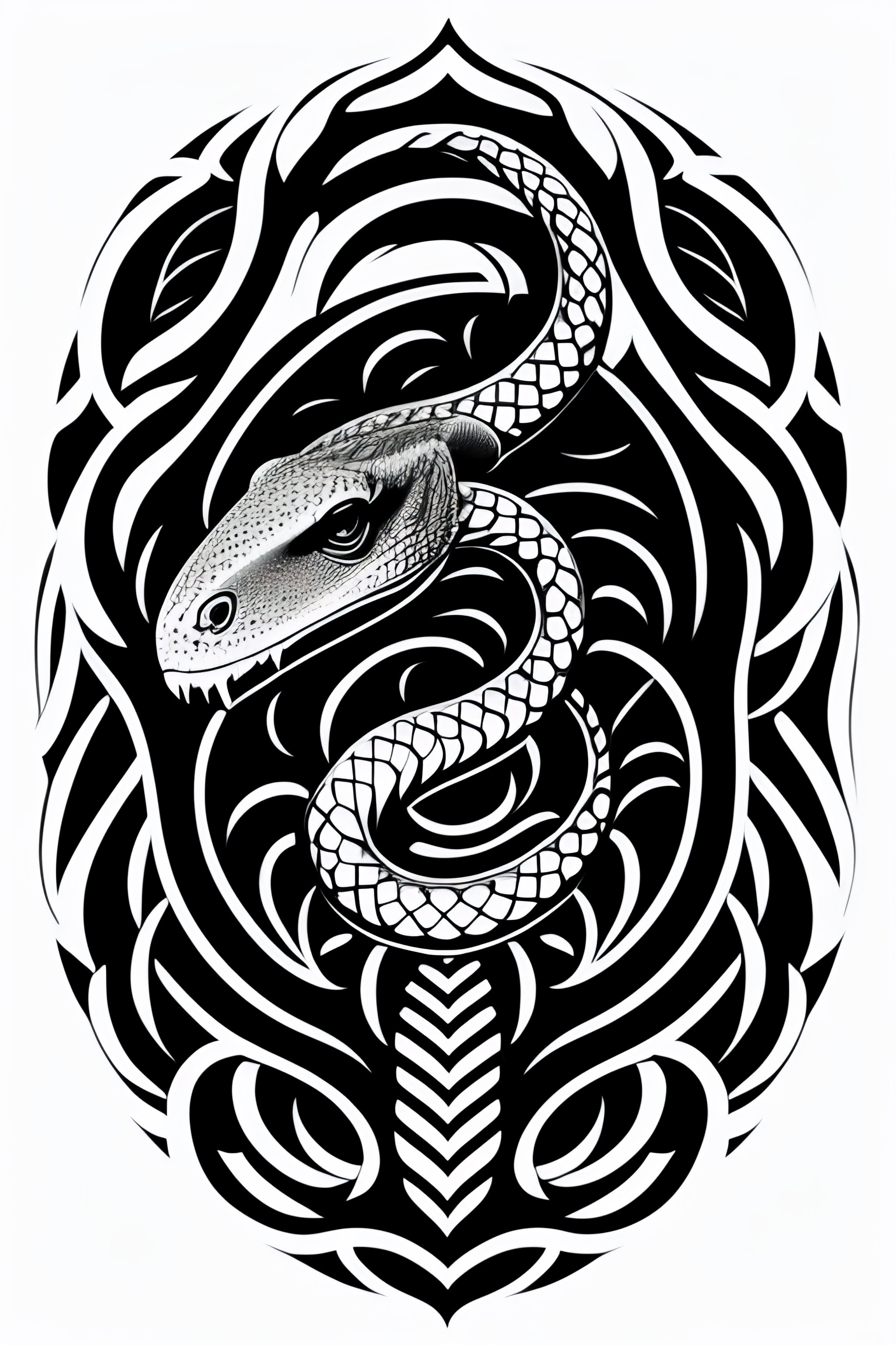 Symmetry, one snake head and only facing front, glare, black and white, white background, no background, ink fine line art stylized, vector, design for tattoo