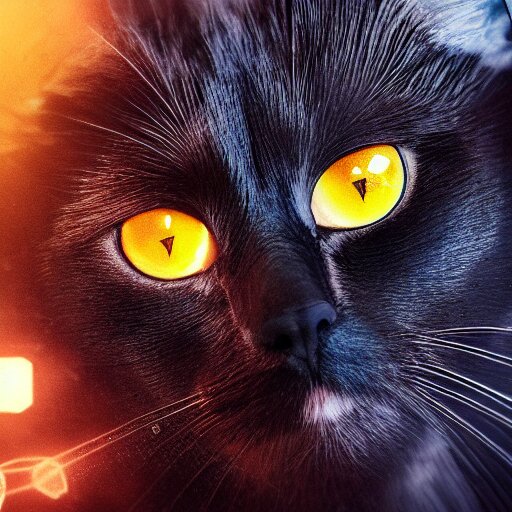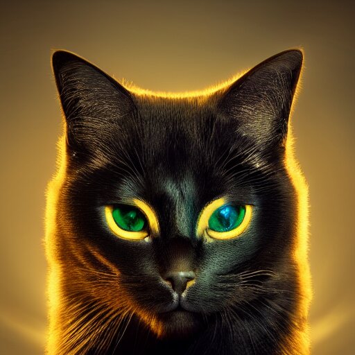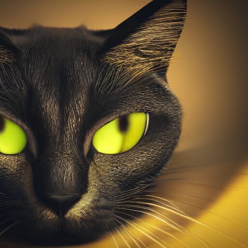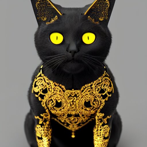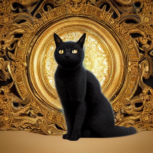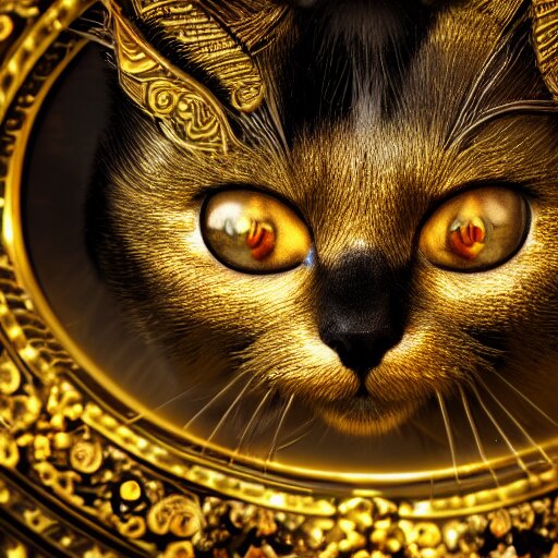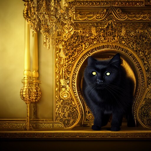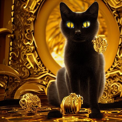 Black void cat with golden glowing eyes, fairytale, beautiful, intricate, elegant, ornate, super detailed, octane render, reflections