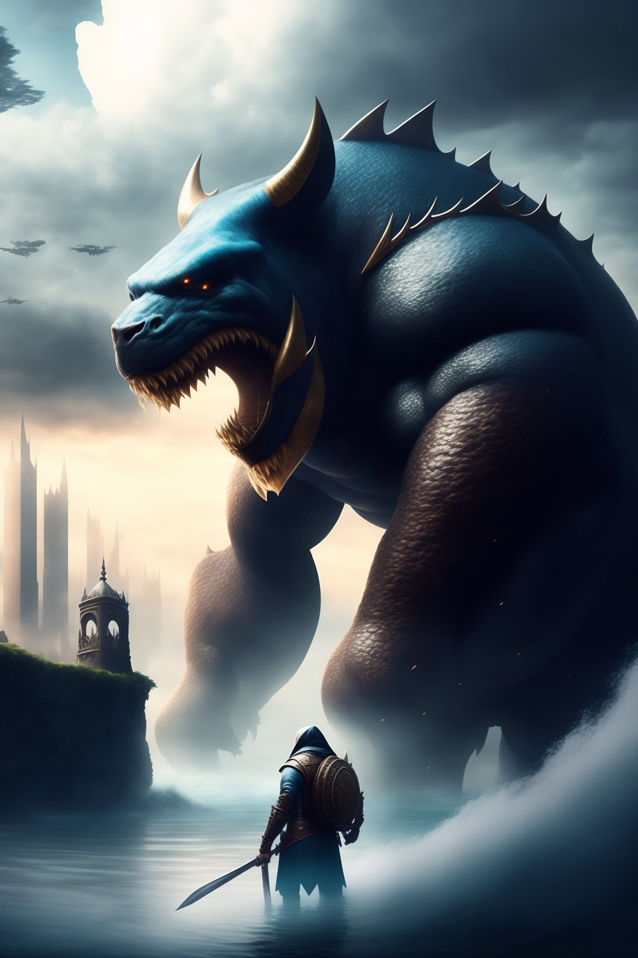Monstruo atacando una ciudad, este monstruo es de tipo agua con grandes cuernos, imagen estilo fantasía con toques medievales
