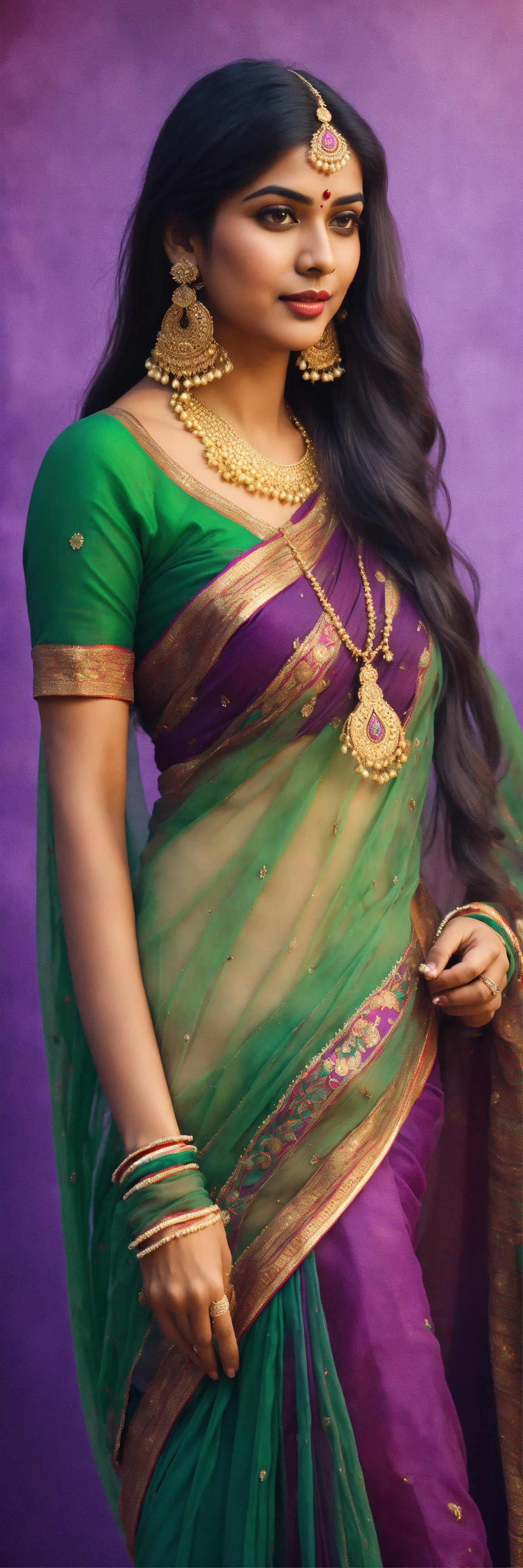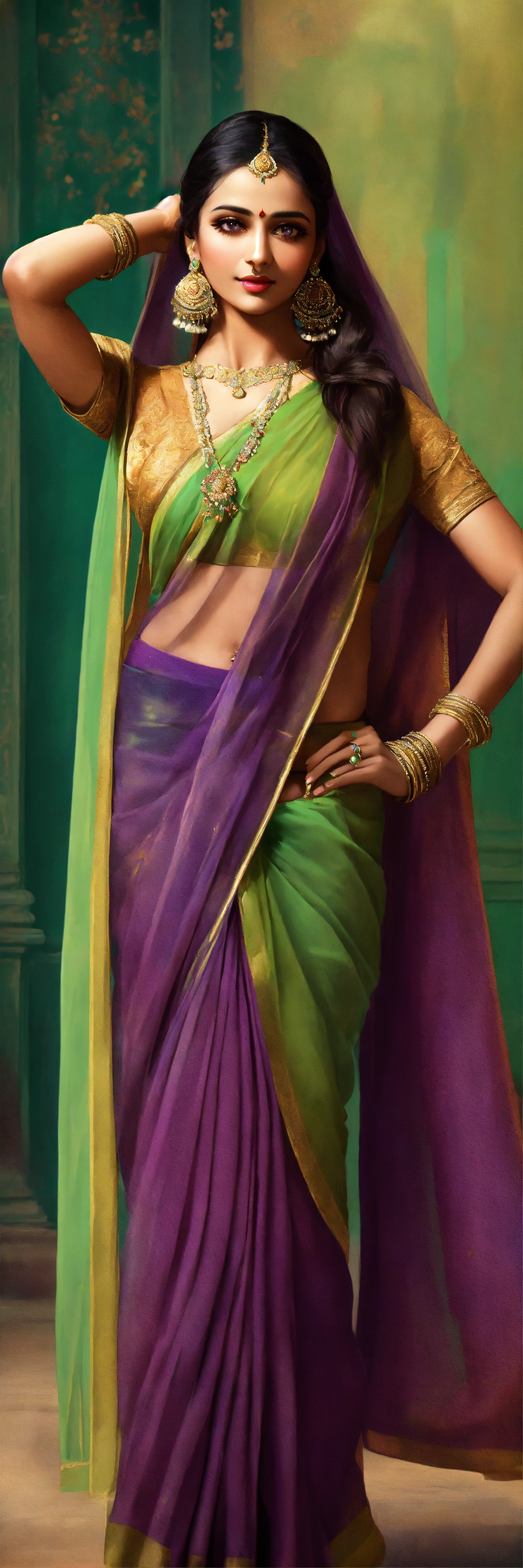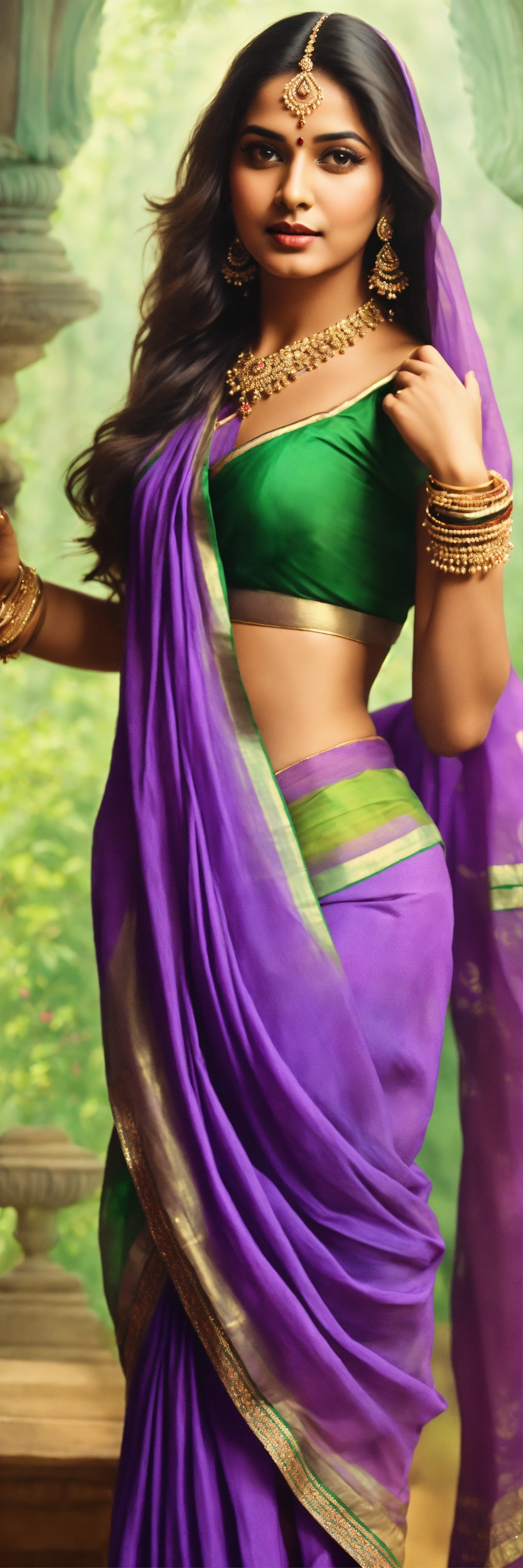 Indian, vintage background, thin veiled, long legs, long haired, purple green saree, cute face, hyper realistic, sharp features, indian dance
