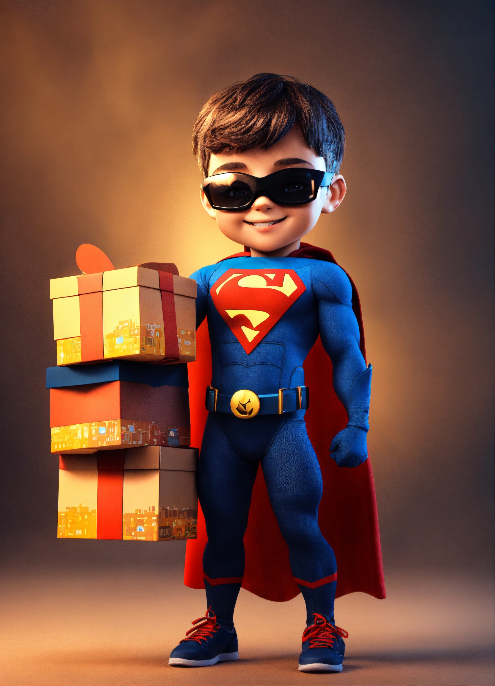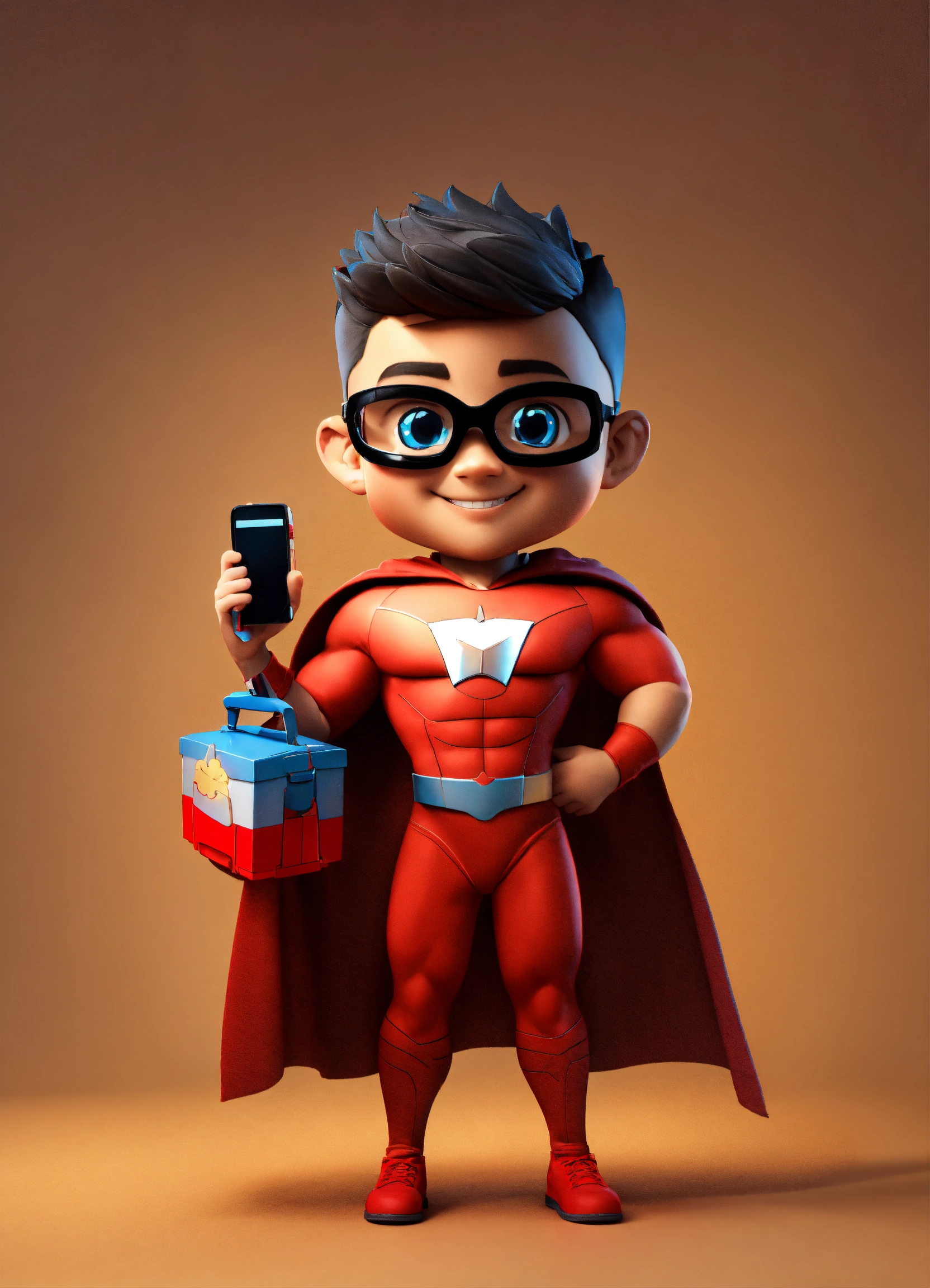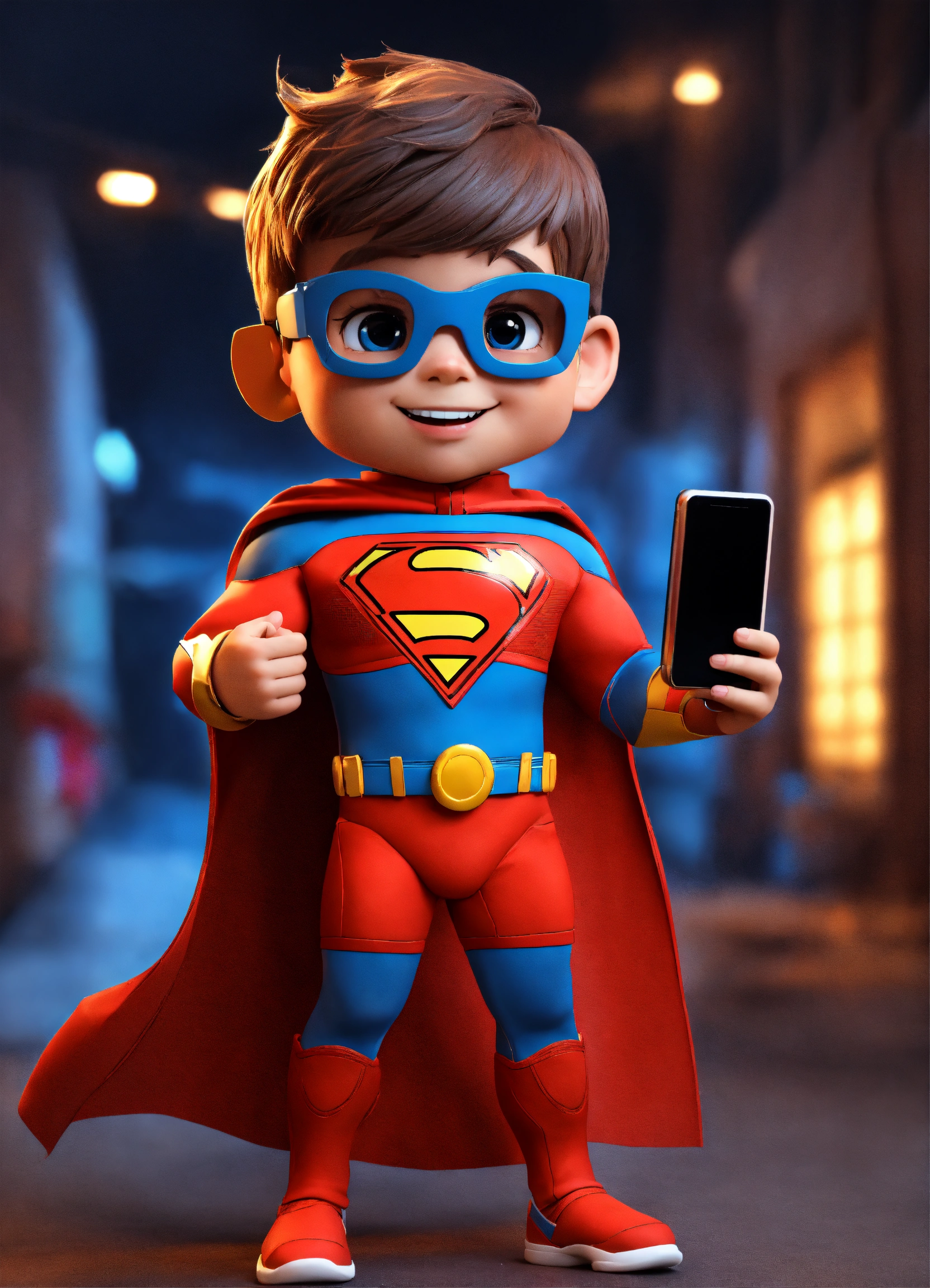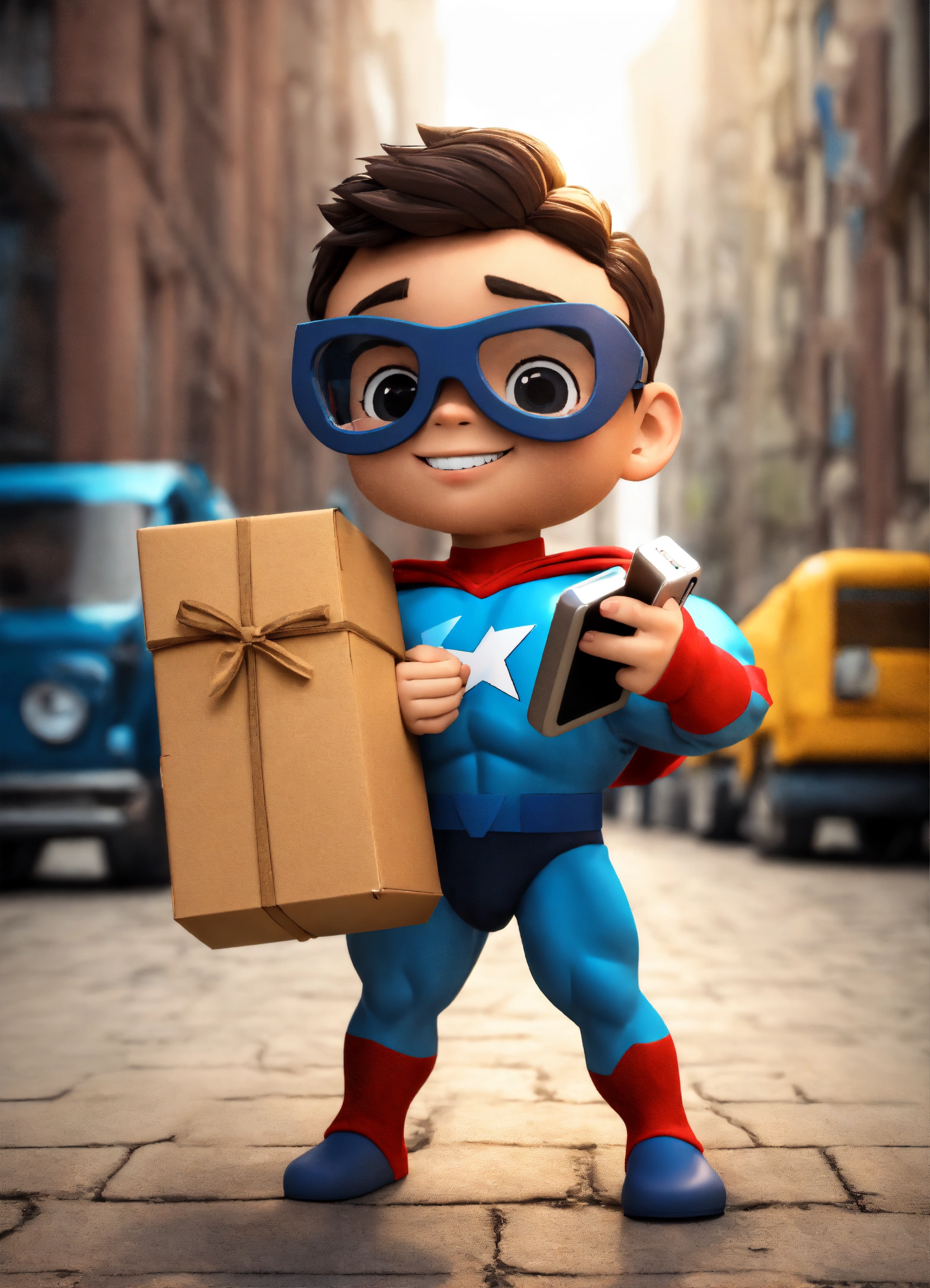 Little boy, superhero, cartoon, 3d, have much boxes, grin smile, hold handphone, strong, big muscle, eyes with dark glasses