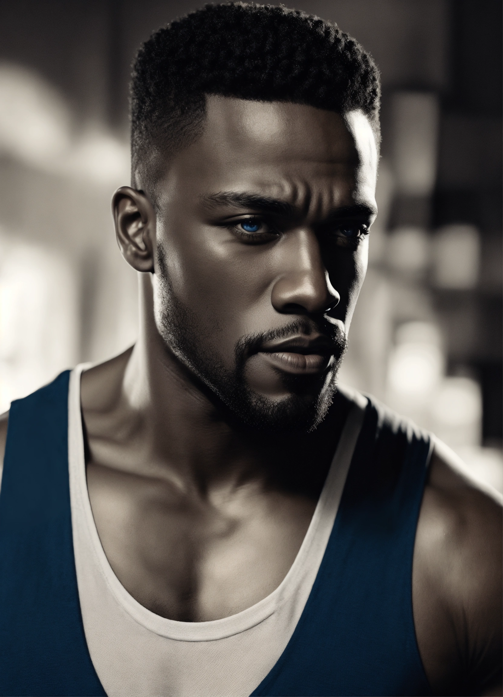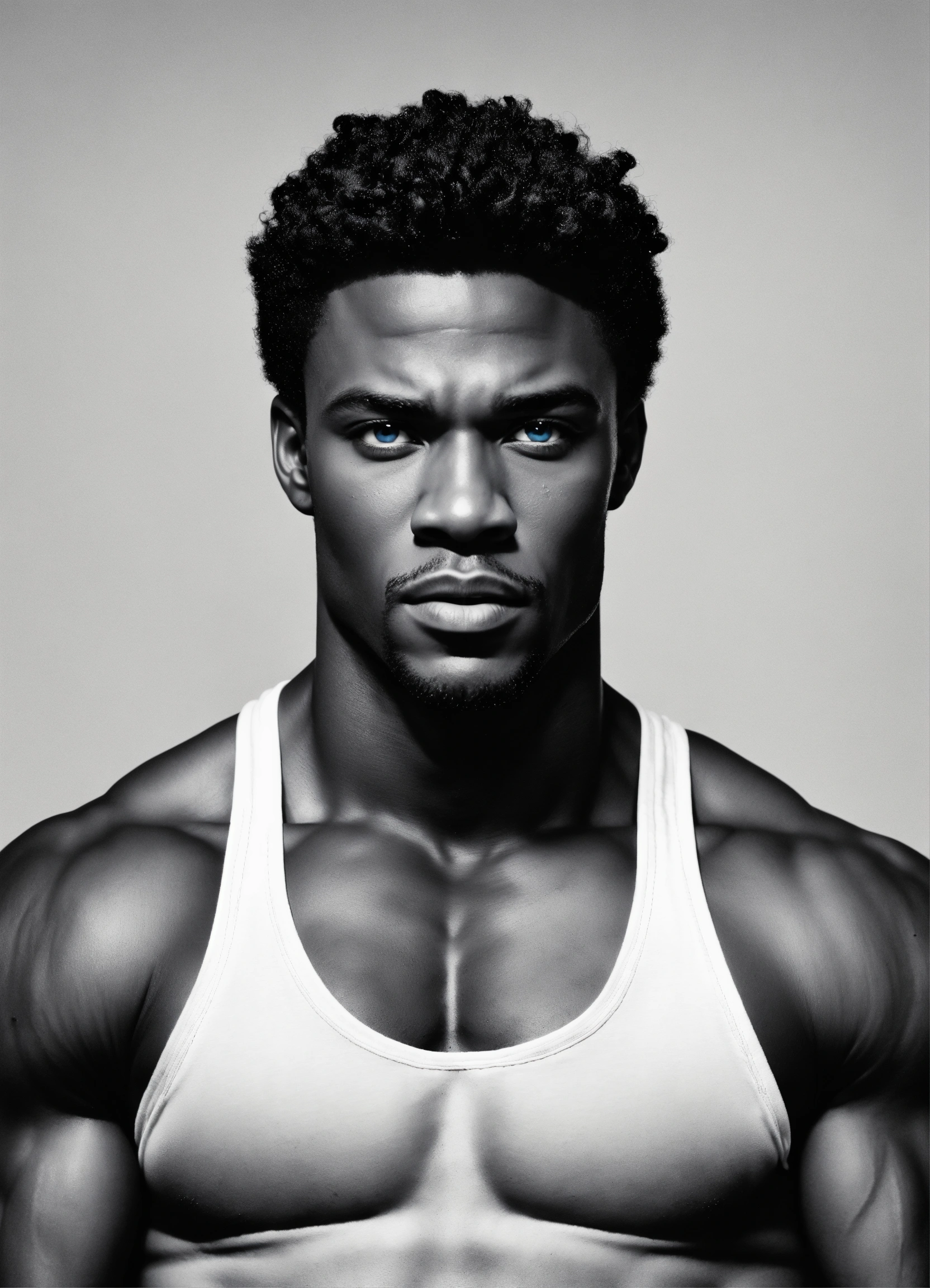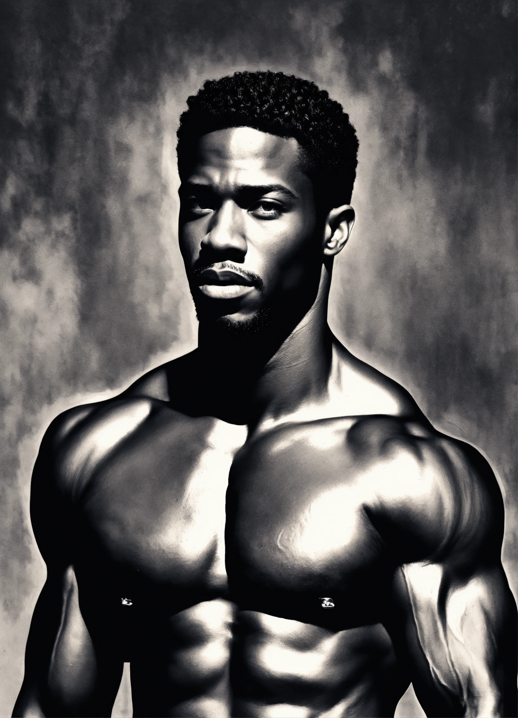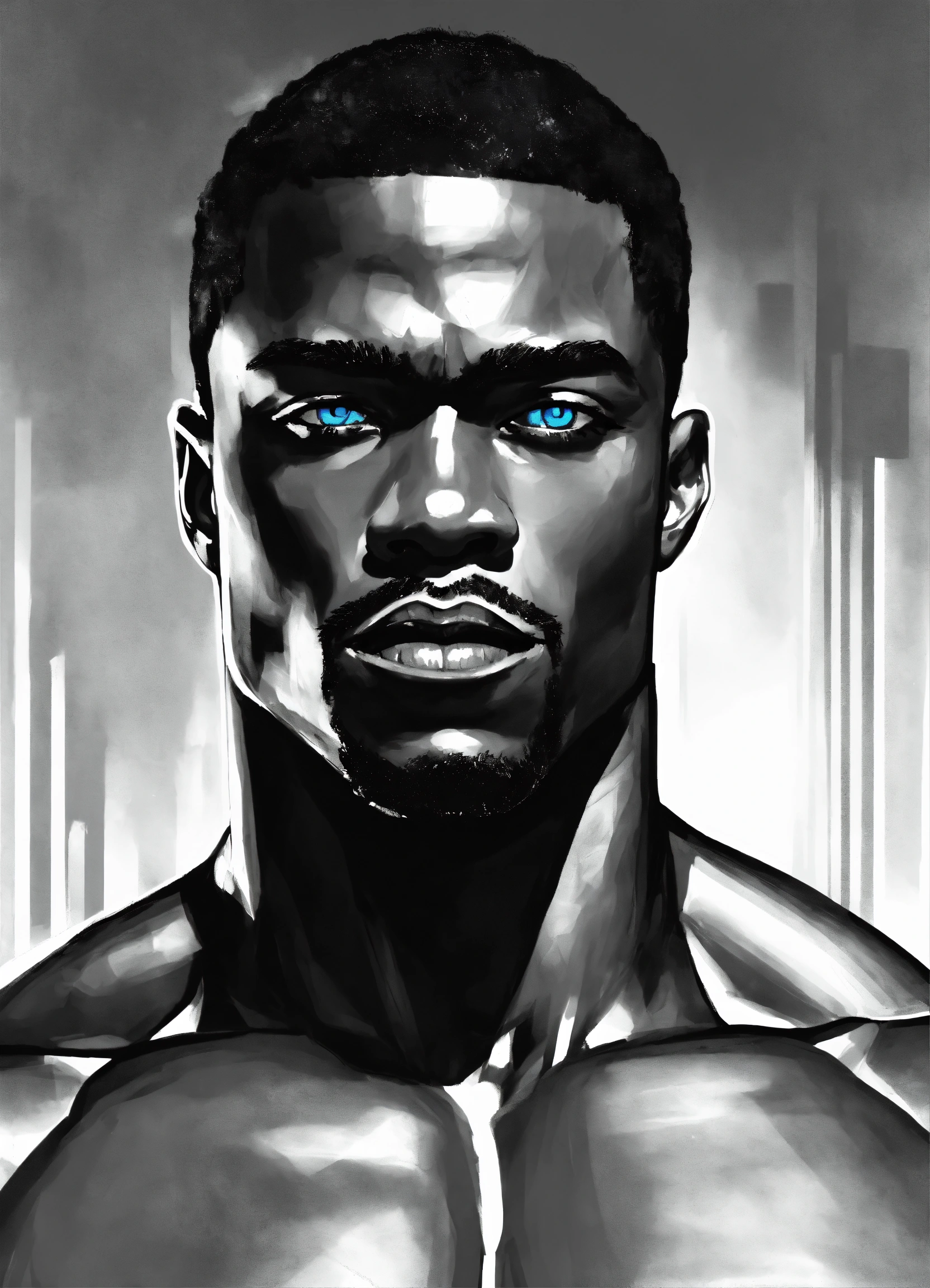 Black and white illustration of male hollywood actor, confident, charismatic, blue eyes, black man with lean muscles