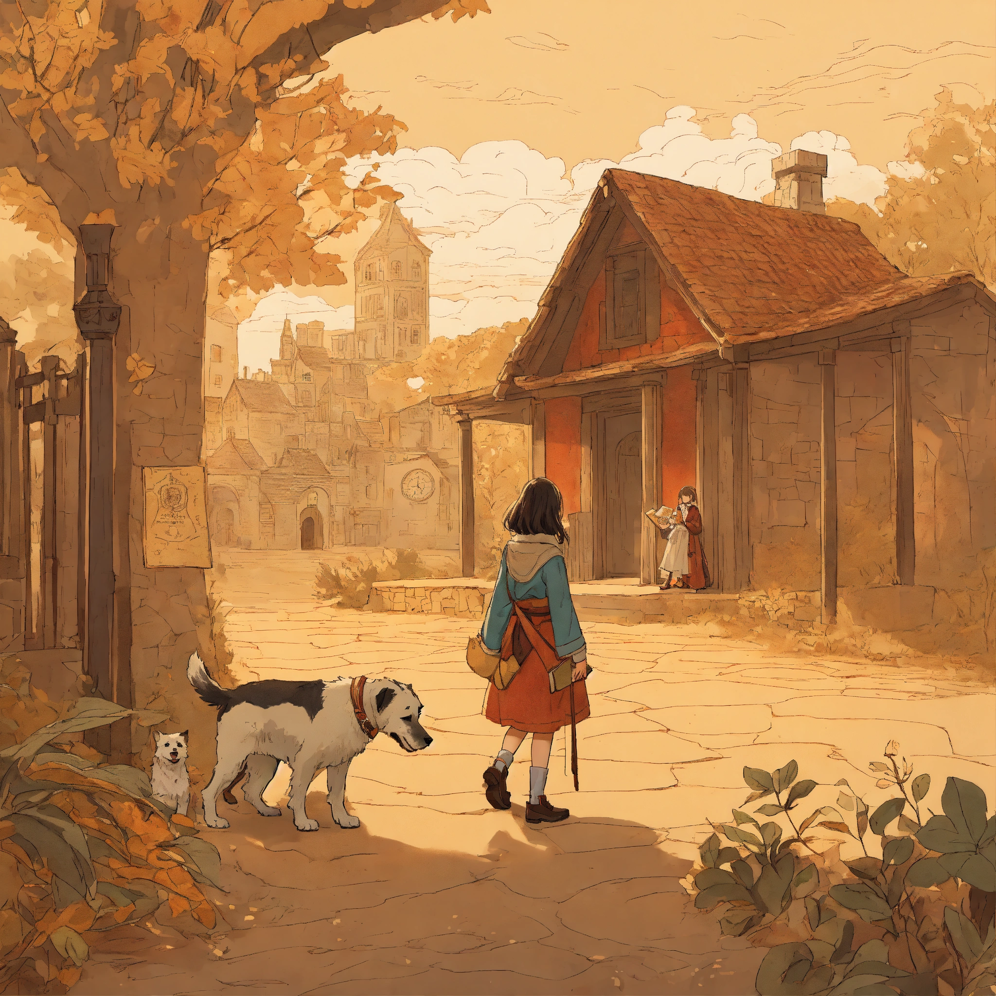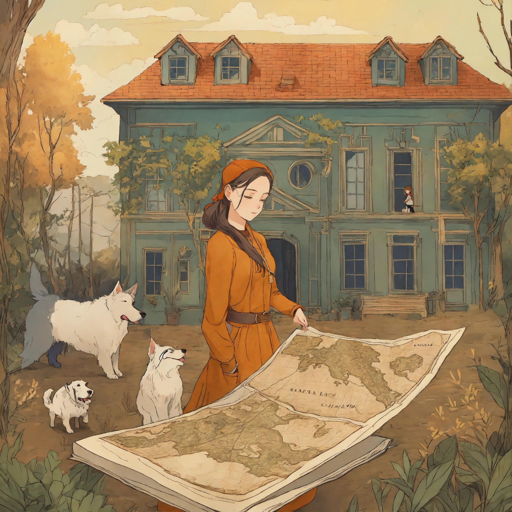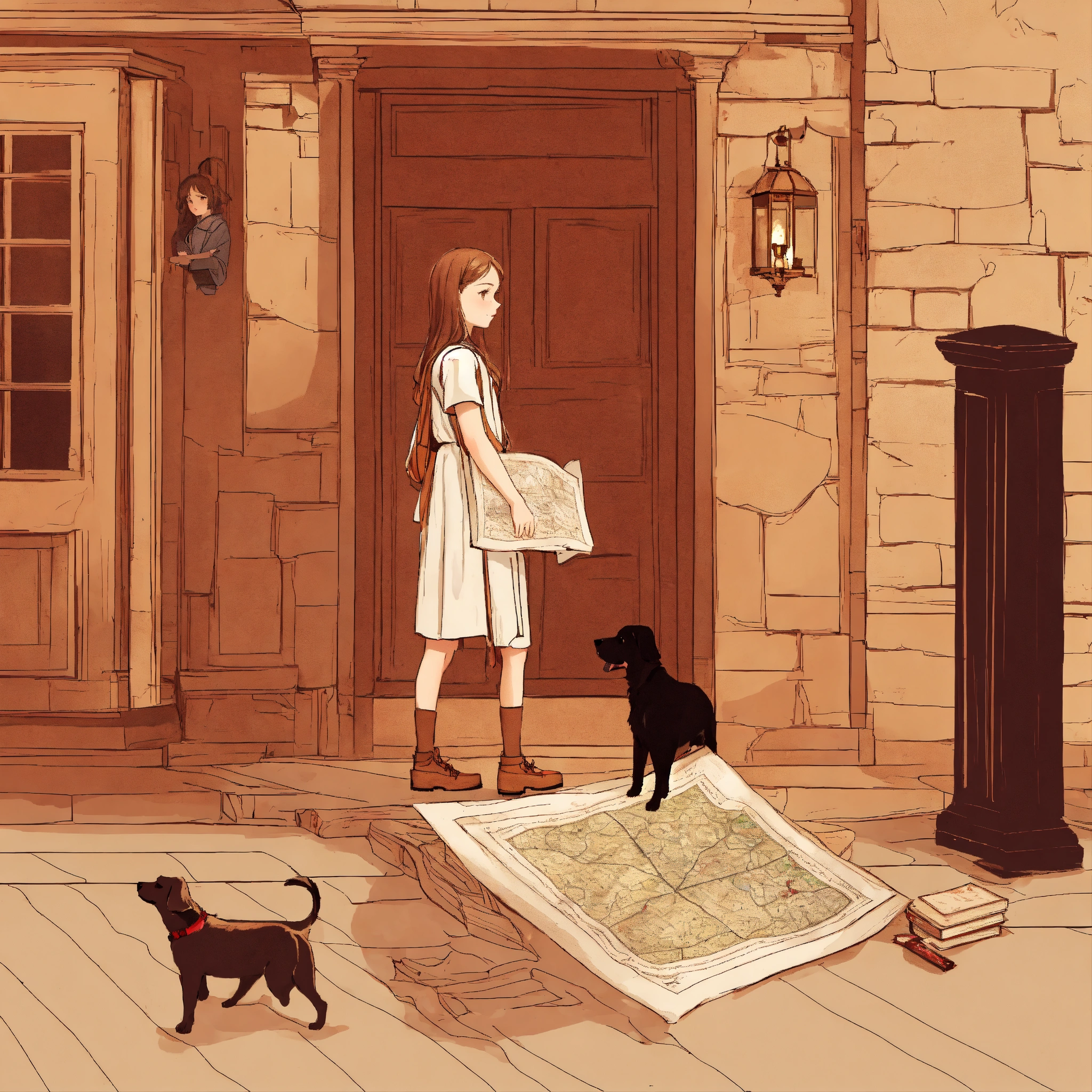 The girl and the dog leave the house, the girl is holding an ancient map, the style of illustration in the book