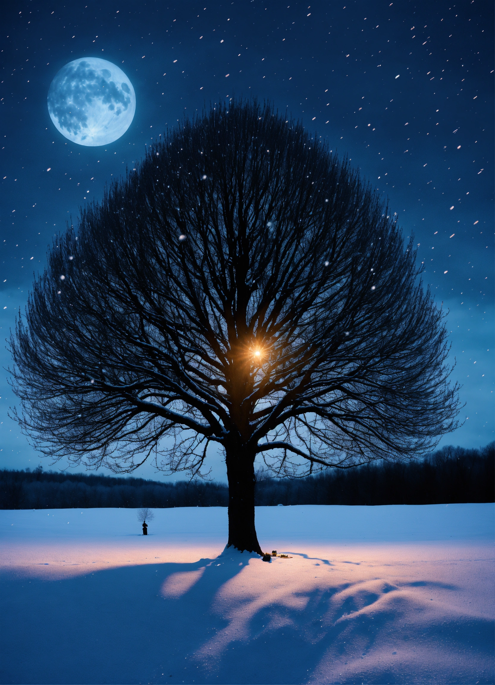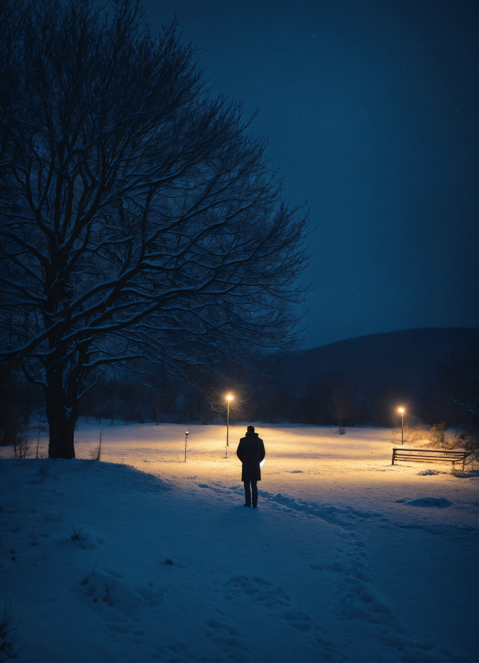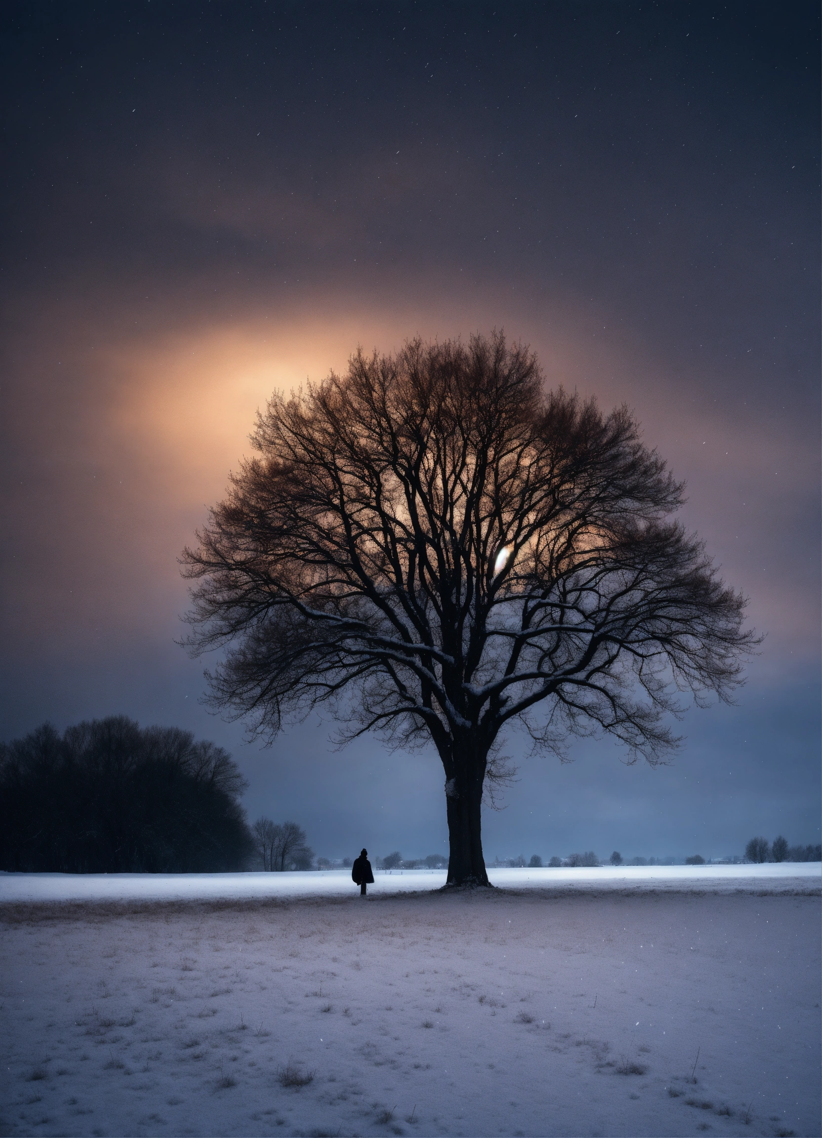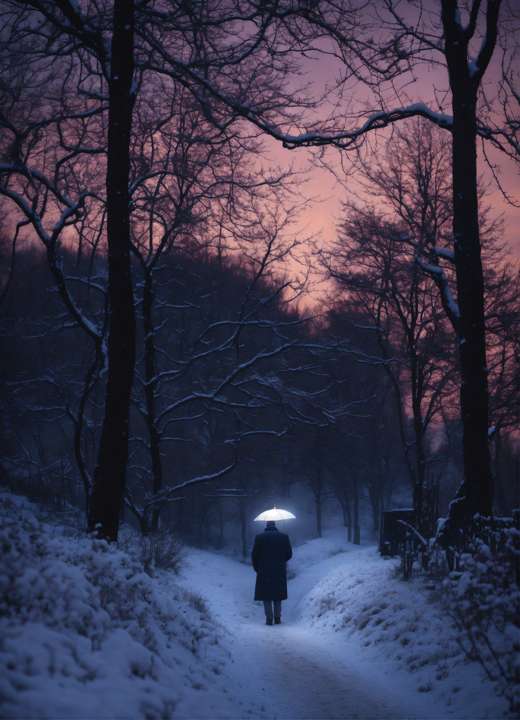 Un homme dans un paysage très sombre de nuit avec de la neige tout autour, mais ambiance un peu lugubre est cet homme tient un livres à la main. autour des arbres, très étrange, avec une apparence, presque de monstres.