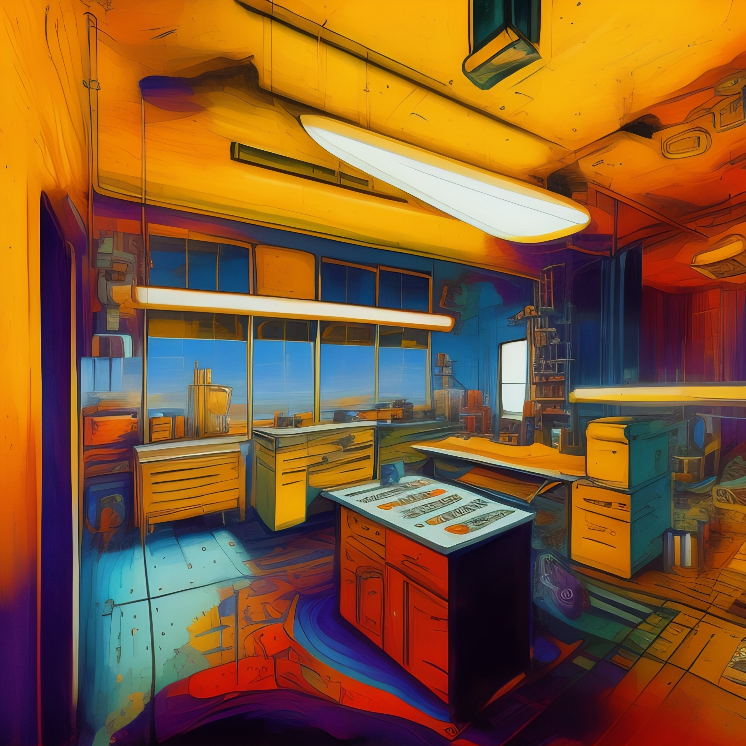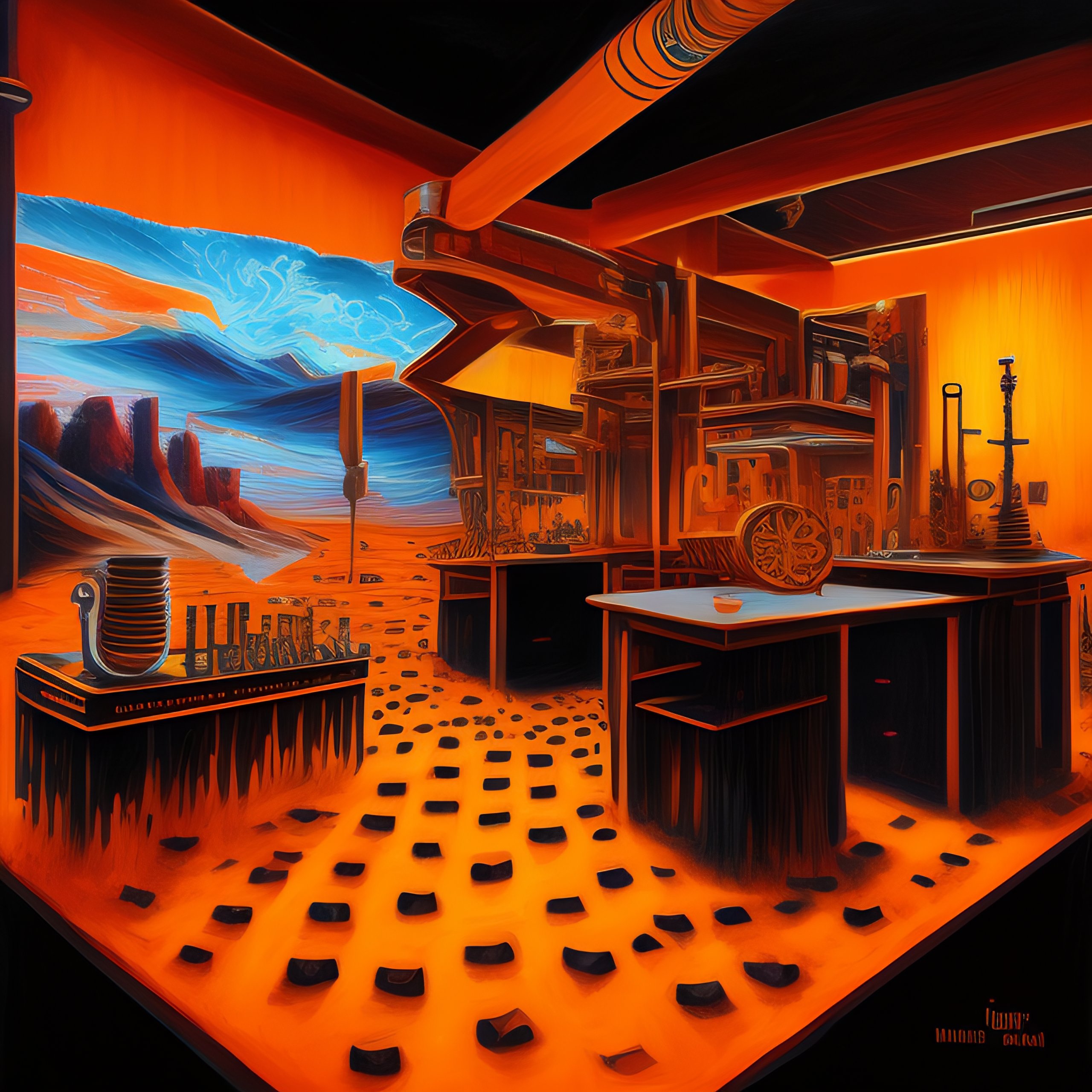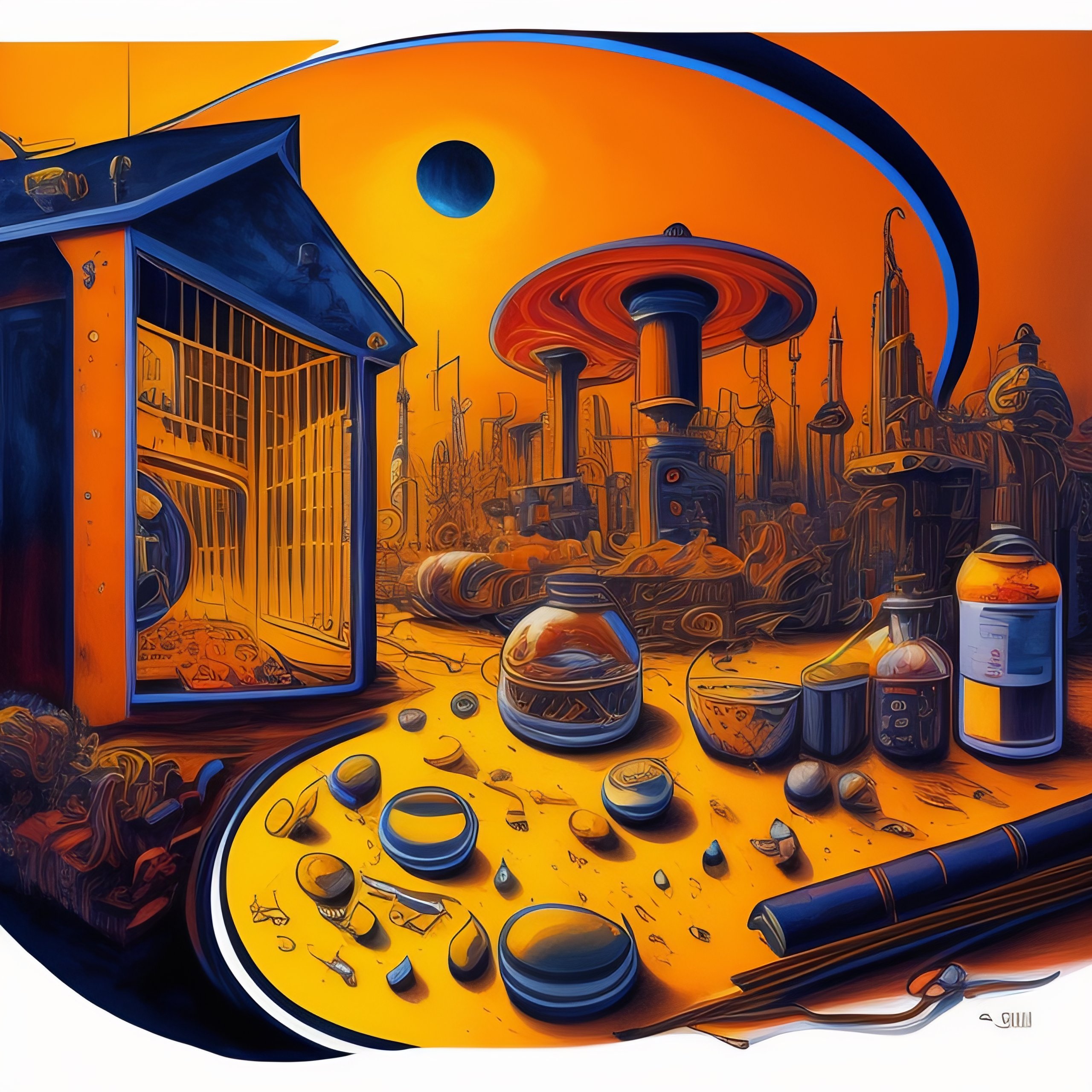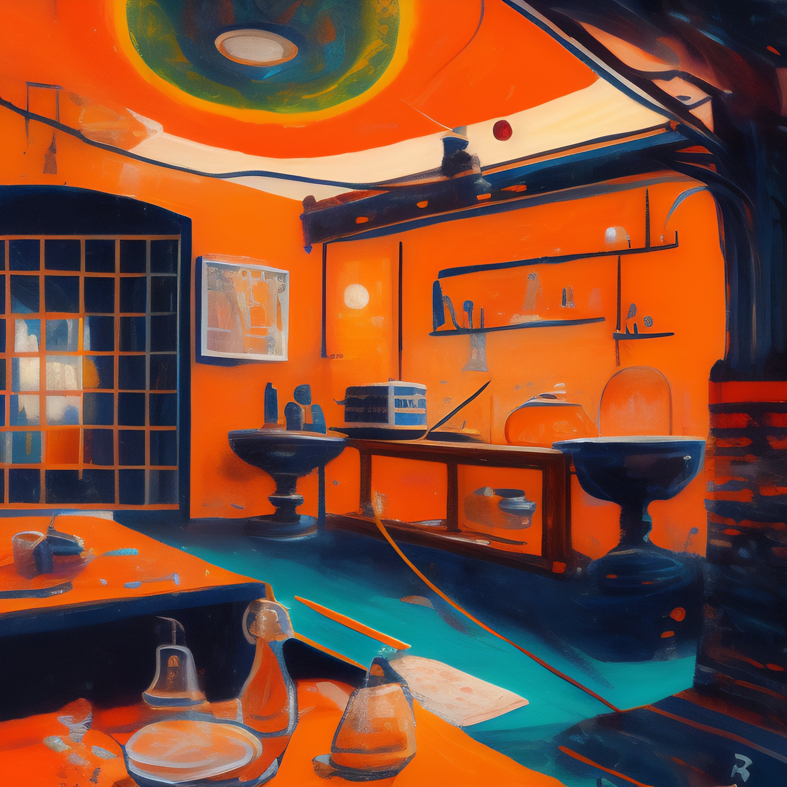 Messy hand-drawn painting of a chaotic laboratory. surrealism, wam orange hues, low contrast, surreal artwork