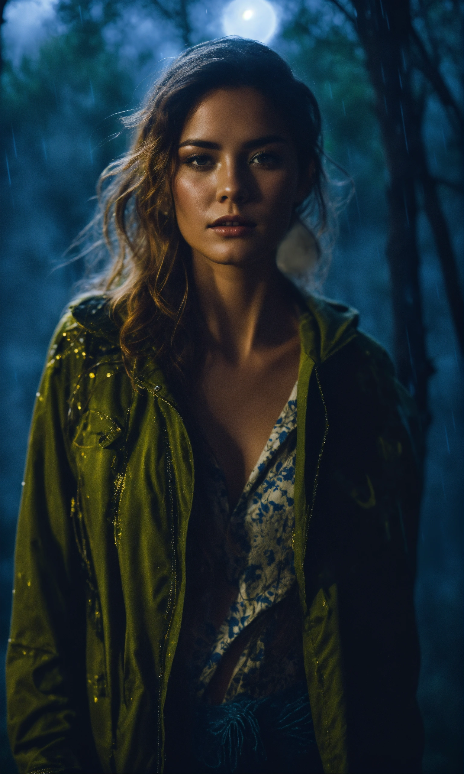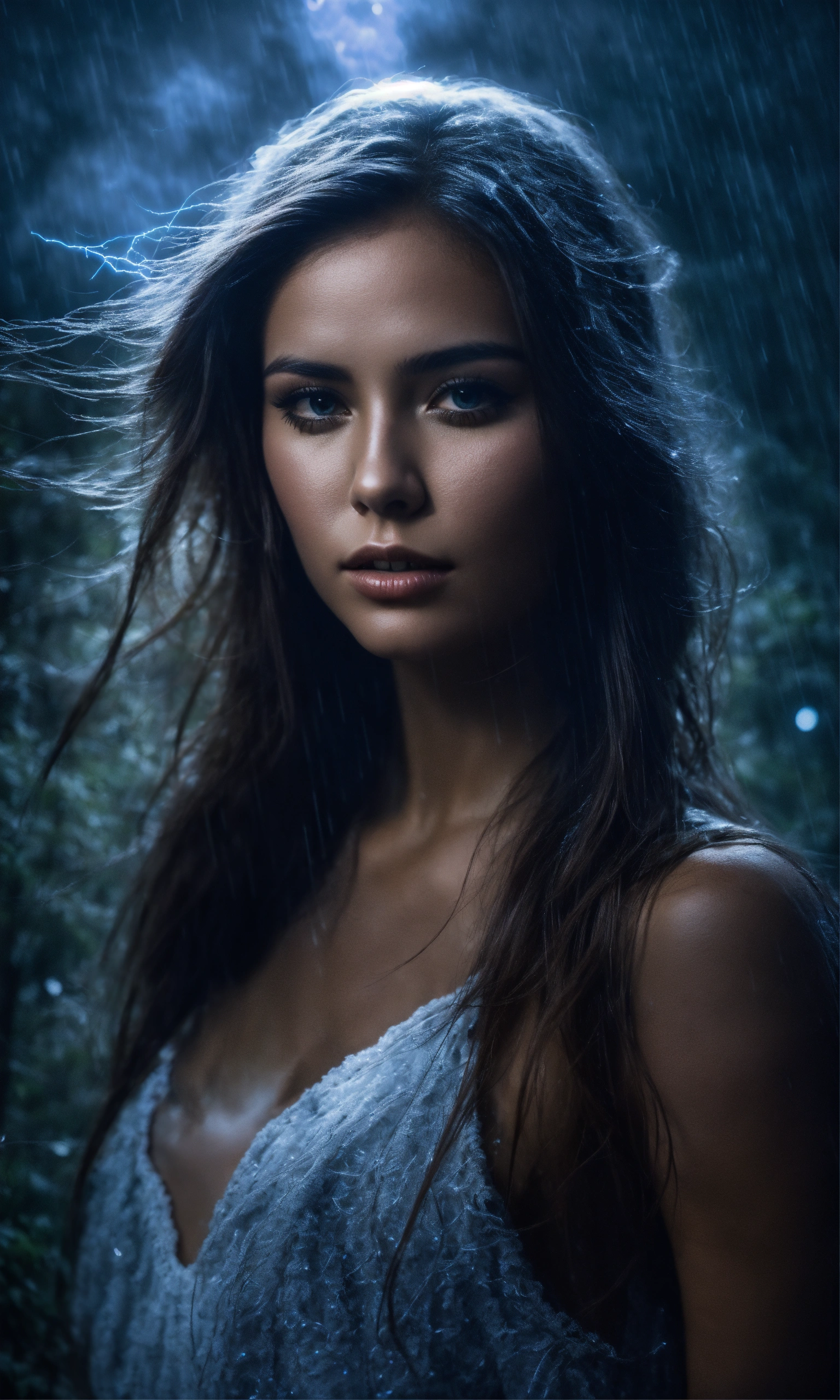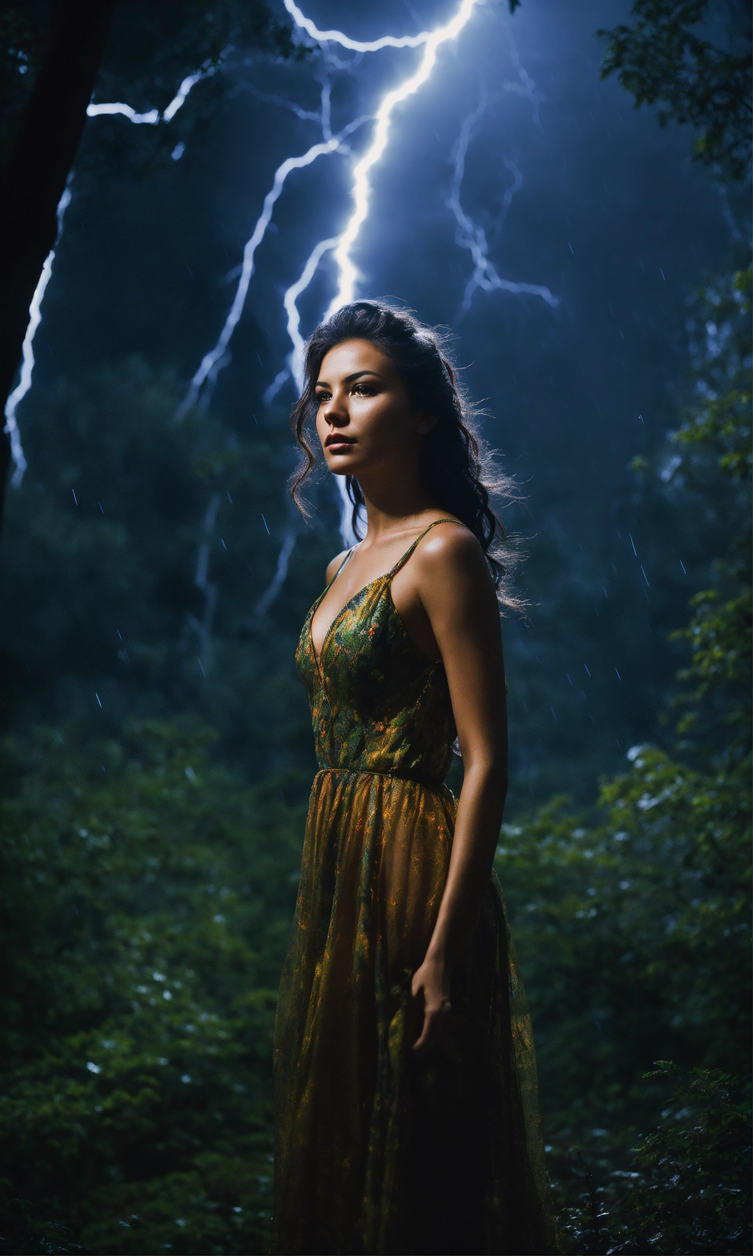 A photographic image close-up of a beautiful woman in a lightning storm, standing in a moonlit forest at midnight.