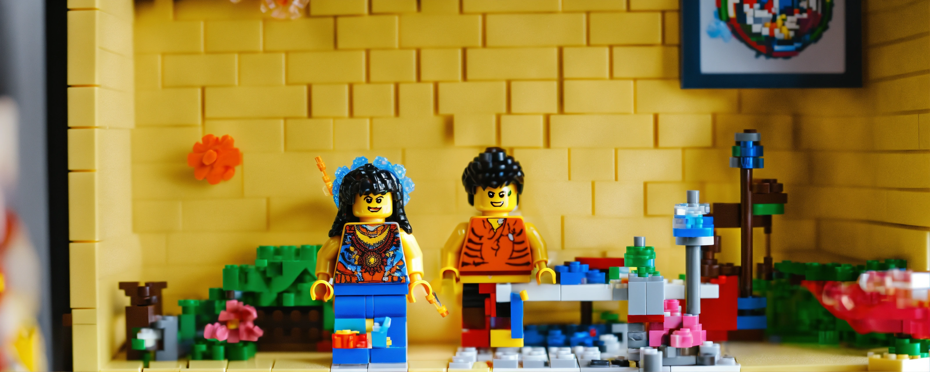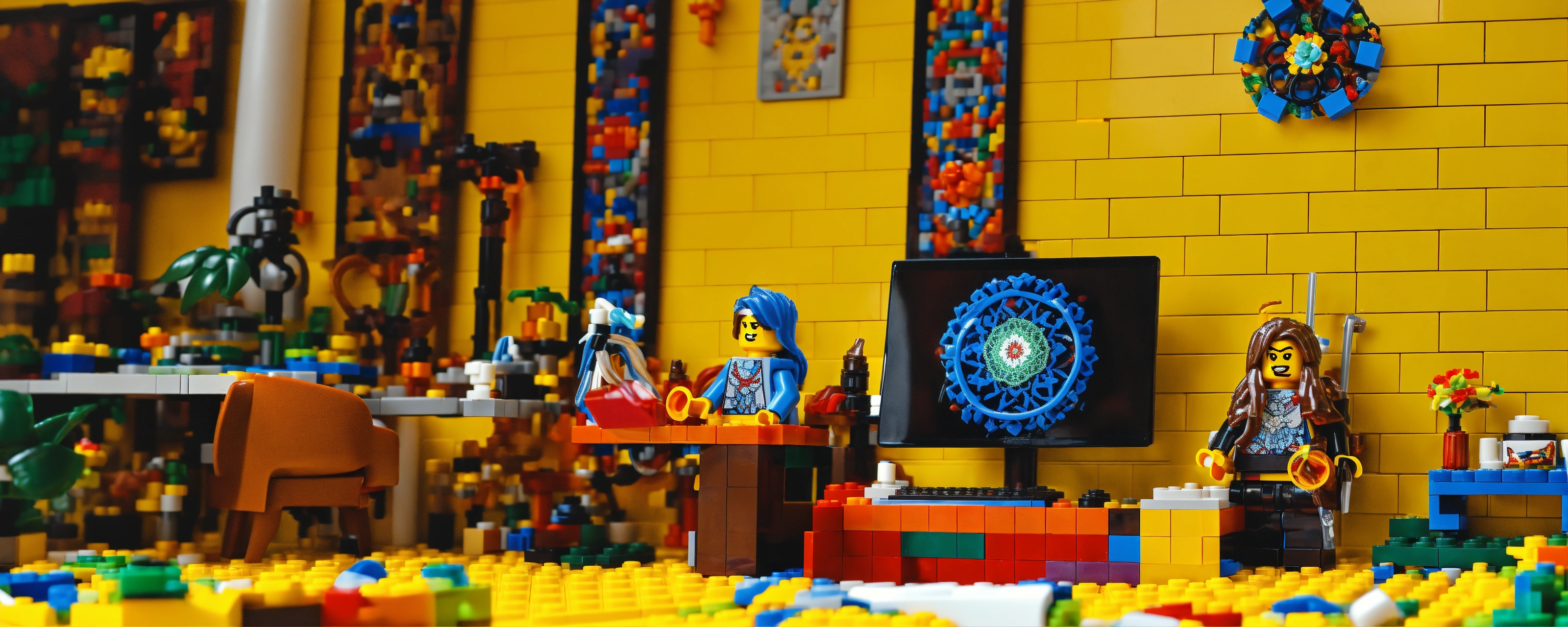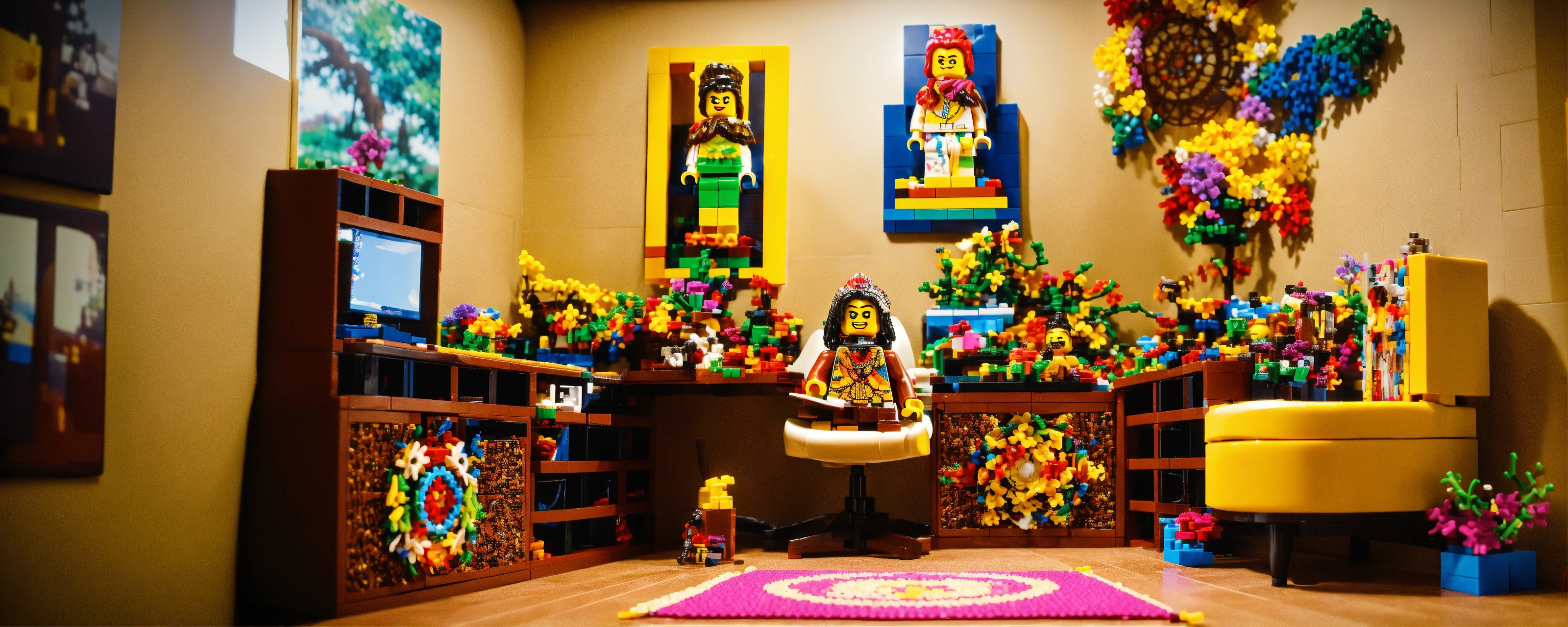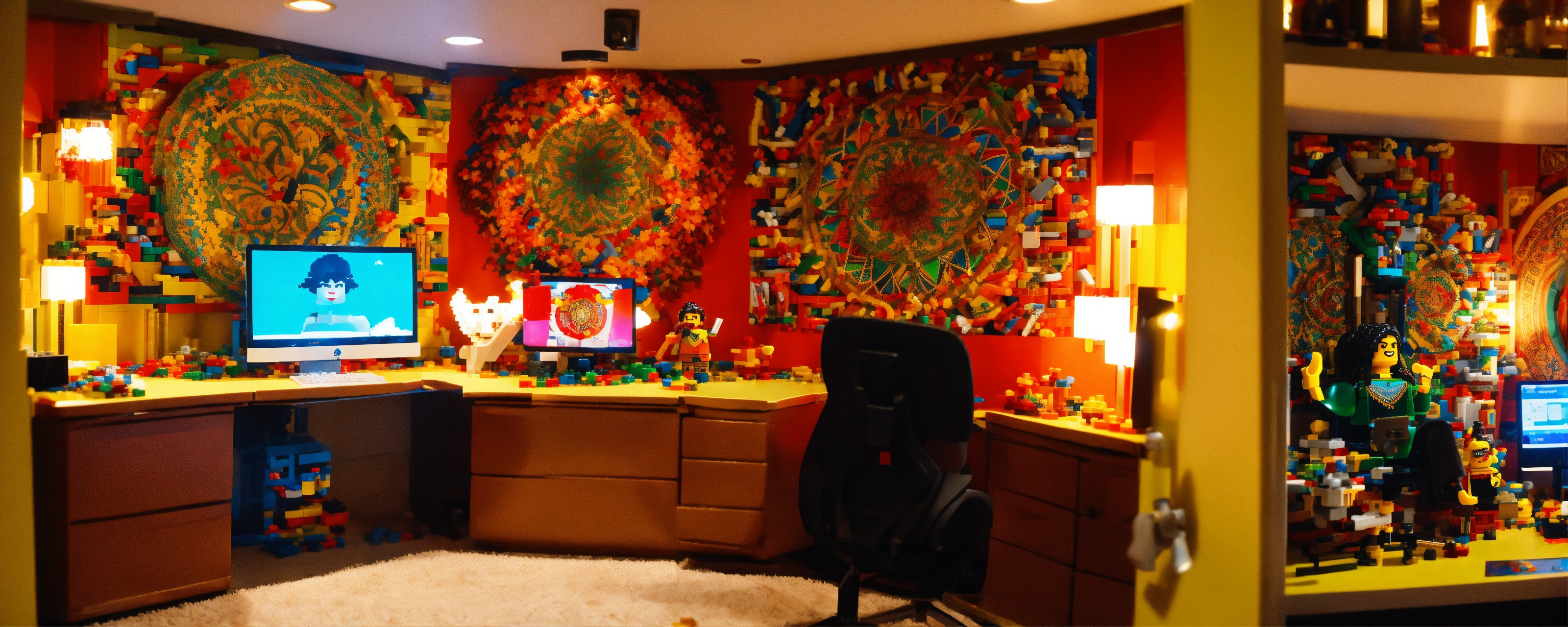 Lego setup "an office. there's a 'lego female' working on her 'lego laptop'. her style is short hair, dark-haired, hippie and young. she's sitting on her lego gmer chair, working on her lego laptop with multiple monitors. her lego office is decorated with shamanic lego objects like lego mandalas, lego dream catchers, lego ganesha statue, deccorative lego "lakota headdress" on her lego wall, lego shiva picture on the wall. all in lego pieces.