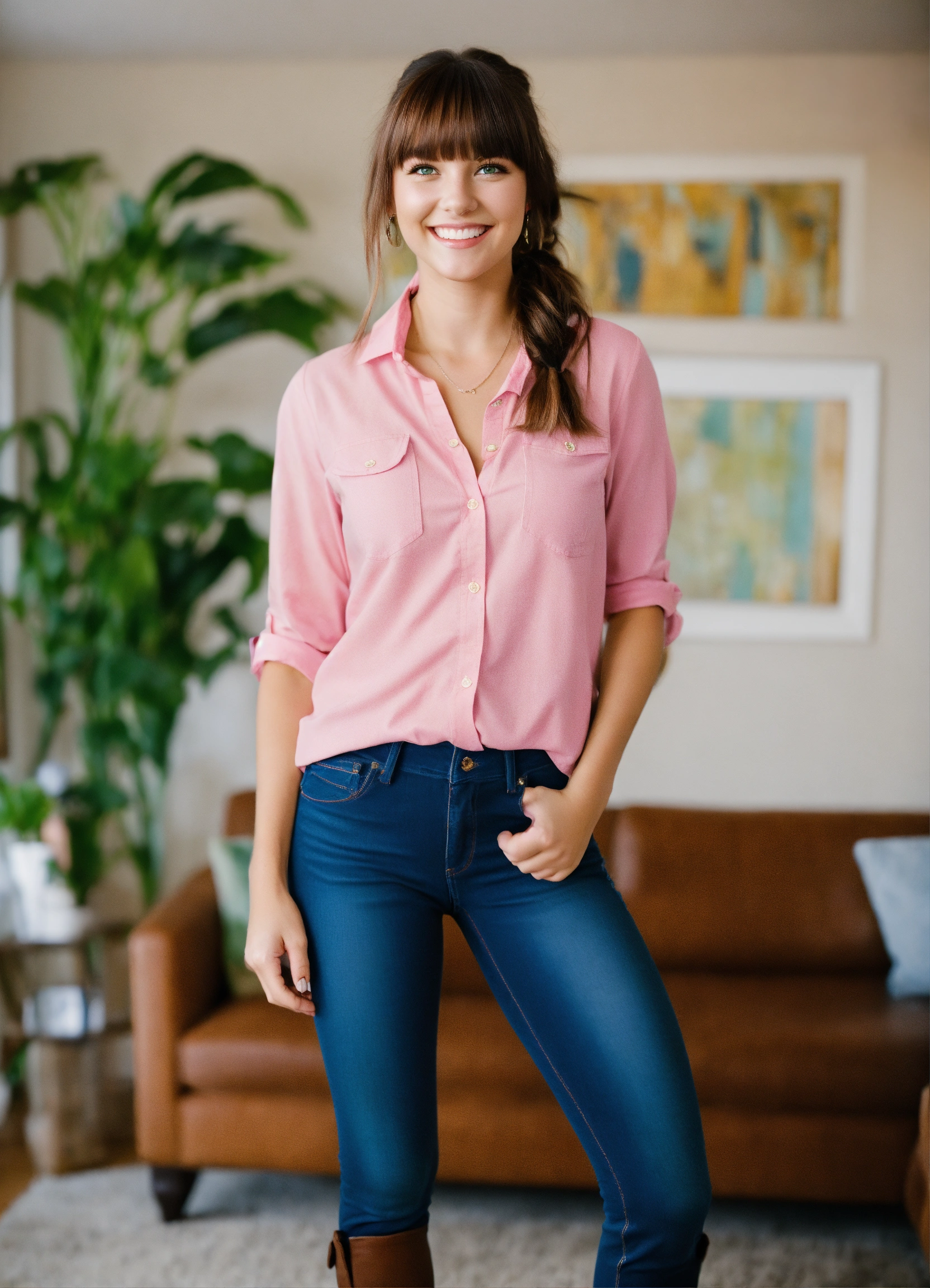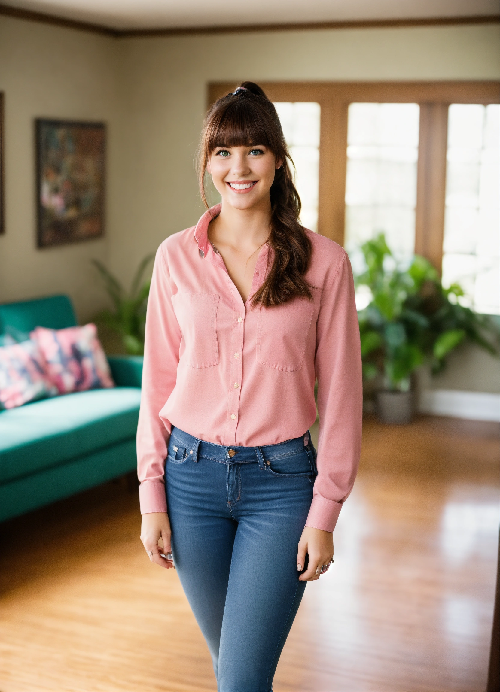 Full body of a pretty young woman around 18-19, she has brown hair with bangs up in a ponytail, she has green eyes, she is wearing a pink shirt with blue skinny jeans, she is facing forward smiling, she is in her living room