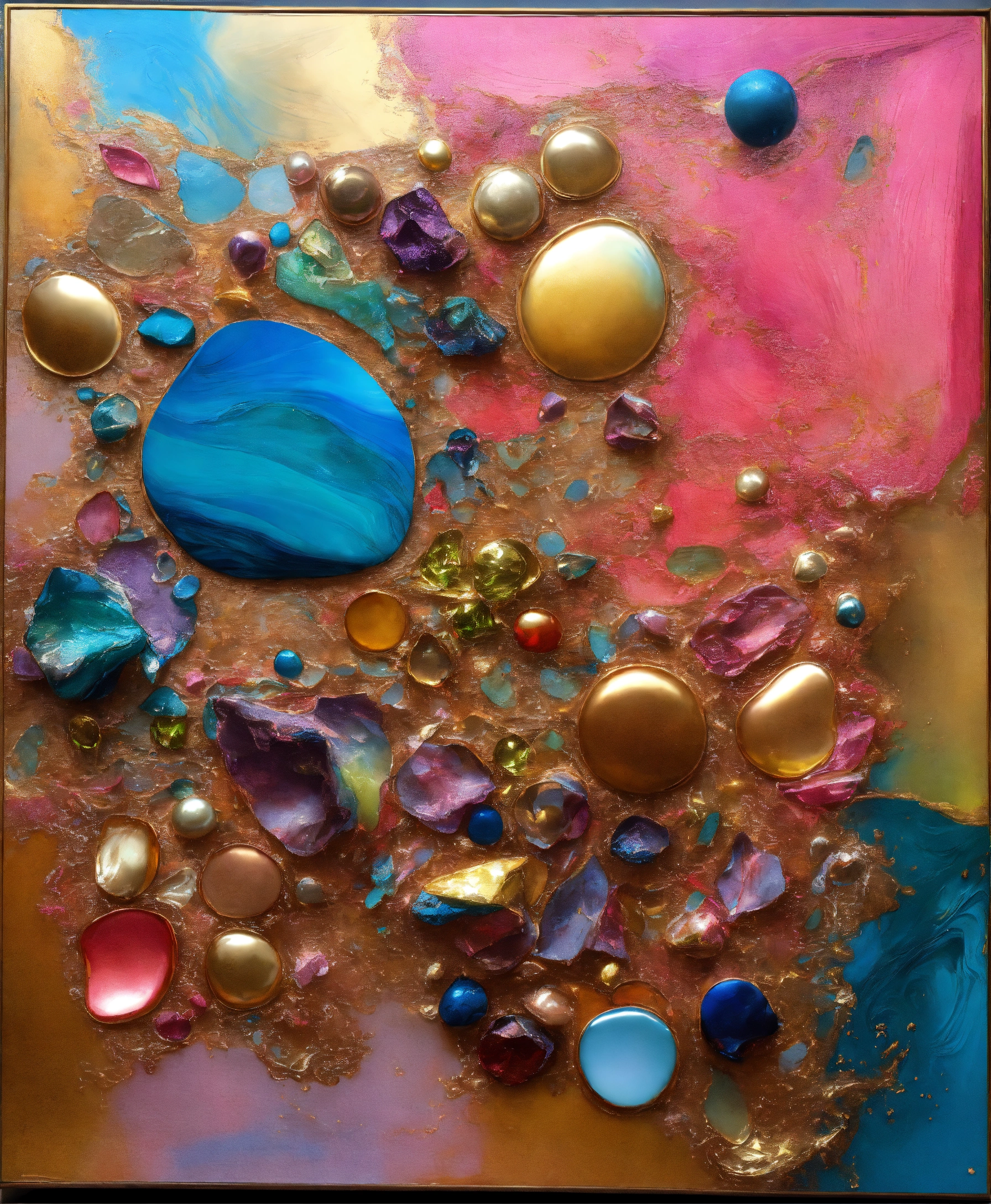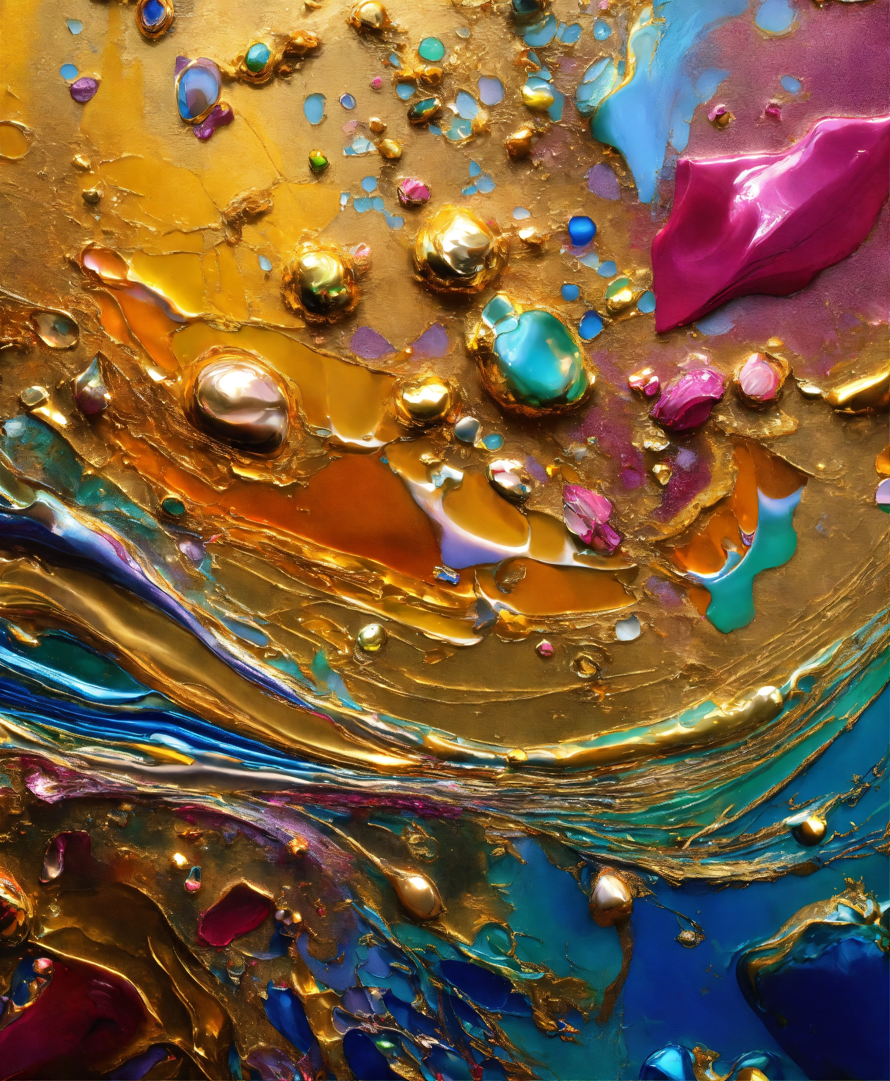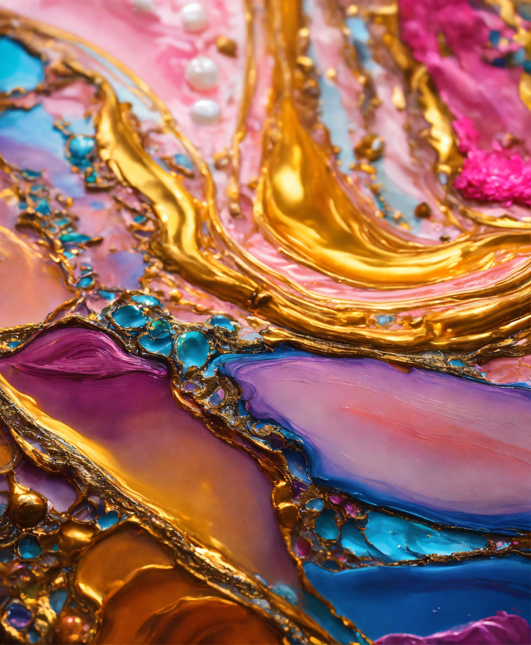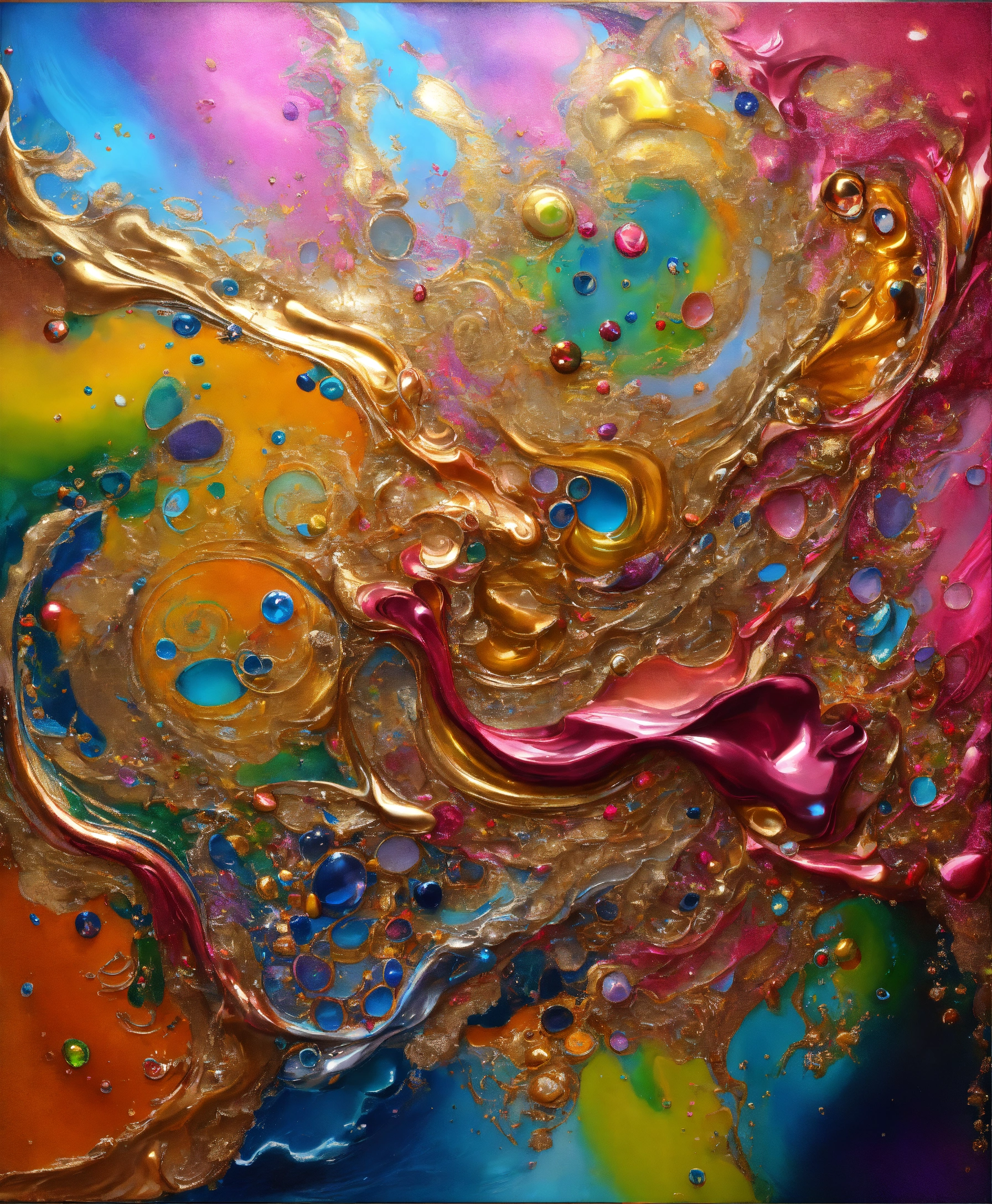 Colorful abstract painting oil and water complex complicated bright vivid colors beautiful opulent wealthy intricate all hues primary secondary and tertiary colors pink peridot sky blue lilac green magenta orange gold silver bronze copper mother of pearl magnificent amazing sublime delicate hyperdetailed masterpiece complex extraordinary metallic sheen elaborate awesome 24k bright gold and silver trims everywhere oil and water abstract art 24k bright gold trim everywhere glossy hyperdetailed 12k