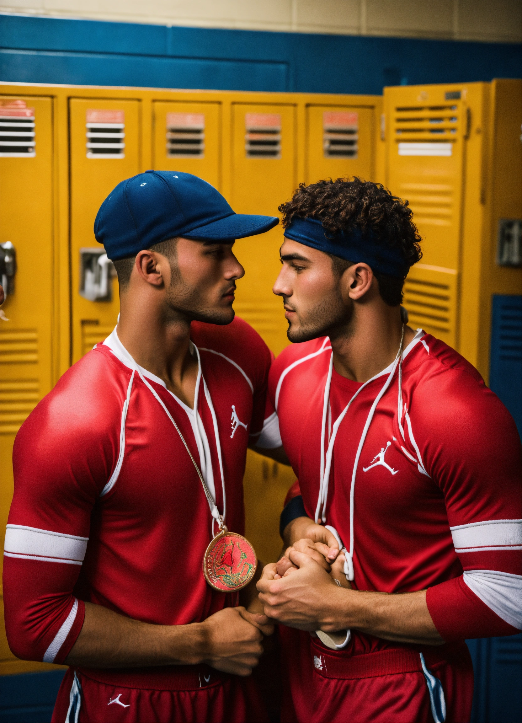 Bromance, group of skinny moroccan fit slim sweaty sporty college handsome tanned boxer wrestlers young stud guys cuddling, smelling, holding hands, flirting, drooling, kissing, wearing sock and nike jordan sneakers, in a locker room lockers, with big bulges, sniffing socks and shoed, gazing into each other, wearing backward cap