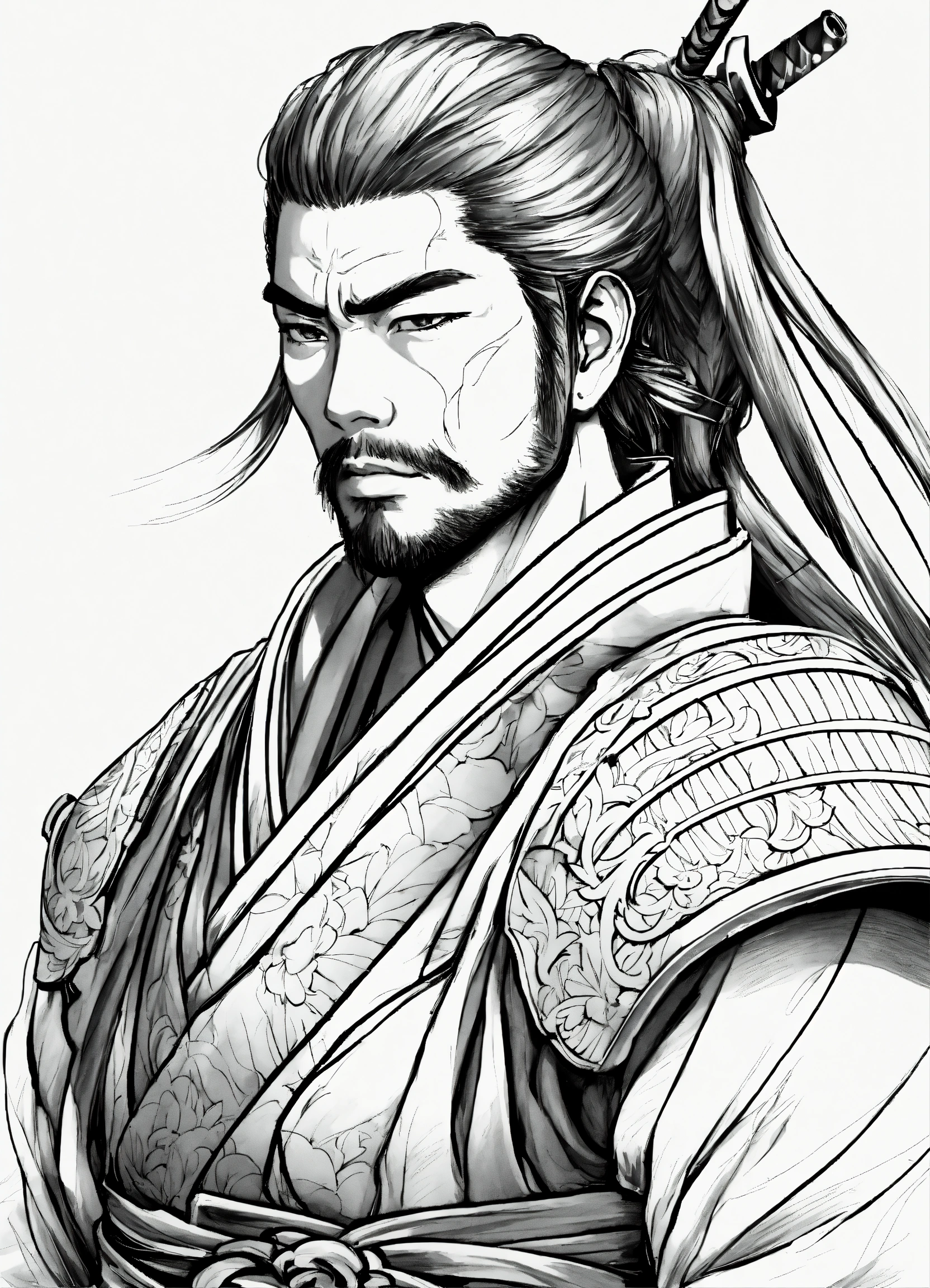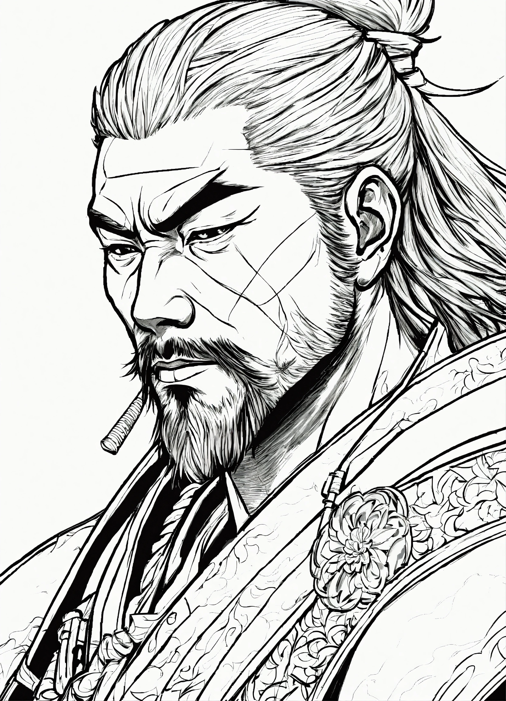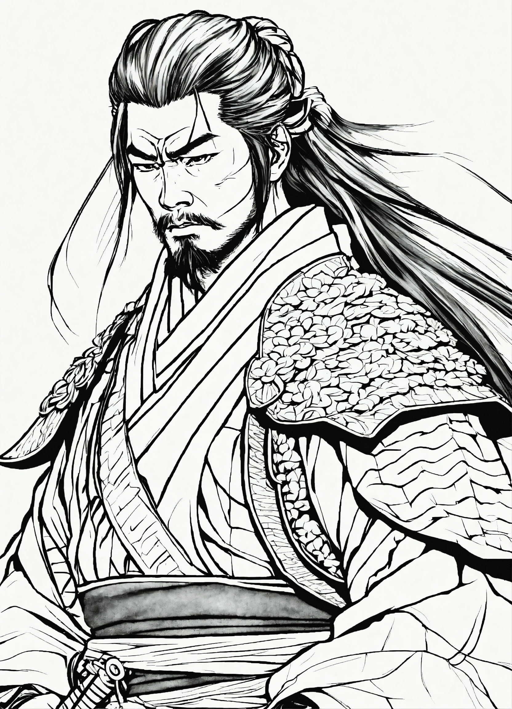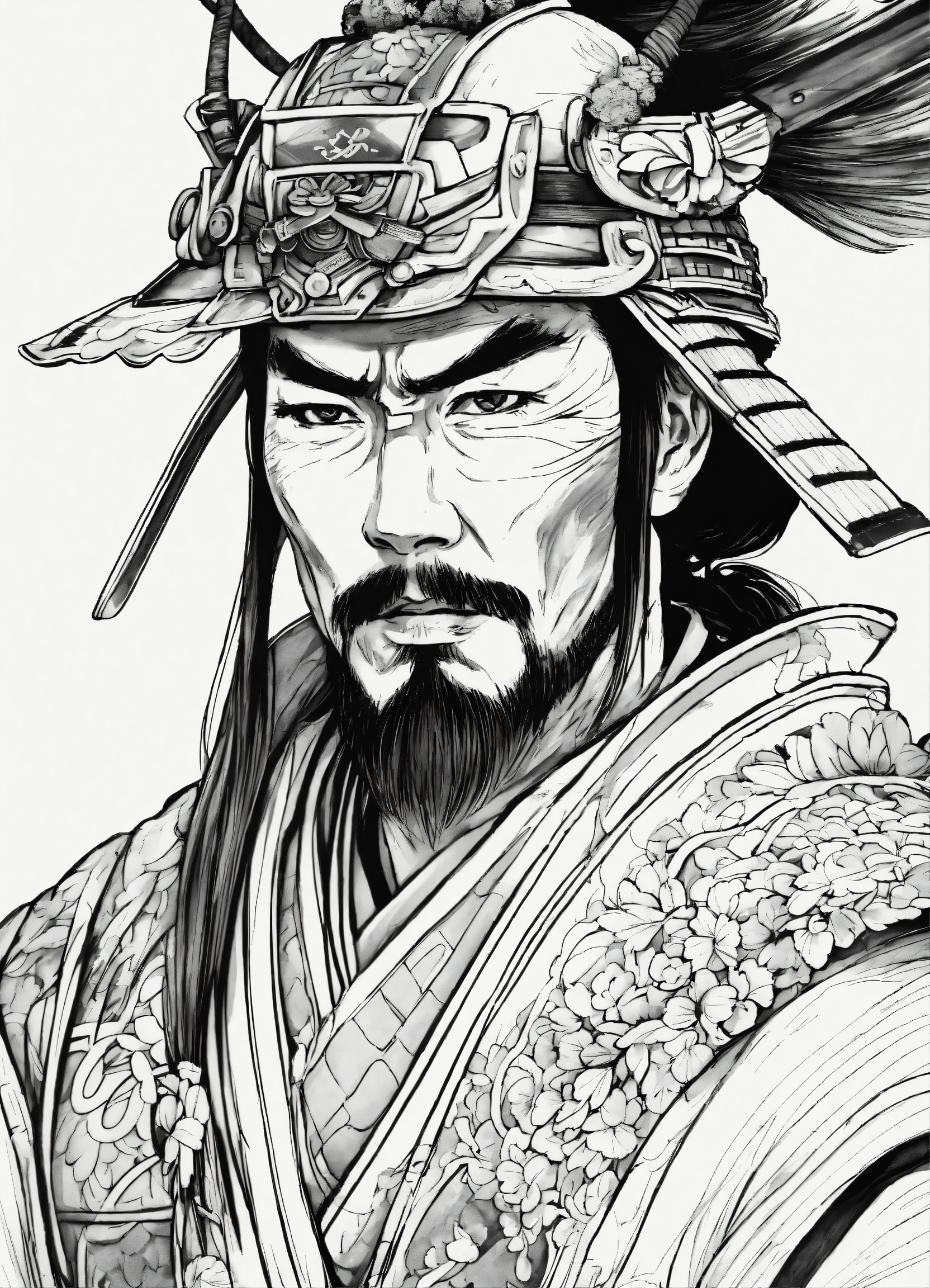 Generate a portrait of a samurai, 4k resolution, anime, with clear lines, no shadows, on a pure white background suitable for a adult's coloring book.