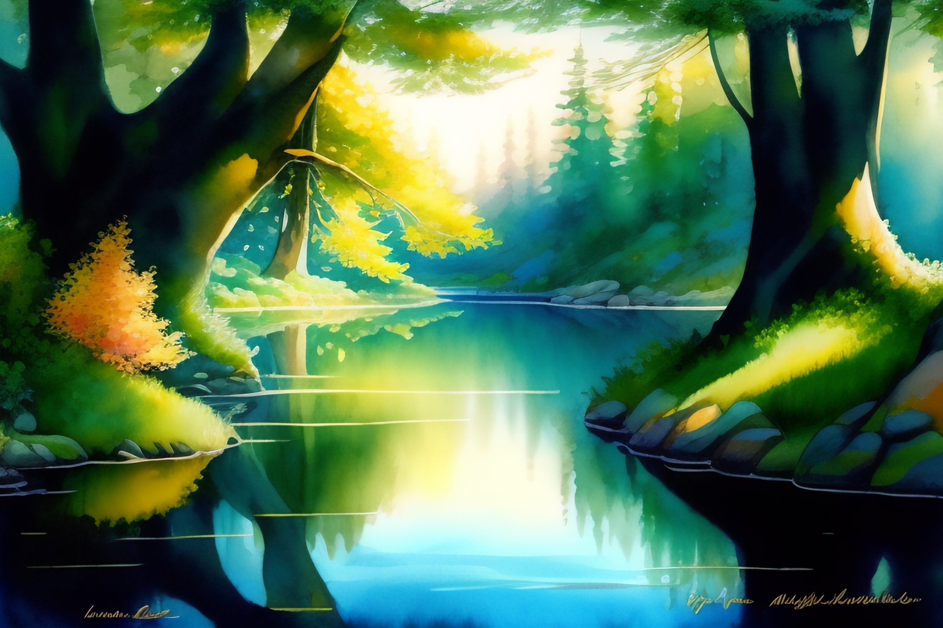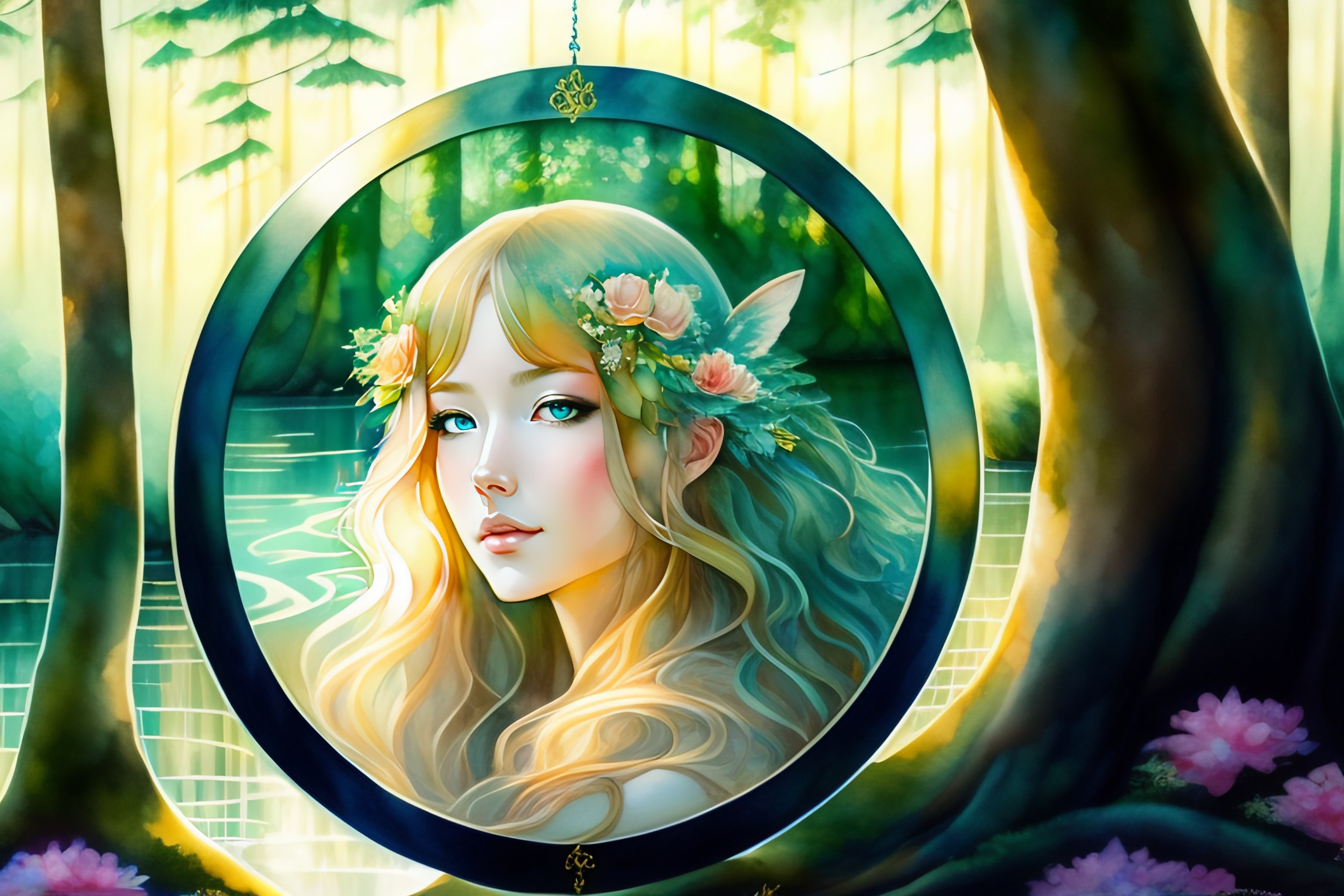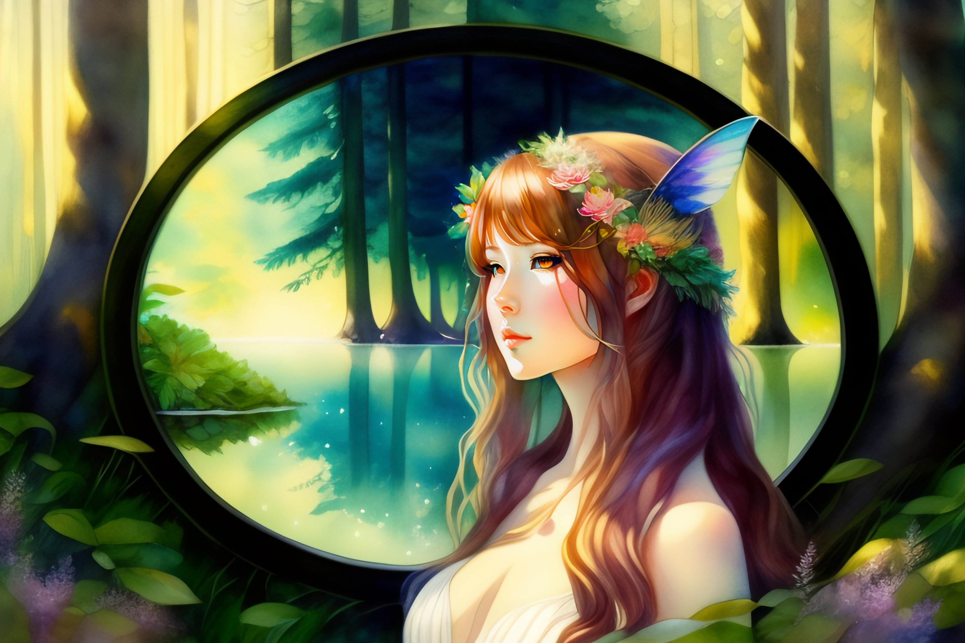 Anime portrait nymph nature, in the magic forest, lake reflections, concept art, strokes, watercolor, kelogsloop, art nouveau, gold circle, on paper