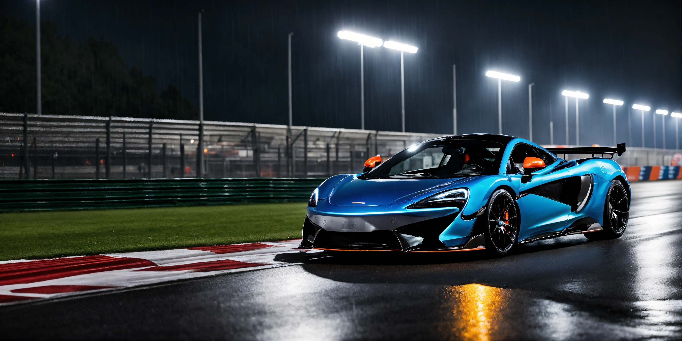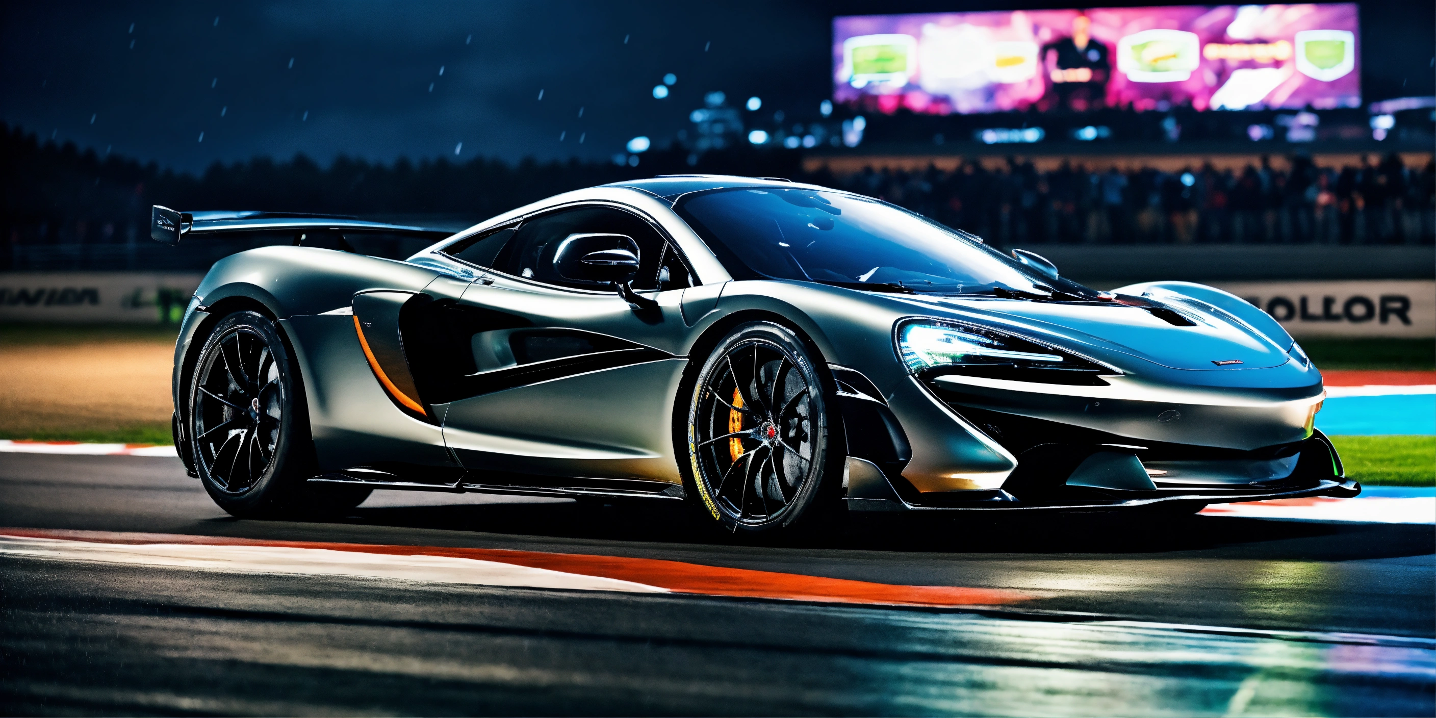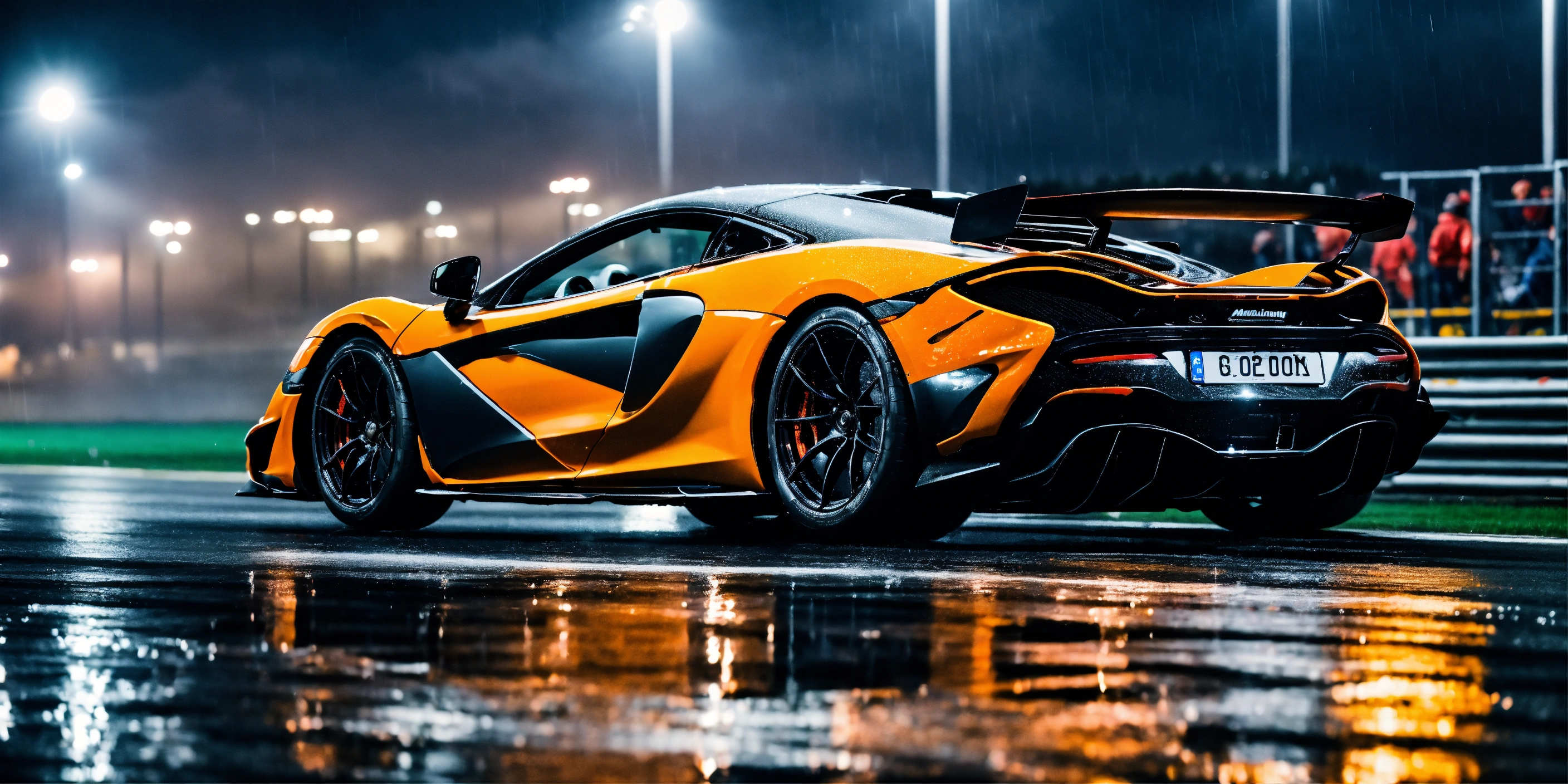 Ultra-realistic photo 16k night photo, with big rain, gray colors, competition mclaren 600lt with speed effect, mclaren 600lt, at full speed, with fast car movement, with feeling of speed, automobile photographer, 24 hours of le mans circuit in the stands, speed, track, cinema atmosphere, ultra-realistic, with a black black bg, photo fusion. photo sfx cinematic nocturn. composition taken with a canon eos-1d.