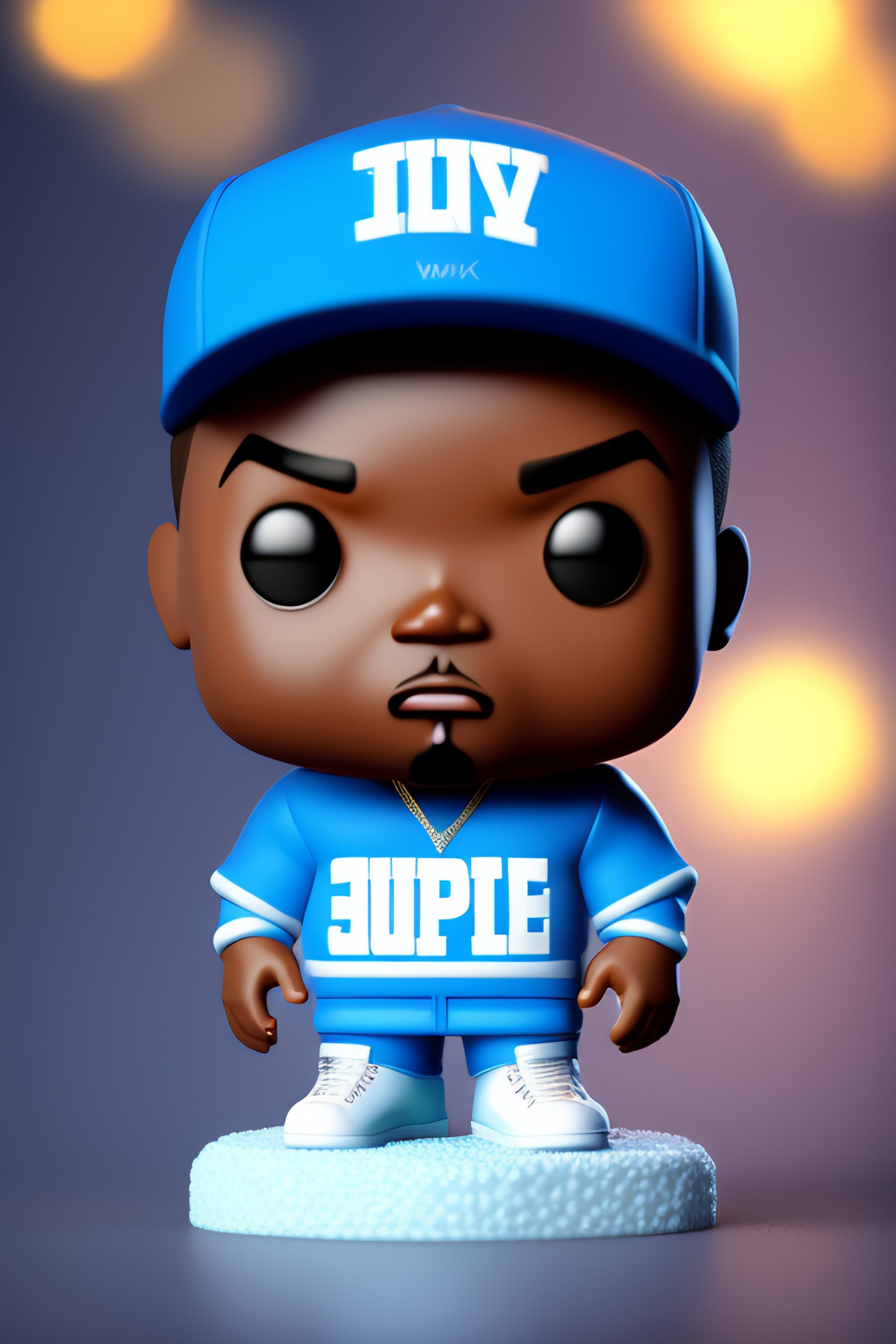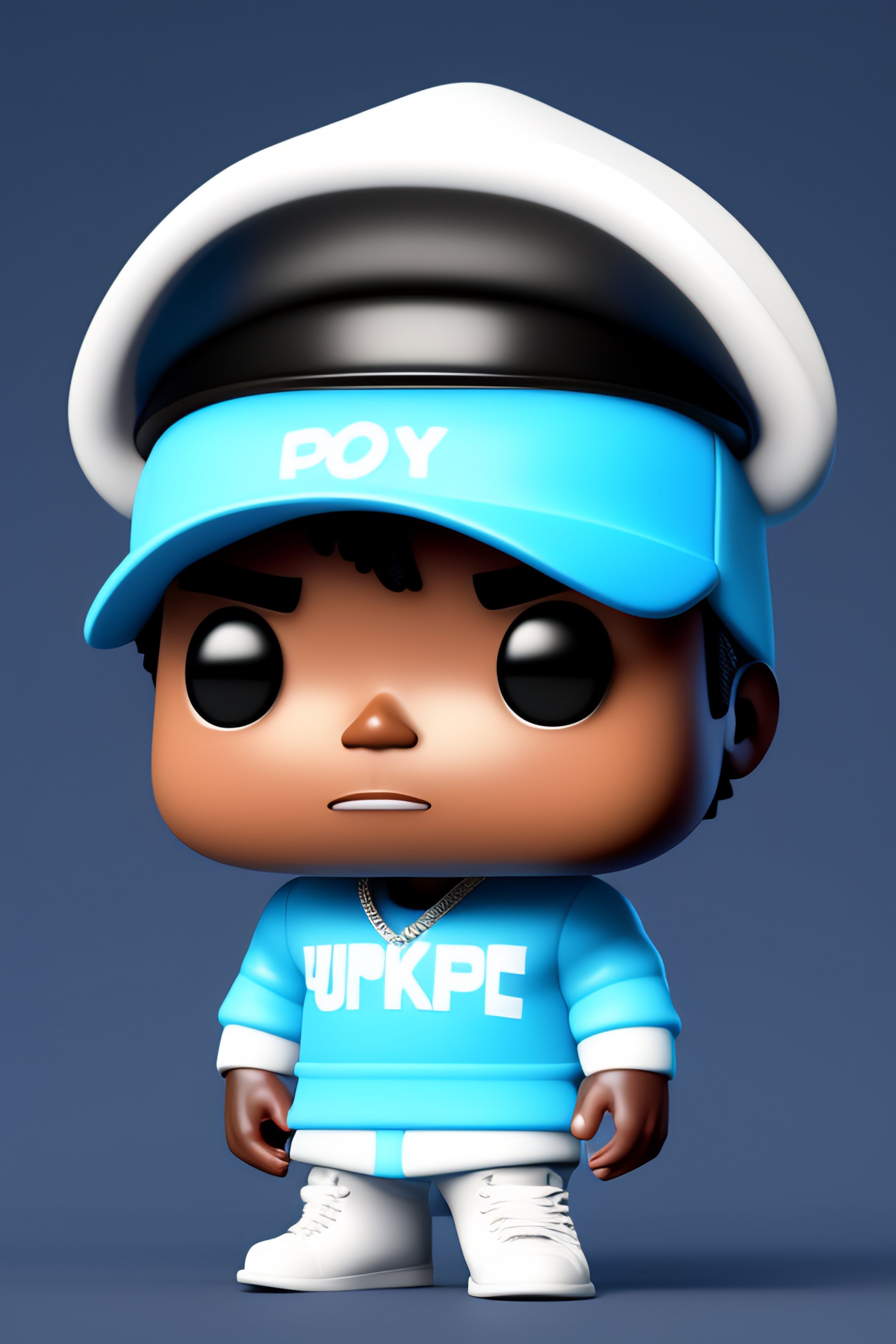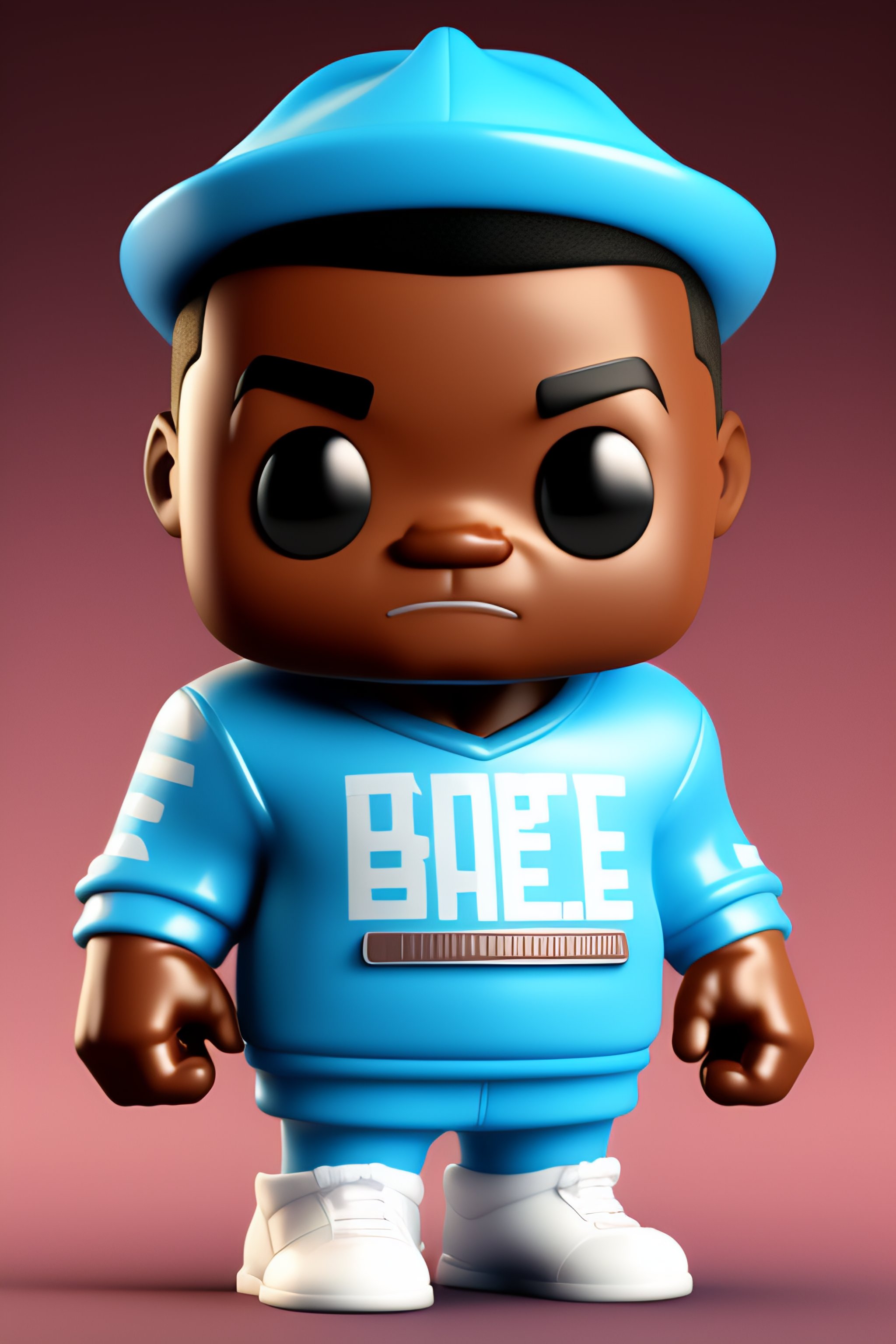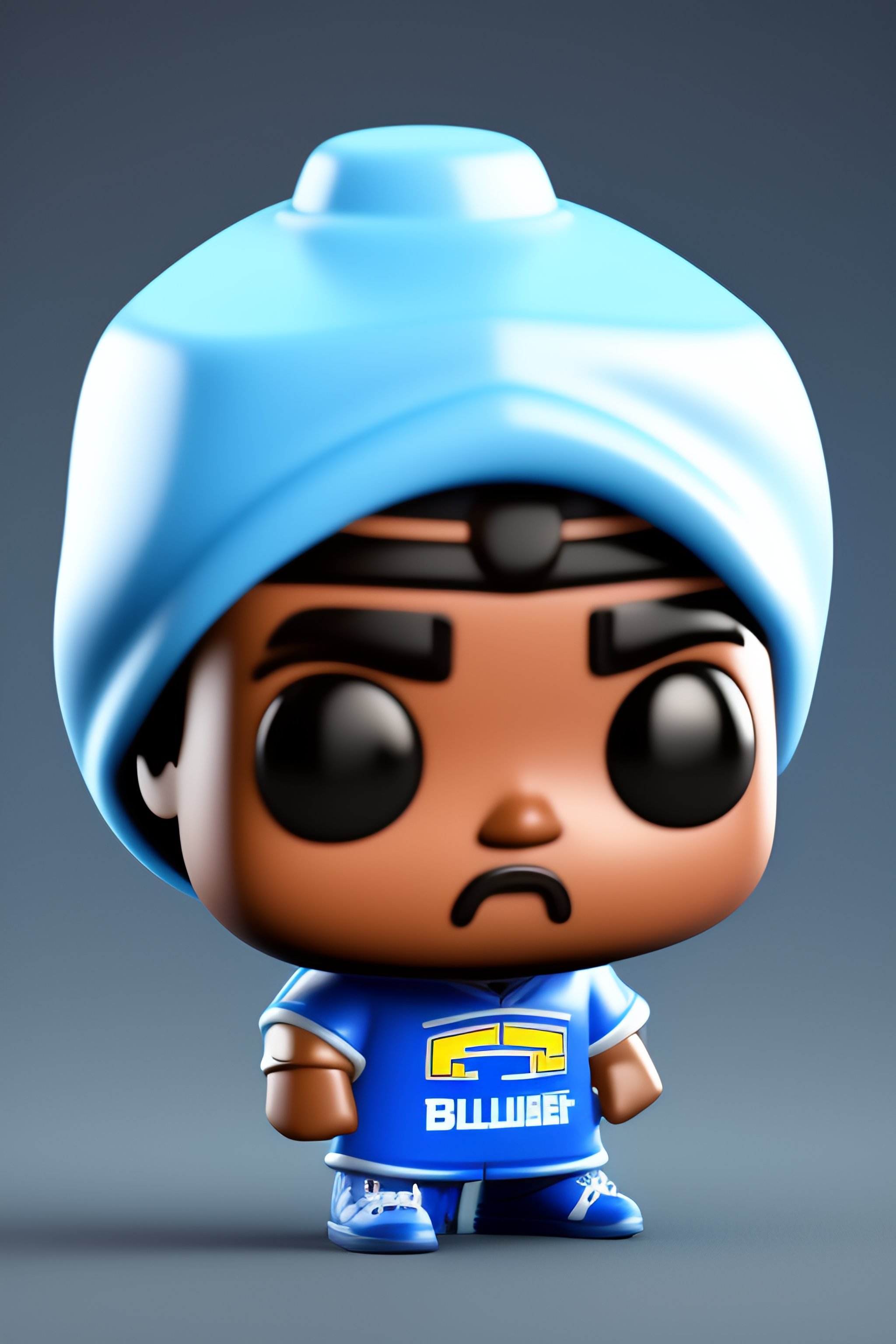 3d render of funko pop rappers light guy blue eyes a little smile t-shirt with the inscription dizmoralil