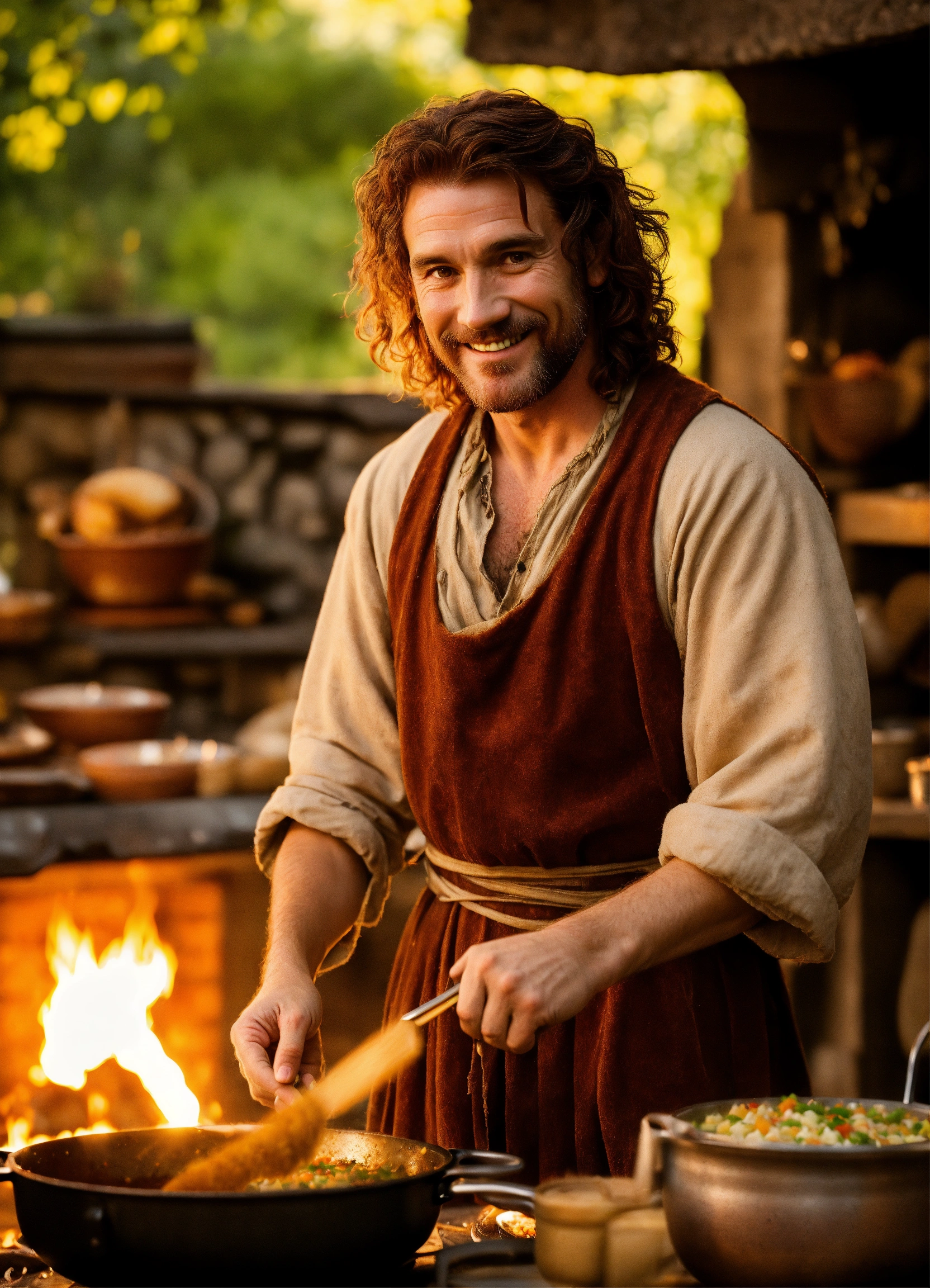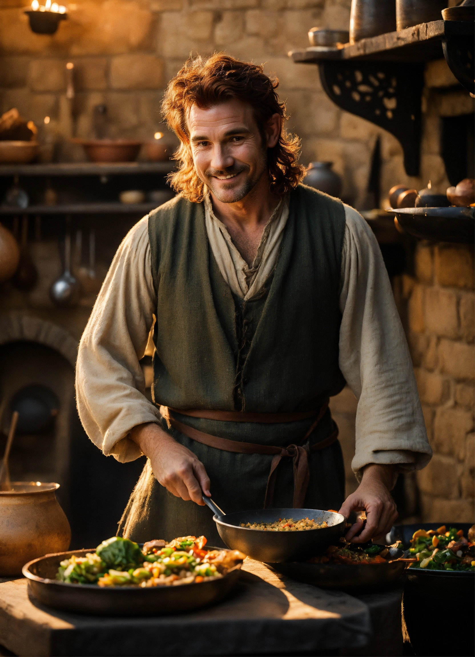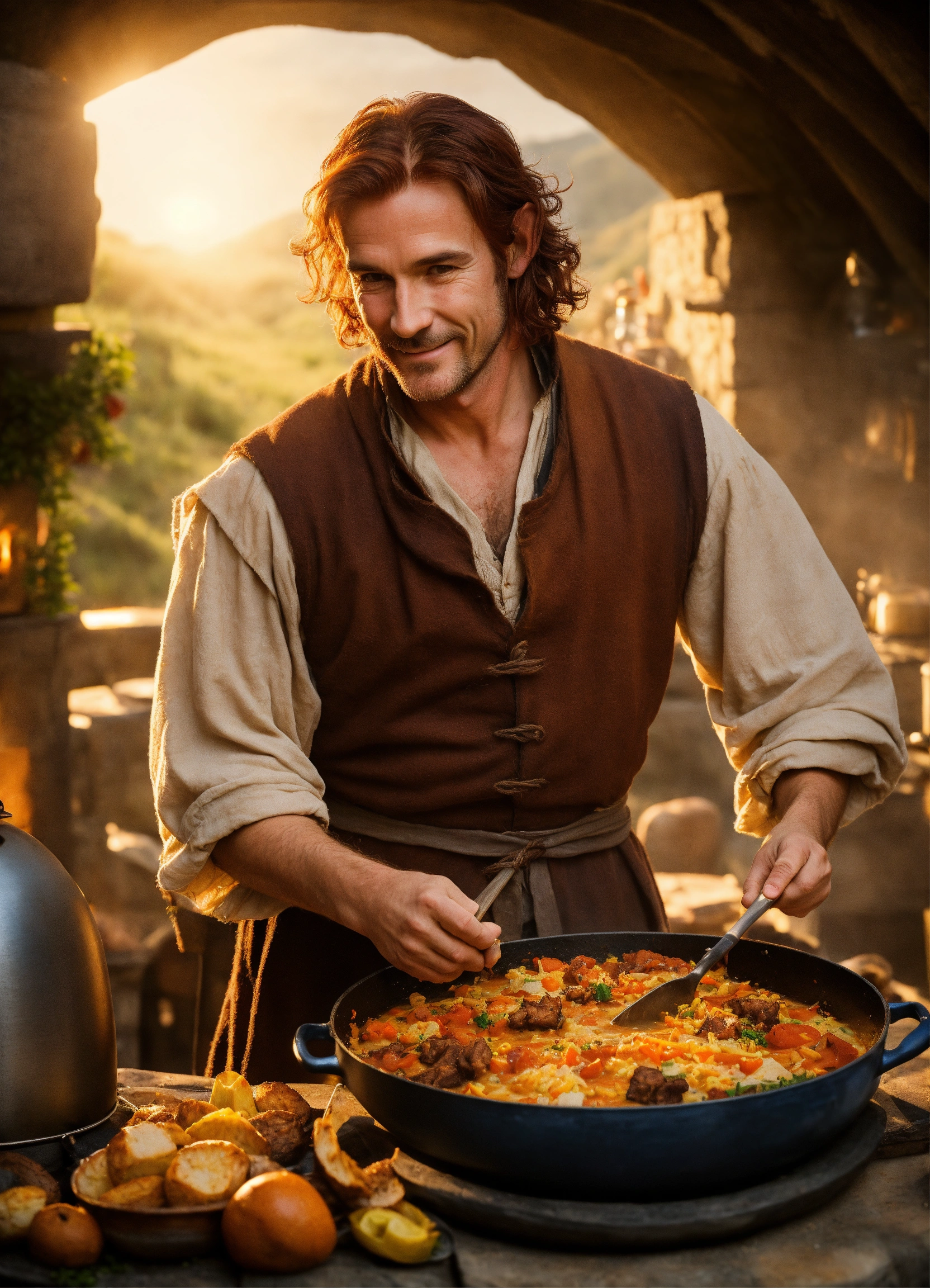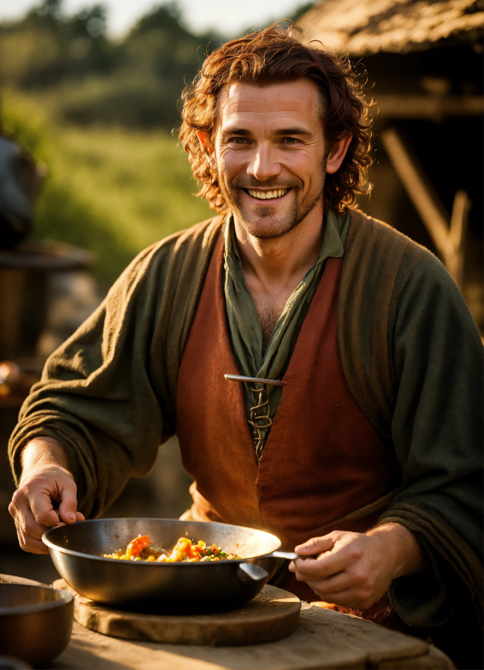 A photographic full body image of a thin and wiry male hobbit with broad shoulders, 40 years old, with a chiseled jaw, dimpled chin, and a warm smile in medieval clothing. he has no beard and short curly wild auburn hair. he is cooking a huge meal in the evening sunlight.