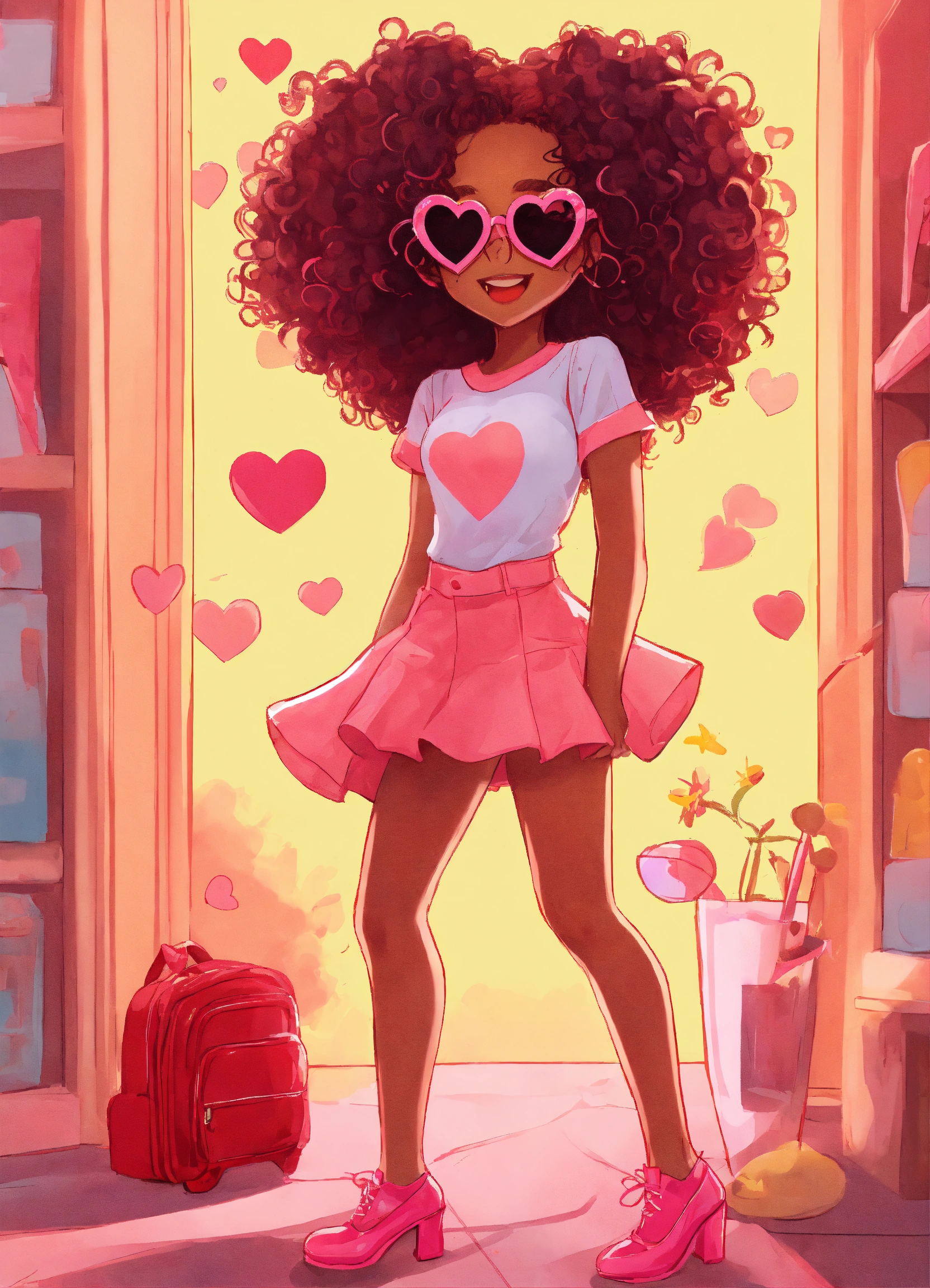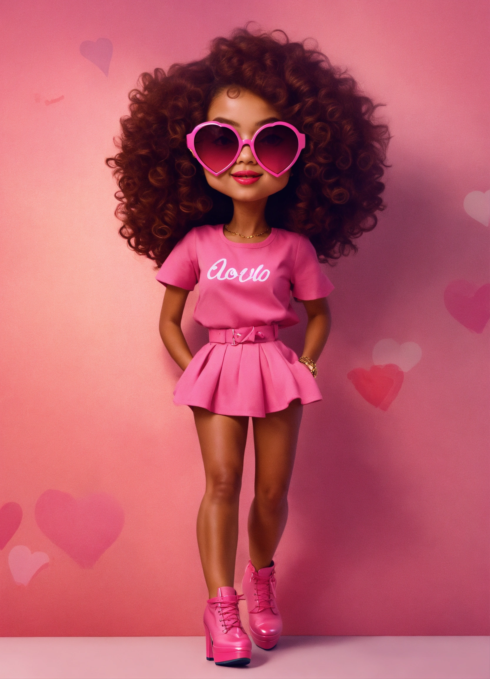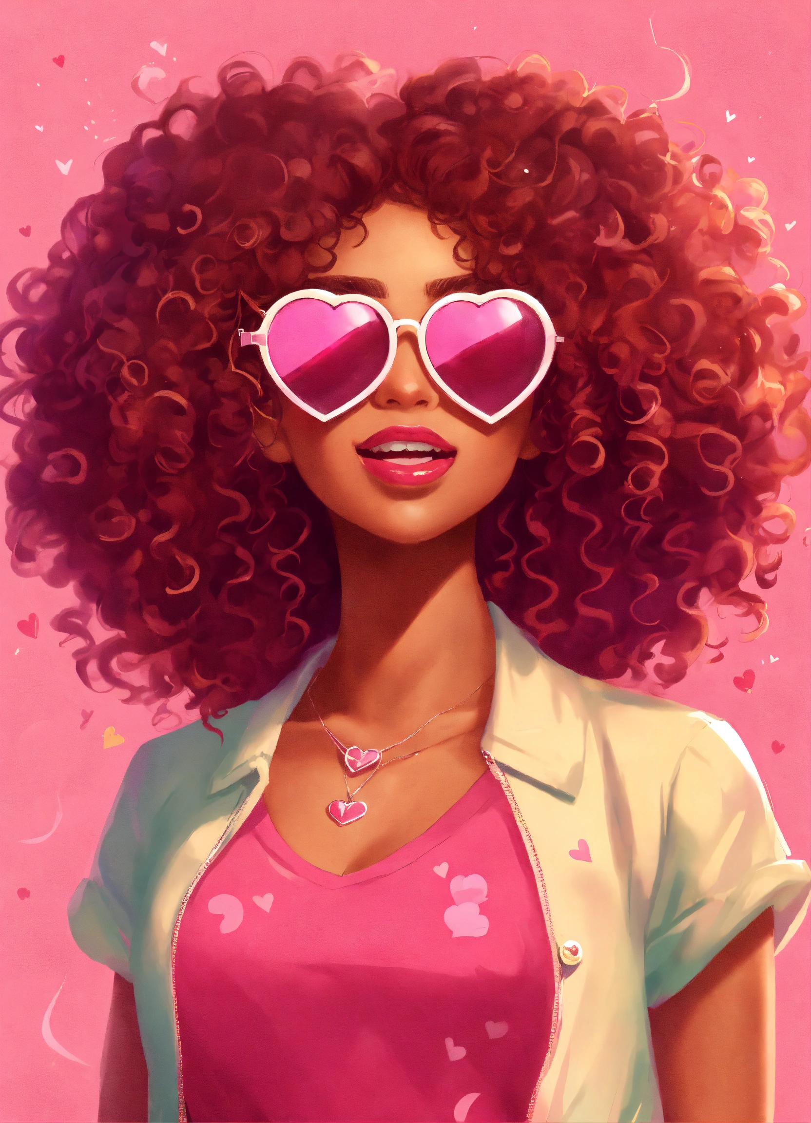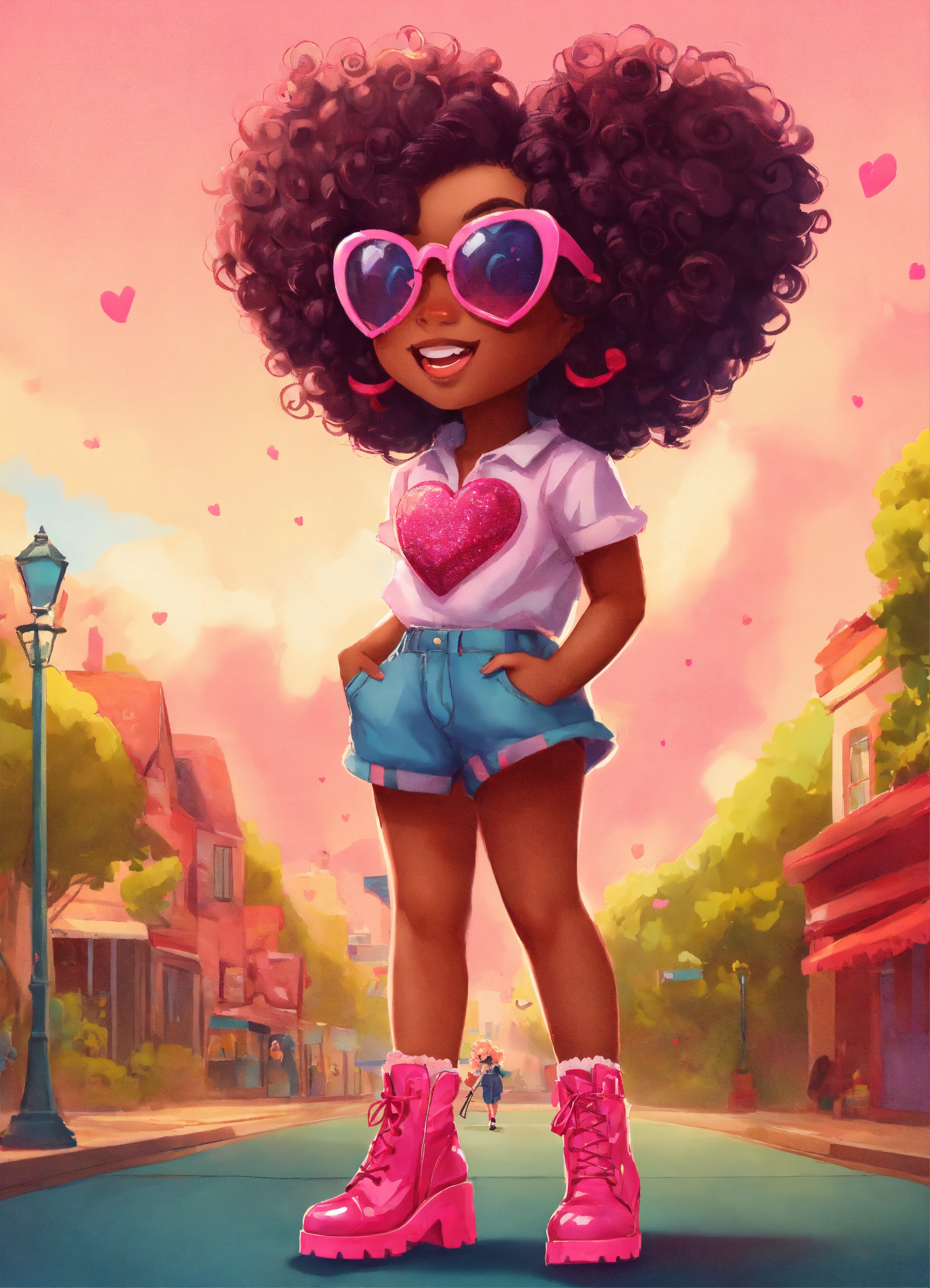 "imagine a cute cartoon character girl with curly hair, wearing heart-shaped sunglasses and pink heels, exuding a fun and confident vibe."