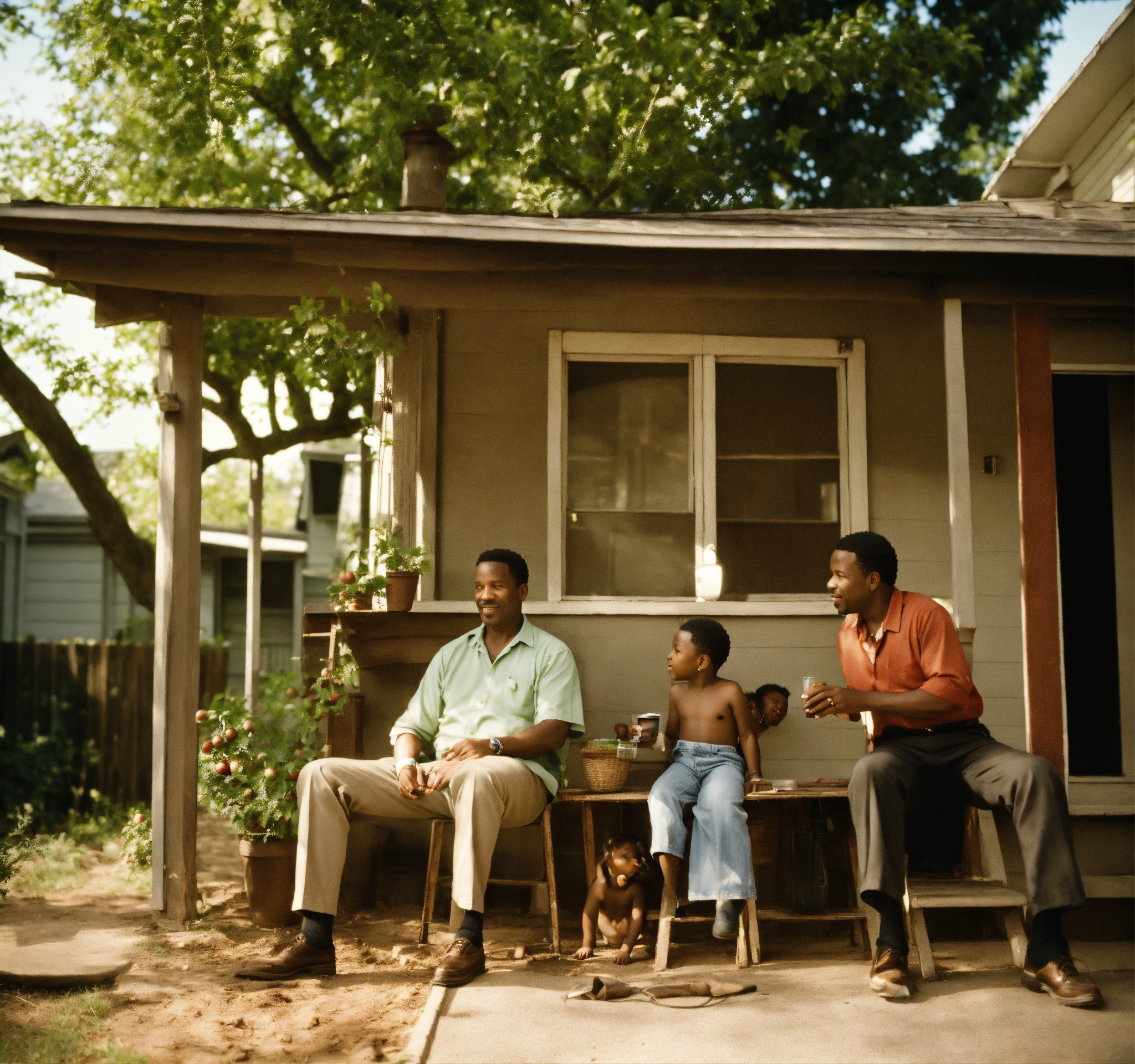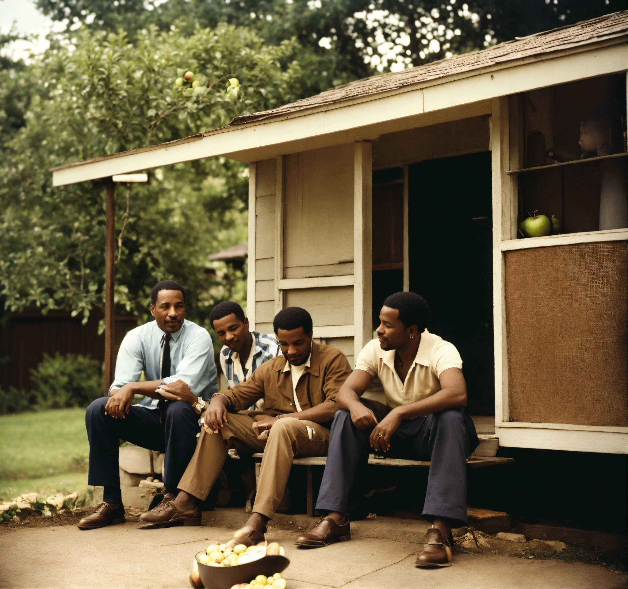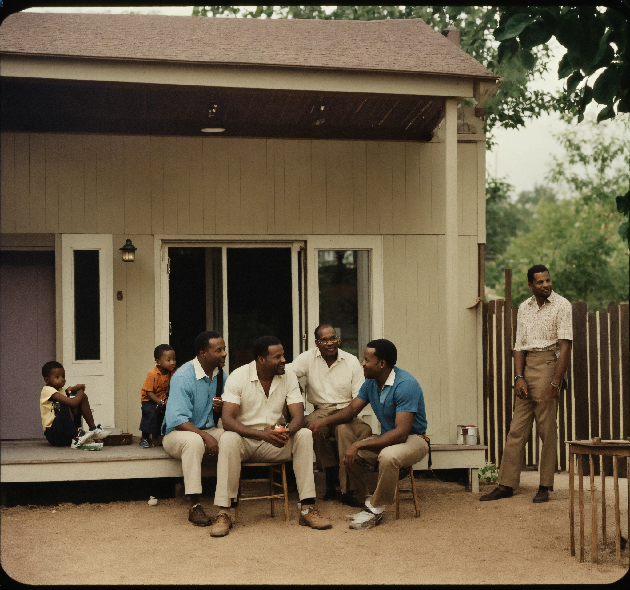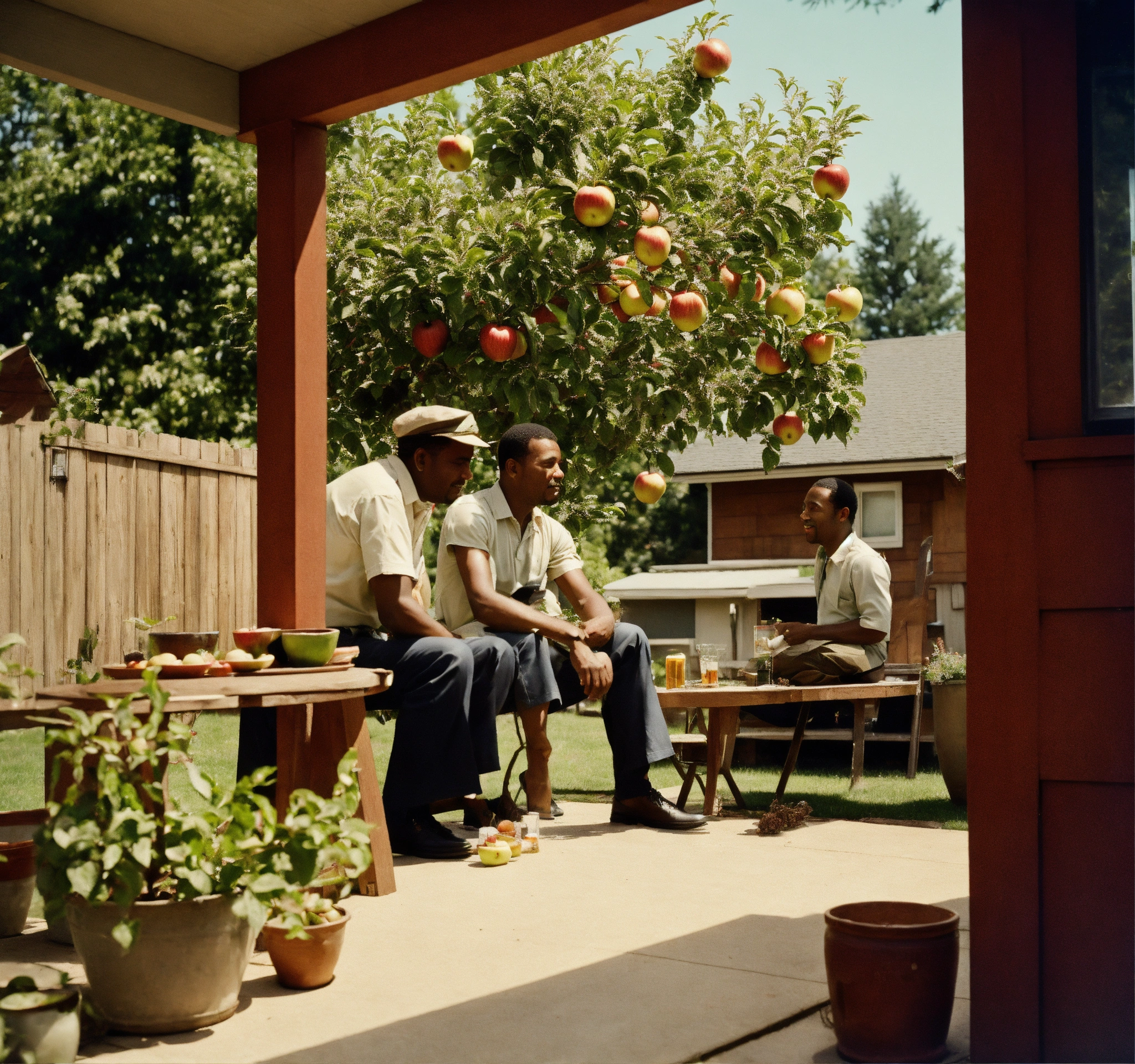 Setting 1960s backyard and porch of a urban home. in the foreground a medium-skinned 55-year-old man is seated on the porch. he is holding a brown-skinned five-year-old on his lap. in the background two black men are having a conversation by themselves. they stand next to a well-grown apple tree, possibly discussing it. their expressions are relaxed, indicating a casual chat. technical specifications steps 20 sampler dpm++ 2m karras cfg scale 18 desired output size 1024x960 pixels