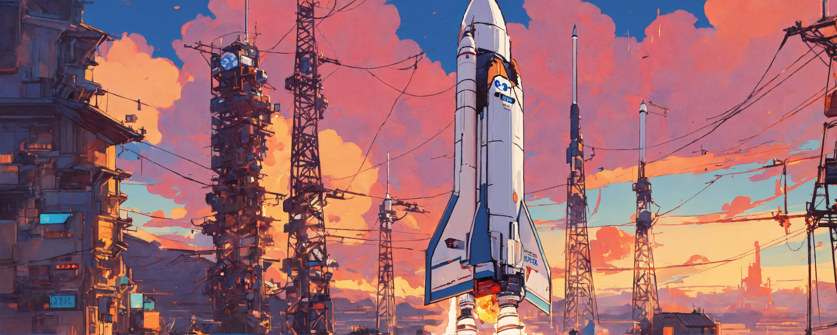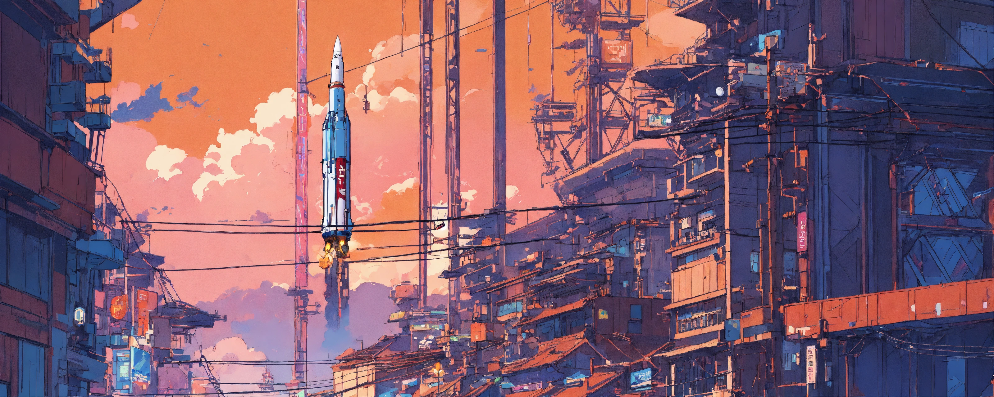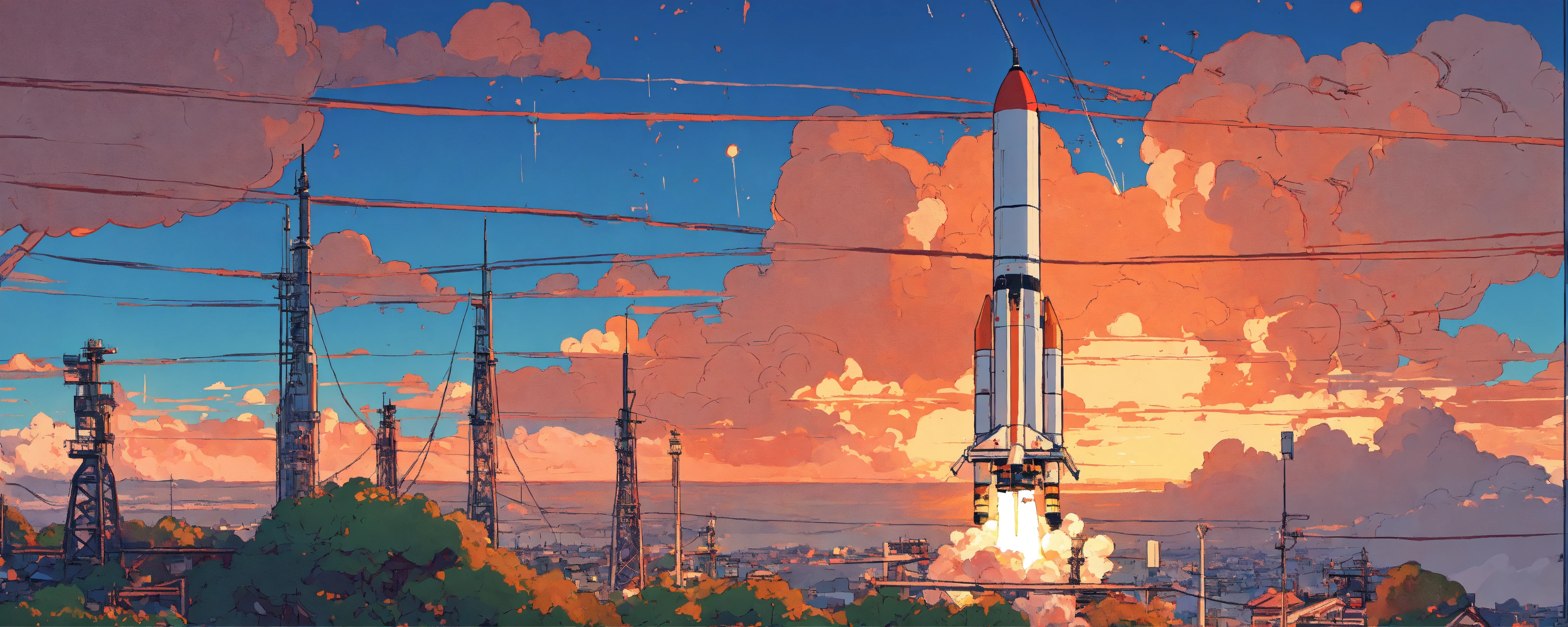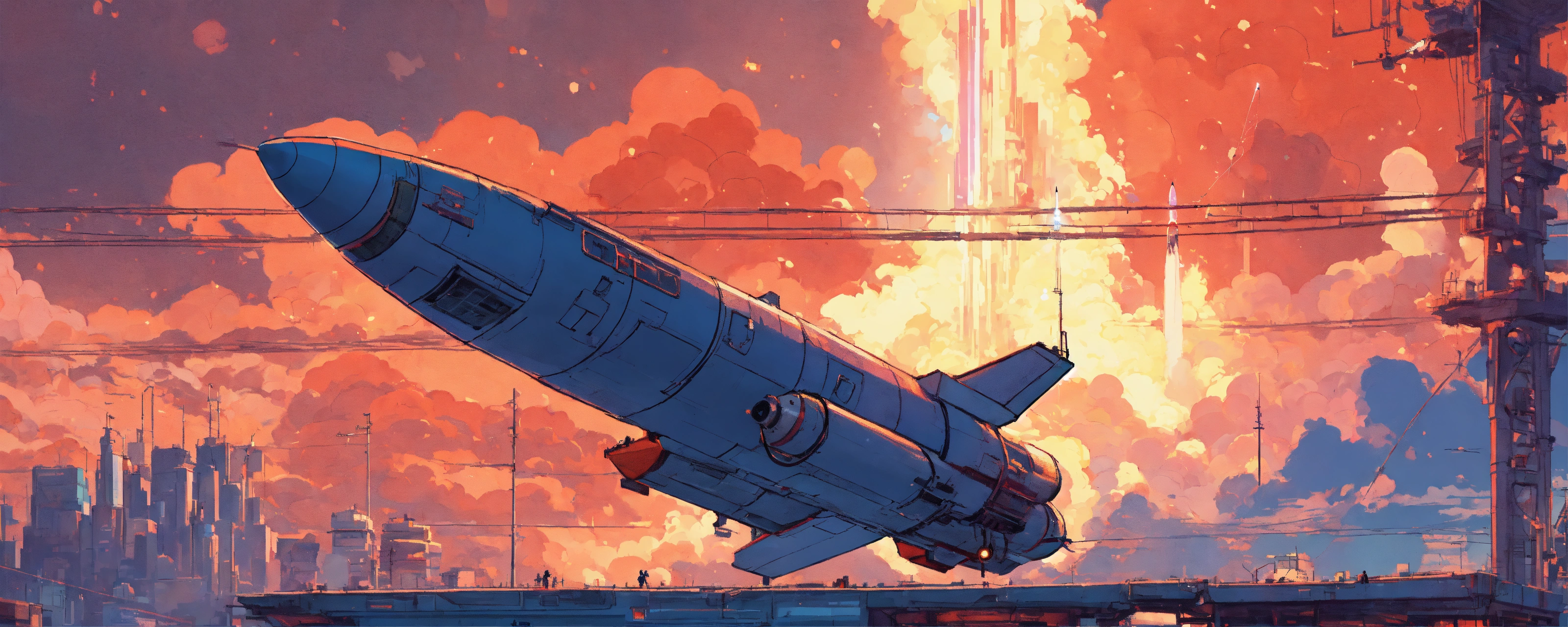 Photo of a rocket launching to sky, lots of cables, style of laurie greasley, studio ghibli, akira toriyama, james gilleard, genshin impact, trending pixiv fanbox, acrylic palette knife, 4k, vibrant colors, devinart, trending on artstation, low details