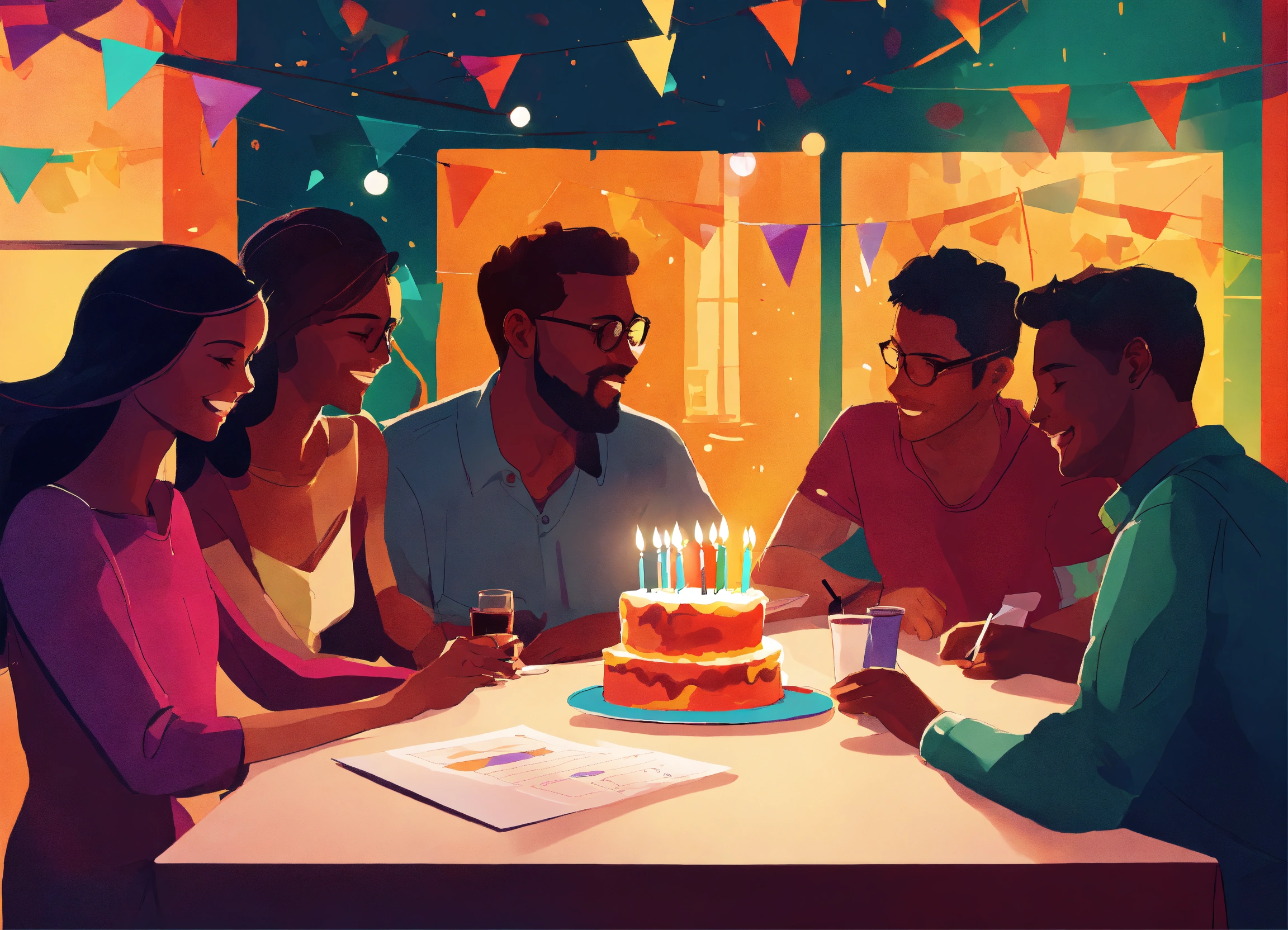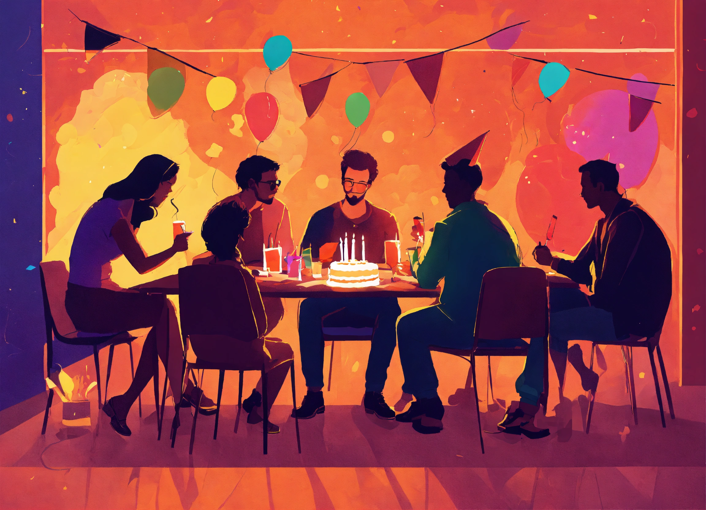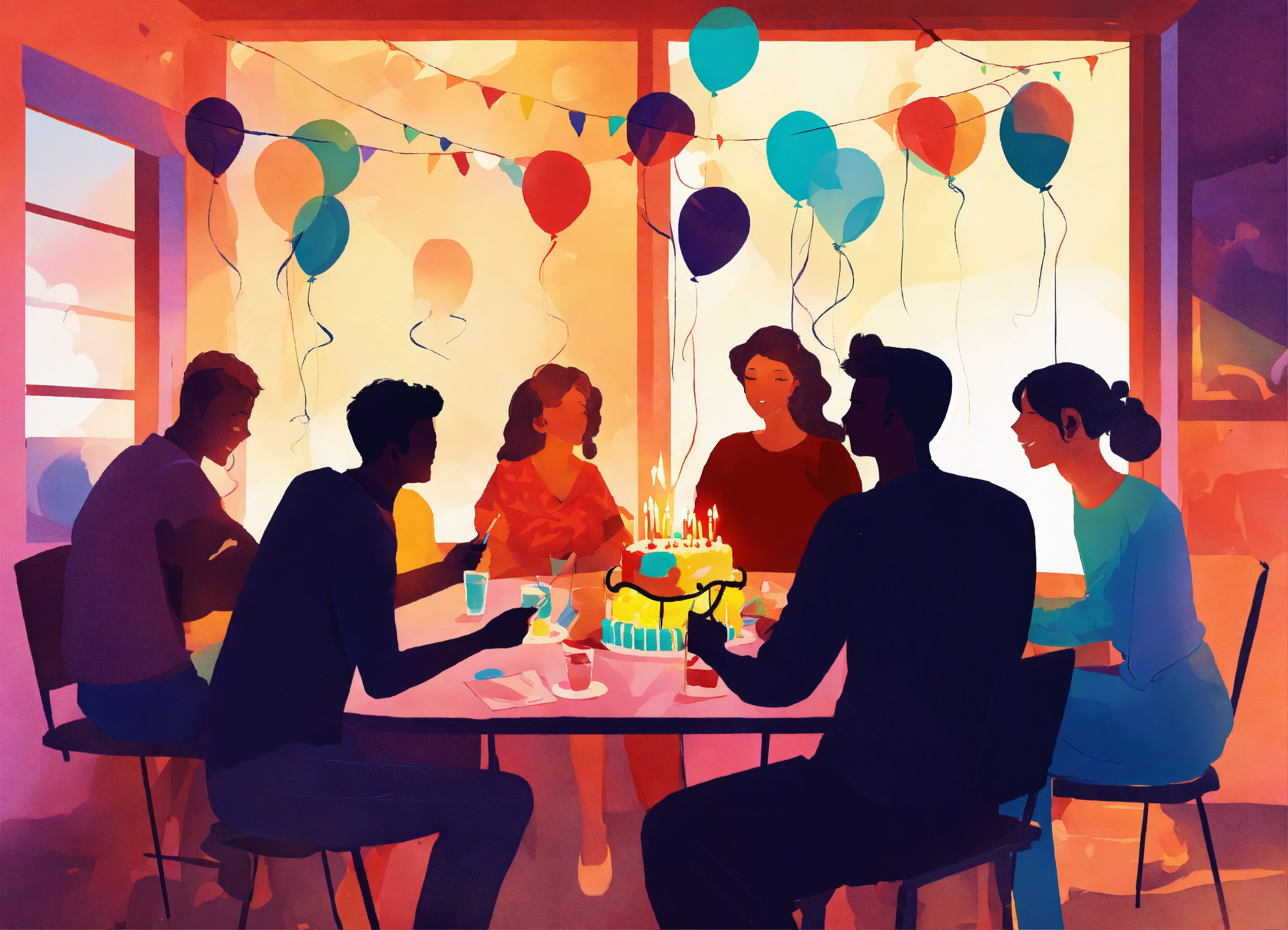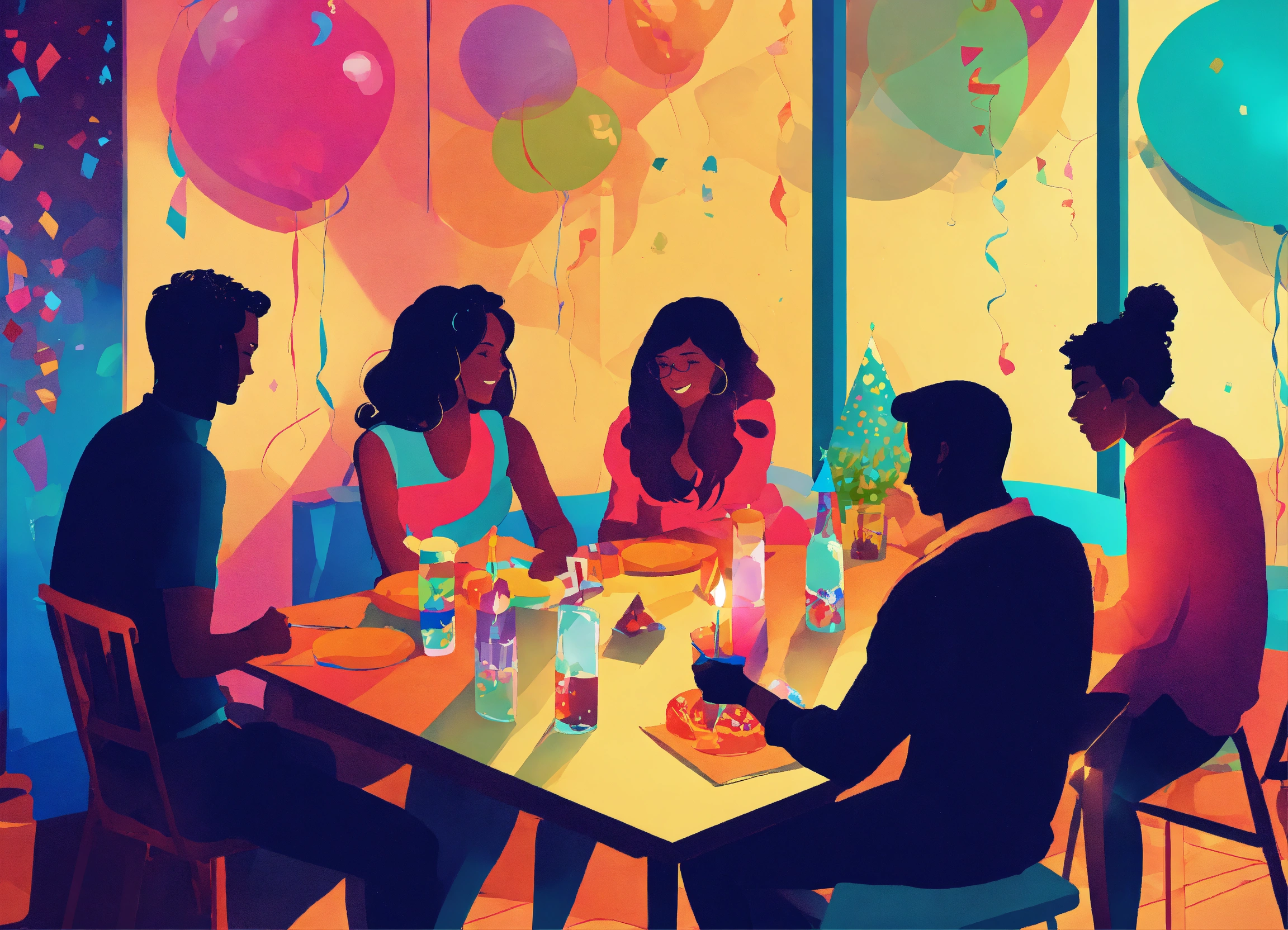 A group of friends and family members, at a birthday party, sitting at a table, socializing, completing fun quiz sheets, colorful, abstract, silhouette, warm ambiance, drawing, artwork, poster art.