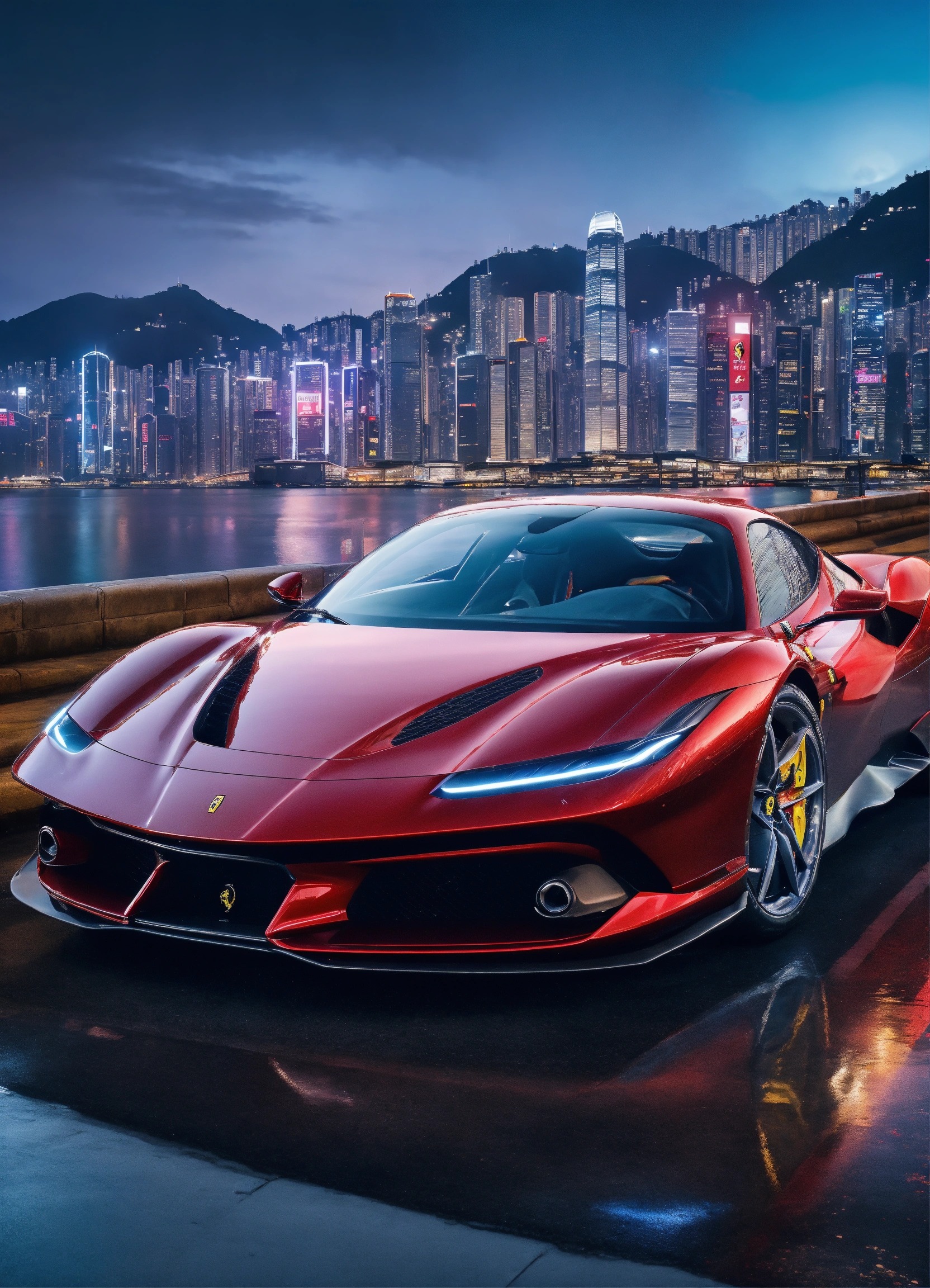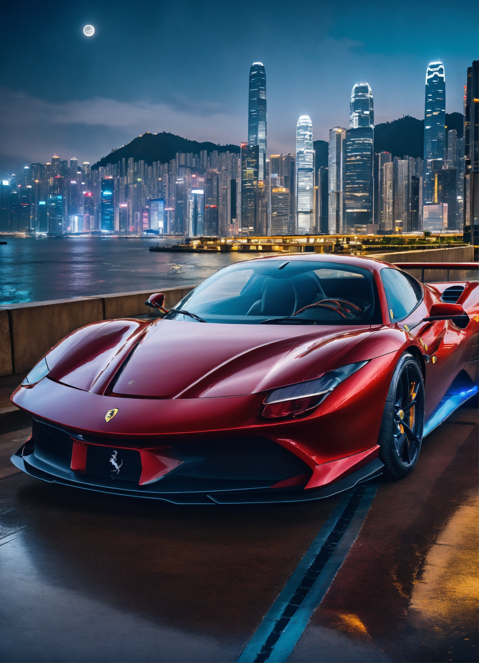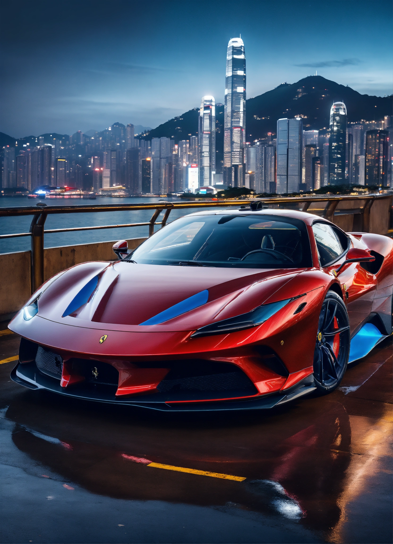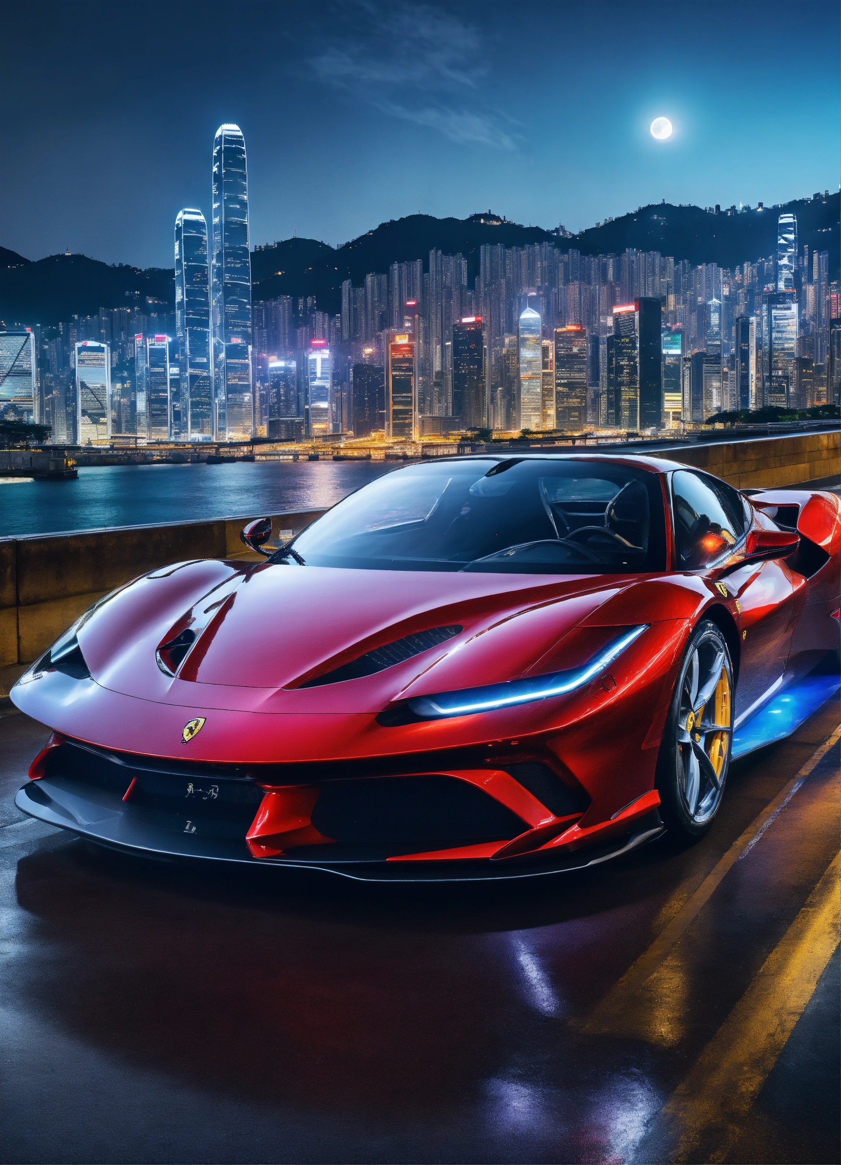 2023 ferrari sf90 stradale blue, metallic appearance, shiny, sharp, doors opened, with night light downtown hong kong cbd background and moonlight landscape, cyberpunk feeling