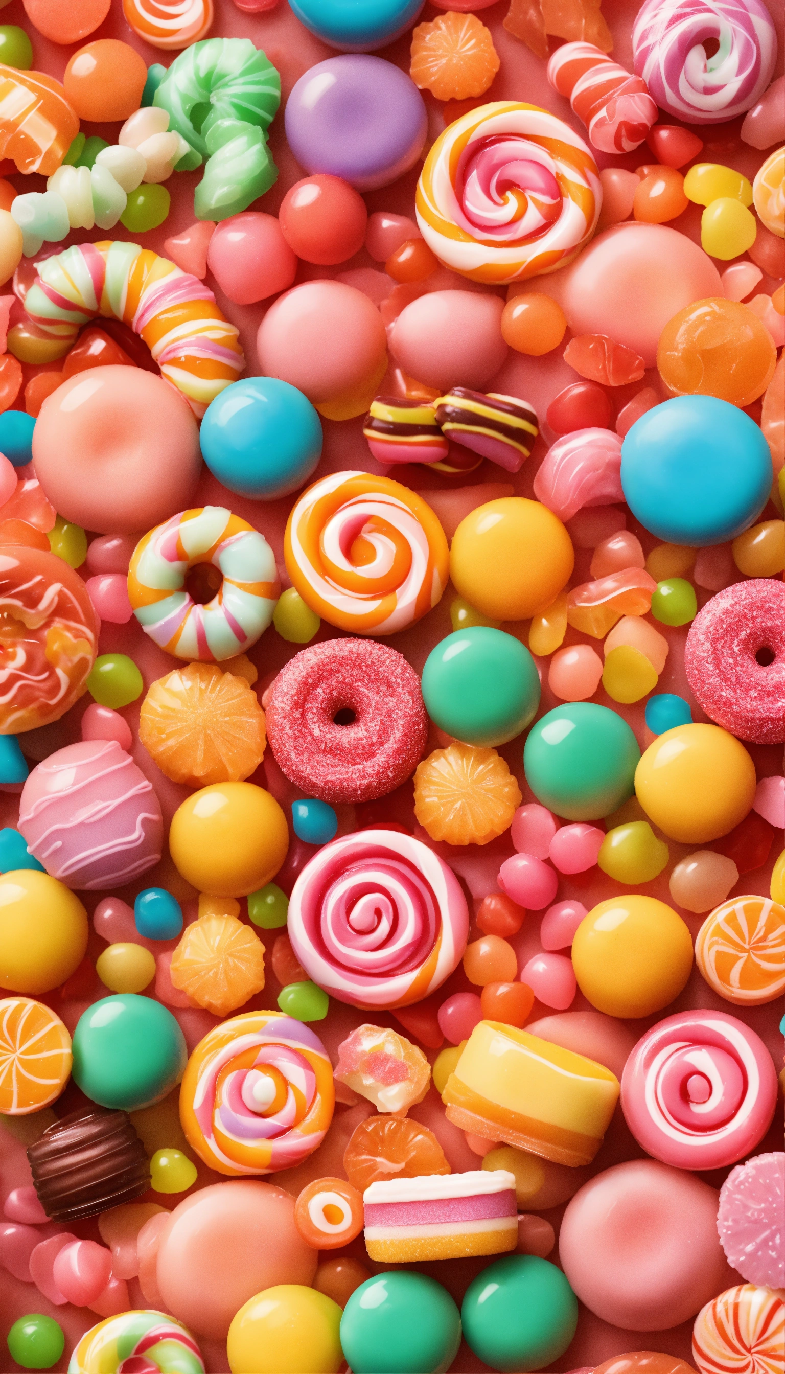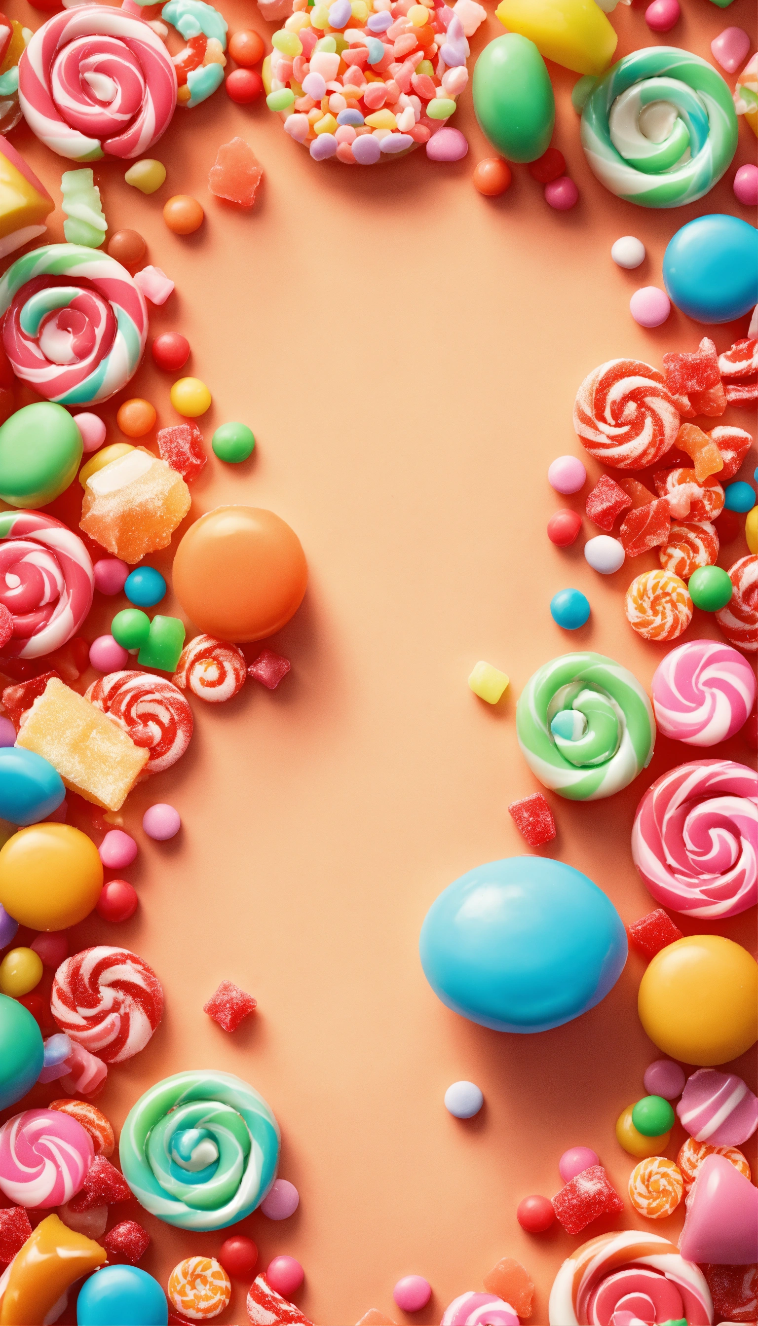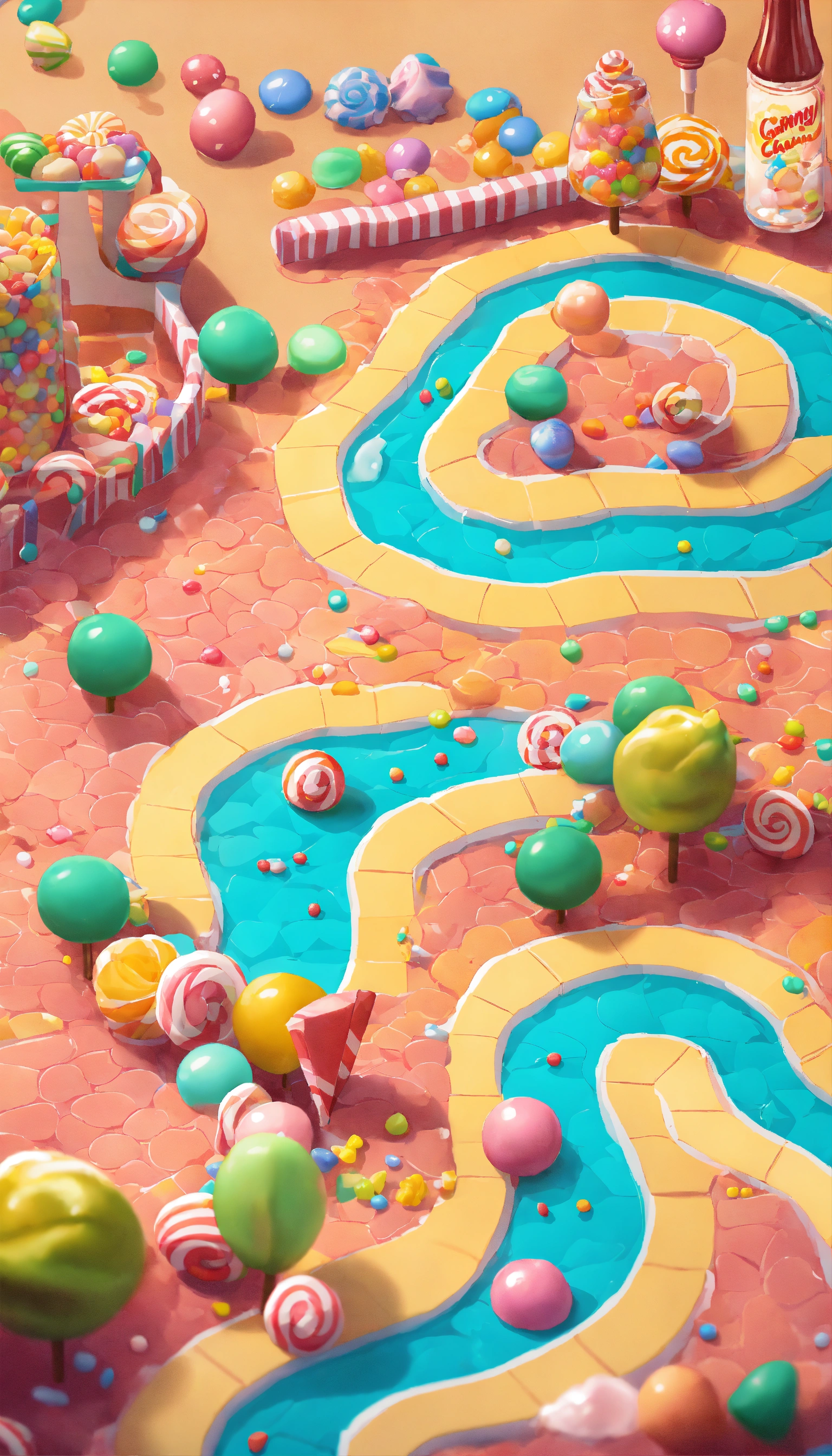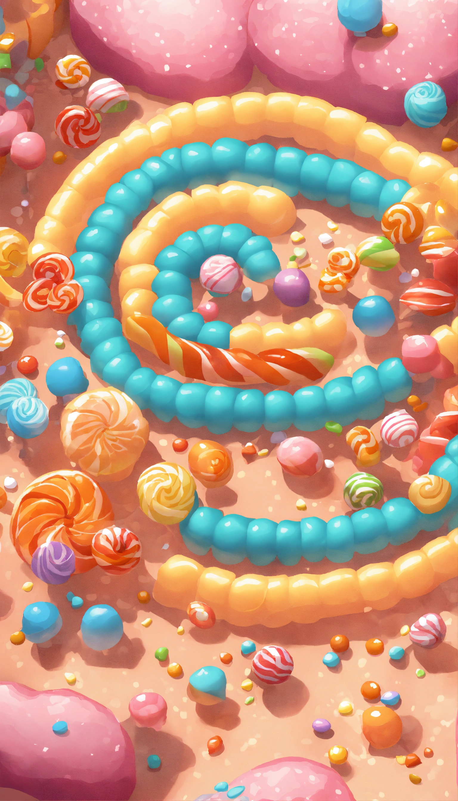 Generate a top down, candy-themed sprite pixel illustration set on a peachy-colored sugary path. the scene should pe ***sparsely*** populated candies of varying colors, swirled candies, gummy candies in various shapes, and round candies. add depth with soft shadows and a play of light to give a three-dimensional appearance. aim for a whimsical atmosphere, reminiscent of a candy land.