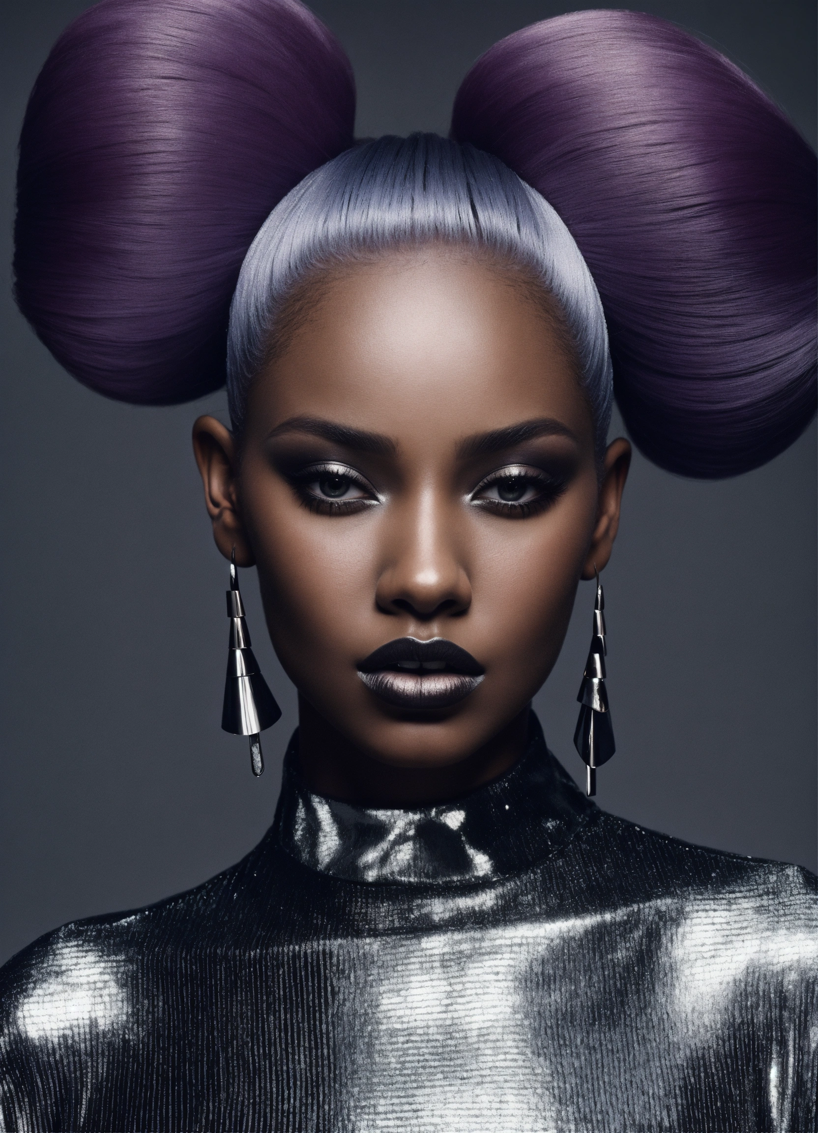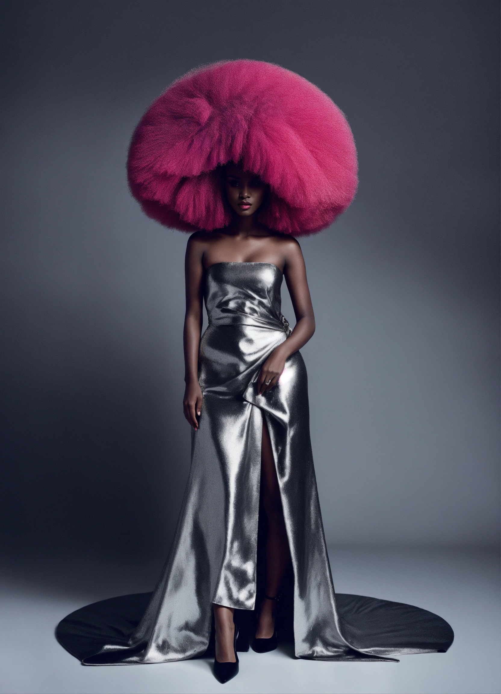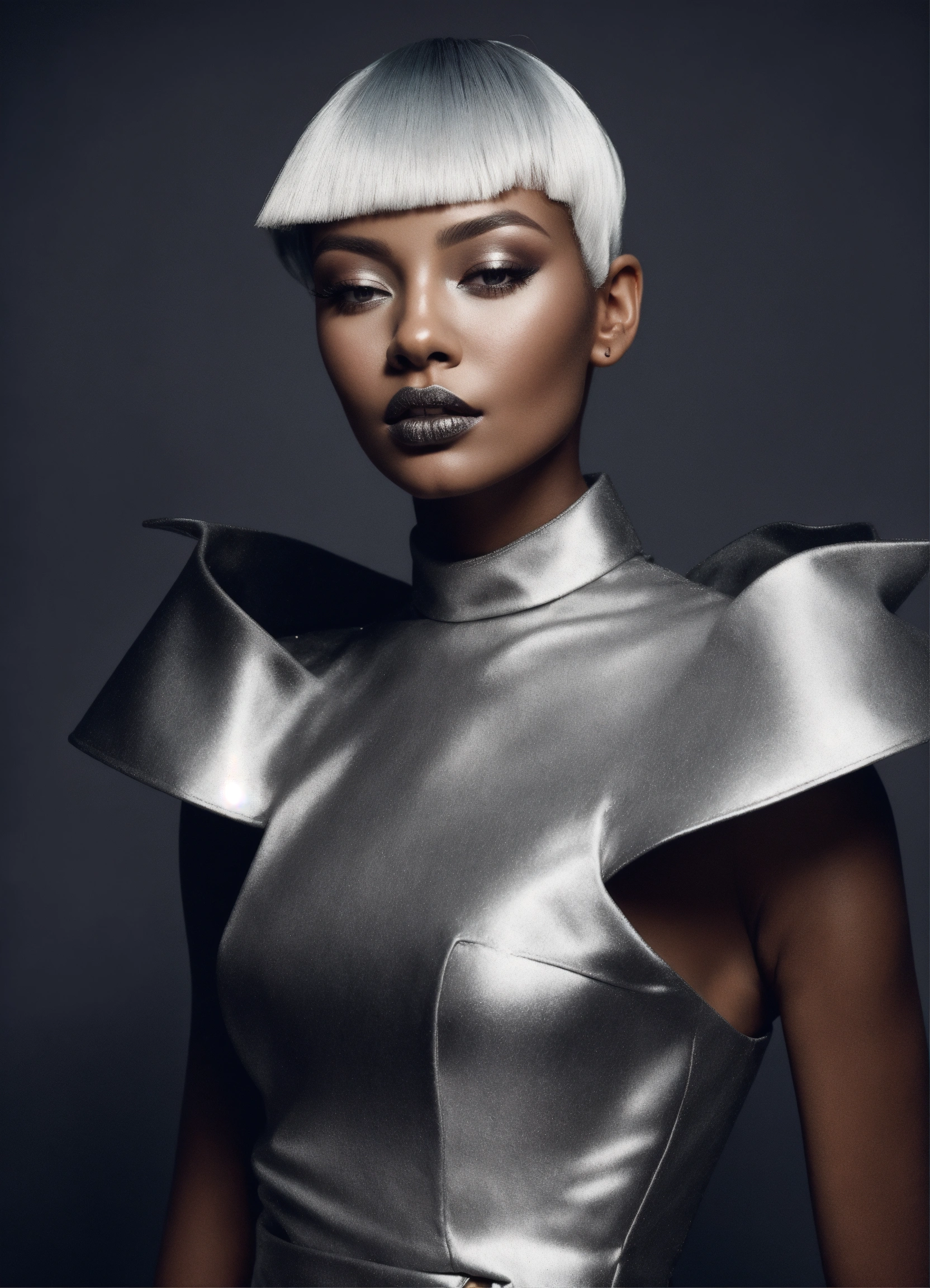 Avante garde high fashion beauty editorial, carmel complexion size 9 black woman dress in silver by flora borsi, style by flora borsi, bold, bright coolers, conceptual bob style hair, ((flora borsi))