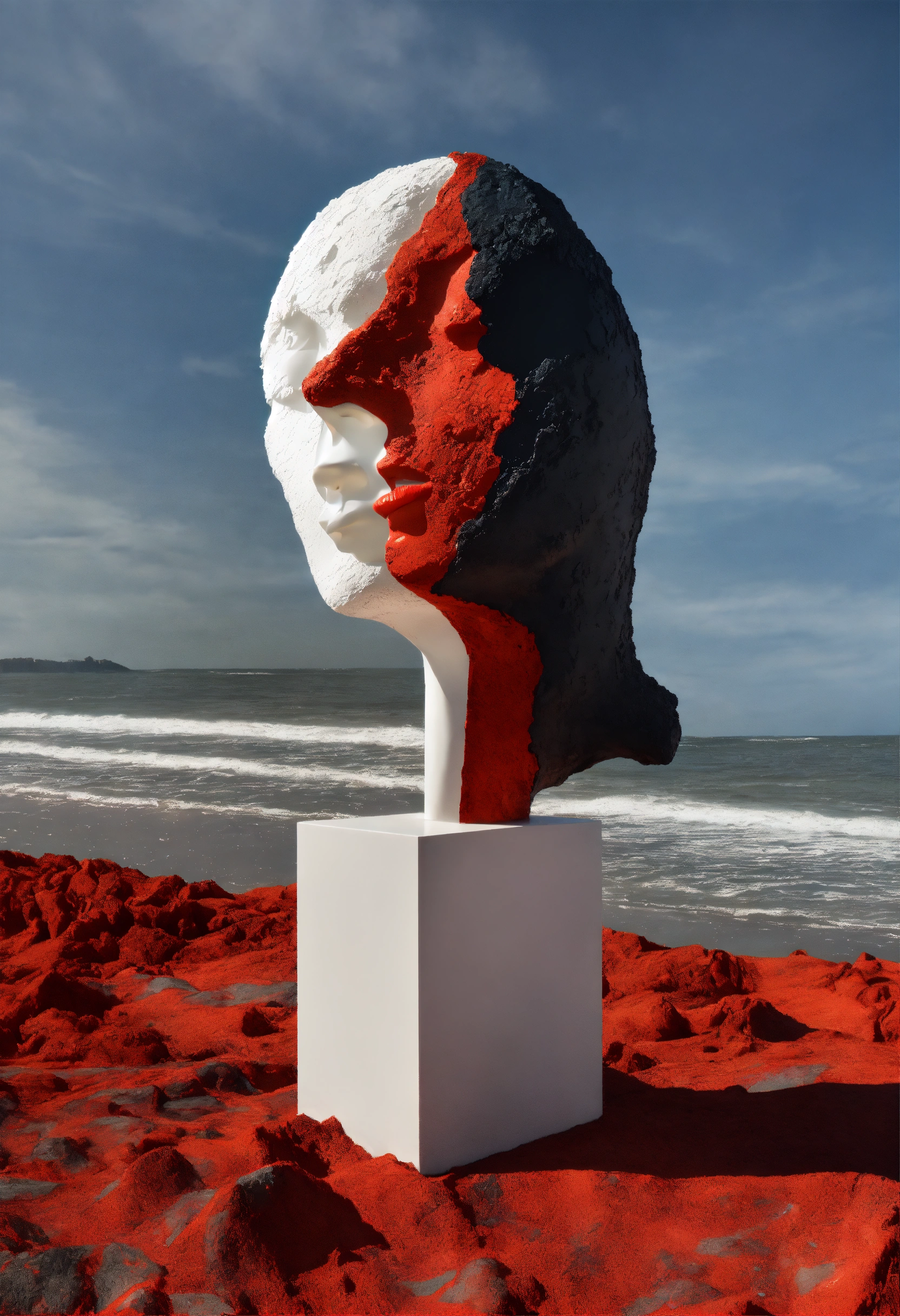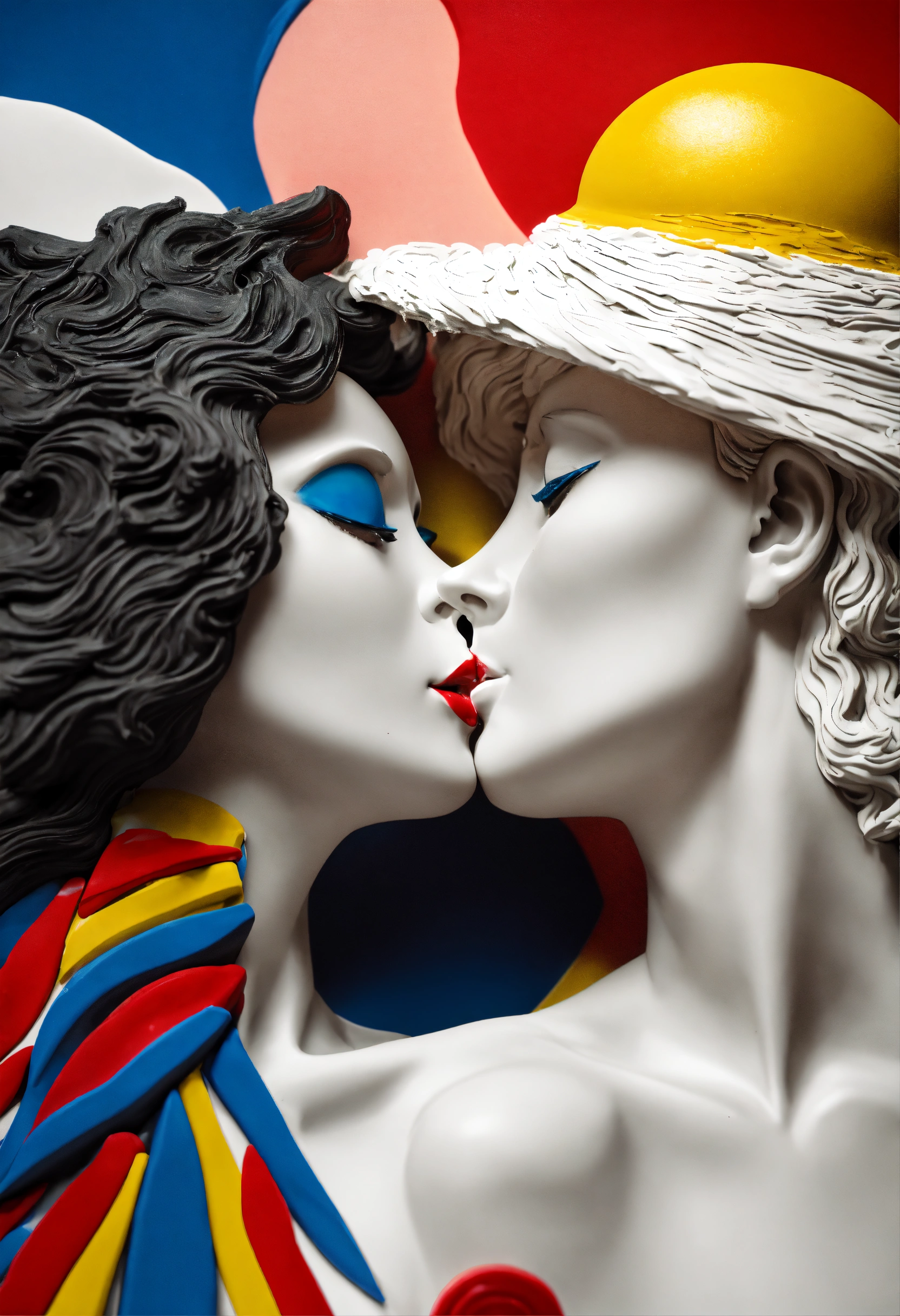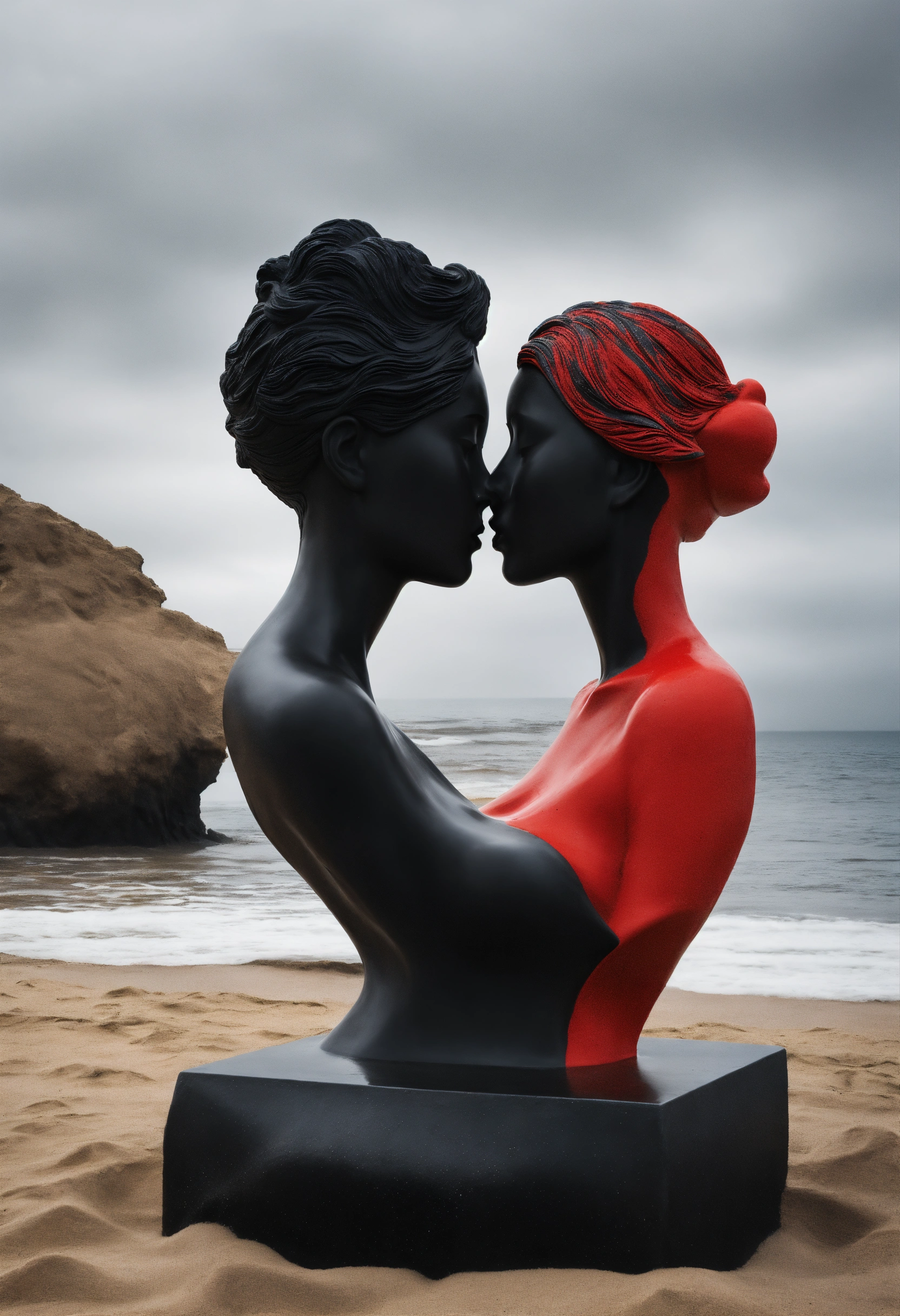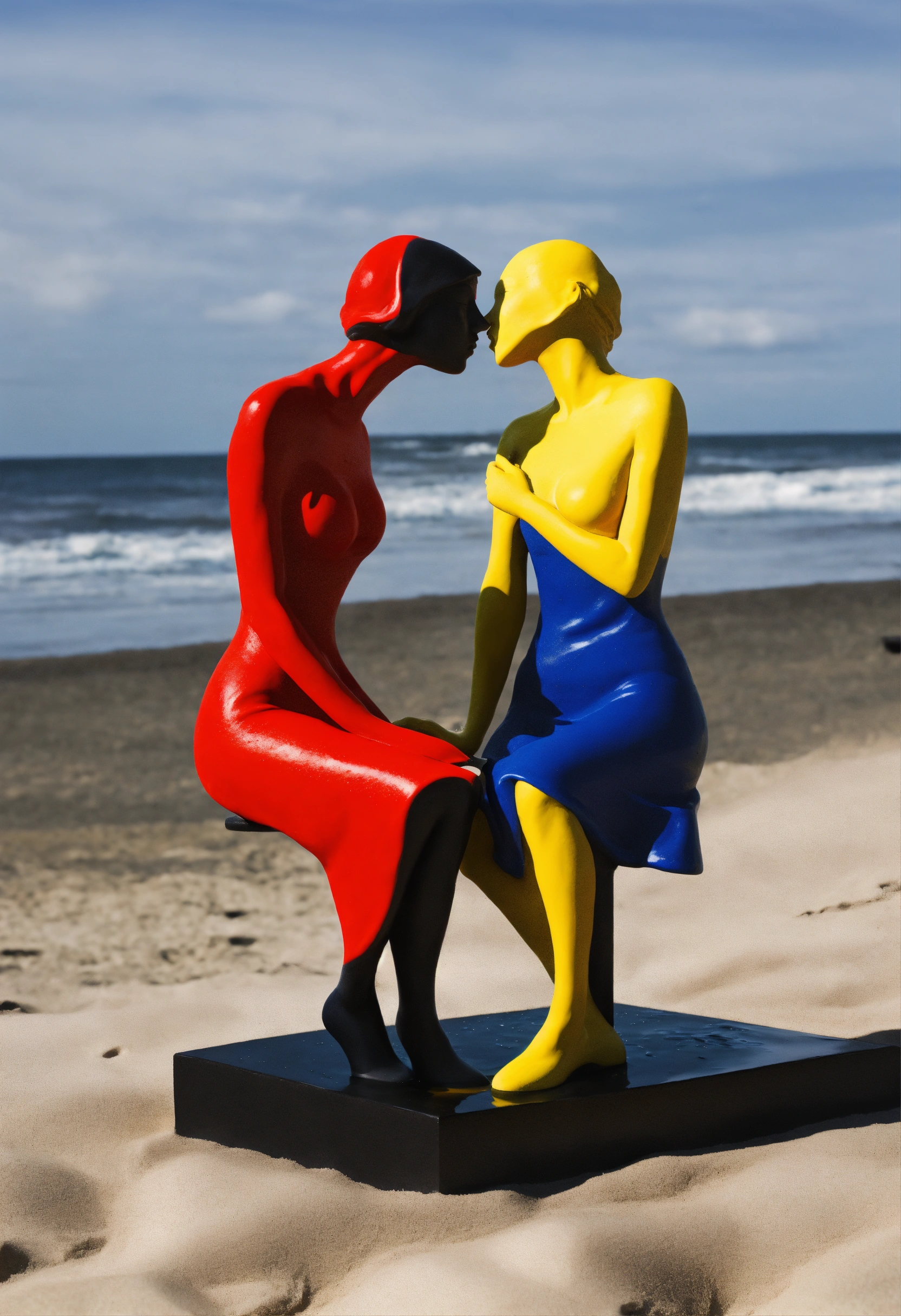 Black and white and primary colors, 3d modeling clay fluid motion, sculpture ladies kiss portrait, immersive inspired dremascape, inside and out beachscape, rené magritte inspiration.