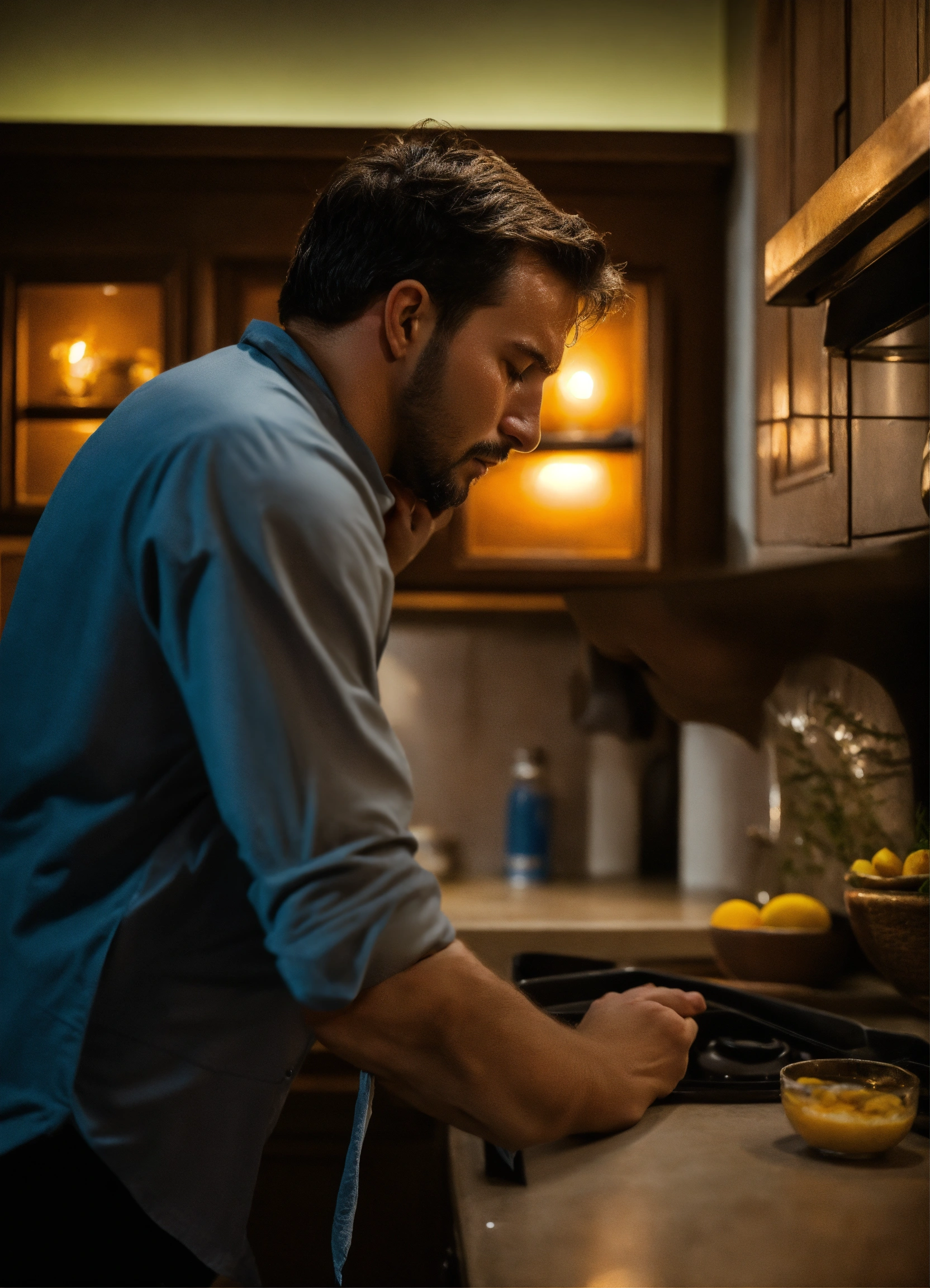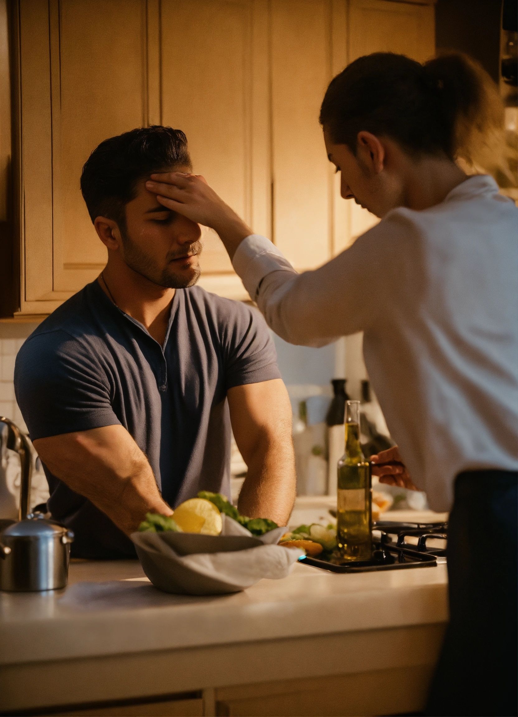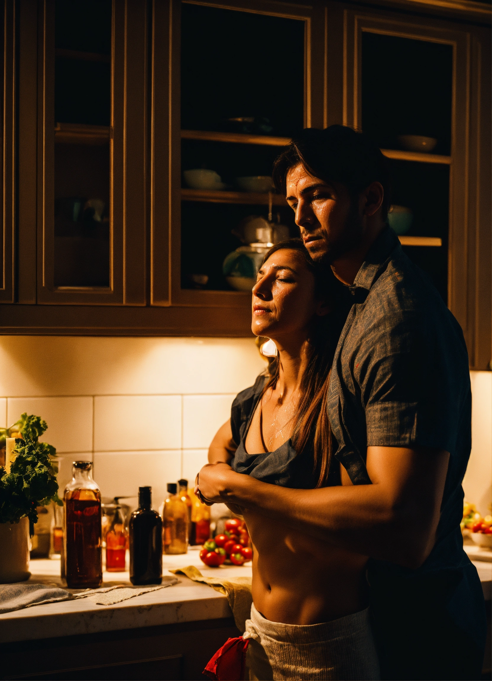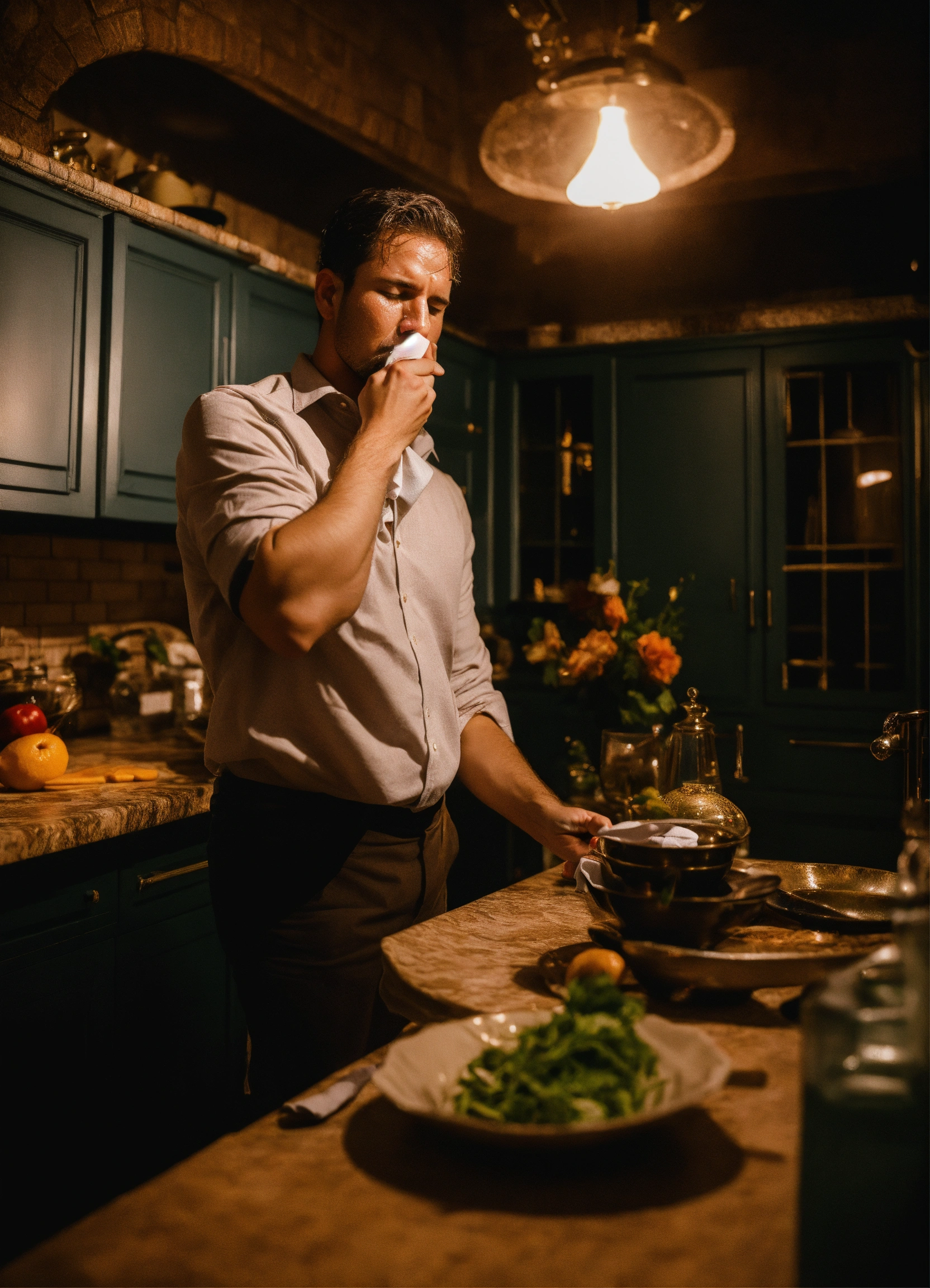 Man wiping sweat with handkerchief from women forehead in night in kitchen in mansion