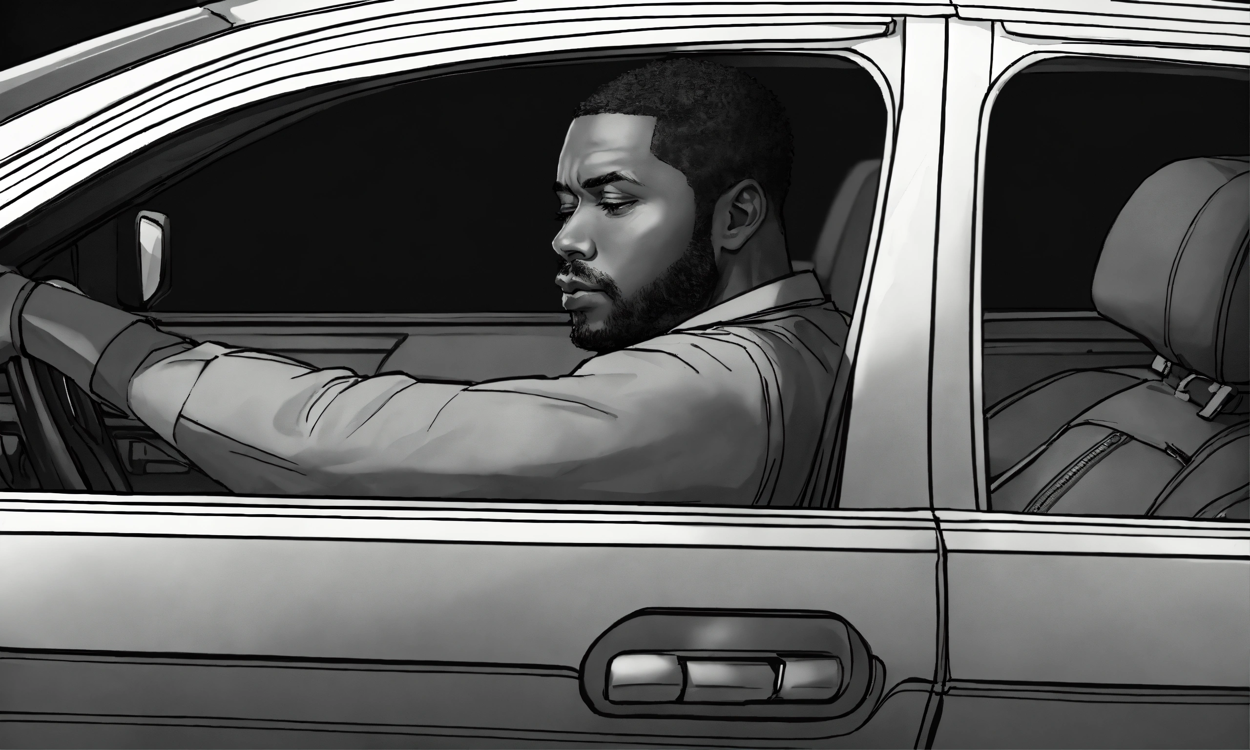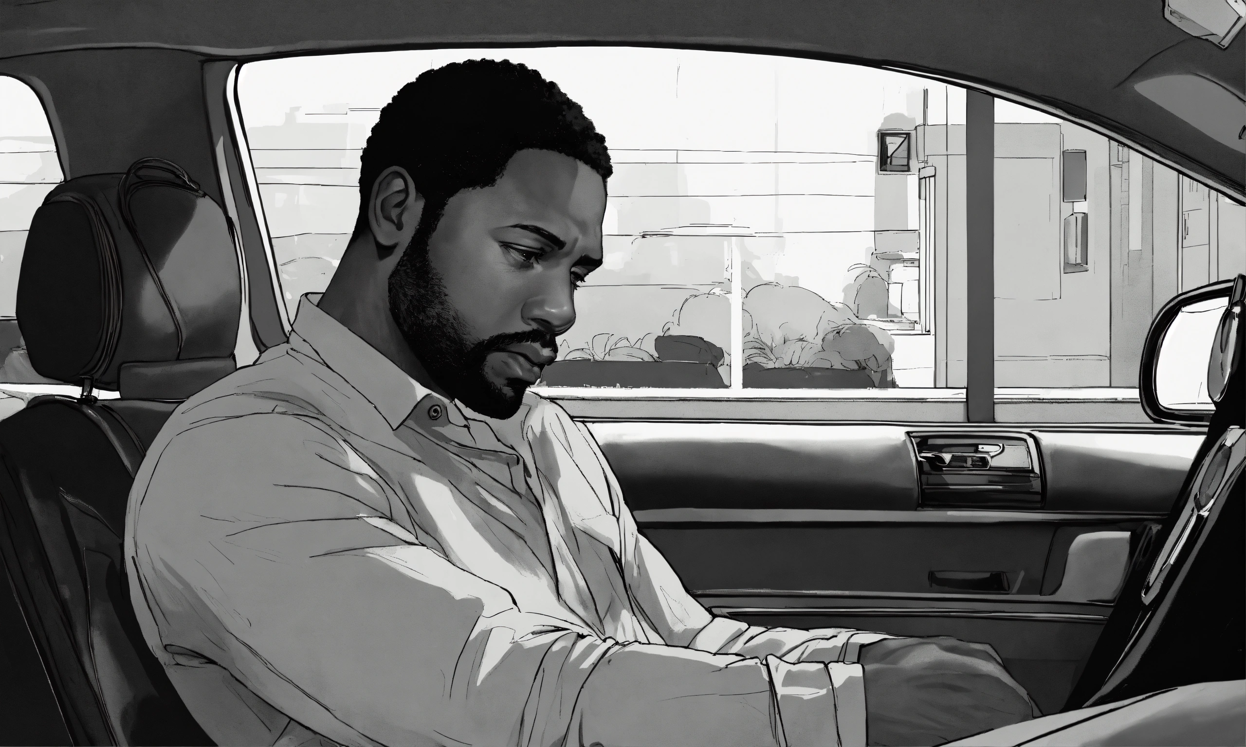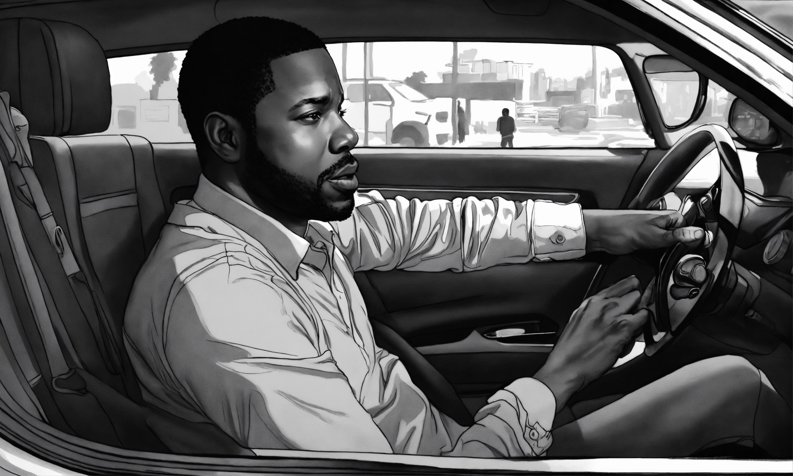 A black and white illustration of a 40 year old black man sitting in car, restraining himself, anxious, time ticking, wearing long sleeve shirt
